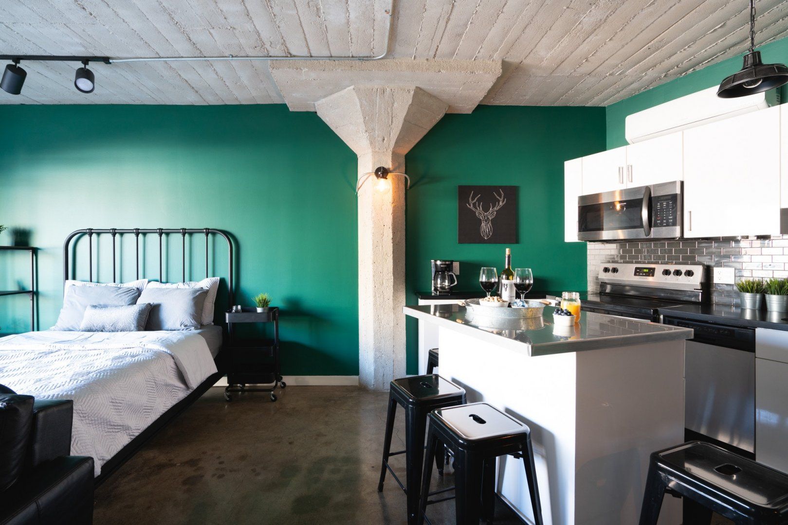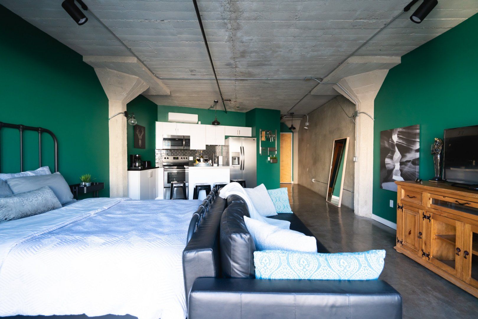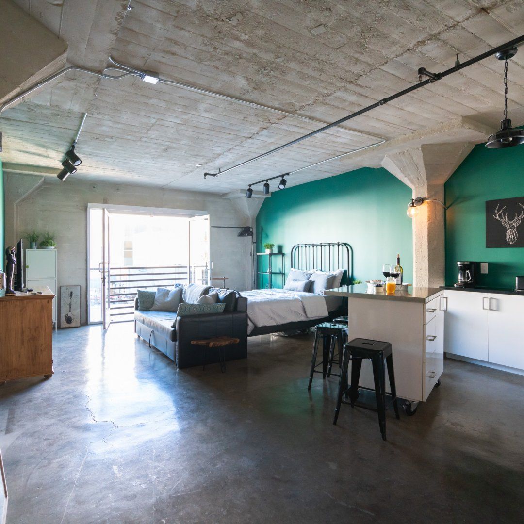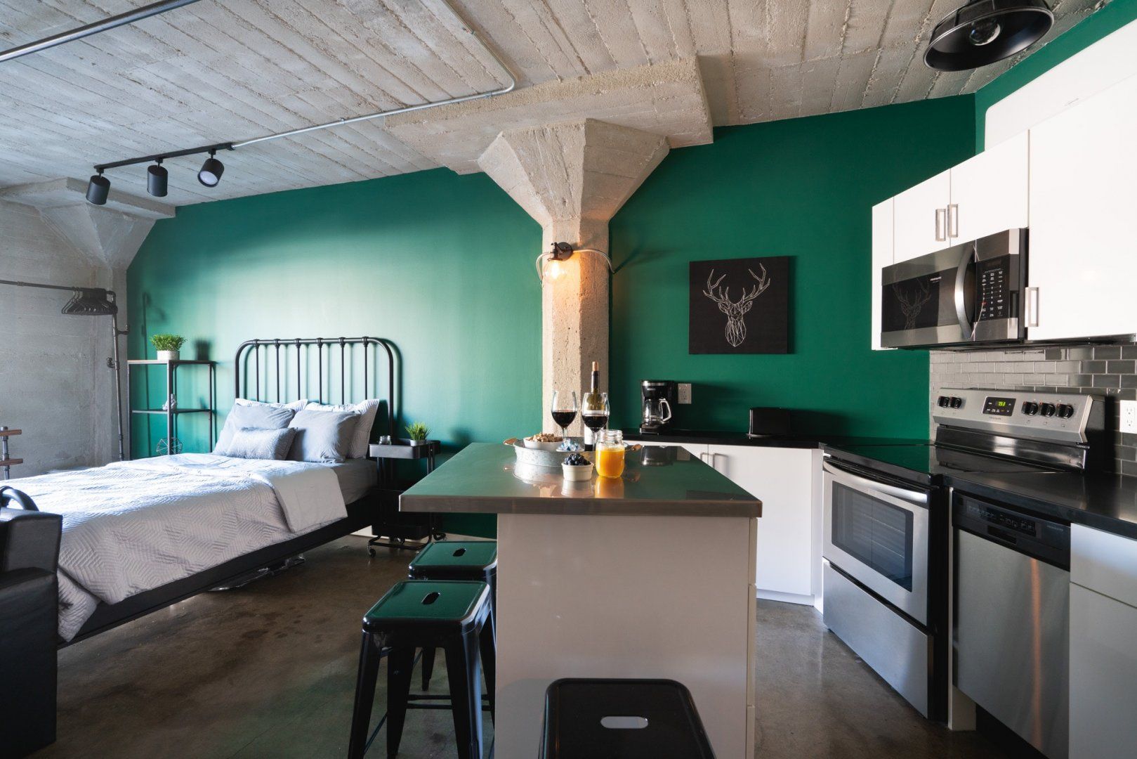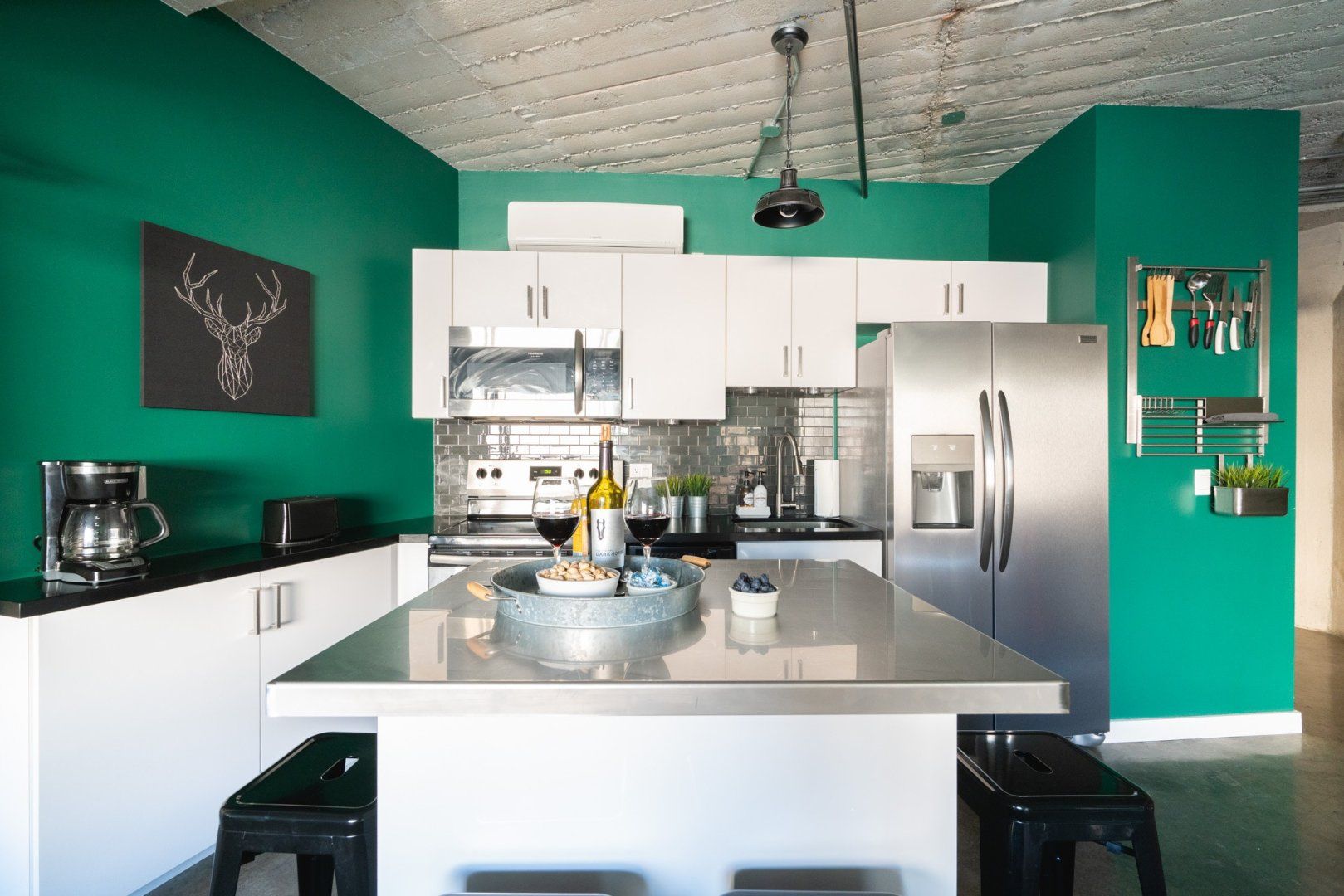 Take in views of Hollywood from the French doors of this industrial-style loft. This is a studio-style apartment, but four close friends can cosy up here. High-end amenities and chic decor weren't at all sacrificed despite being an incredible value. You may even feel like you've been whisked away to Europe thanks to those emerald walls and wood-accented design elements.