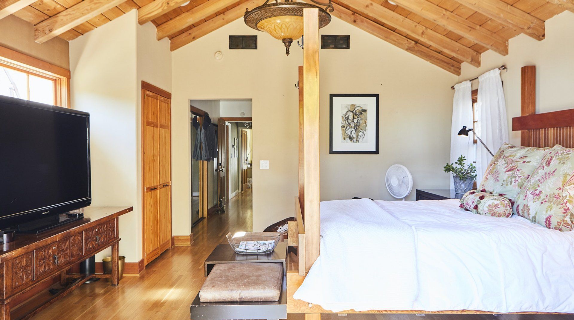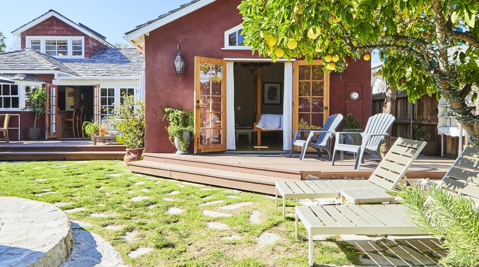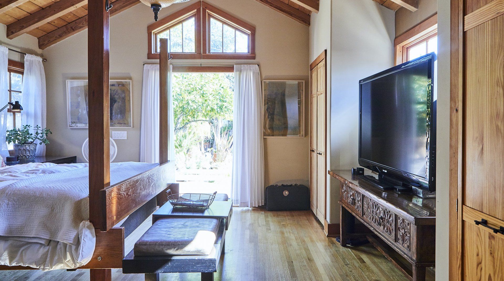 This traditional farmhouse brings an entirely new meaning to farm-to-table living. Roll out of bed and take a stroll in your backyard with the provided fruit pickers and grab whatever's in season – lemons, grapefruit, avocados, oranges, apples, figs, grapes, guavas or pineapples! Once you whip up a fresh breakfast with your bounty, you'll be tempted to lounge by the pool and Jacuzzi all afternoon. Surrounded by three ponds, aloe plants, roses and camellias, this garden feels like a lush hideaway – perfect for hammock lounging or lazy lunches on the shaded patio set. Inside the home, you’ll find the interiors match the traditional farmhouse exterior, designed by noted Los Angeles architect Robert Byrd. Byrd was a master of indoor/outdoor living and this home blends each lovely space together quite nicely. You’ll even notice his signature touch – embedding birdhouses into the structure – with a glance to the windows above the second story. We love the cedar wood that’s used throughout, giving the home warm honey hues and a cosy feel. Lounge in the living area in front of the brick fireplace, or retire to bright bedrooms that look out on the garden’s happy trees. You’ll be located right around the block from Valley Village, while Hollywood is just a fourteen-minute drive away. The boutique shops and excellent restaurants of Studio City are just a ten-minute drive away, and so is Universal Studios, should you fancy a visit to the amusement park during your stay.