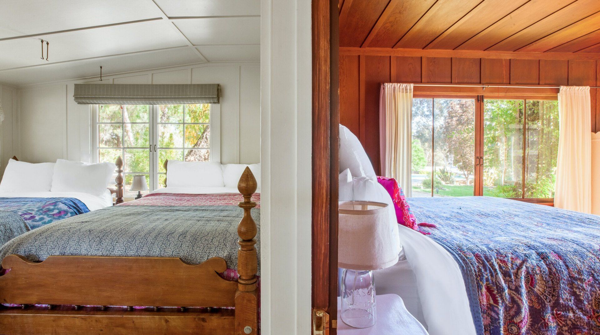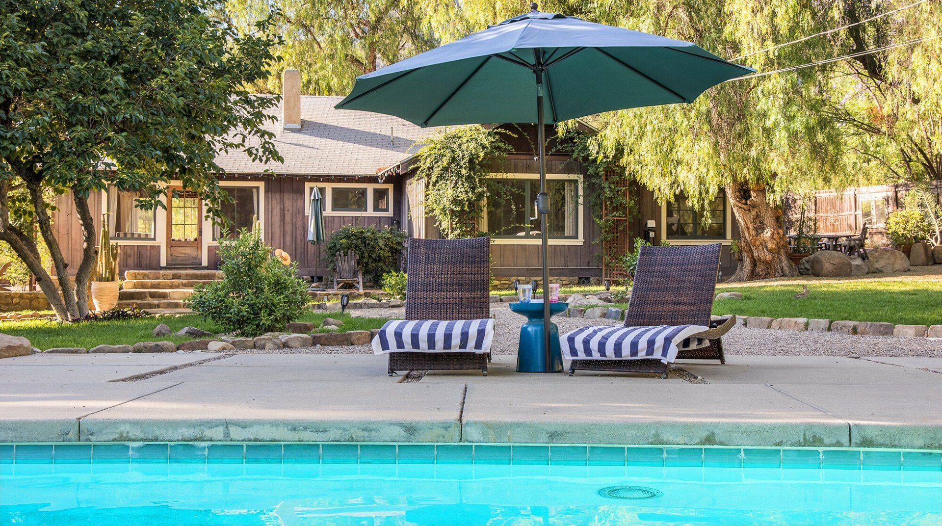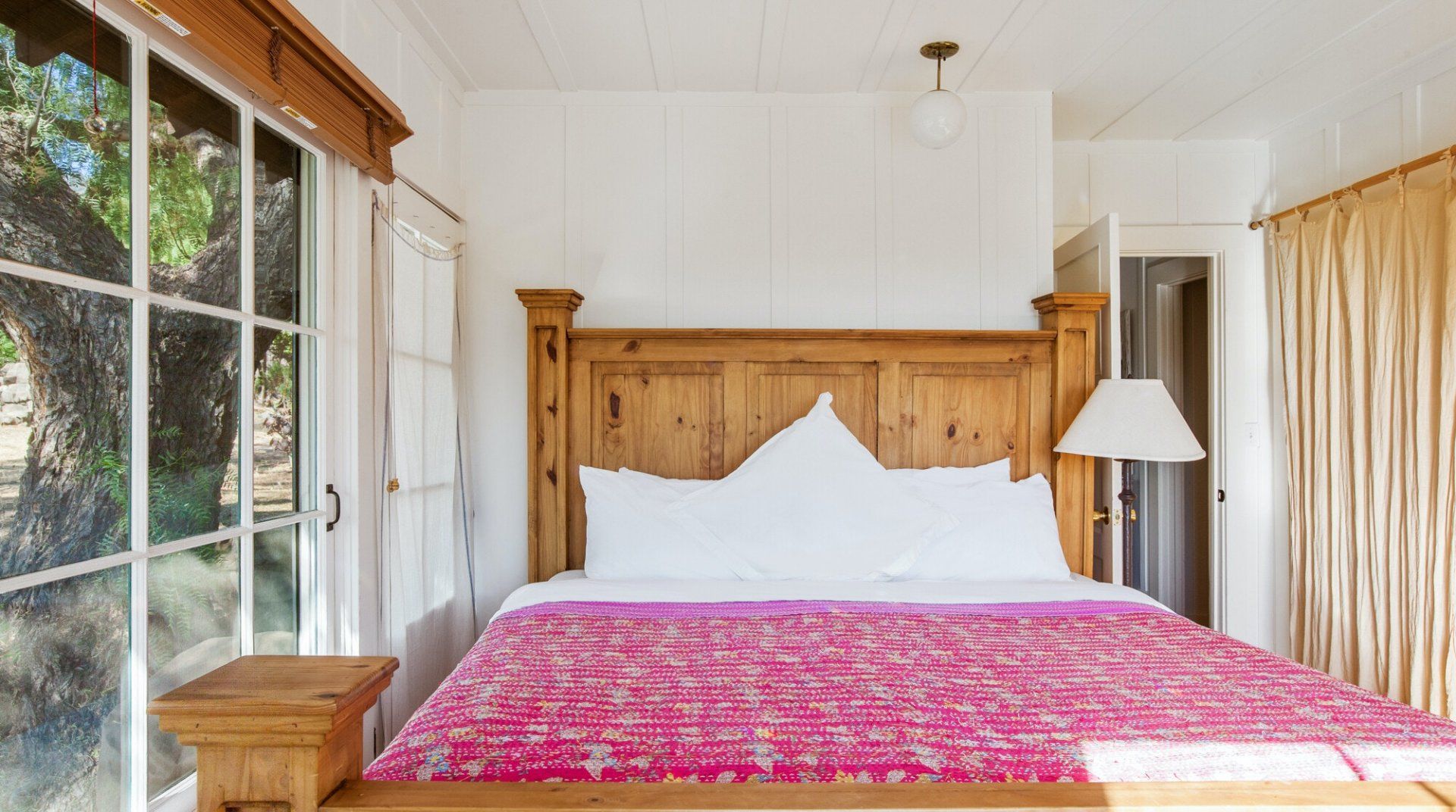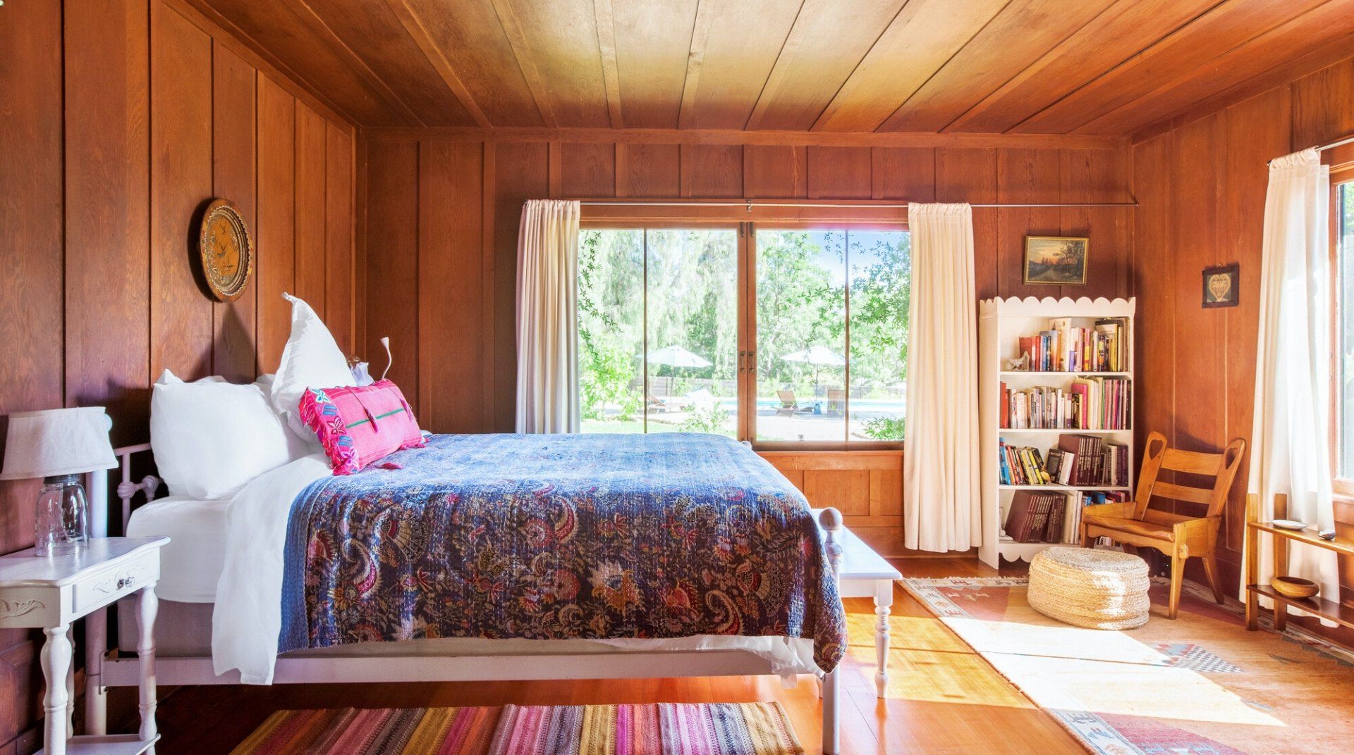 Built in 1928, this quirky bungalow is filled with bijou charm and plenty of character. Located down a winding narrow lane in the East End neighbourhood of Ojai — a six-minute drive to the town centre — its major selling point is the aura of absolute peace and serenity. The surrounding landscape is dominated by the dramatic mountains and the hosts have planted a gorgeous array of leafy vegetation in the garden, including fruit and pepper trees. Inside, it’s cottagecore with a Californian twist. A few of our favourite features include the all-encompassing wood panelling of the living room and master bedroom, the vintage dressers in the kitchen and the colourful woven bedspreads. For extra boho vibes, a former artist’s studio flooded with natural light has been converted into an additional bedroom. Spend all afternoon around the pool before lighting up the barbecue and having dinner under a pink sunset.