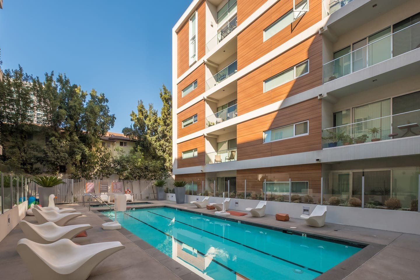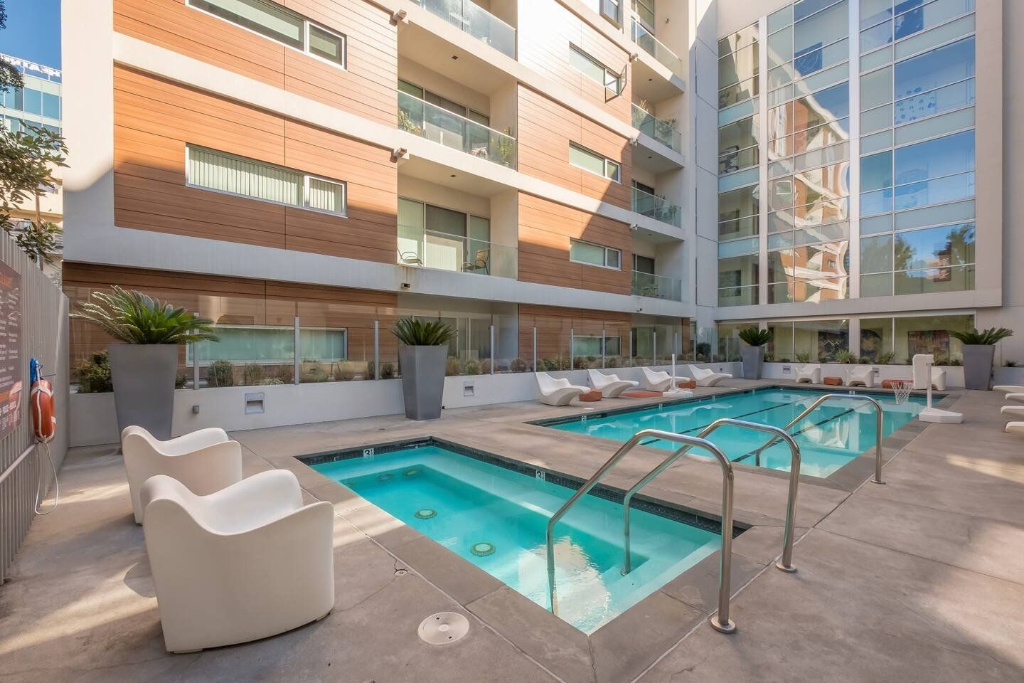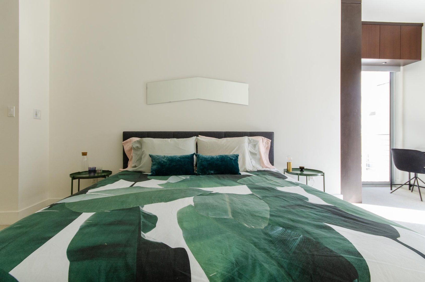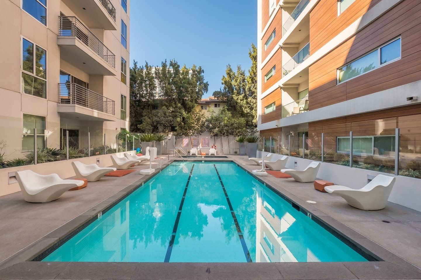 Close to the Hollywood Bowl and within walking distance of Tinsel Town’s most iconic sights, this colourful home has everything you need for a fun, comfortable stay. The living room is instantly inviting with its turquoise feature wall, funky art prints and large sofa, and we love the sliding doors that open up onto a balcony. Decked out with plants, soft drapes, a table and chair, this is the perfect spot to begin your mornings, a cup of coffee in hand. Both bedrooms – each boasting their own colourful character – lead out onto this private outdoor space and there’s a desk right by the second bedroom’s patio doors so you don’t have to miss out on the sun even if you’ve got business to attend to. Head to the communal gym for an early workout before seeing the sights, or stay put for a sunny afternoon by the shared swimming pool and hot tub. There’s an on-site entertainment room too, so you can ramp up the fun with a game of pool before hitting the area’s buzzing restaurant and bar scene. Alternatively, fire up the barbecue on the communal terrace and enjoy an alfresco feast while the sun sets over the city.