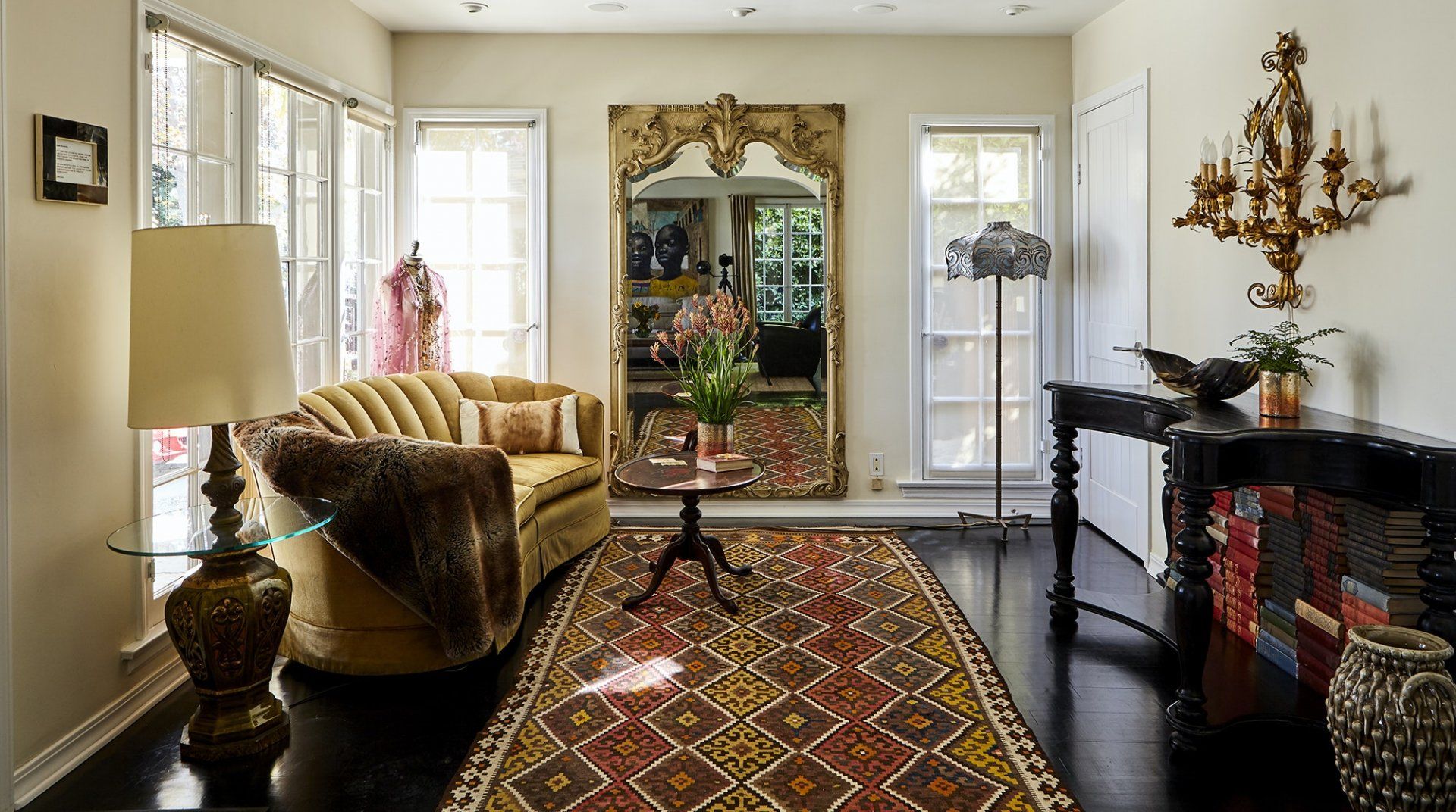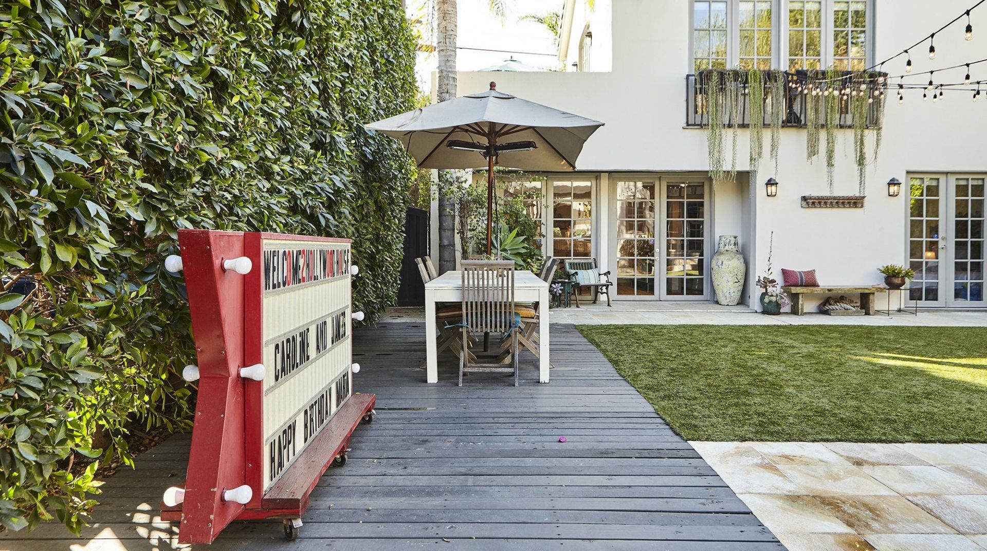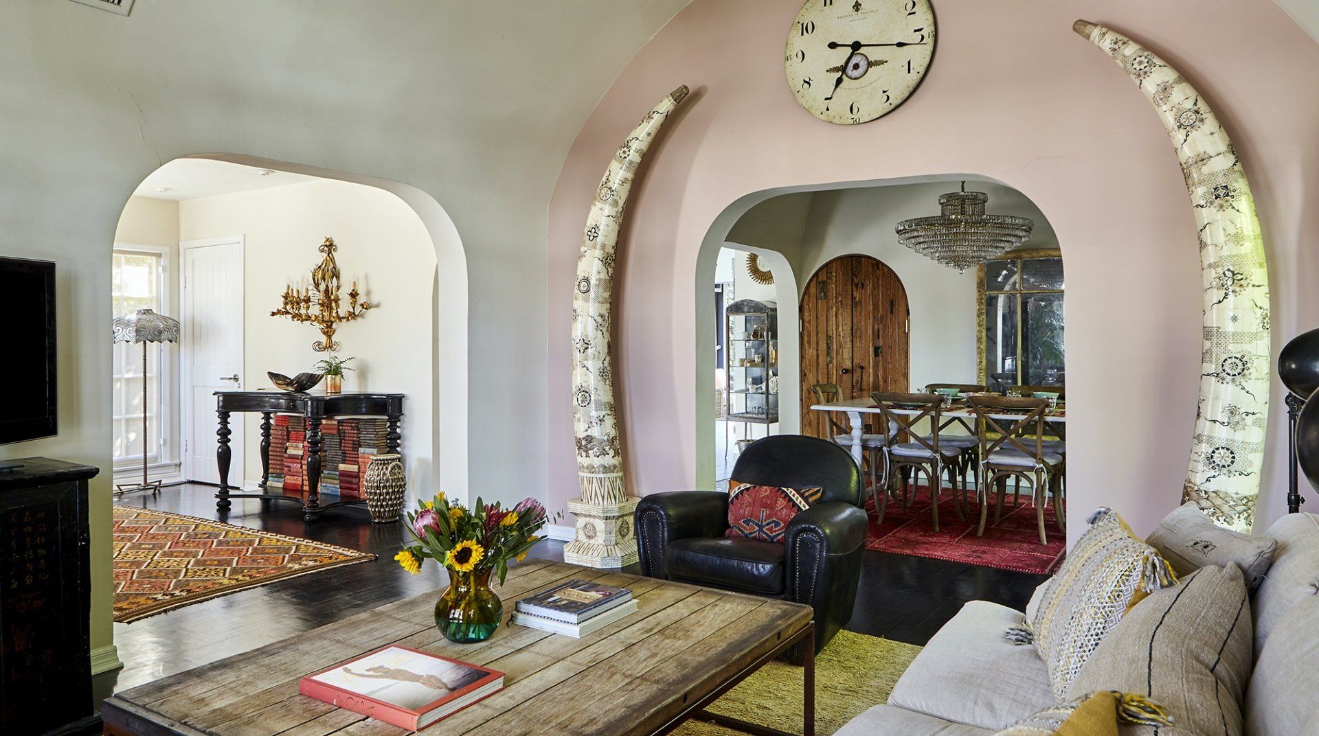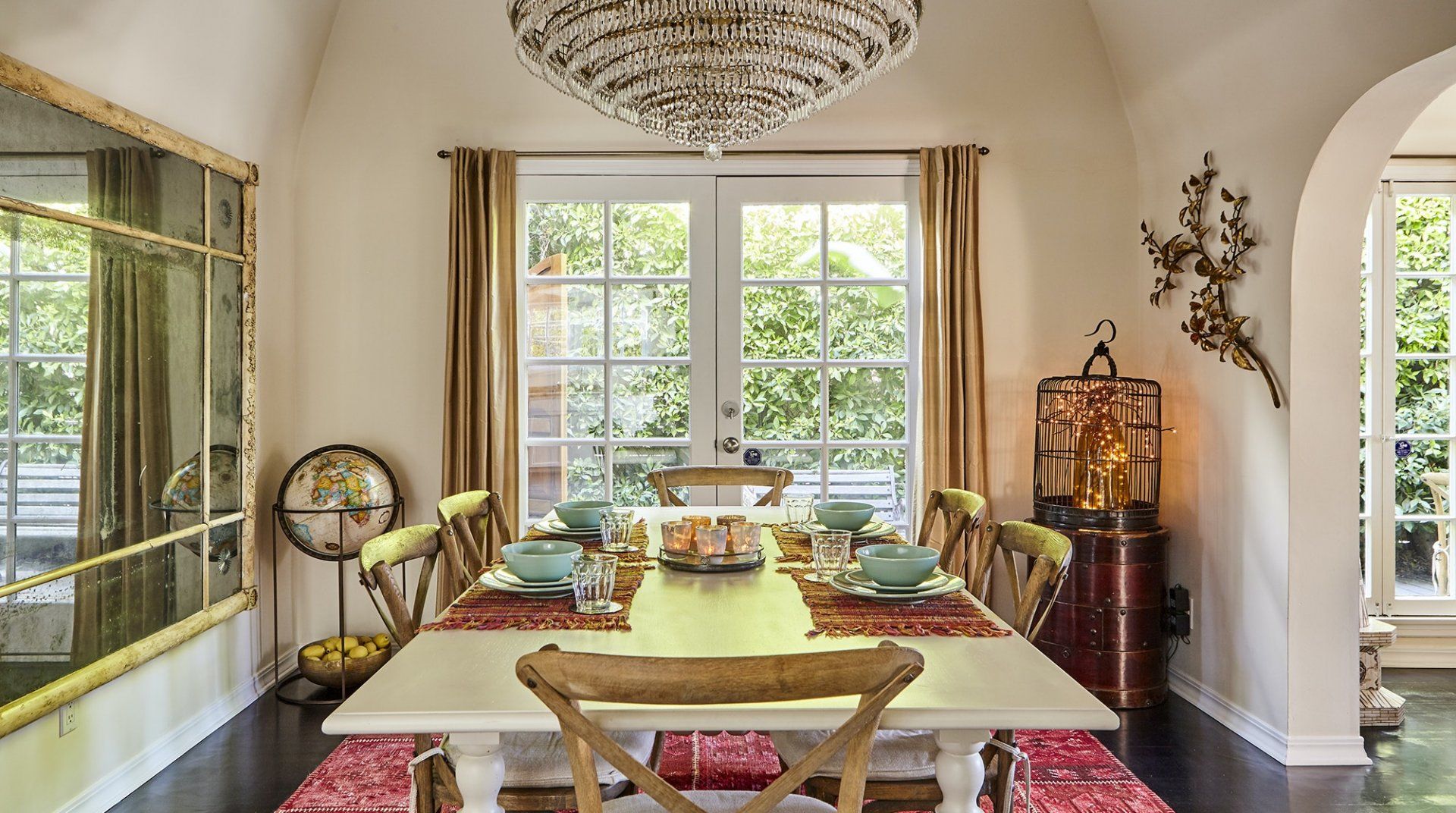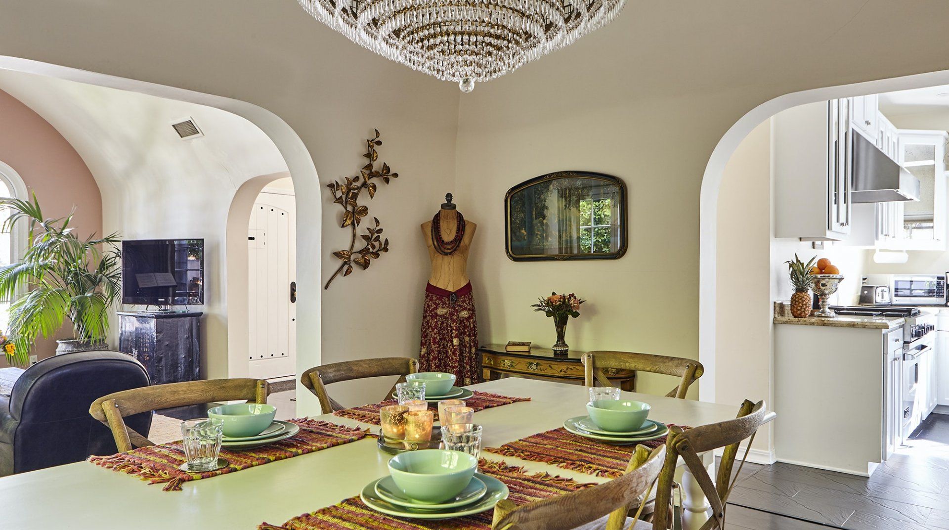 Flawlessly styled, this home is filled to the brim with treasures, art and furniture from around the world. Dine under the enormous sparkling chandelier, admire antique mirrors and lounge next to two enormous tusks in the living area – the furniture here is as unique as it is impressive. We especially love this home’s use of outdoor space – part of the back garden feels like an outdoor bar with its plush furniture set up, while the rest of the garden features a table for dining alfresco and a green lawn with overhead fairy lights, so you’re sure to make good use of the year-round sunny weather. Plus, you’ll be just a six-minute walk to the dining and shopping scene of Melrose Ave. Or, hop in the car for five minutes to explore Hollywood Blvd and fifteen minutes to wander the palm tree-lined streets of Beverly Hills.