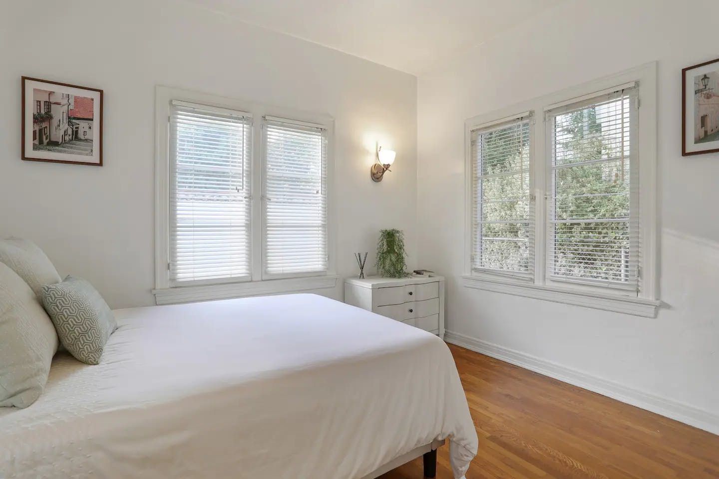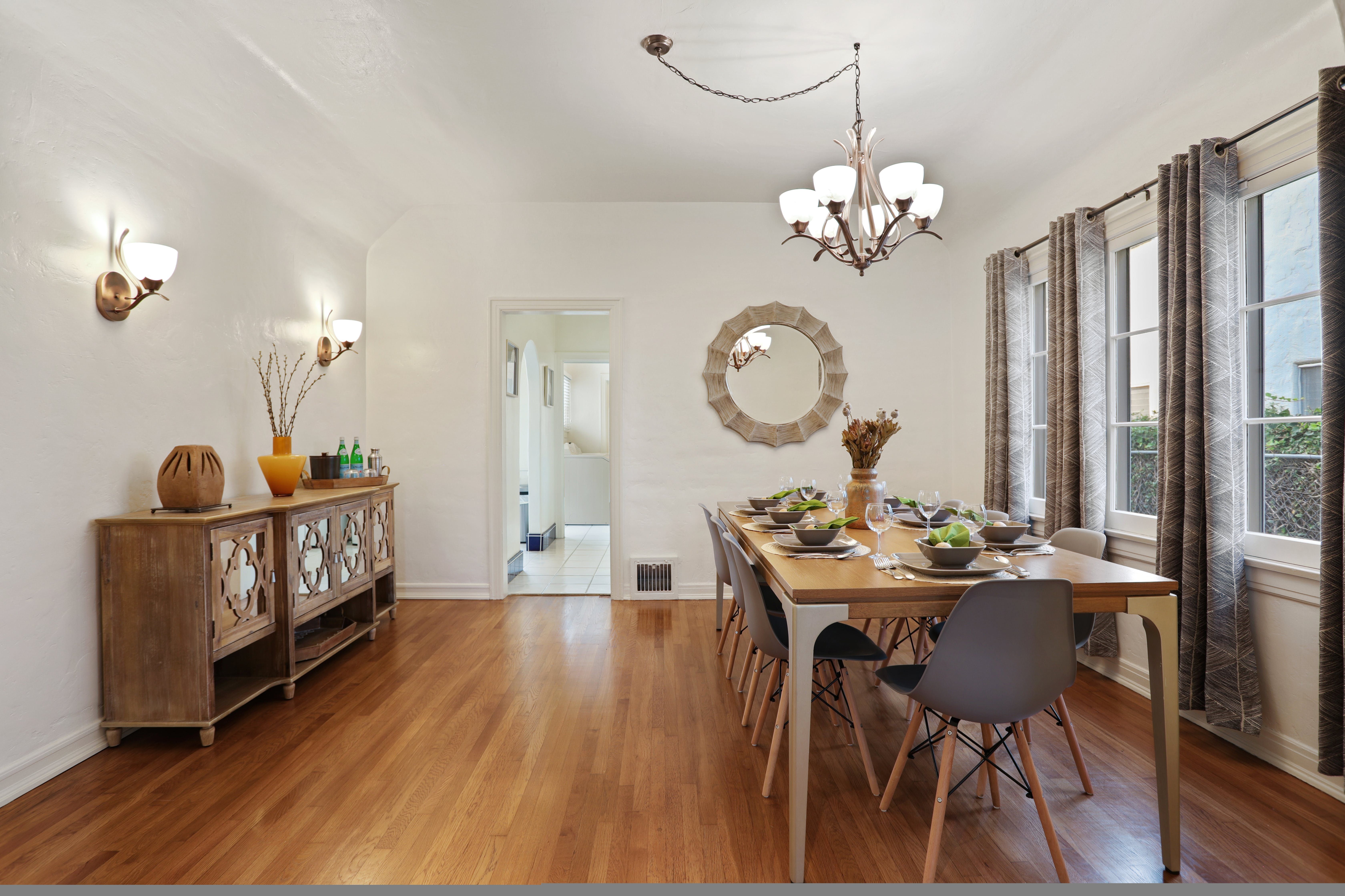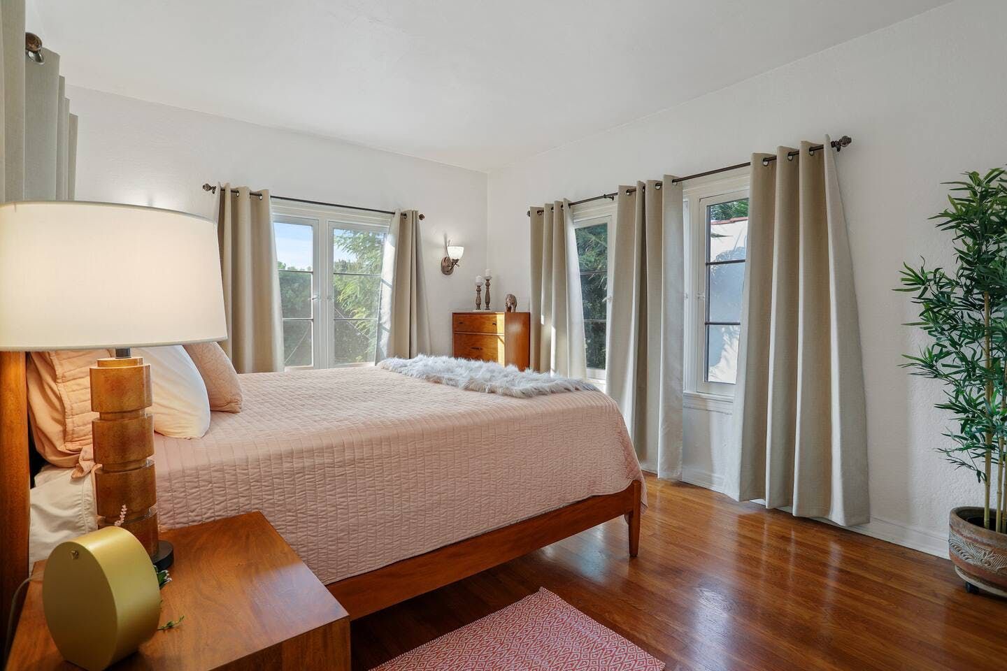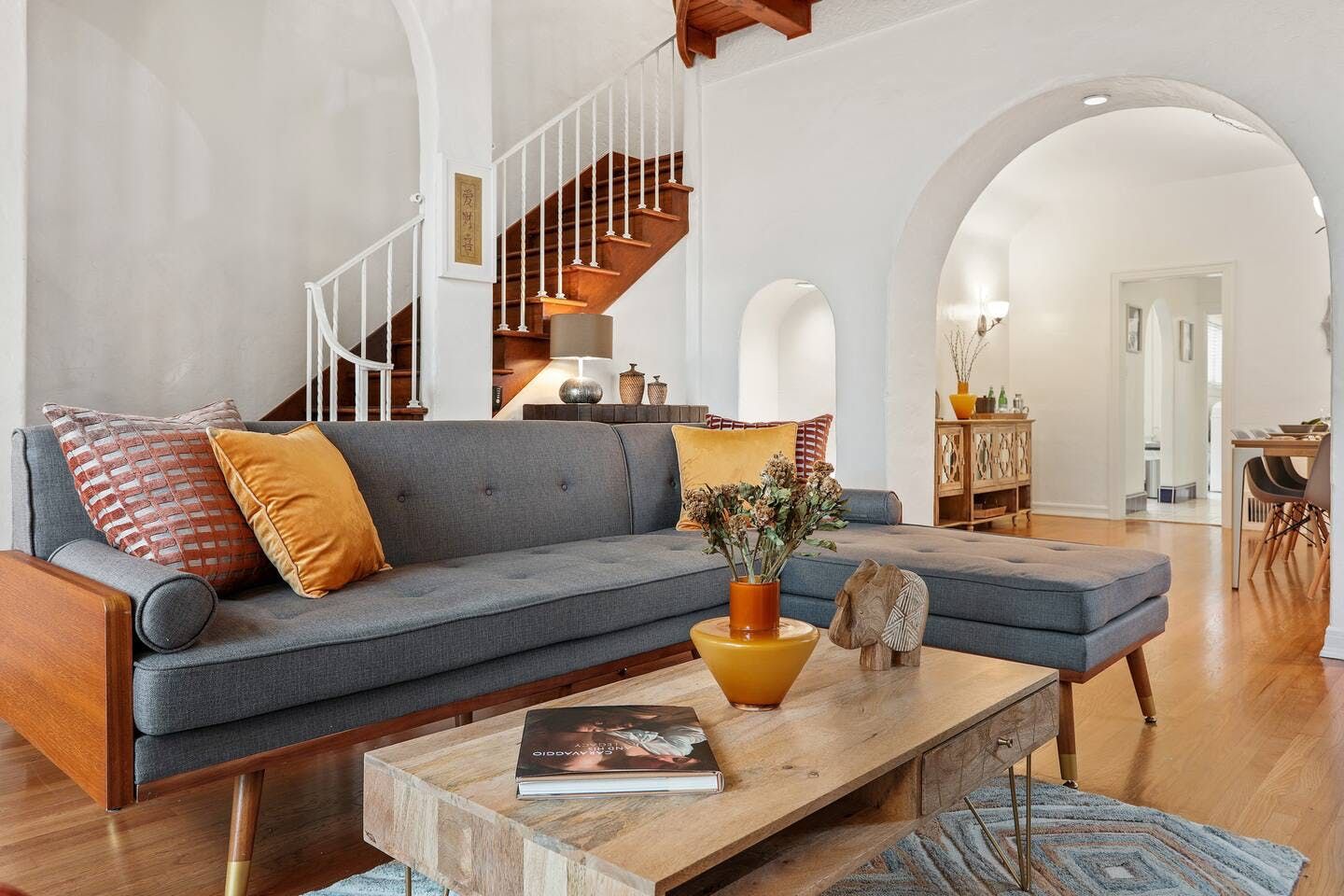 Set inside a beautifully renovated 1920s townhouse and boasting a fantastic location near Miracle Mile, this home is perfect for those who want to live like an LA local. You'll be half a mile from Beverly Hills and within walking distance of the newly built Academy Museum of Motion Pictures. From the front, the home looks really impressive, with manicured bushes and lion statues adding to the sense of grandeur. Inside, you'll find traditional elements such as grand archways and tall windows, blended with contemporary furniture, for a home that feels super cool.