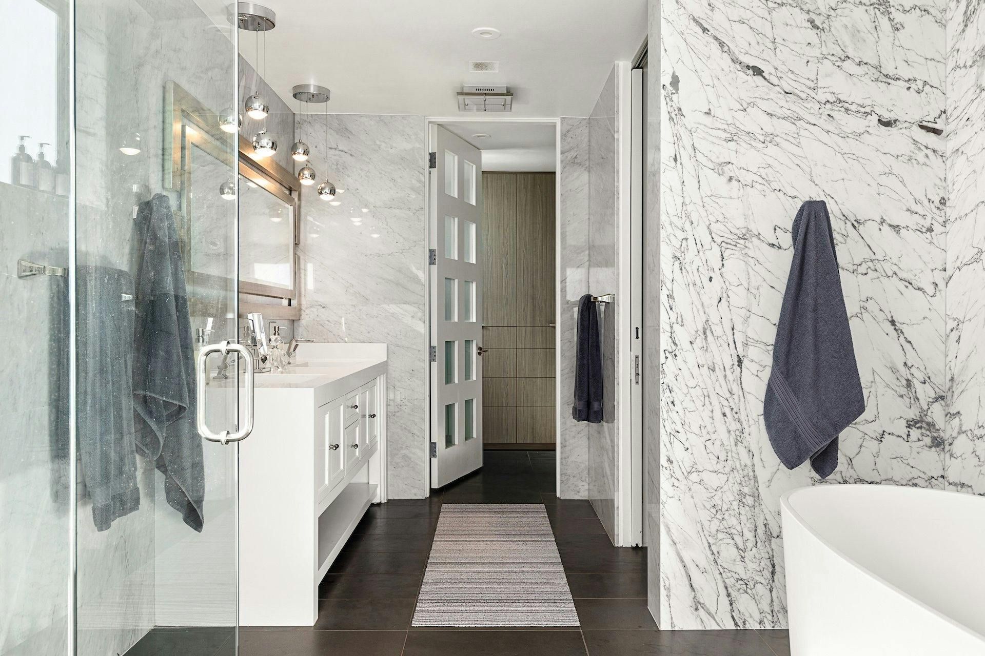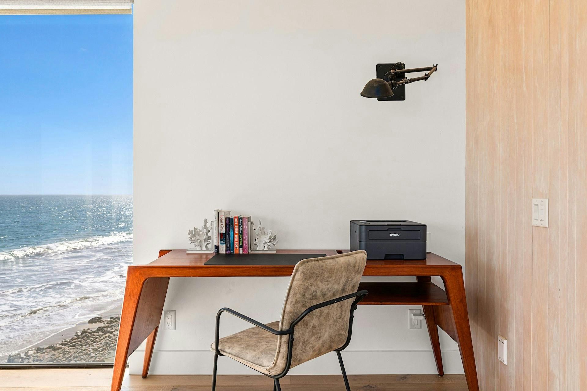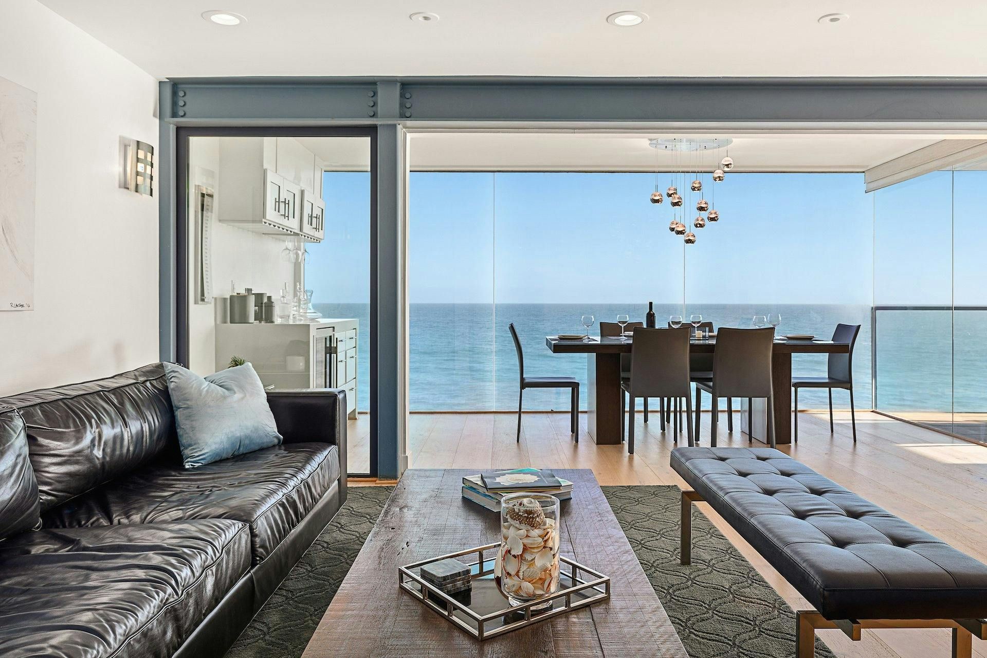 If you’re looking for panoramic ocean views, look no further. The vistas from this Malibu home’s floor-to-ceiling glass windows are stunning, as you can see. We love the main bedroom with its private terrace and marble en-suite bathroom. Outside, there’s a large sofa set around a fire pit, a ping pong table and a Jacuzzi for watching the sunset. And of course, Malibu Beach is just steps away. This home is located in south Malibu close to some excellent restaurants, shops and attractions. Other places of interest include Santa Monica, The Palisades, Topanga Canyon, and Venice Beach. But will you want to leave this wonderful spot?