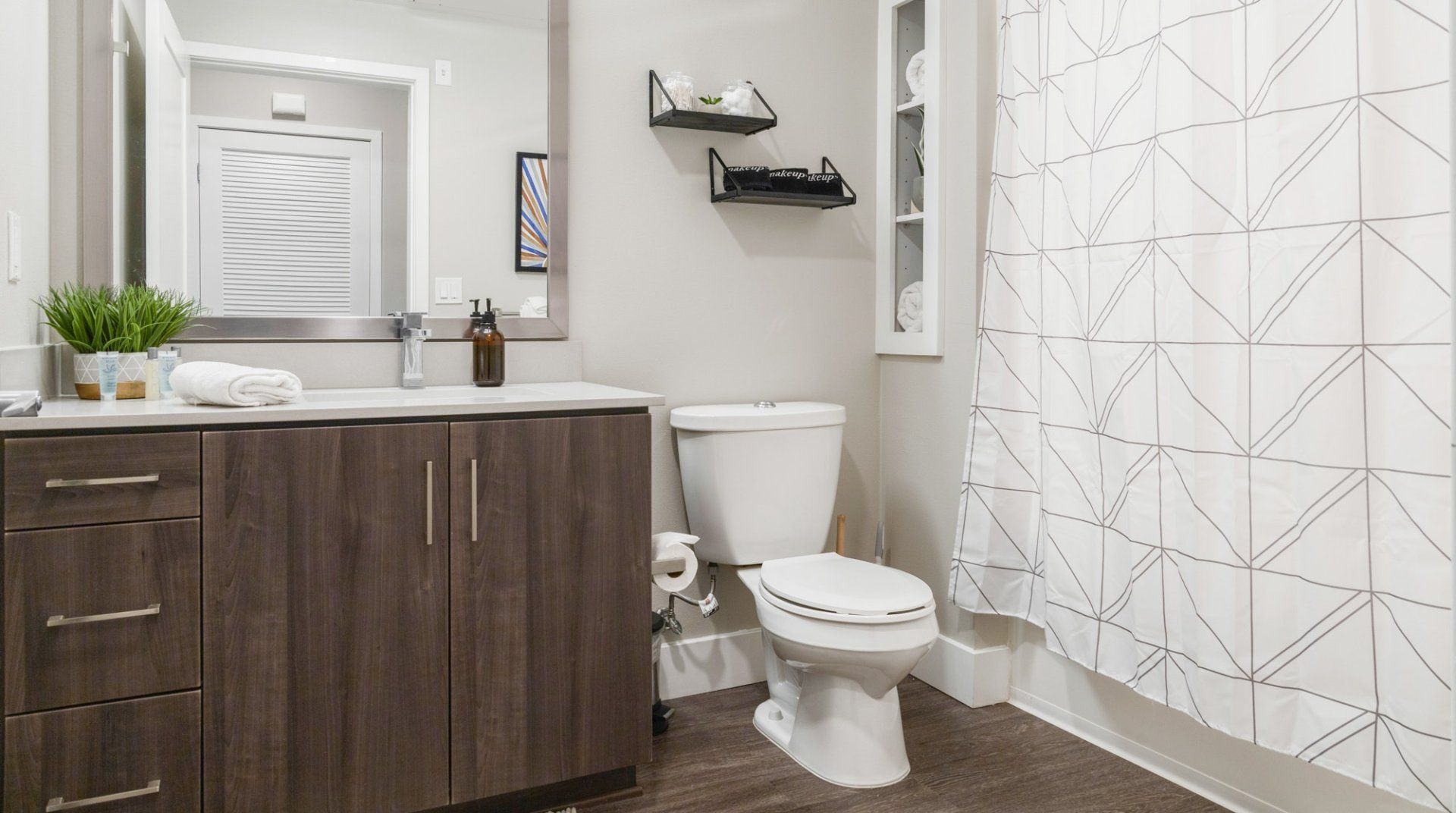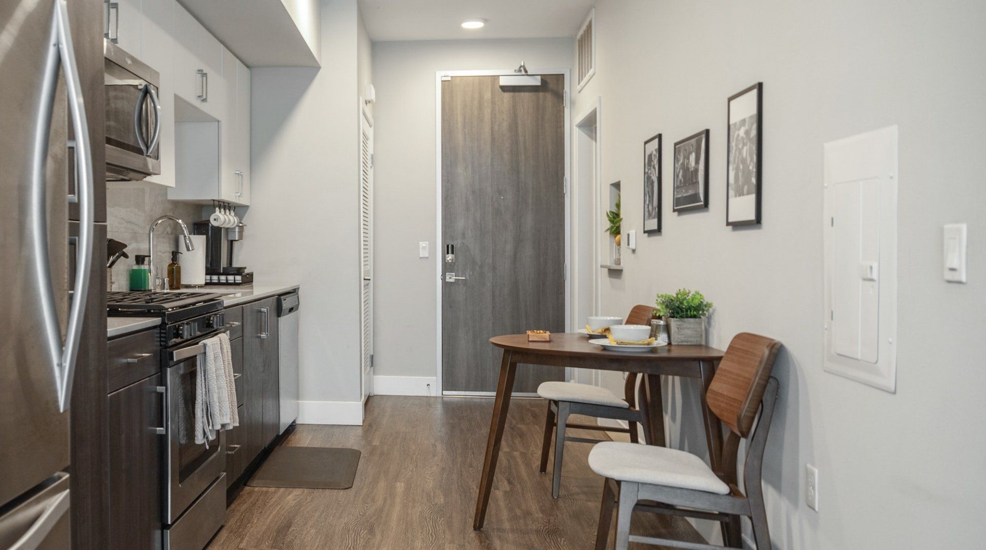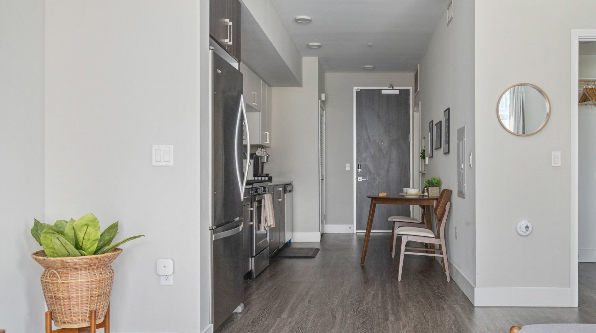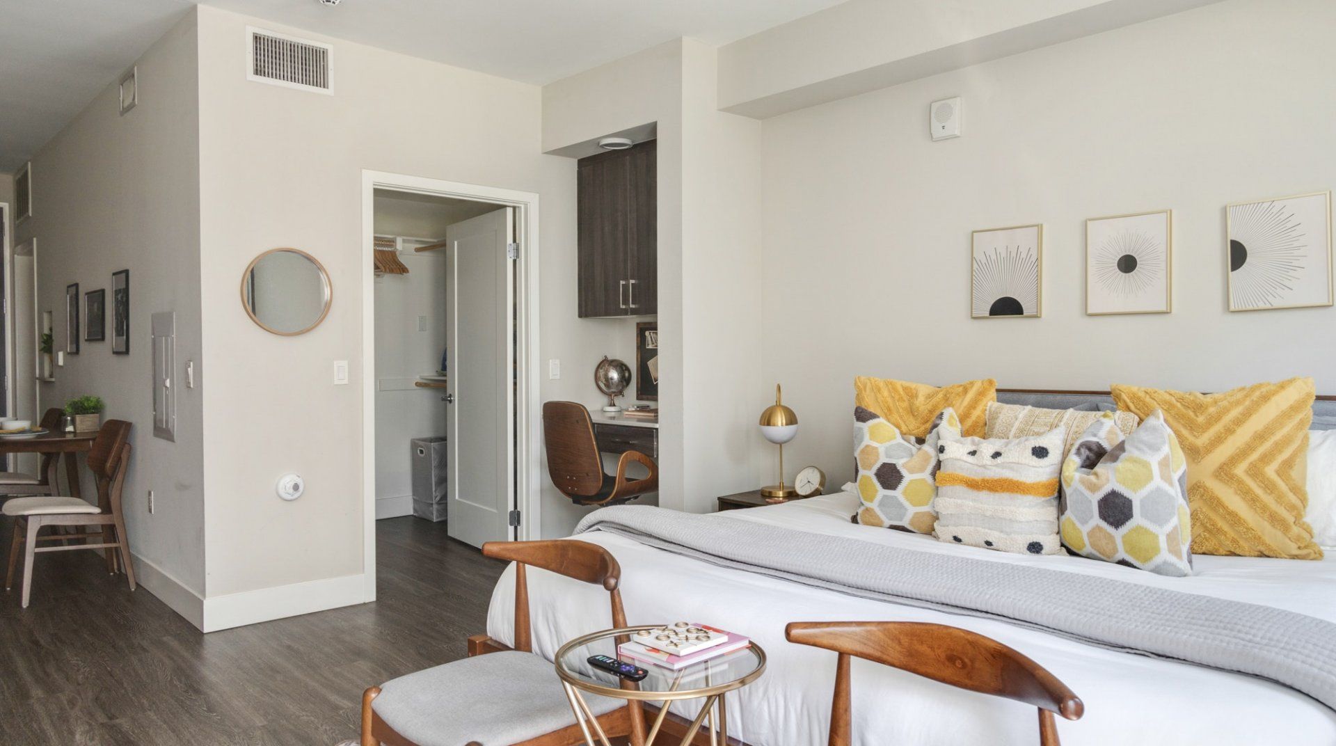 There are several things that lift this Orange studio apartment above its peers. The elegant mid-century furnishings dotted throughout the space bring a touch of class, and the grey colour palette feels particularly en vogue.