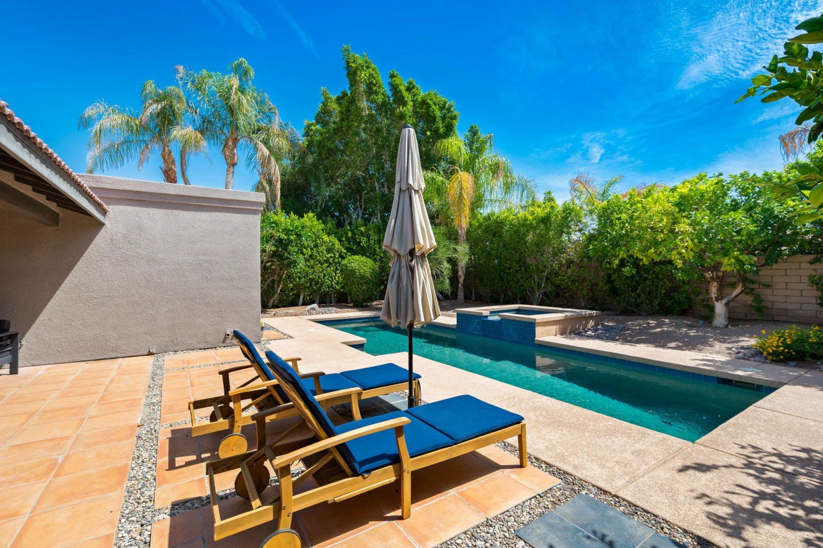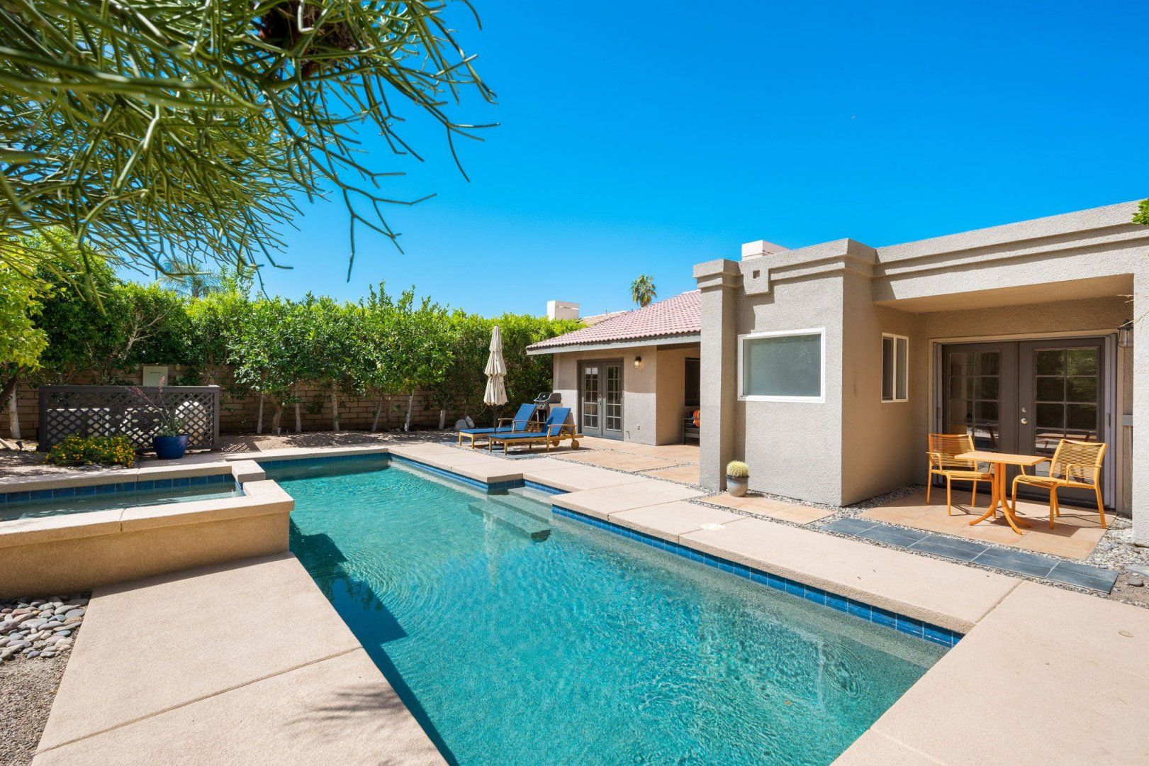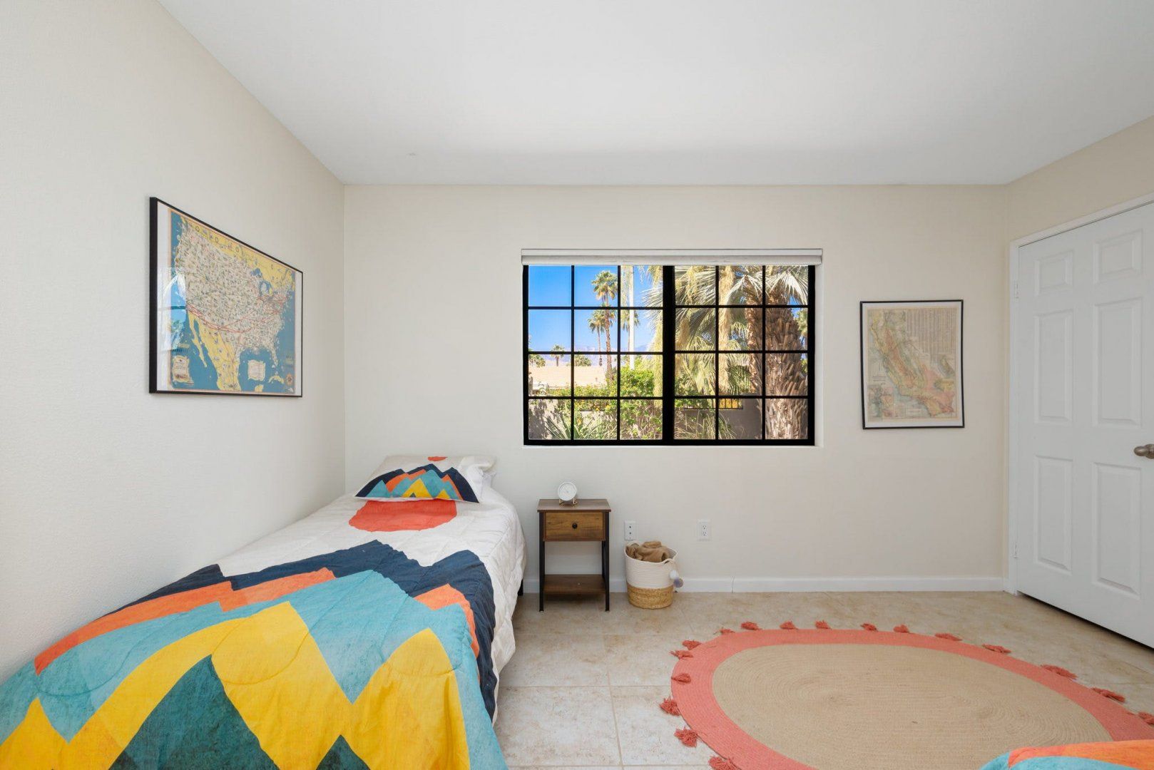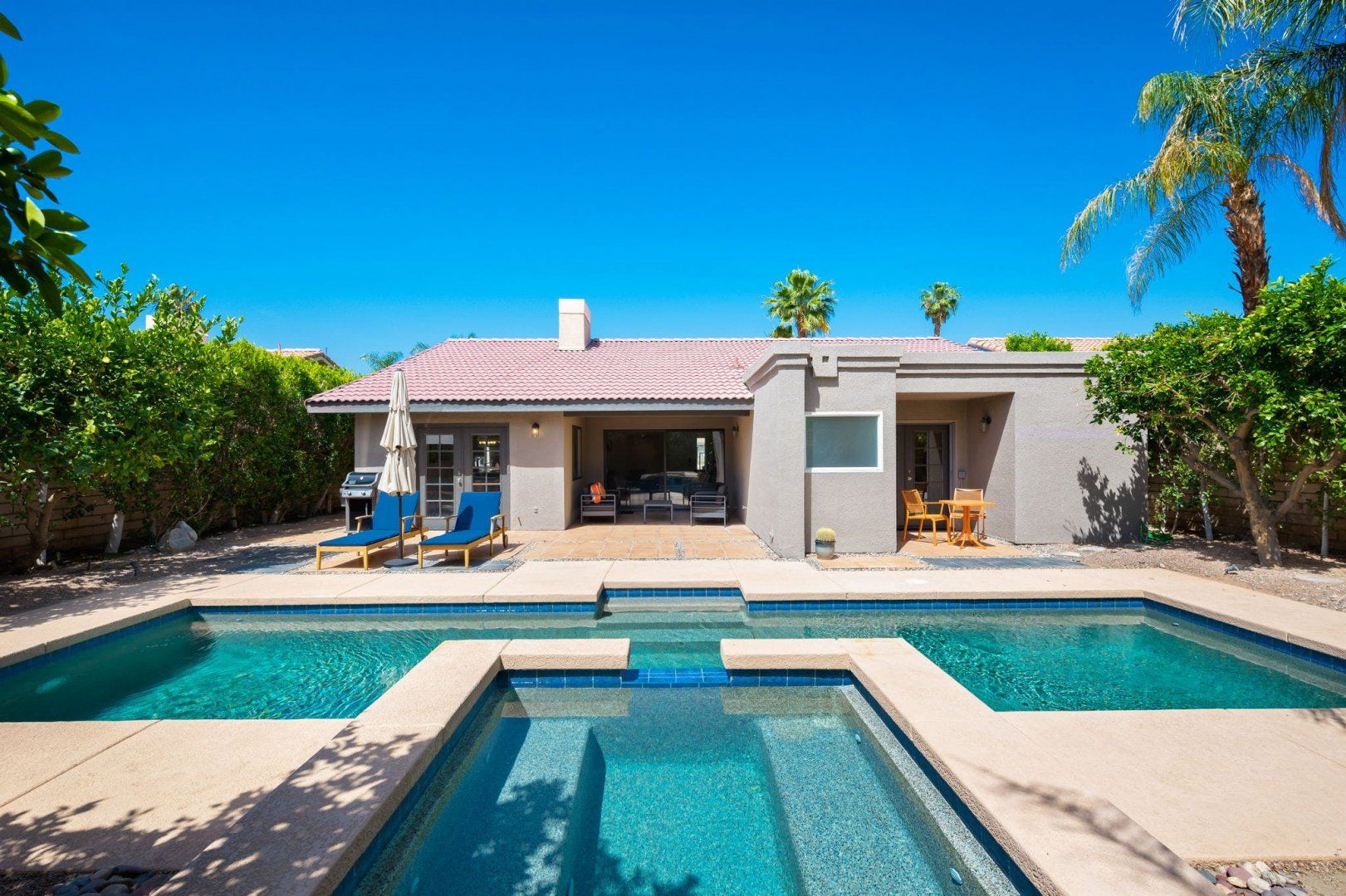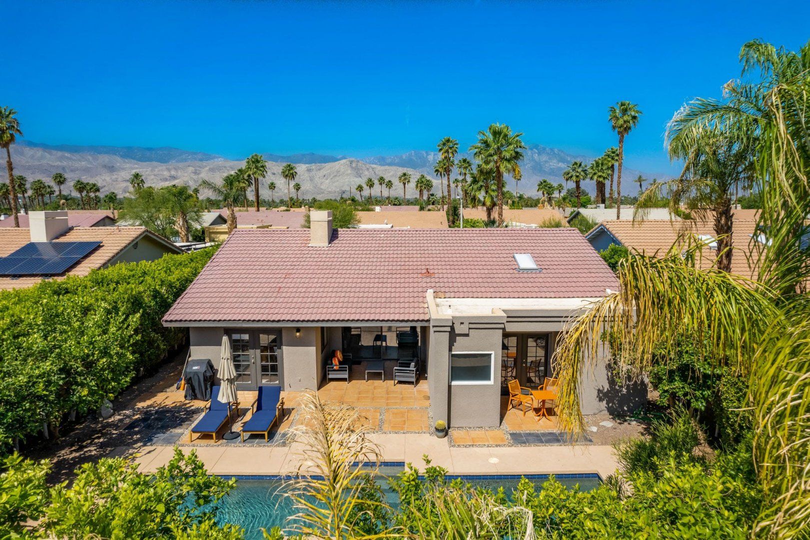 Between the country clubs and golf courses of Rancho Mirage, this mid-century-style bungalow sees some of the prettiest desert sunsets every evening. There’s a supermarket just around the corner and the centre of Palm Springs is a twenty-minute drive away. Bikes are available for those who want to explore on two wheels. The private pool and Jacuzzi provide a tonic for hot desert days and, come twilight, you can admire the silhouette of the San Jacinto mountains. The space inside has been designed to remain cool throughout the day and a fireplace in the living room can keep the evening chill at bay.