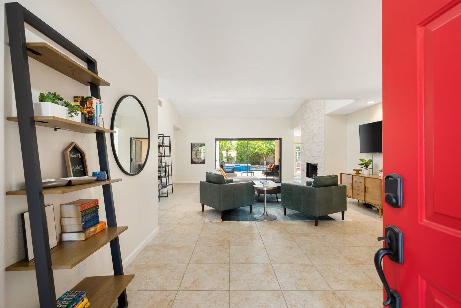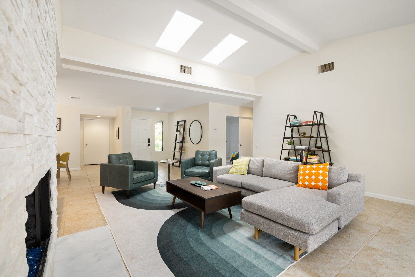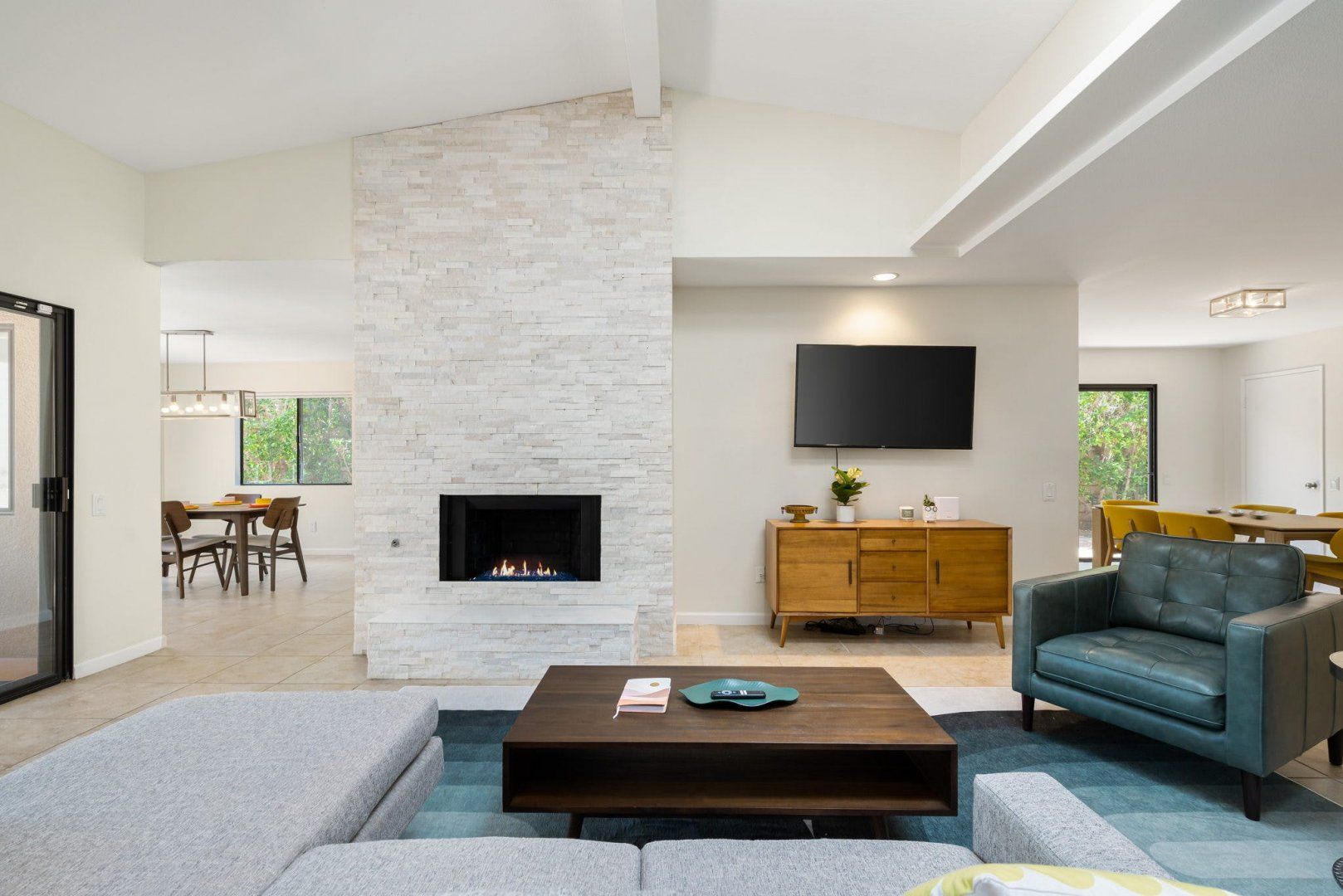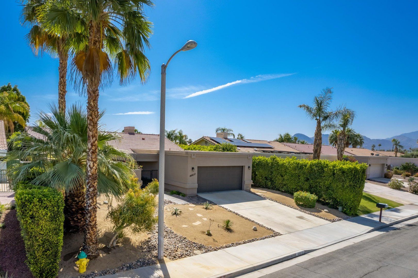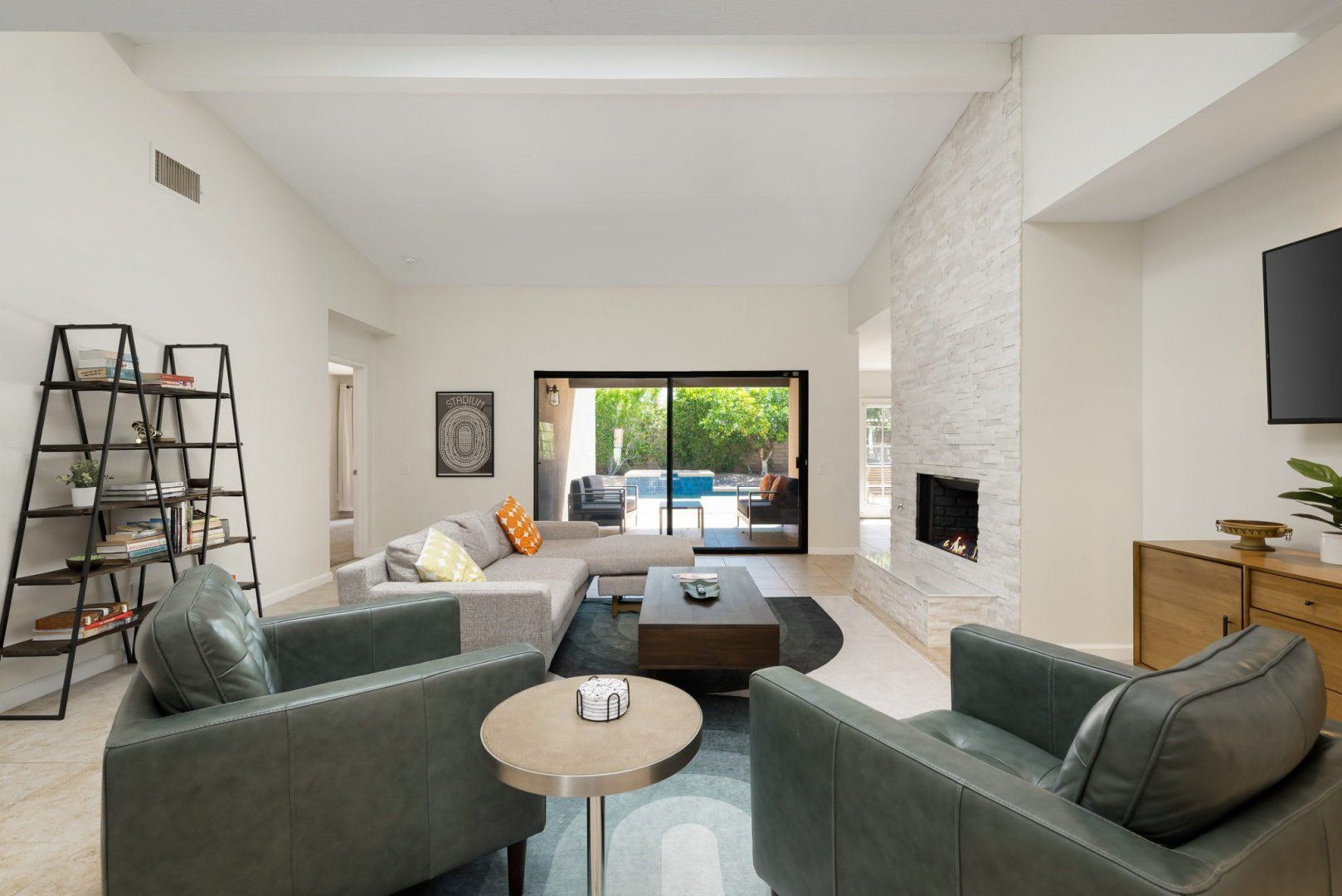 Between the country clubs and golf courses of Rancho Mirage, this mid-century-style bungalow sees some of the prettiest desert sunsets every evening. There’s a supermarket just around the corner and the centre of Palm Springs is a twenty-minute drive away. Bikes are available for those who want to explore on two wheels. The private pool and Jacuzzi provide a tonic for hot desert days and, come twilight, you can admire the silhouette of the San Jacinto mountains. The space inside has been designed to remain cool throughout the day and a fireplace in the living room can keep the evening chill at bay.