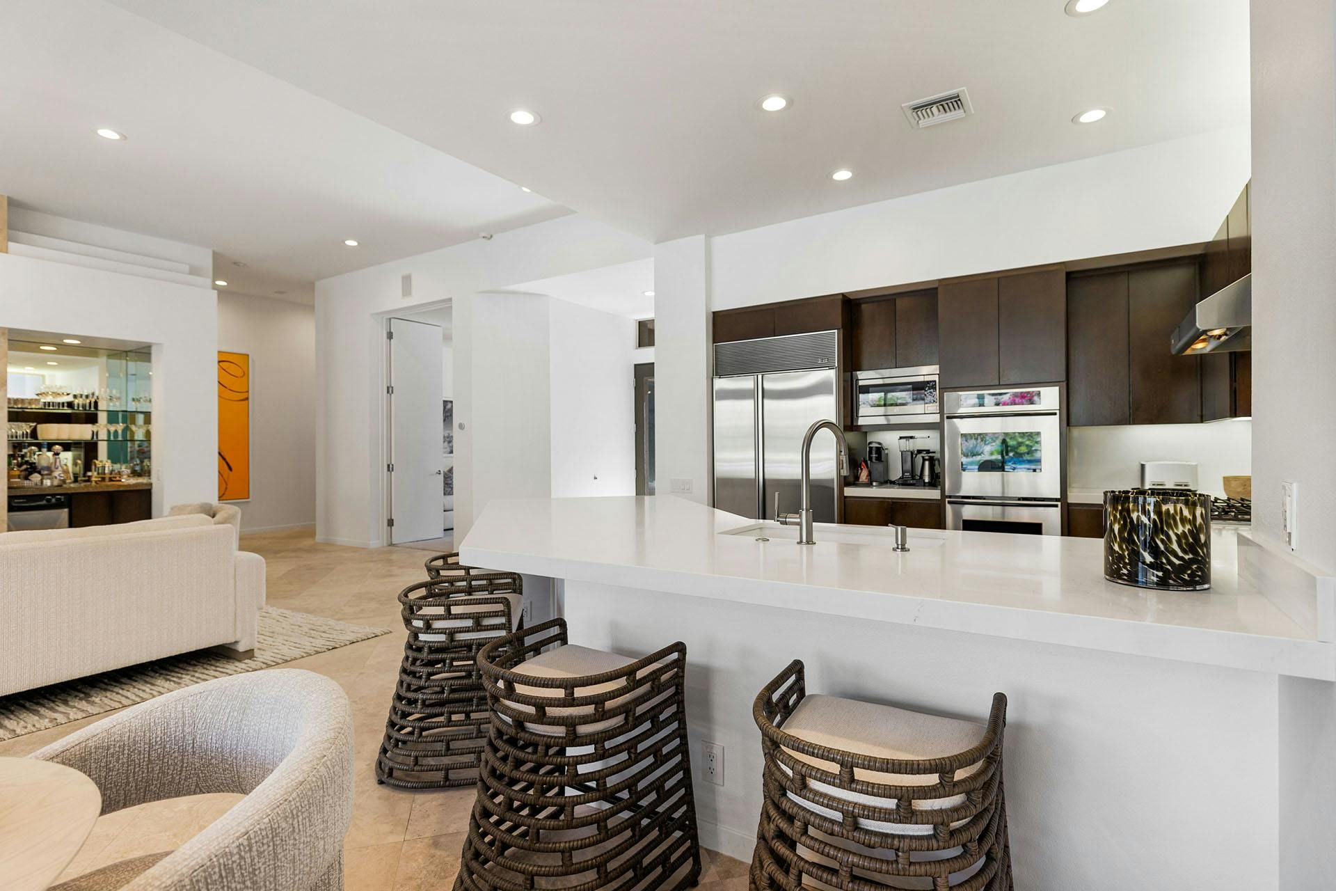 This desert home is ideal for those seeking comfort and convenience near Palm Springs. It comes with all the bells and whistles: pool and hot tub, outdoor TV, firepit, bar and wine cooler – the list goes on. And, being surrounded by mountain views, and just a short drive to shopping malls, restaurants and more, this place sure has a lot to like about it. The studio that houses the second king-size bedroom comes with its own kitchenette, which is a nice touch – particularly for groups seeking both privacy and a convivial set-up for their next holiday.