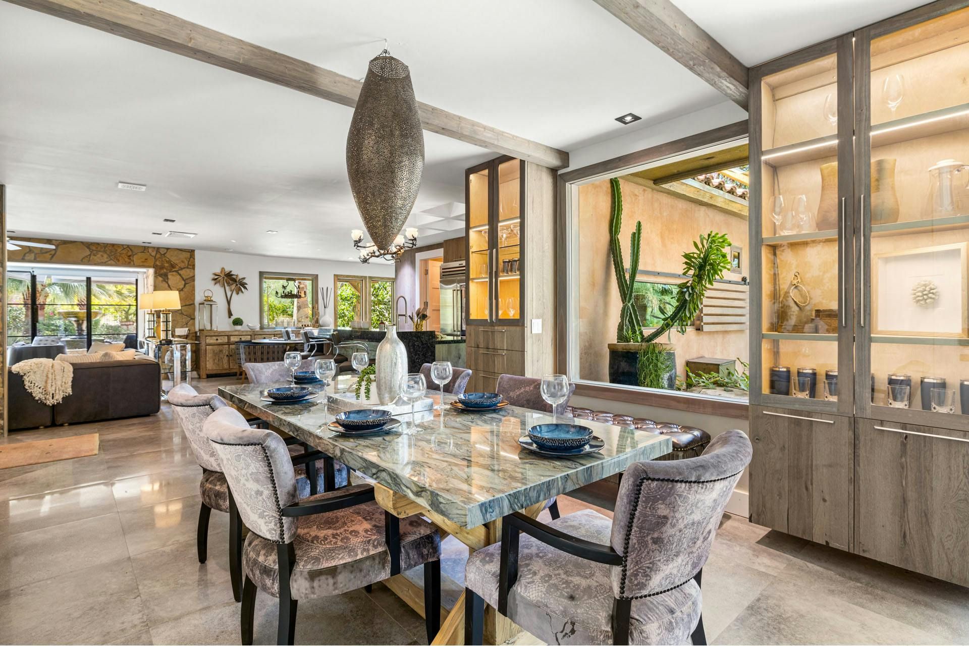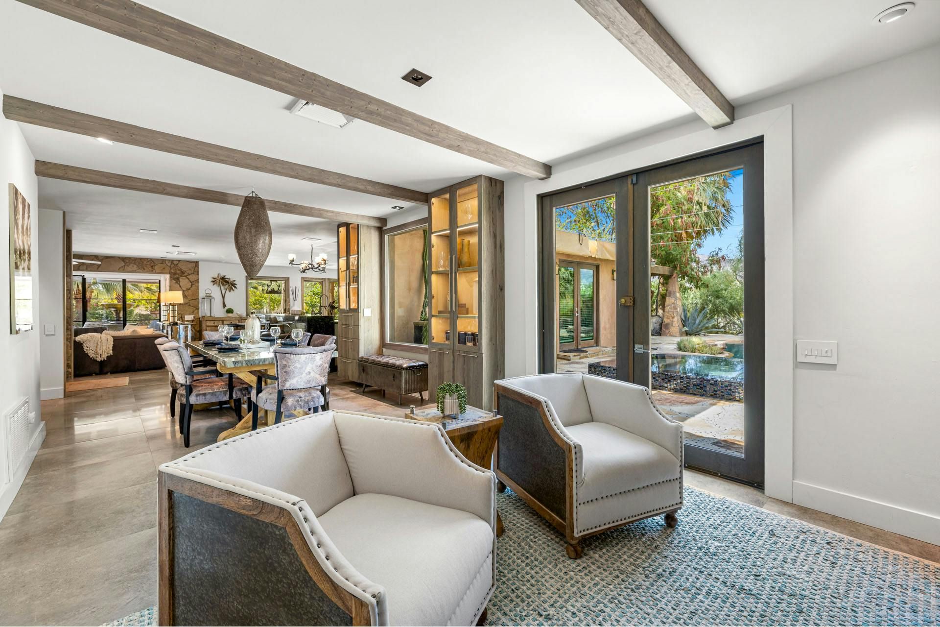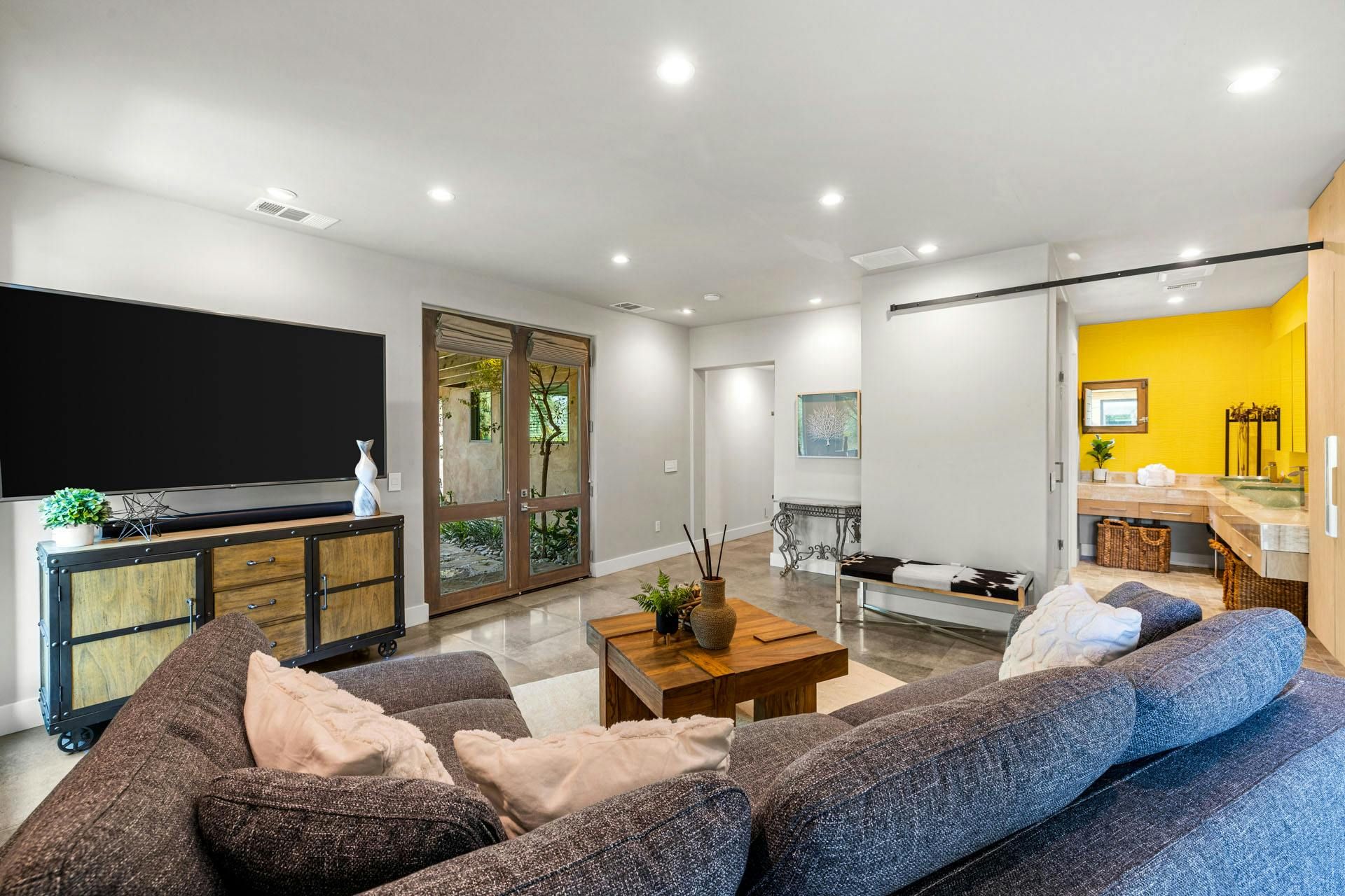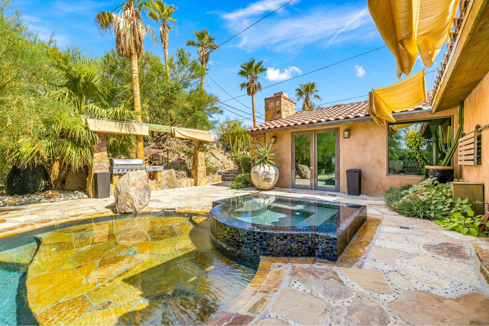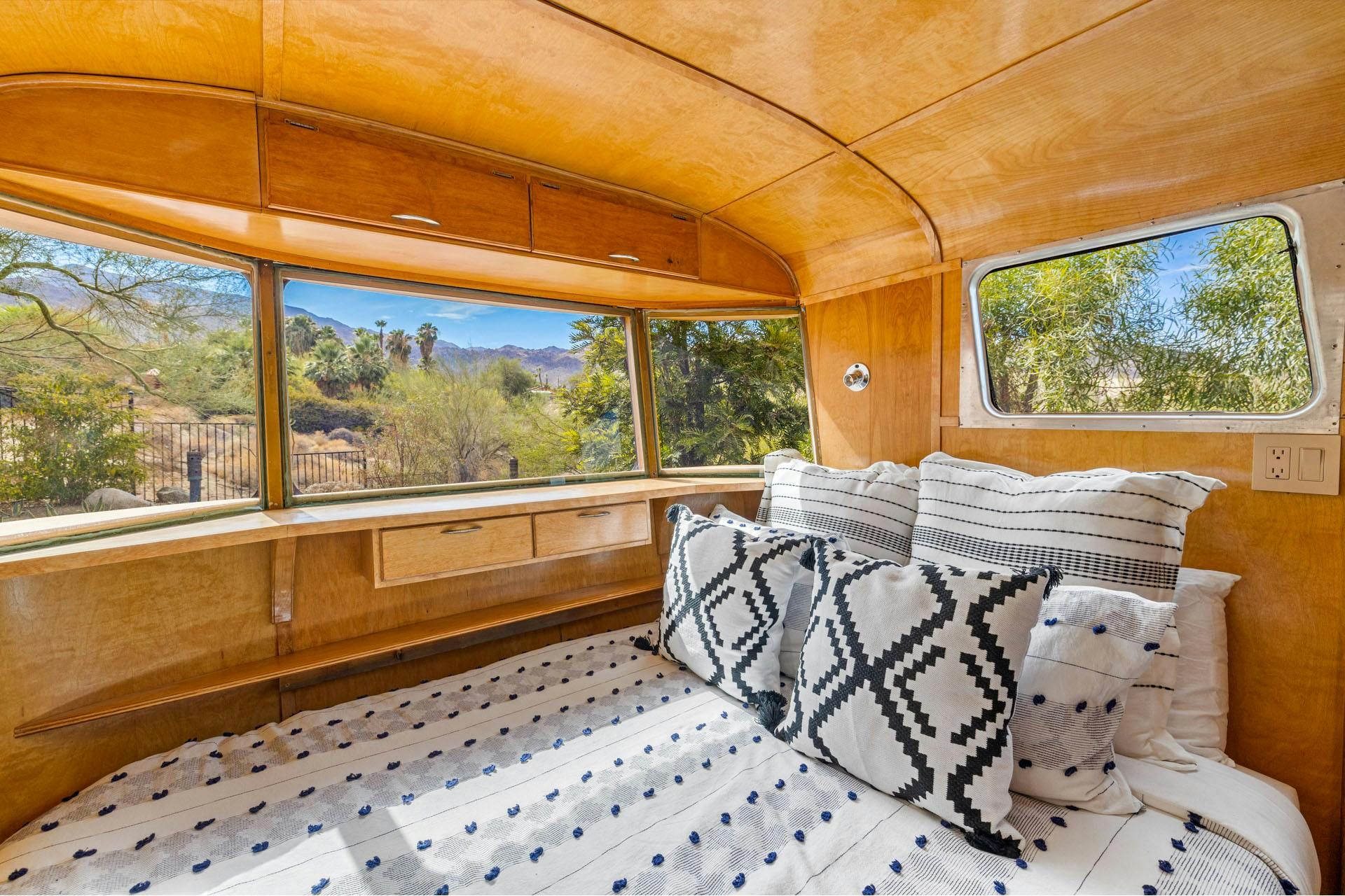 This expansive home is a real oasis. Nestled among lush gardens, the welcoming backyard has a sunny swimming pool, heated outdoor tub, and a barbecue and fire pit for nights under the stars. And because the rooms are spread over the main house, two garden guest houses, and a restored retro aircraft trailer, there’s plenty of space to stretch out and get comfy. The location is a winner too, close to restaurants, shops, and golf courses in Palm Desert, and less than thirty-minutes’ drive from Palm Springs. It’s desert living, with a dash of luxury.