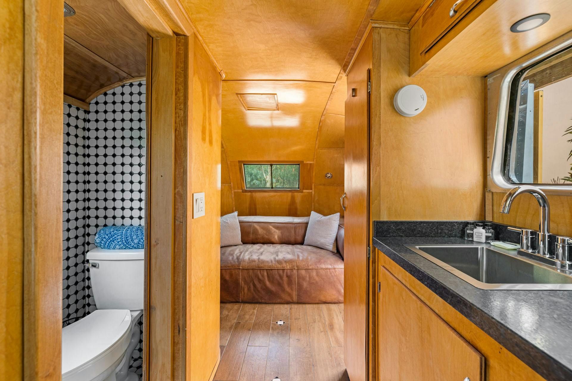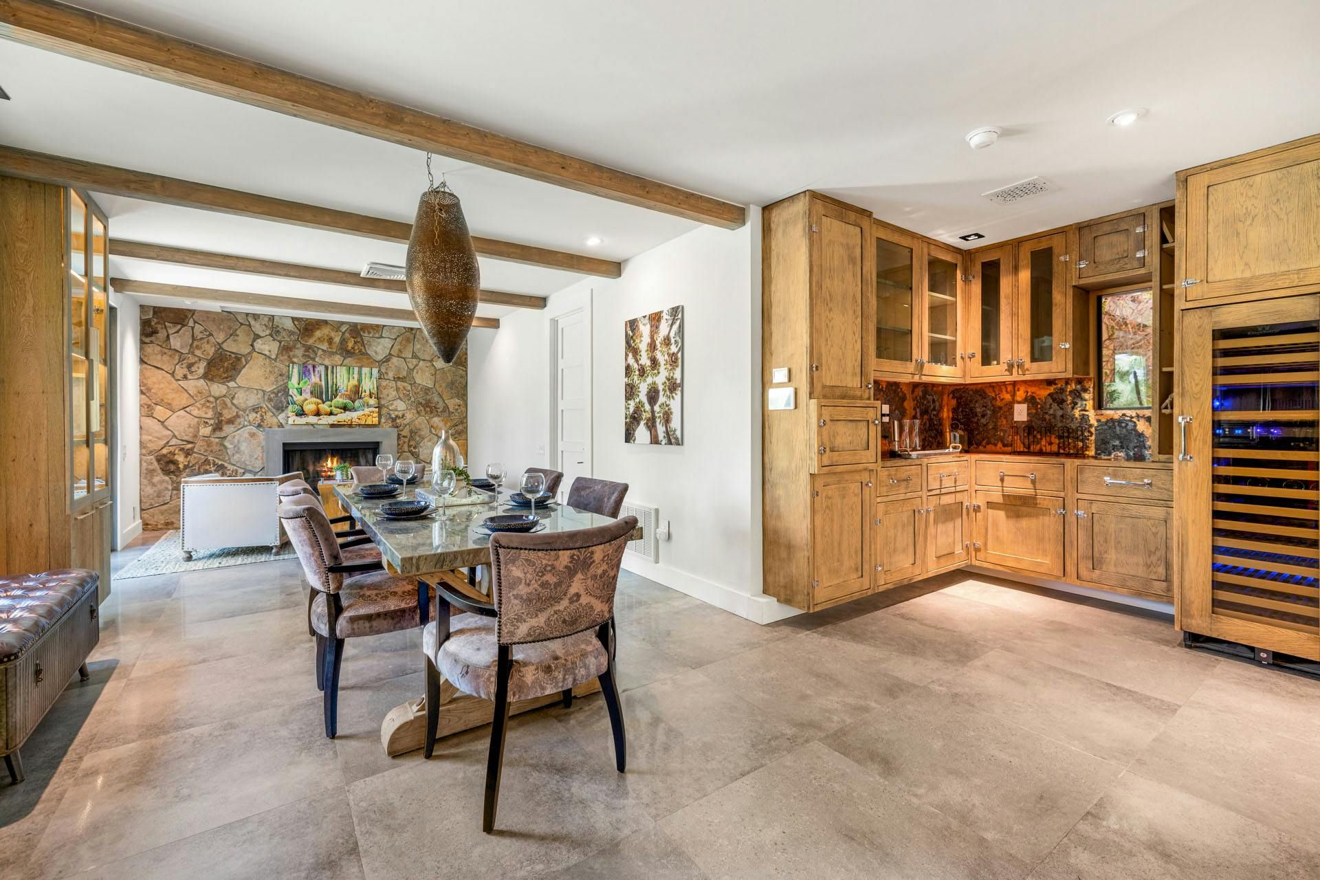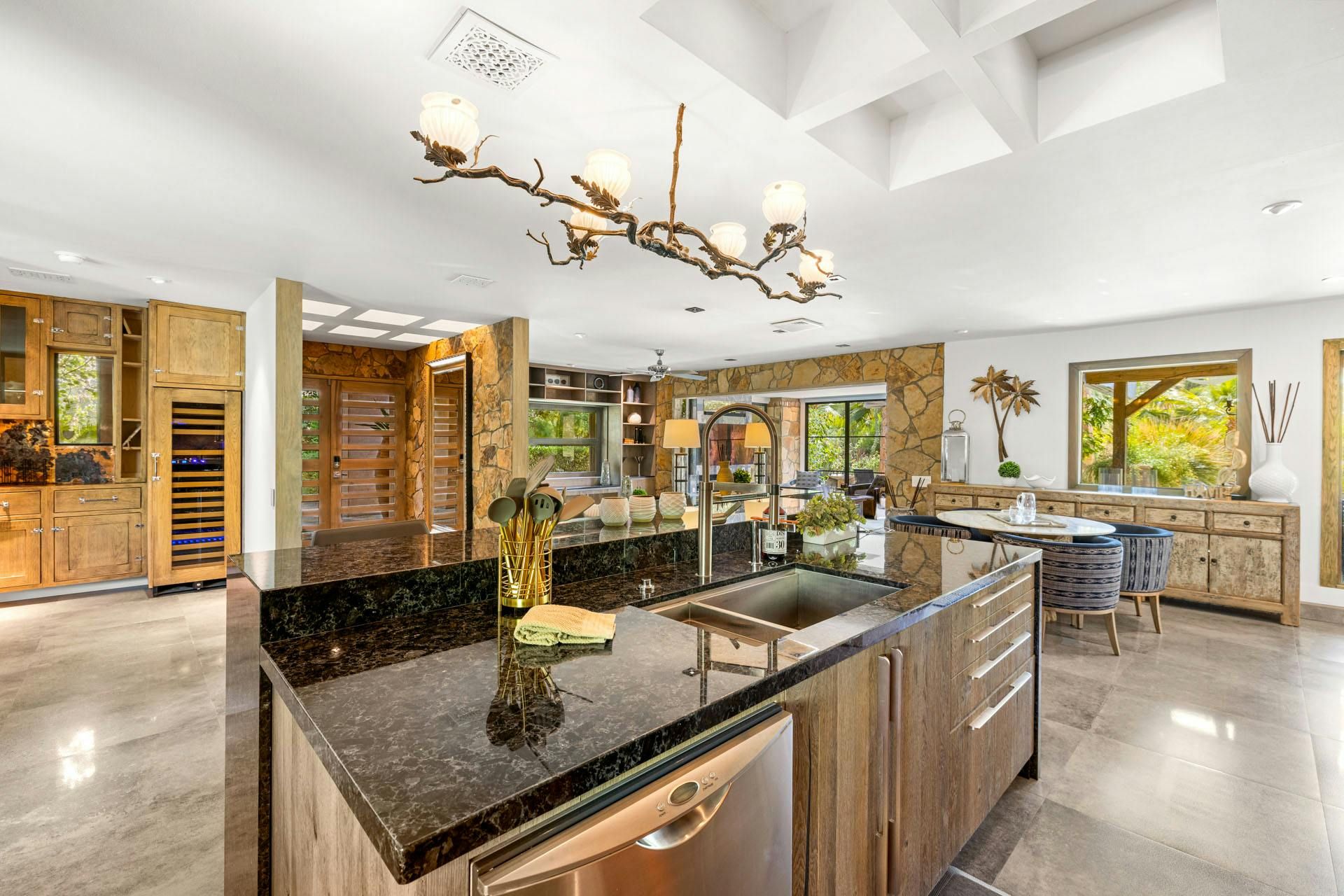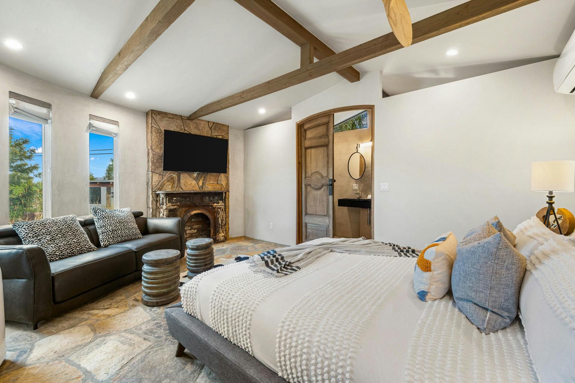 This expansive home is a real oasis. Nestled among lush gardens, the welcoming backyard has a sunny swimming pool, heated outdoor tub, and a barbecue and fire pit for nights under the stars. And because the rooms are spread over the main house, two garden guest houses, and a restored retro aircraft trailer, there’s plenty of space to stretch out and get comfy. The location is a winner too, close to restaurants, shops, and golf courses in Palm Desert, and less than thirty-minutes’ drive from Palm Springs. It’s desert living, with a dash of luxury.