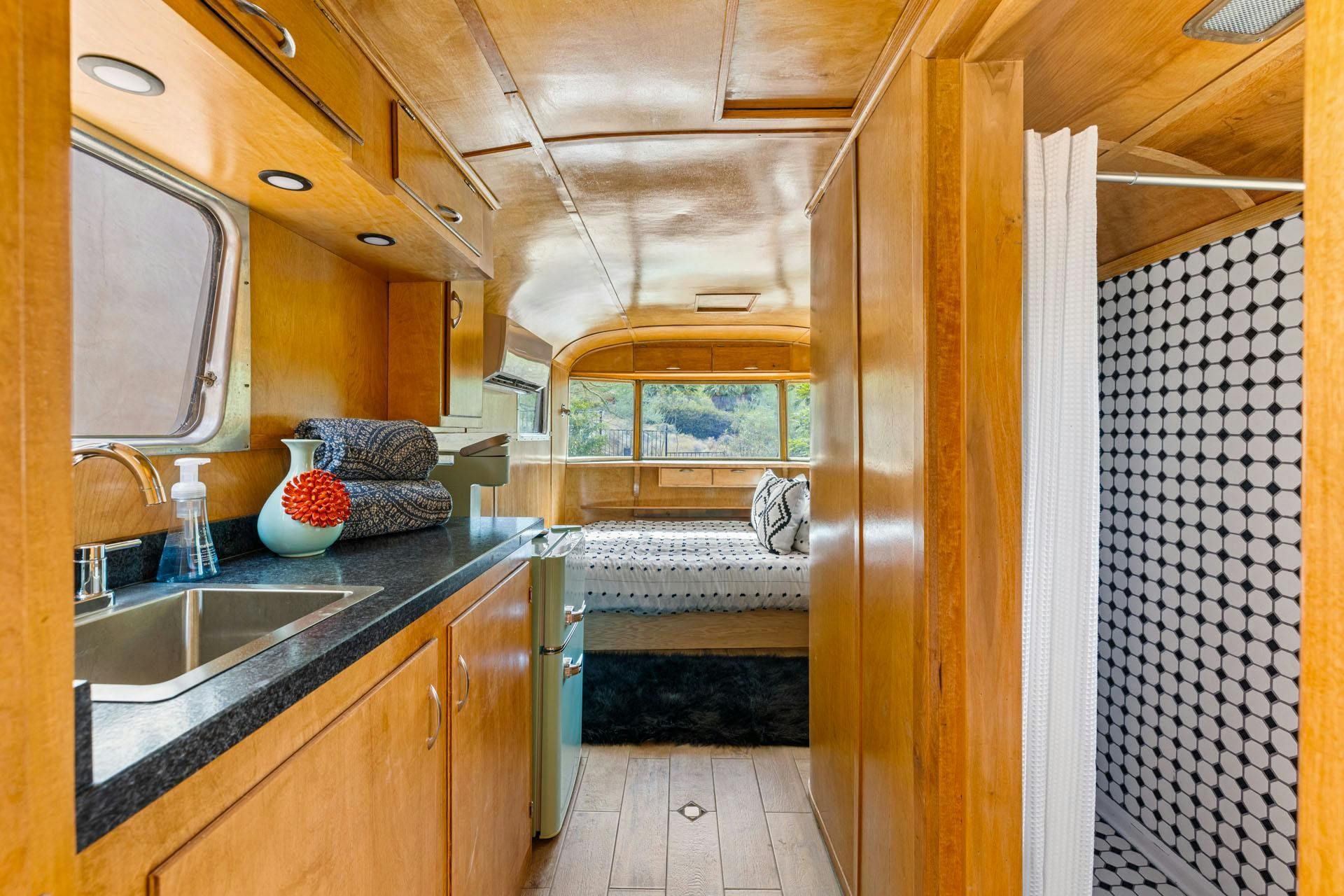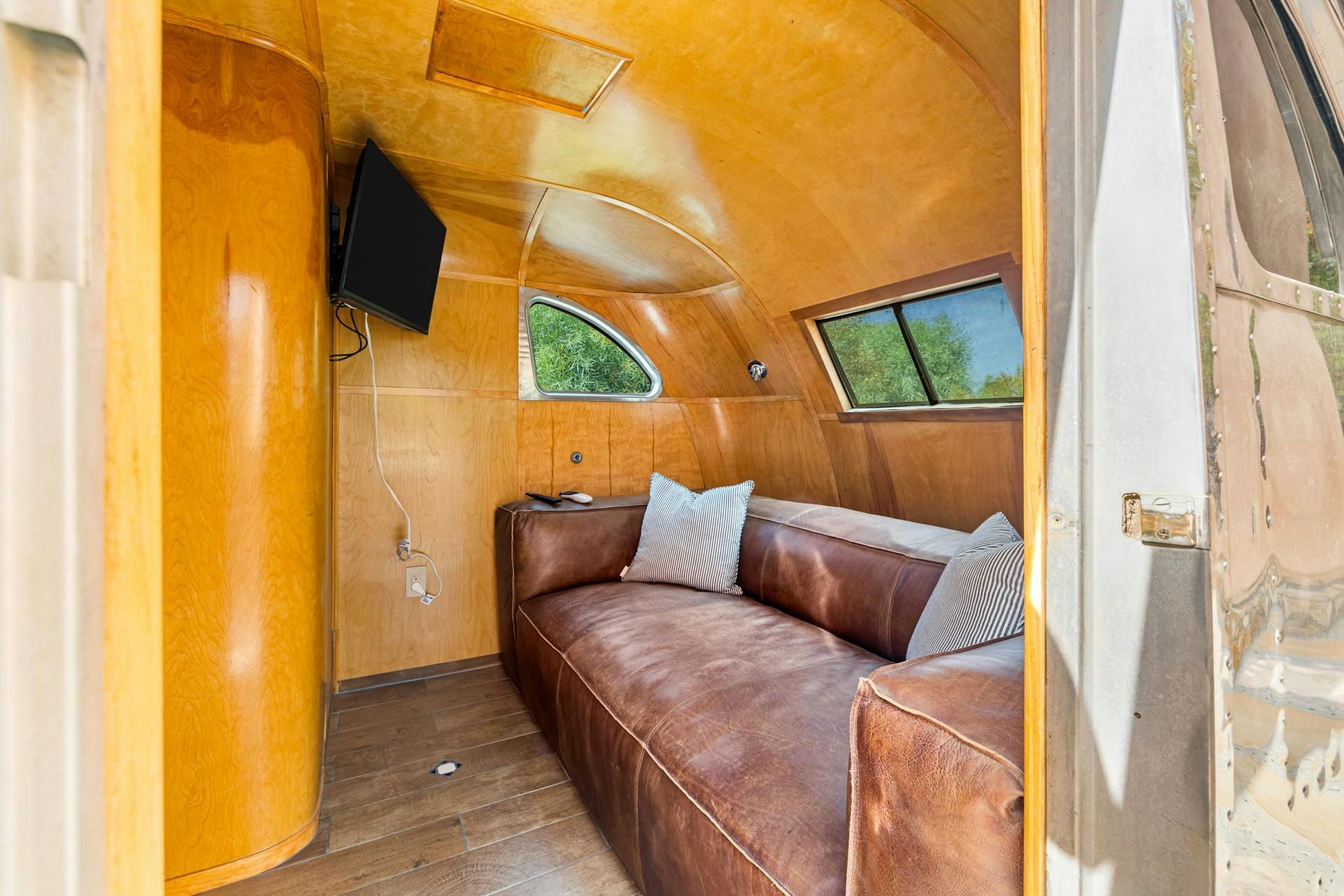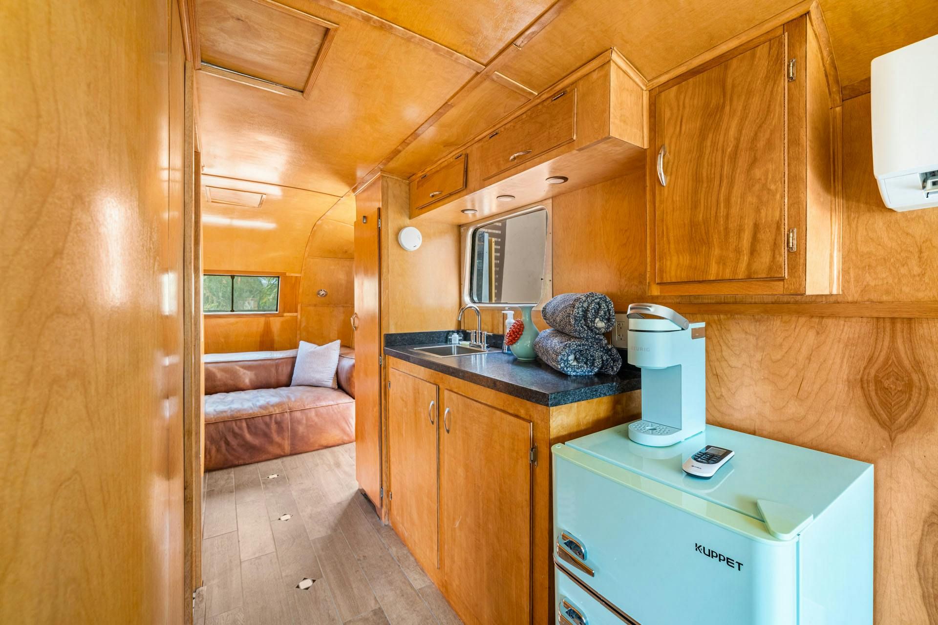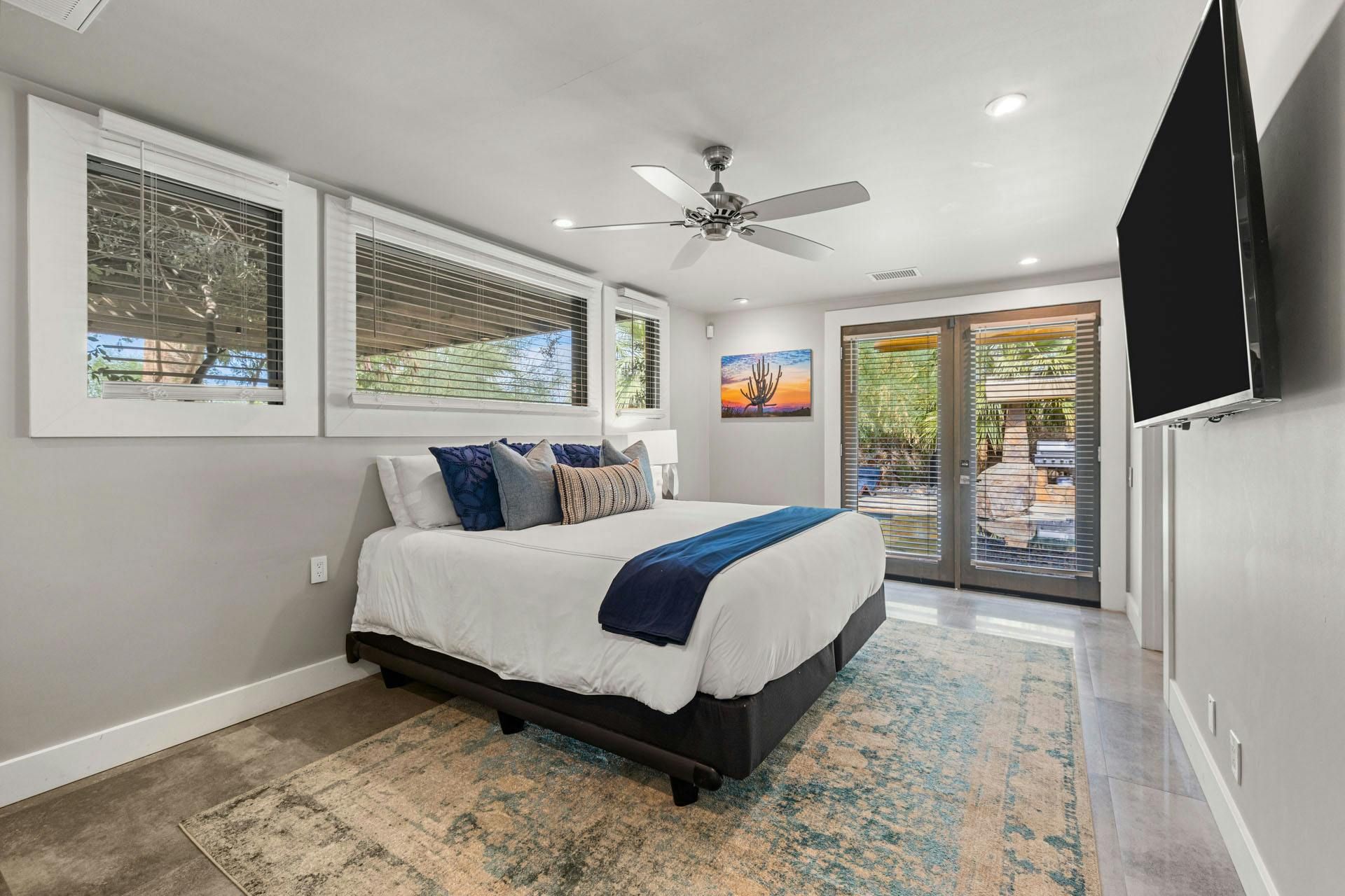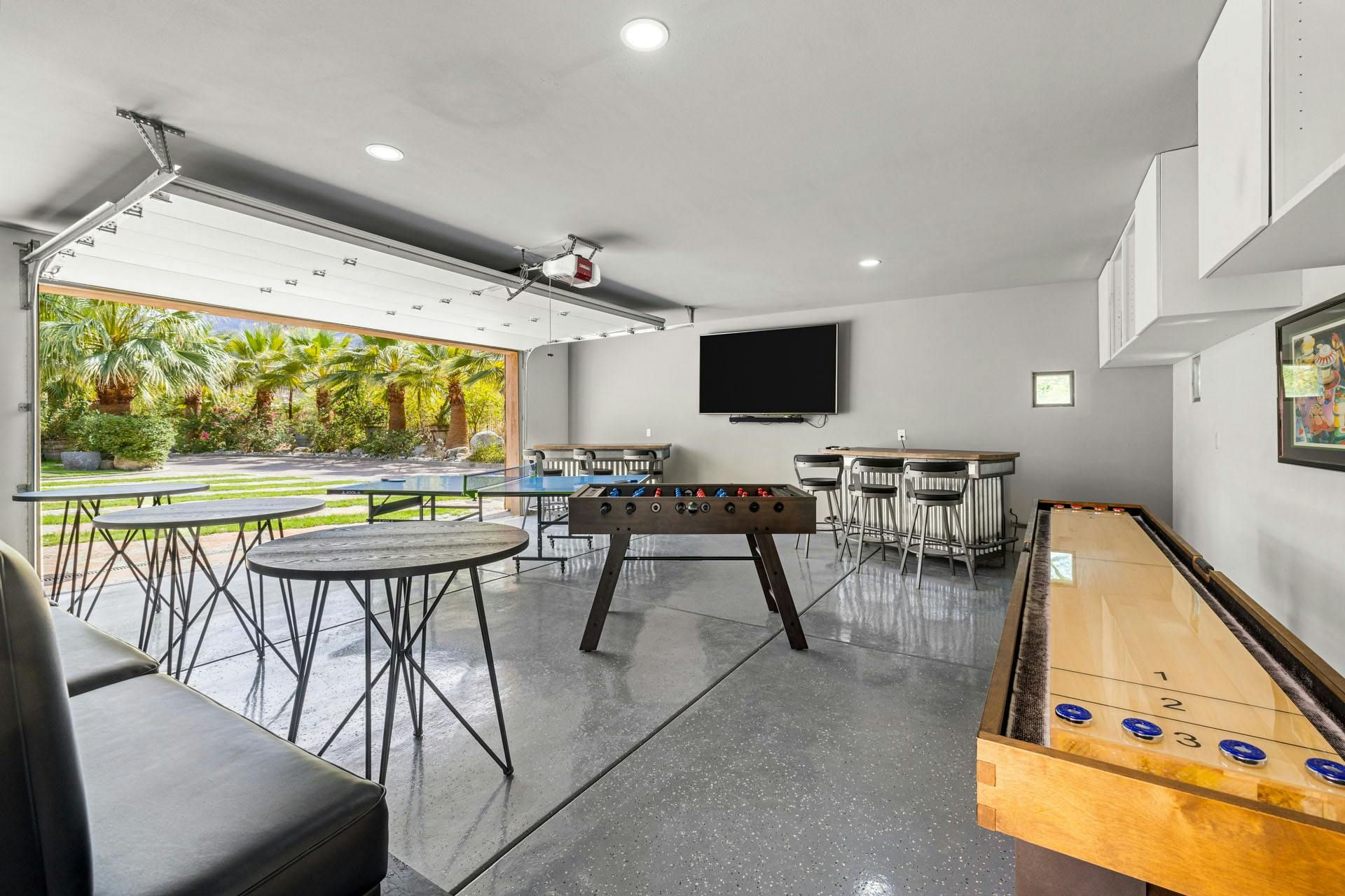 This expansive home is a real oasis. Nestled among lush gardens, the welcoming backyard has a sunny swimming pool, heated outdoor tub, and a barbecue and fire pit for nights under the stars. And because the rooms are spread over the main house, two garden guest houses, and a restored retro aircraft trailer, there’s plenty of space to stretch out and get comfy. The location is a winner too, close to restaurants, shops, and golf courses in Palm Desert, and less than thirty-minutes’ drive from Palm Springs. It’s desert living, with a dash of luxury.
