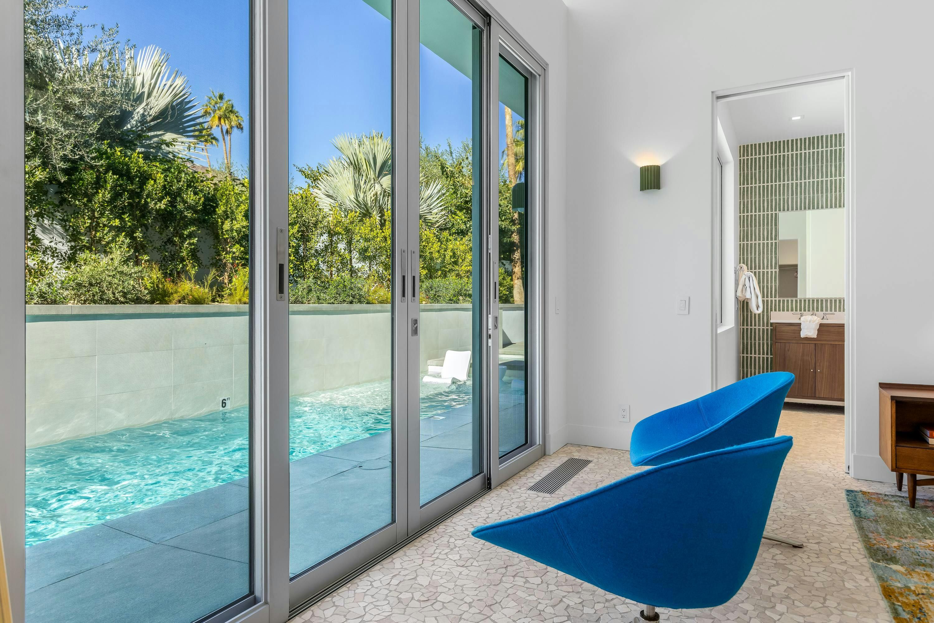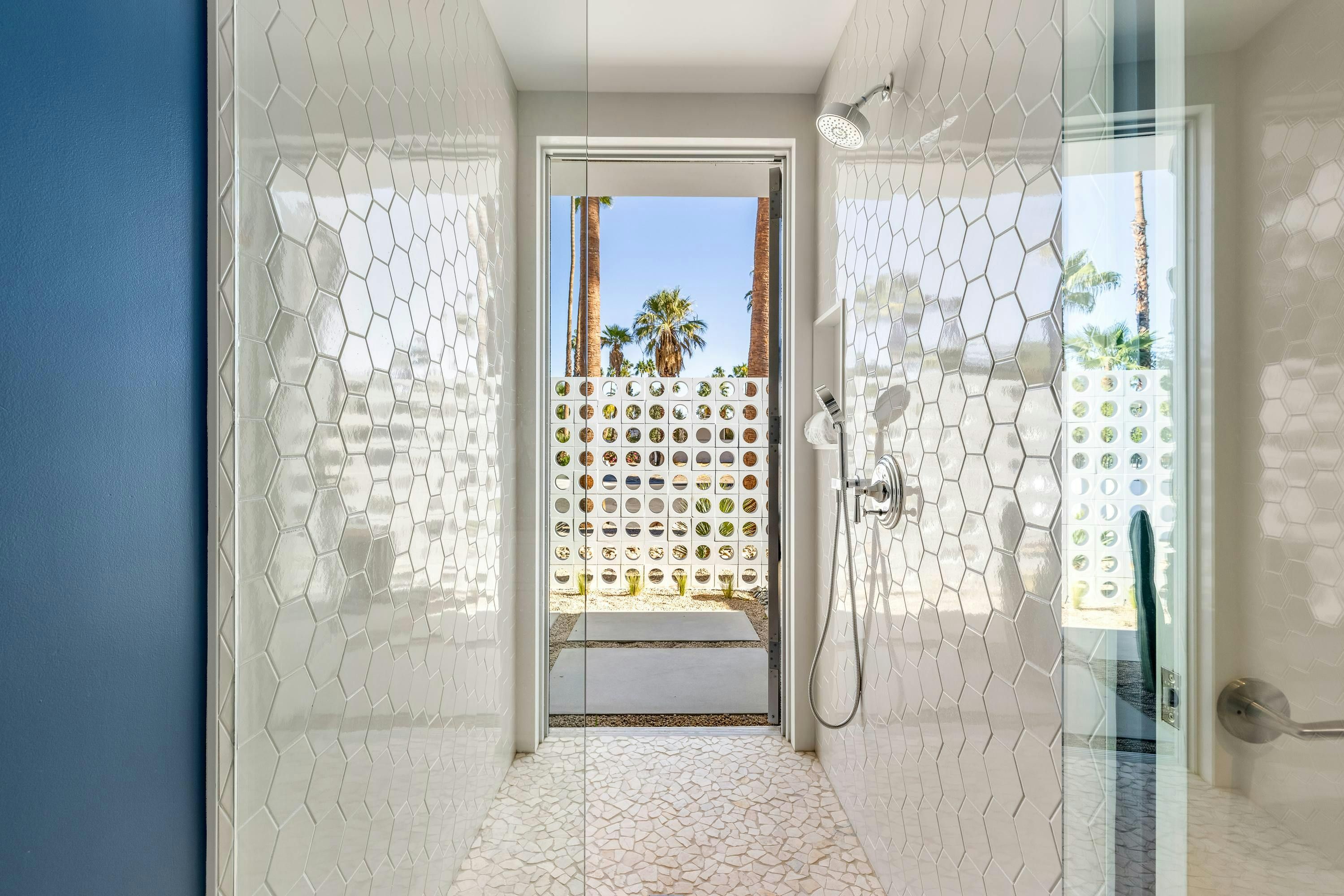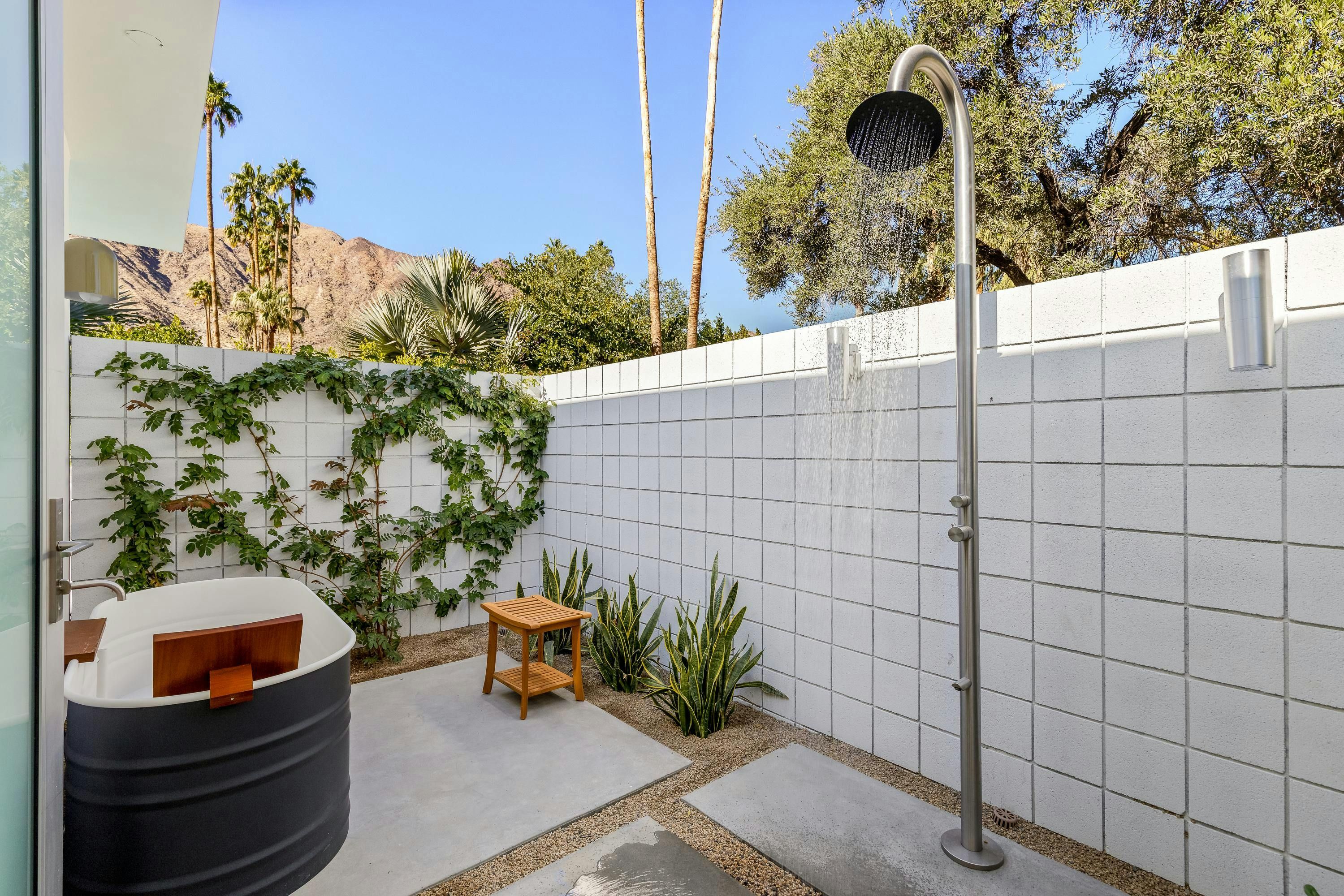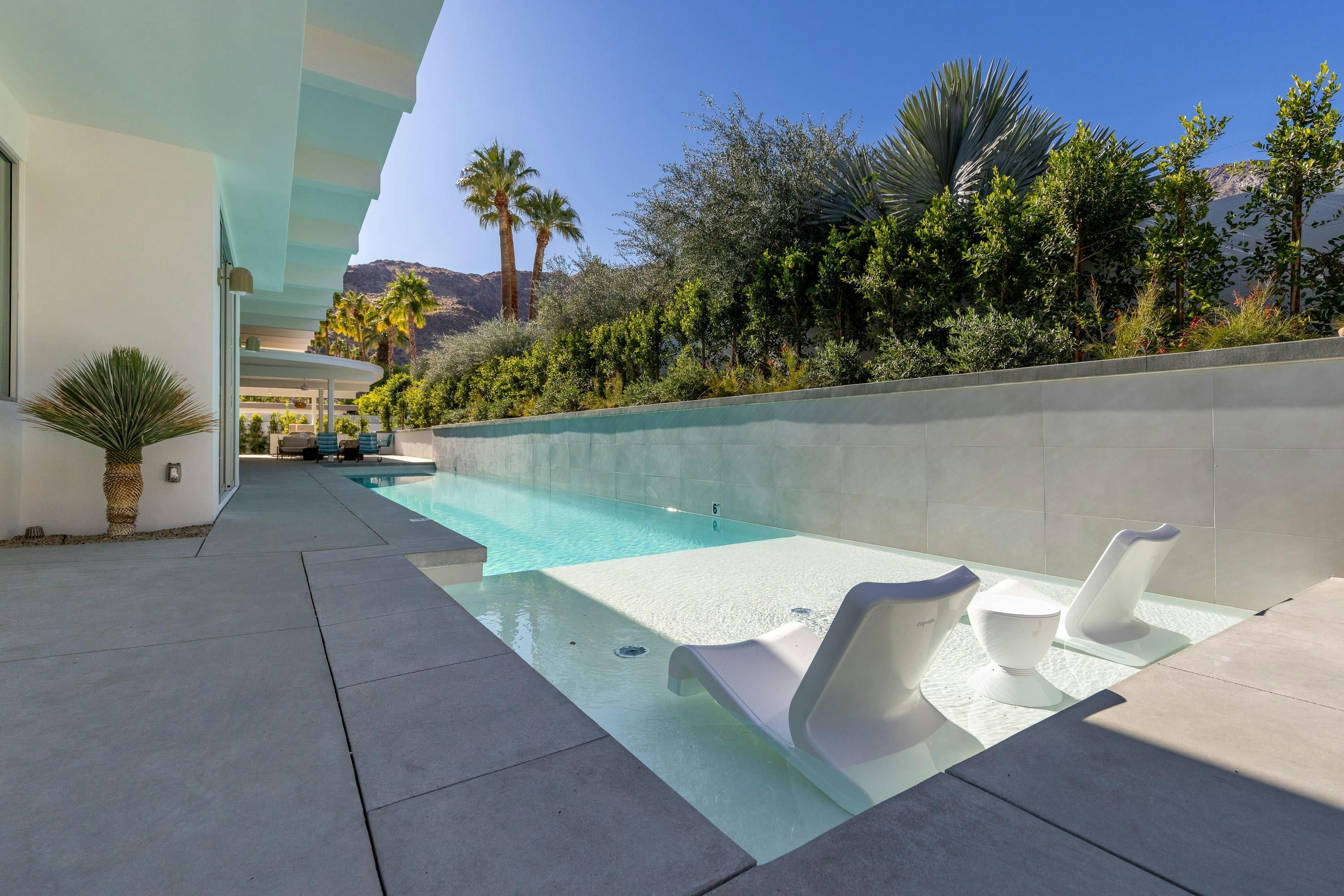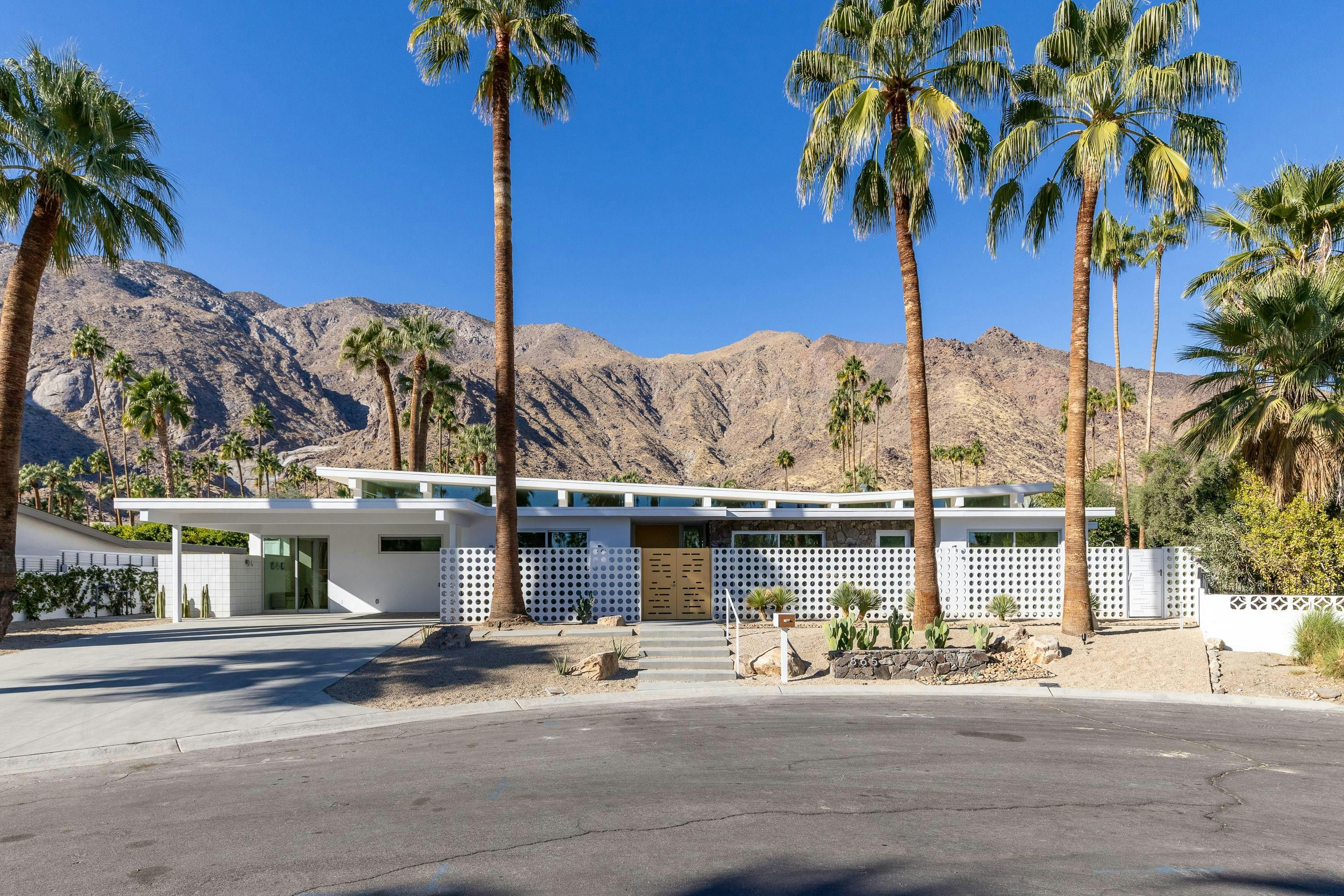 A mid-century modern gem, this beautiful home is located in the heart of Vista Las Palmas. It’s mere moments from Palm Canyon Drive and its dining, shopping, and galleries. High ceilings, an open floor plan, and glass walls make this bright, welcoming home perfect for entertaining – there’s a gourmet kitchen, a chic dining space, and even a bar. Outside, you’ll have a pool to swim in, a spa for lounging, an outdoor kitchen, and a firepit for cosy after-dinner cocktails. The primary suite boasts an outdoor shower and bathtub.