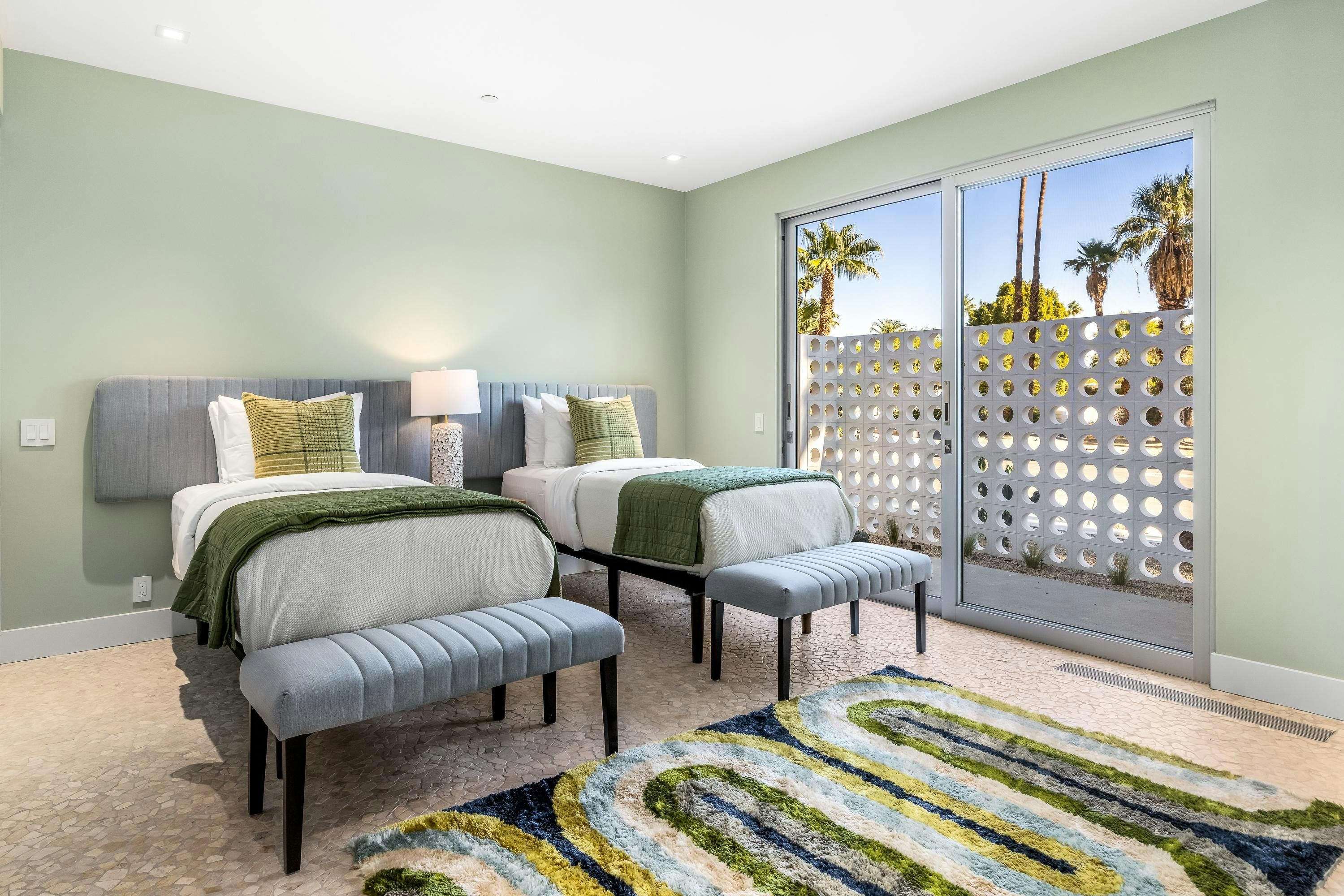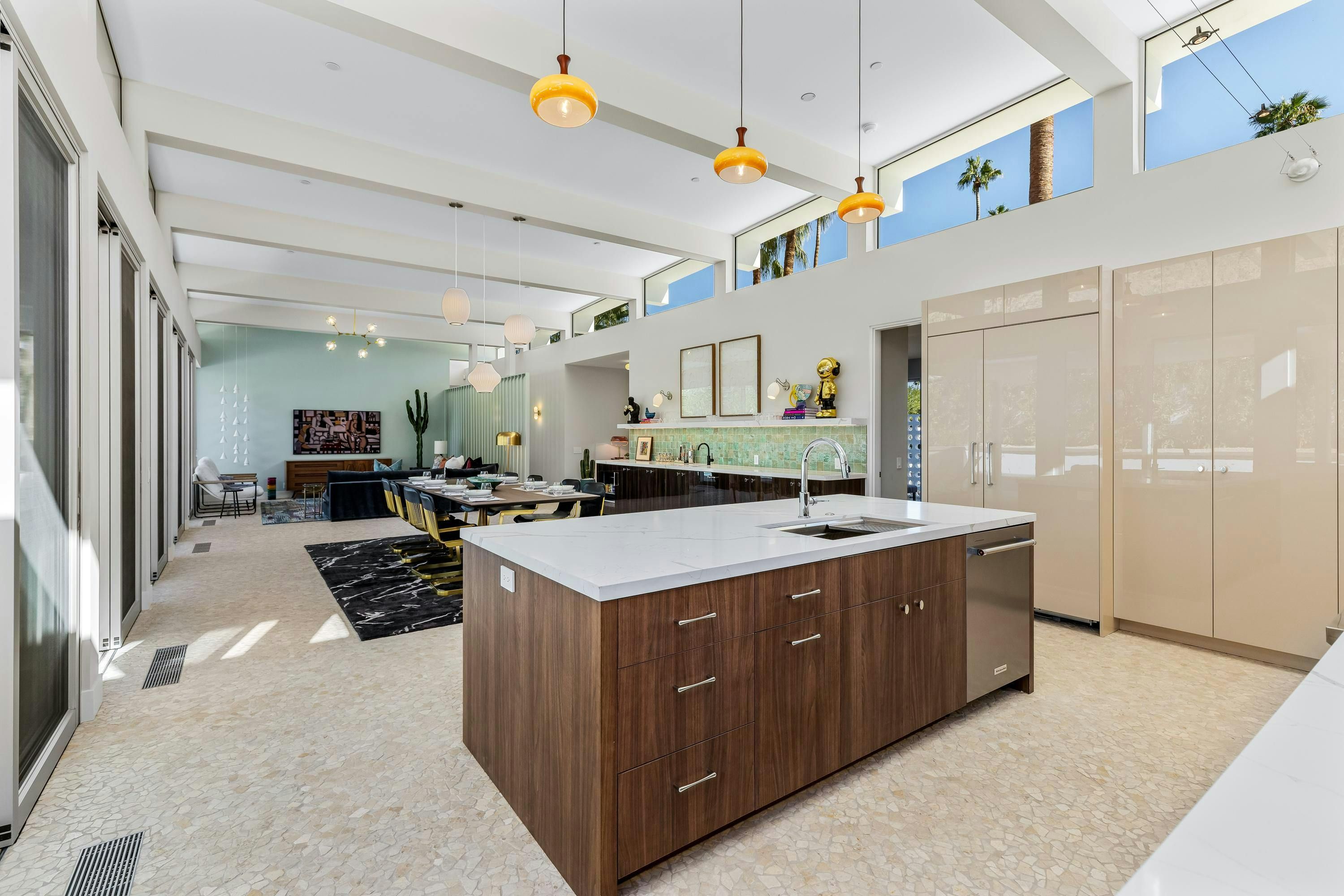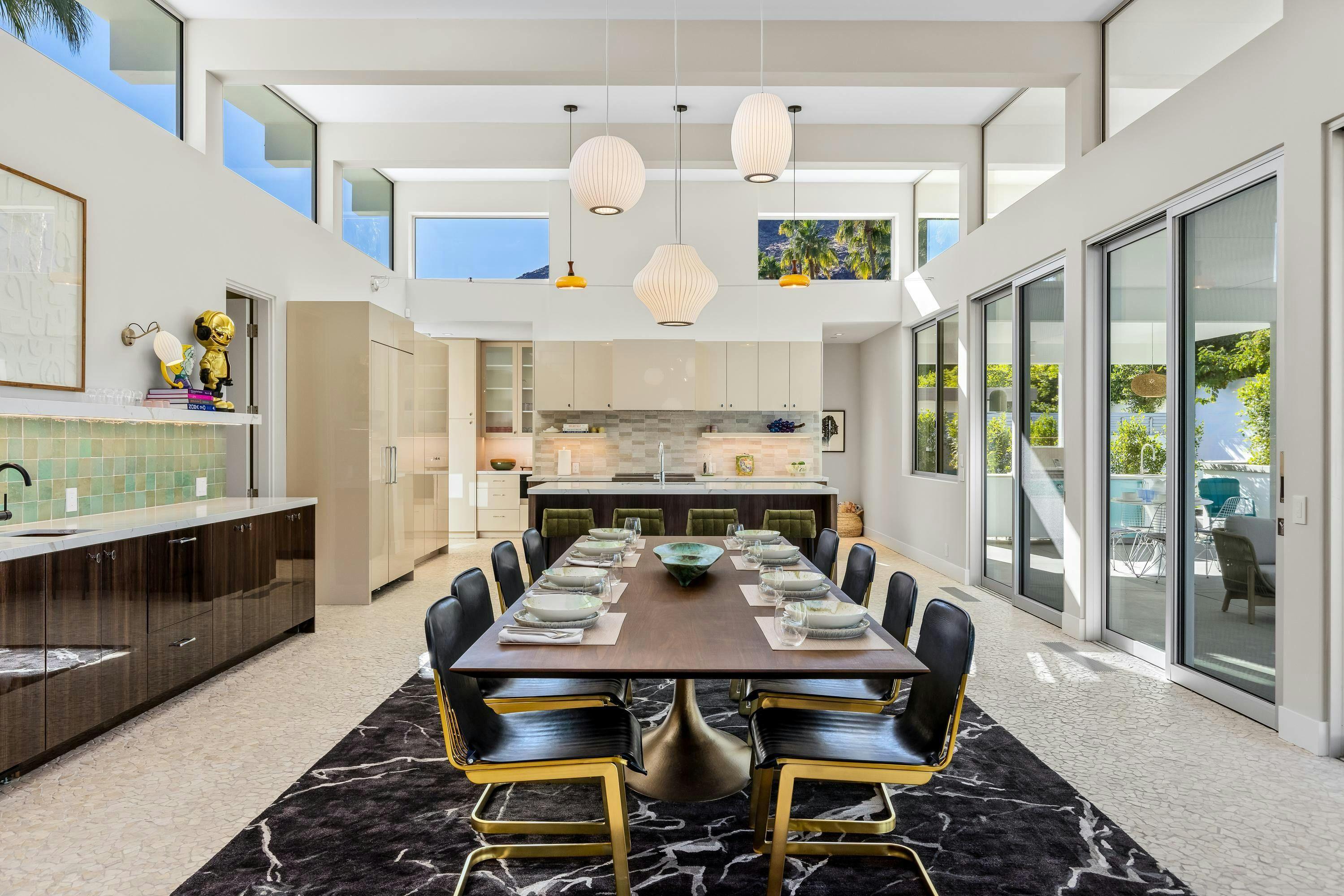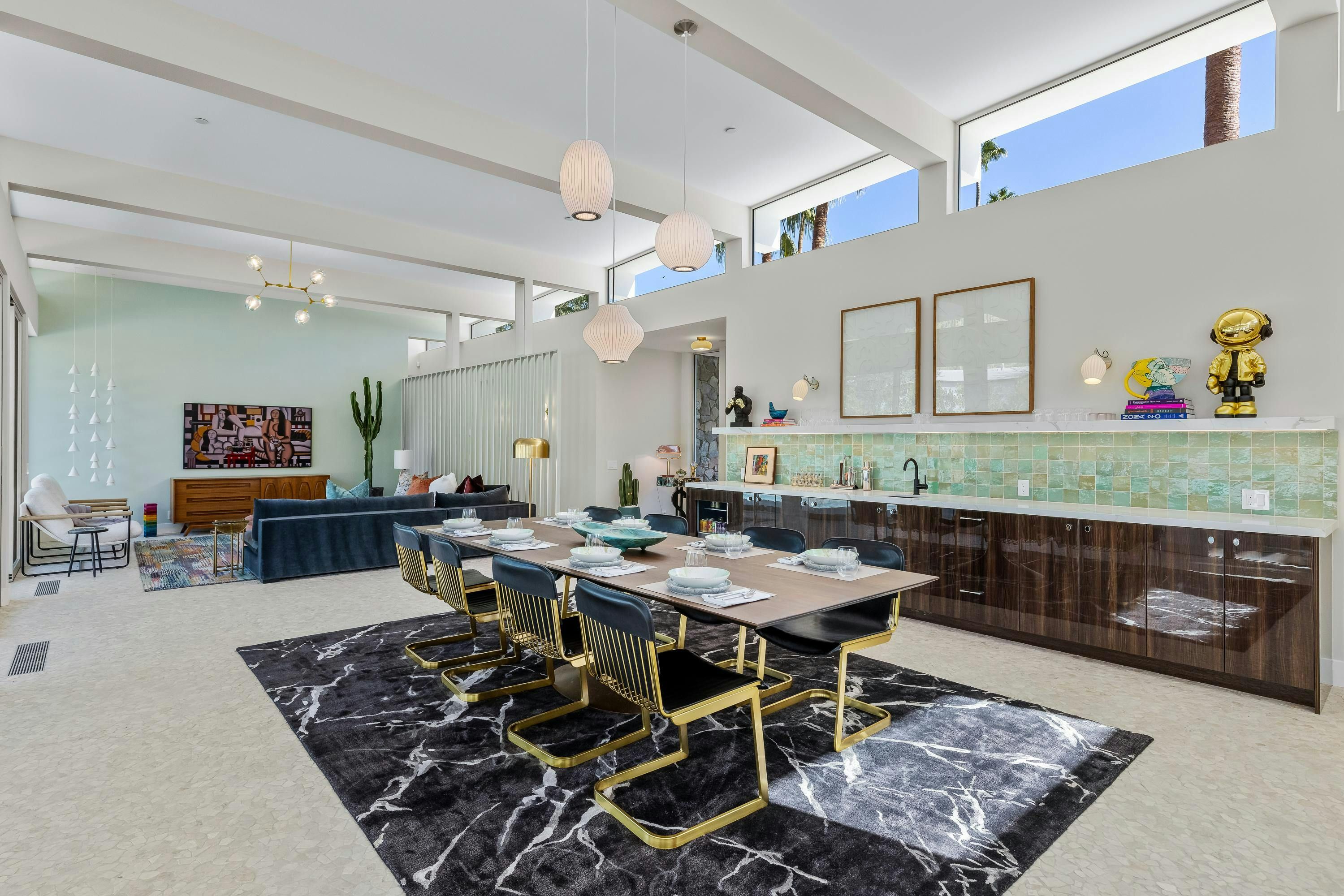 A mid-century modern gem, this beautiful home is located in the heart of Vista Las Palmas. It’s mere moments from Palm Canyon Drive and its dining, shopping, and galleries. High ceilings, an open floor plan, and glass walls make this bright, welcoming home perfect for entertaining – there’s a gourmet kitchen, a chic dining space, and even a bar. Outside, you’ll have a pool to swim in, a spa for lounging, an outdoor kitchen, and a firepit for cosy after-dinner cocktails. The primary suite boasts an outdoor shower and bathtub.