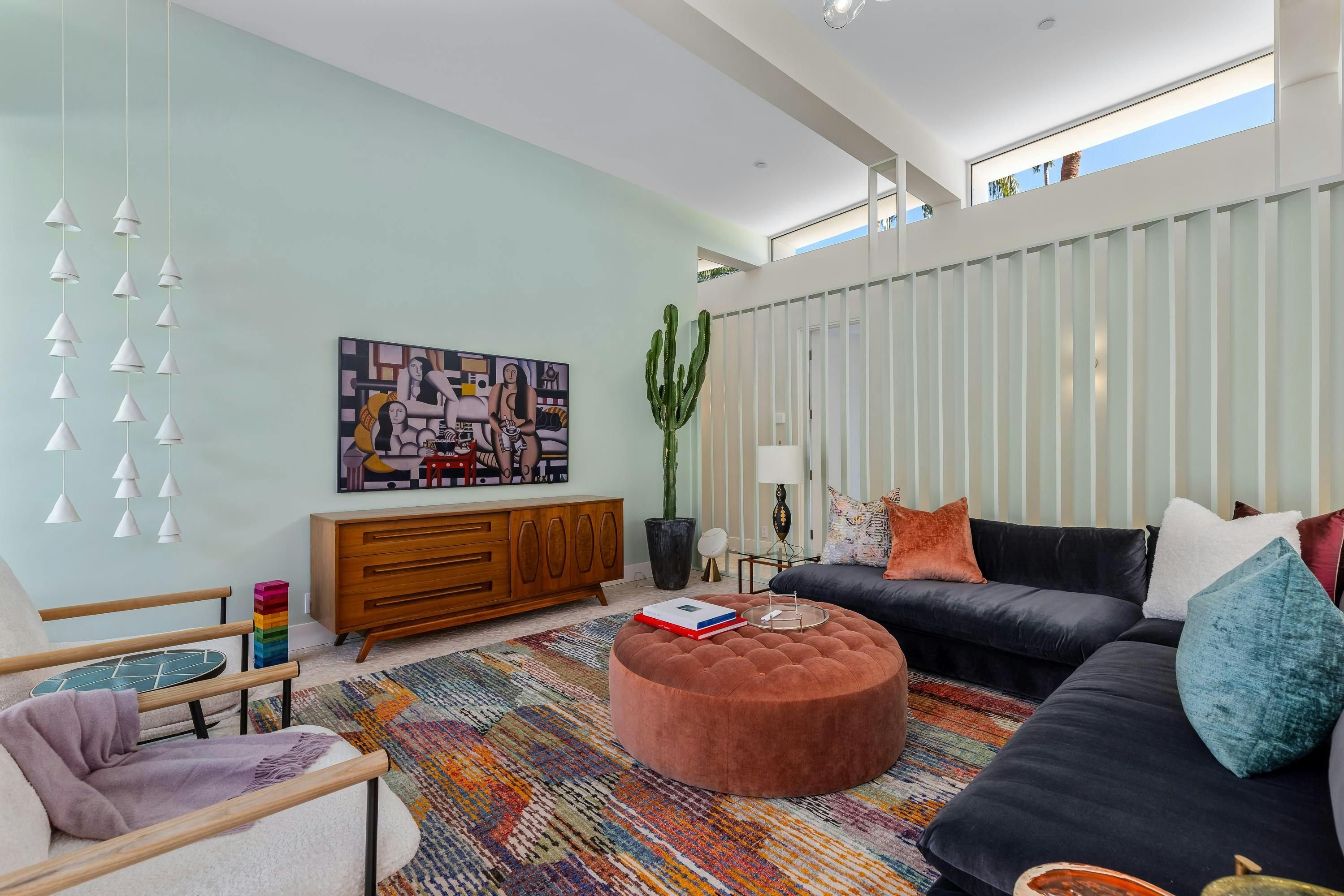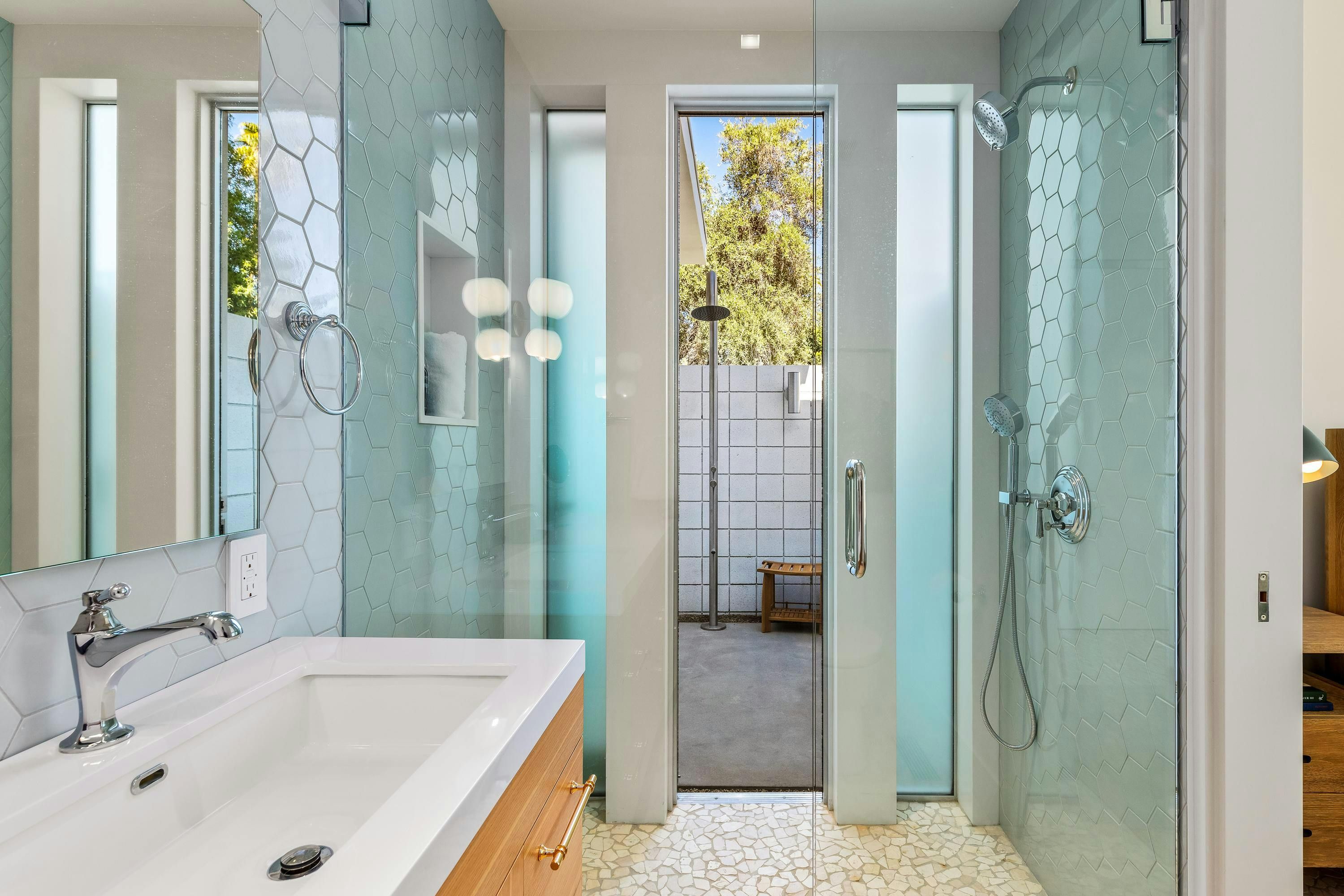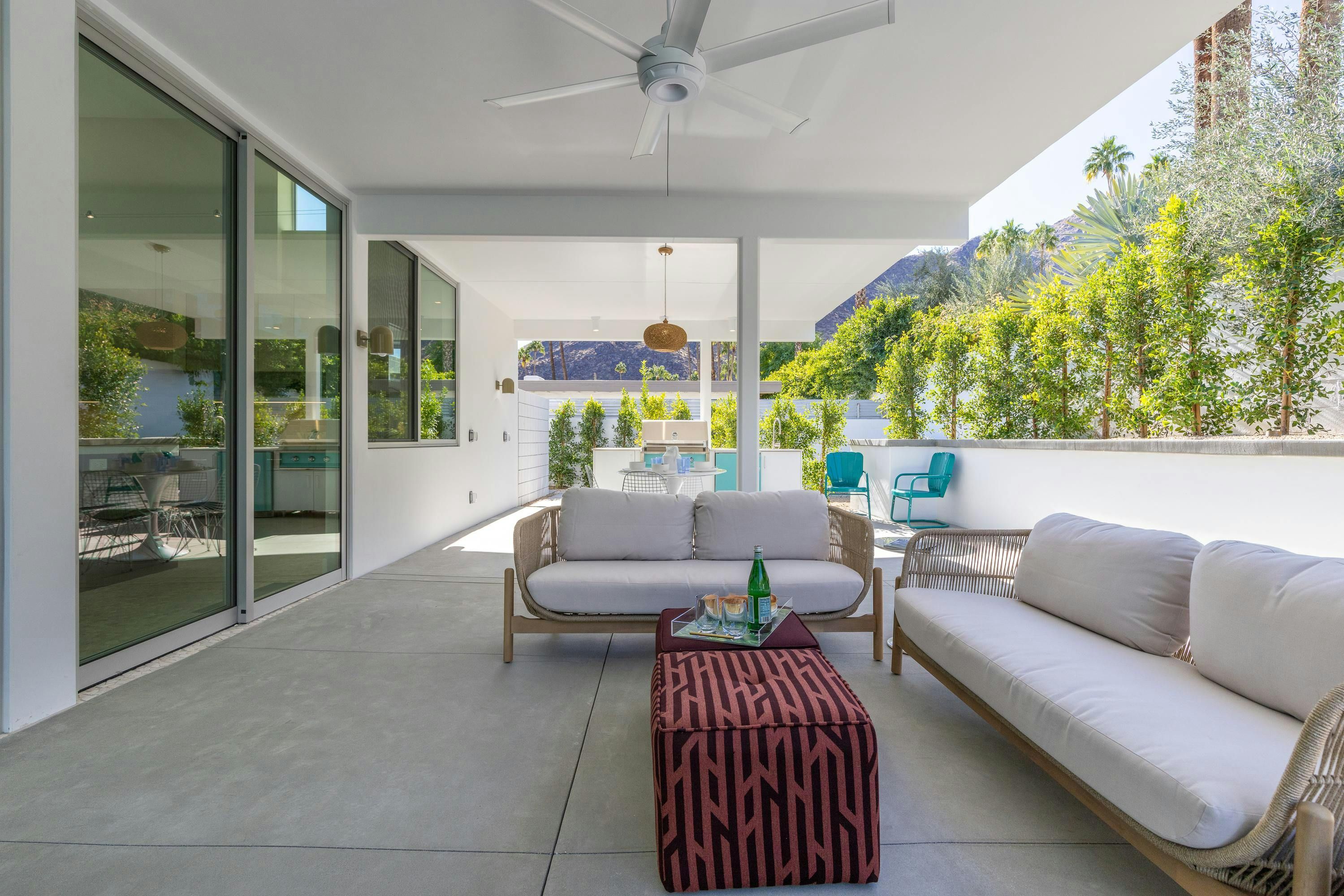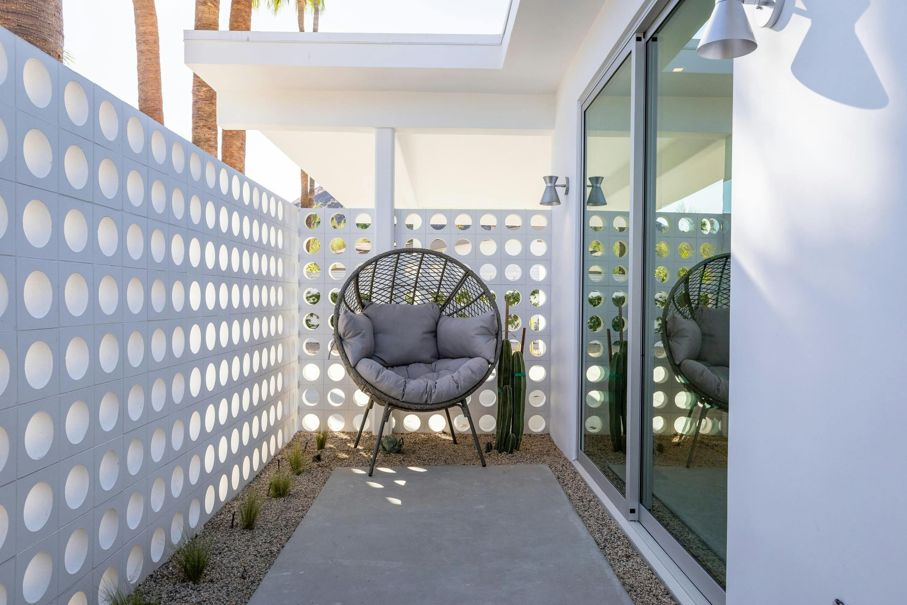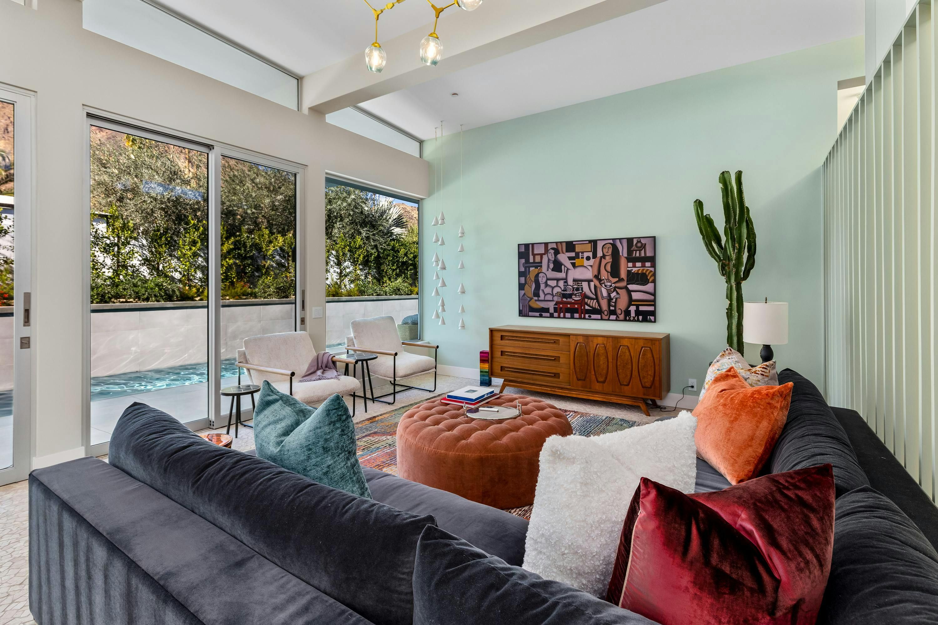 A mid-century modern gem, this beautiful home is located in the heart of Vista Las Palmas. It’s mere moments from Palm Canyon Drive and its dining, shopping, and galleries. High ceilings, an open floor plan, and glass walls make this bright, welcoming home perfect for entertaining – there’s a gourmet kitchen, a chic dining space, and even a bar. Outside, you’ll have a pool to swim in, a spa for lounging, an outdoor kitchen, and a firepit for cosy after-dinner cocktails. The primary suite boasts an outdoor shower and bathtub.