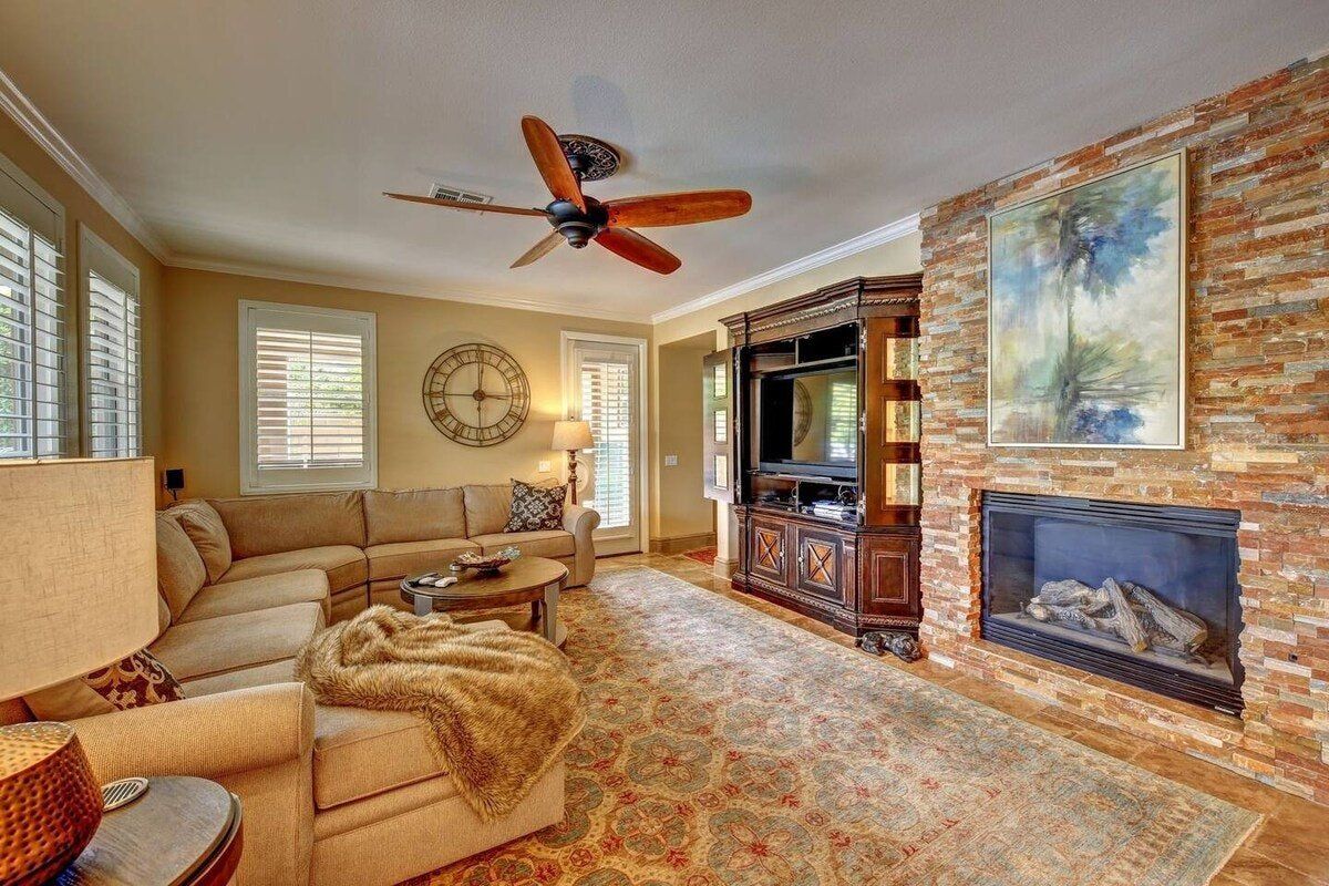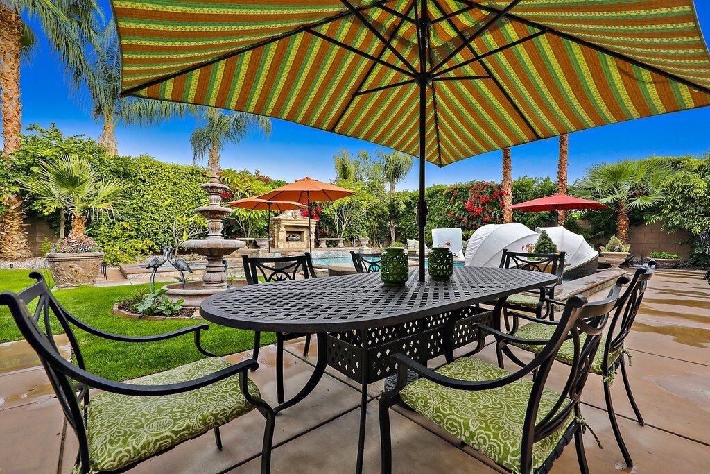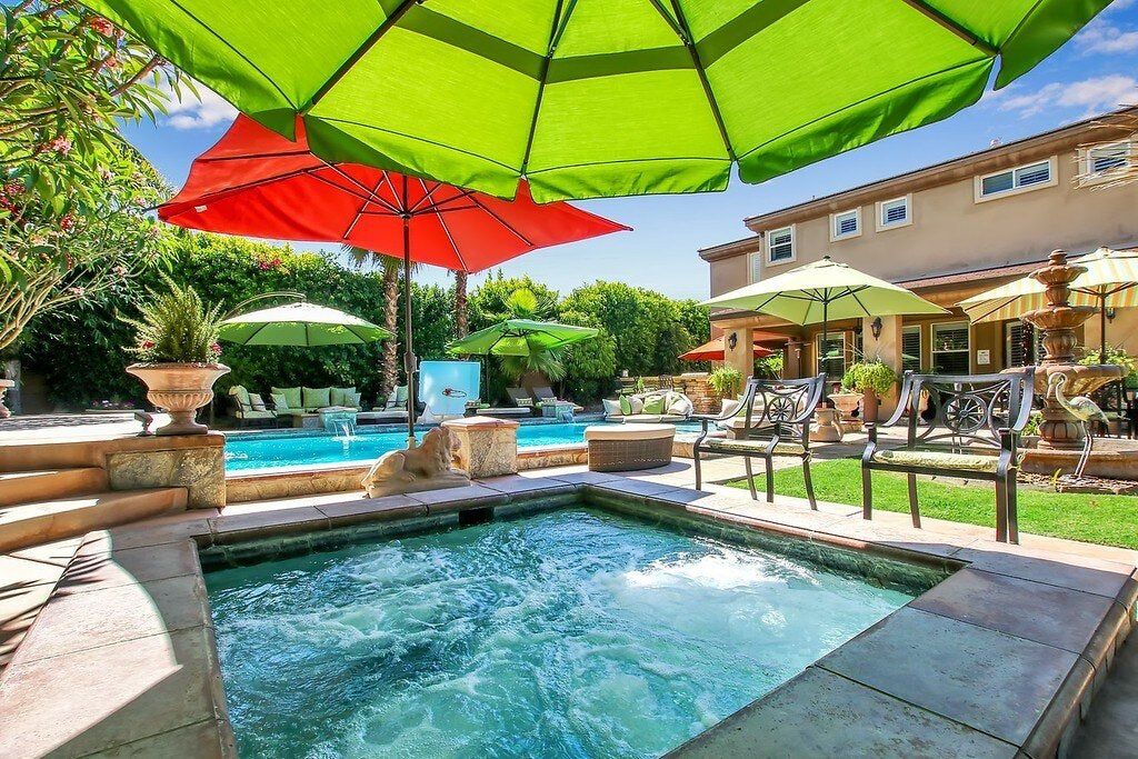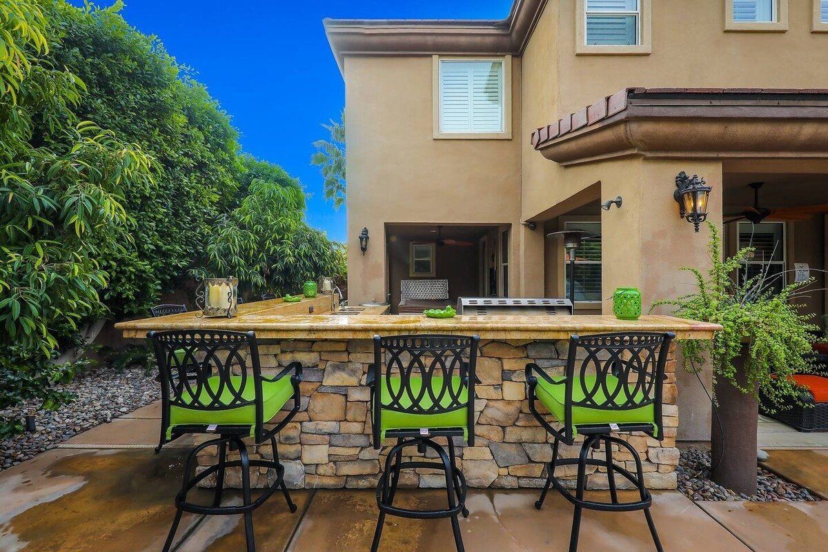 Right in the heart of the Coachella Valley, this villa is all grandeur and muted tones inside, and a riot of colour and fun outside. While chandeliers twinkle above the grand piano in the living room and granite counters gleam in the kitchen, this home opens out onto a playground of palm trees and gardens galore. With floating, covered day beds in the turquoise waters of the private pool, to surrounding sofas around a fire pit, poolside bar, and stone hot tub, this is the place to lap up the life of luxury. Lush green grass encourages the kids to run wild, while a pool table and basketball hoops are all set up to get the whole party involved in some healthy competition. A built-in barbecue and cooking area overlooking the pool keeps the fun going outdoors and is all set to fuel you for a day of hiking ahead. There are loads of local trails in the area, and Joshua Tree National Park is a short drive away. Give in to the total lux experience and call on some extra services, from private chefs, to massages and manicures. This place is all about indulgence.