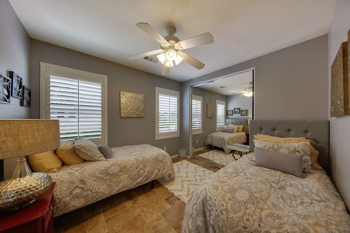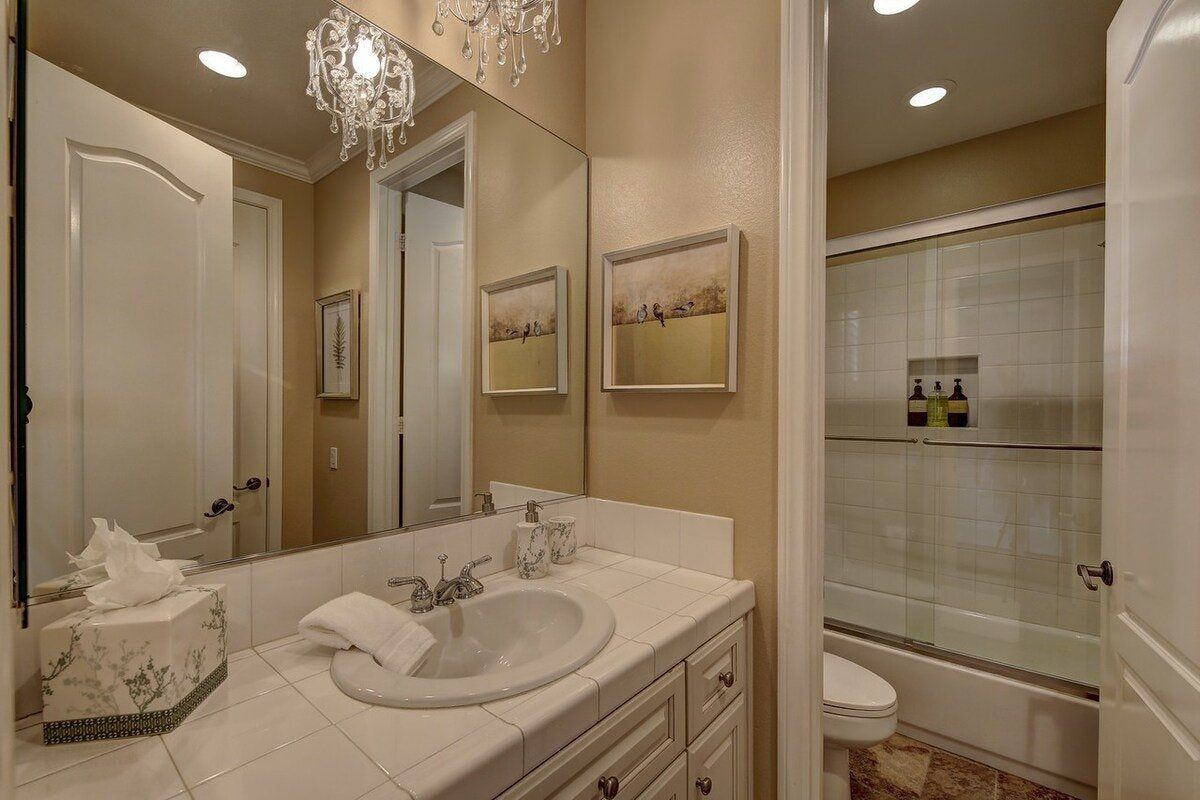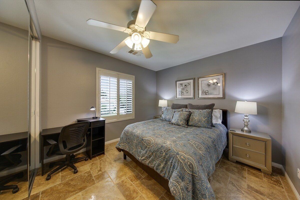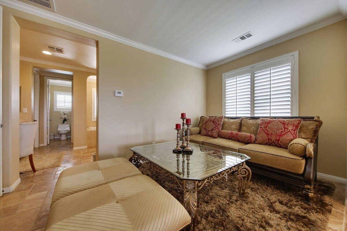 Right in the heart of the Coachella Valley, this villa is all grandeur and muted tones inside, and a riot of colour and fun outside. While chandeliers twinkle above the grand piano in the living room and granite counters gleam in the kitchen, this home opens out onto a playground of palm trees and gardens galore. With floating, covered day beds in the turquoise waters of the private pool, to surrounding sofas around a fire pit, poolside bar, and stone hot tub, this is the place to lap up the life of luxury. Lush green grass encourages the kids to run wild, while a pool table and basketball hoops are all set up to get the whole party involved in some healthy competition. A built-in barbecue and cooking area overlooking the pool keeps the fun going outdoors and is all set to fuel you for a day of hiking ahead. There are loads of local trails in the area, and Joshua Tree National Park is a short drive away. Give in to the total lux experience and call on some extra services, from private chefs, to massages and manicures. This place is all about indulgence.