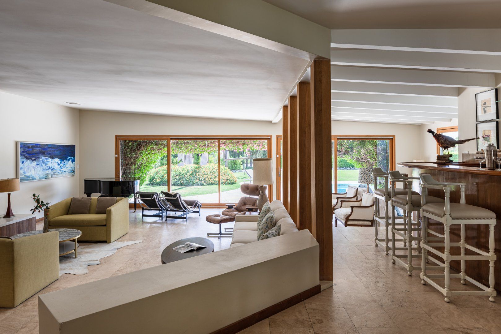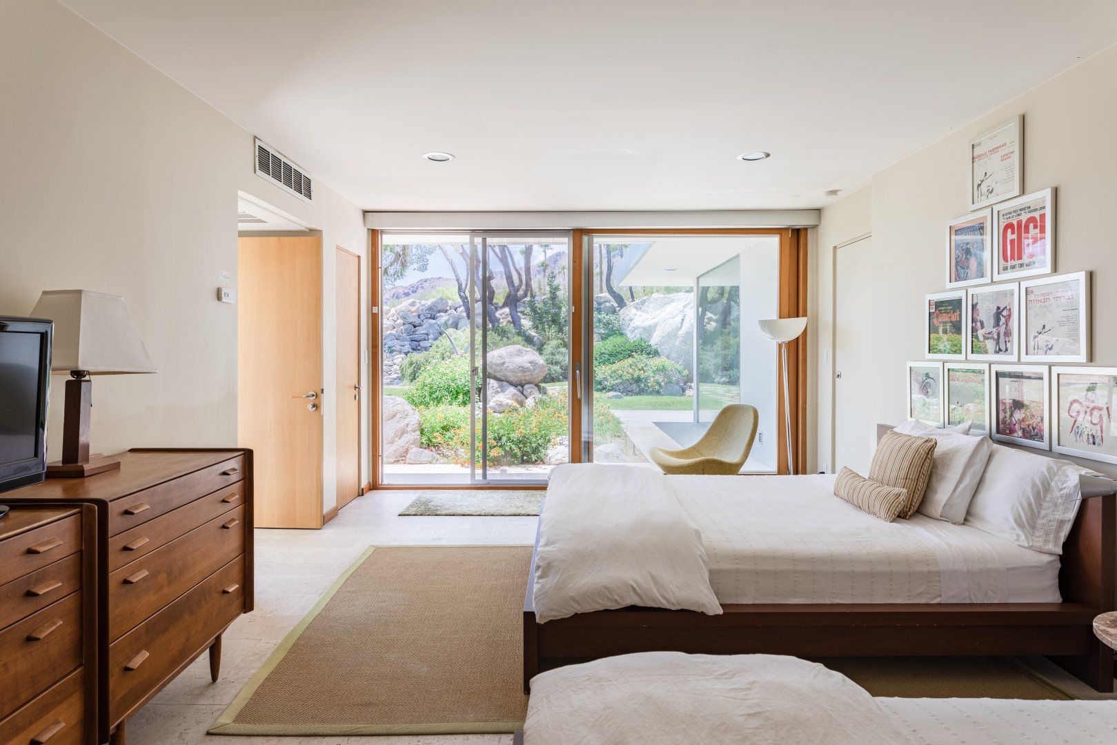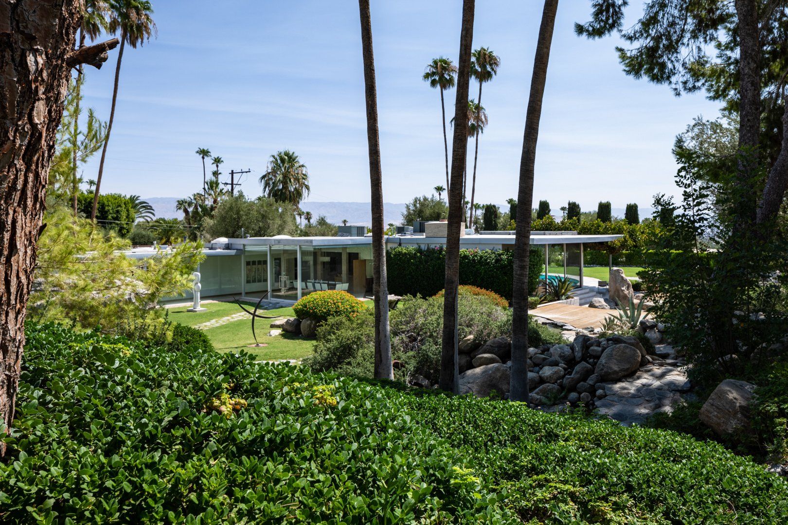 This beautiful house will be a smash hit with fans of Broadway. The former home of composer Frederick Loewe (writer of My Fair Lady and Camelot) is a real showstopper, with vast walls of glass that put the incredible views over Palm Springs and the entire Coachella Valley firmly centre stage. With one of the largest plots we’ve seen in Palm Springs, there’s a real sense of space both inside and out. The mid-century style lounge is open plan, with sliding doors opening to the pool, and a full bar that any mixologist would feel comfortable behind. You’ll feel like the star of the show in the master bedroom, with its floor-to-ceiling windows, fireplace and swivelling bed. While those views do take the limelight, the all-singing, all-dancing garden is pretty special too. Some serious imagination has been brought to the landscaping, with contemporary sculptures, a bean-shaped pool, artificial river, and a grotto style hot tub and waterfall (oh and did we mention the tennis court?) The location in the most exclusive area of Palm Springs is fit for entertainment royalty too (to give you an idea, the Elvis Presley Estate is over the road), and you’re only 5 minutes’ drive from Downtown. Bravo.