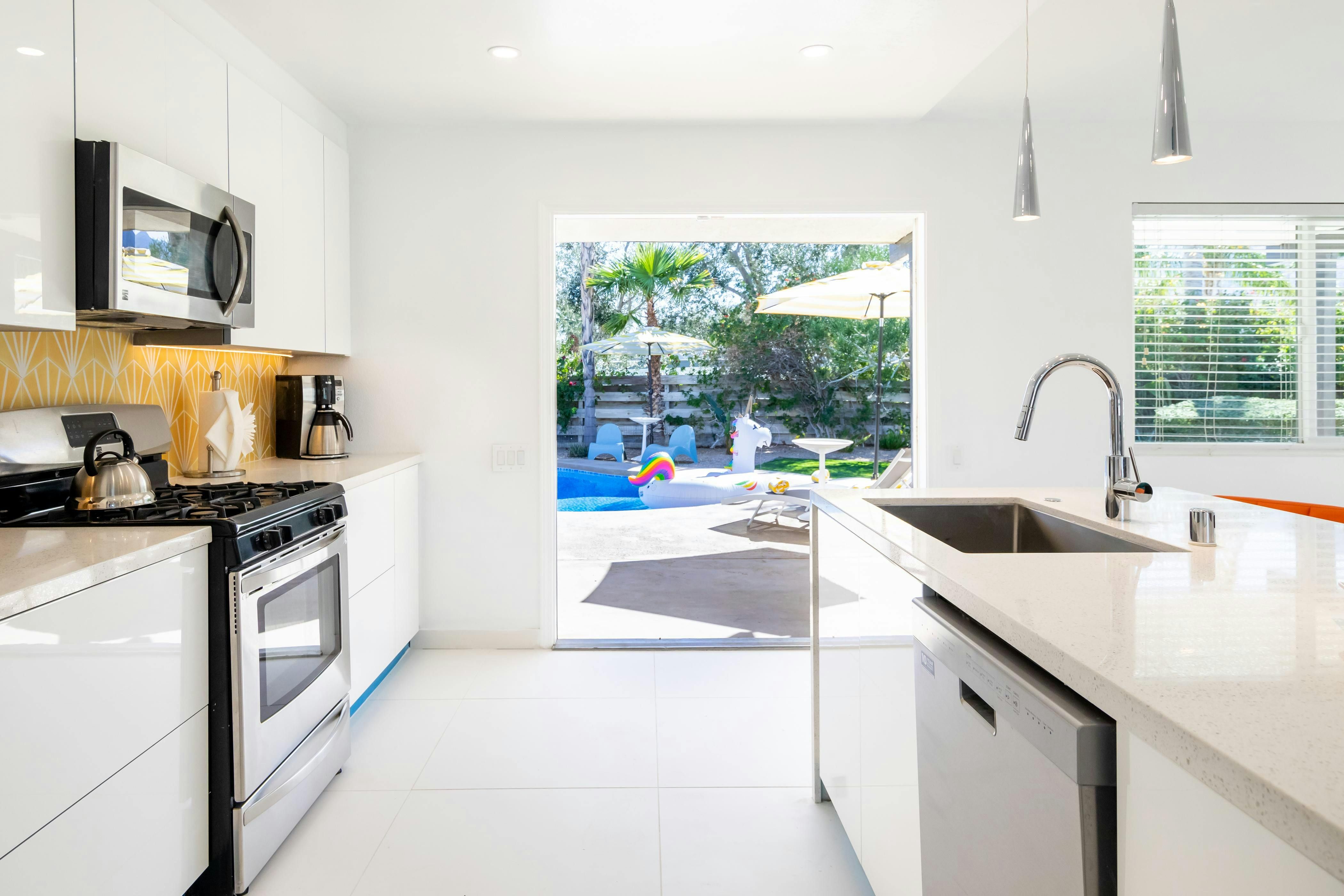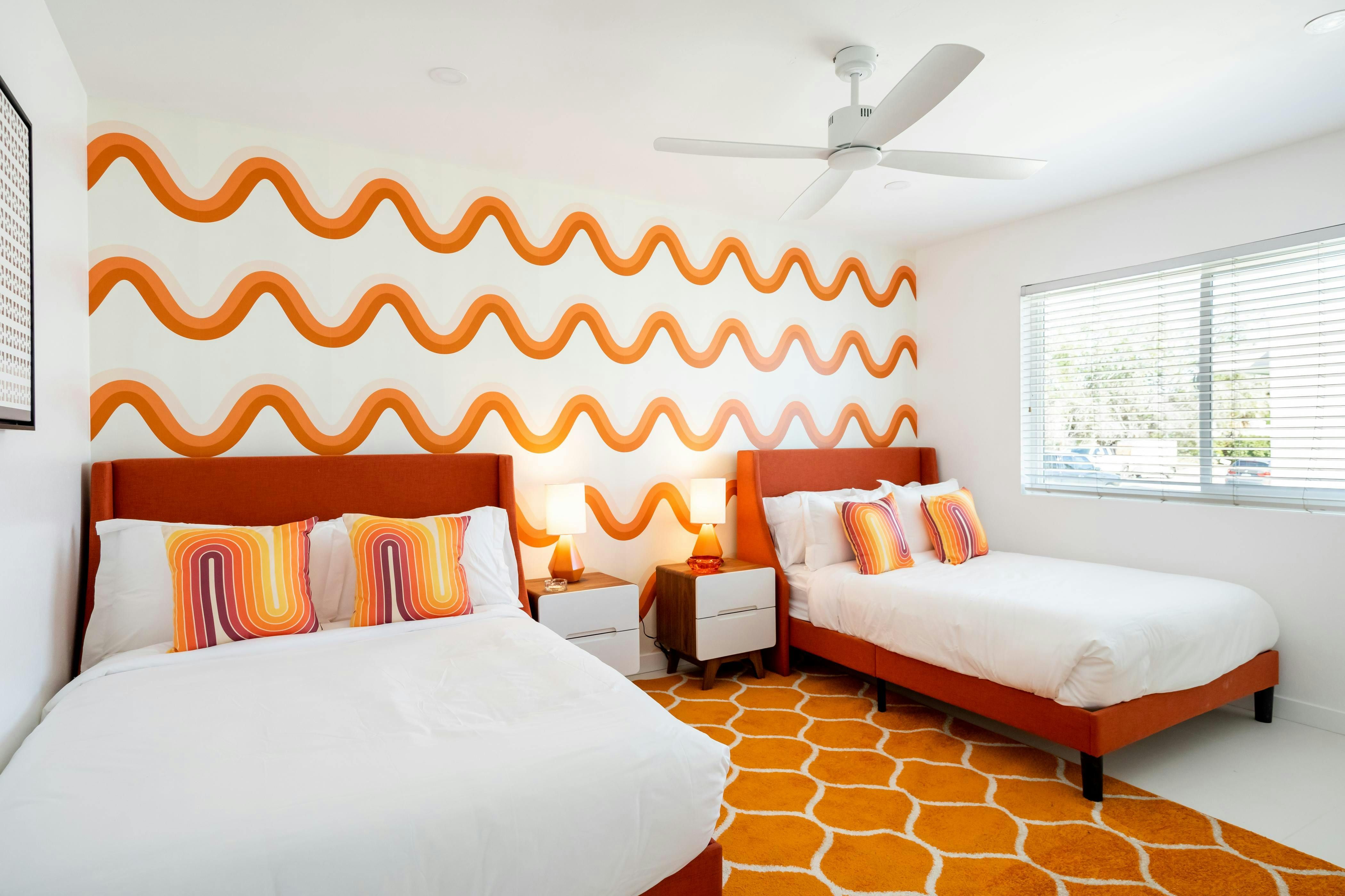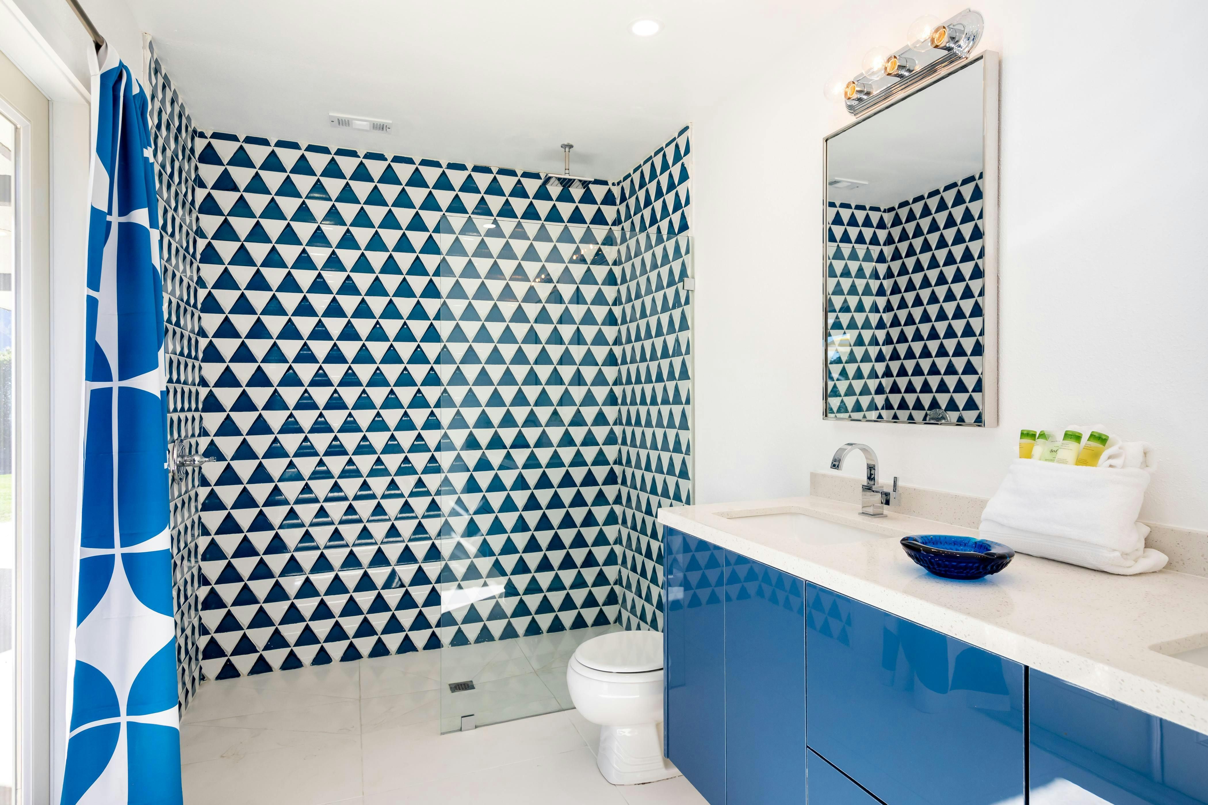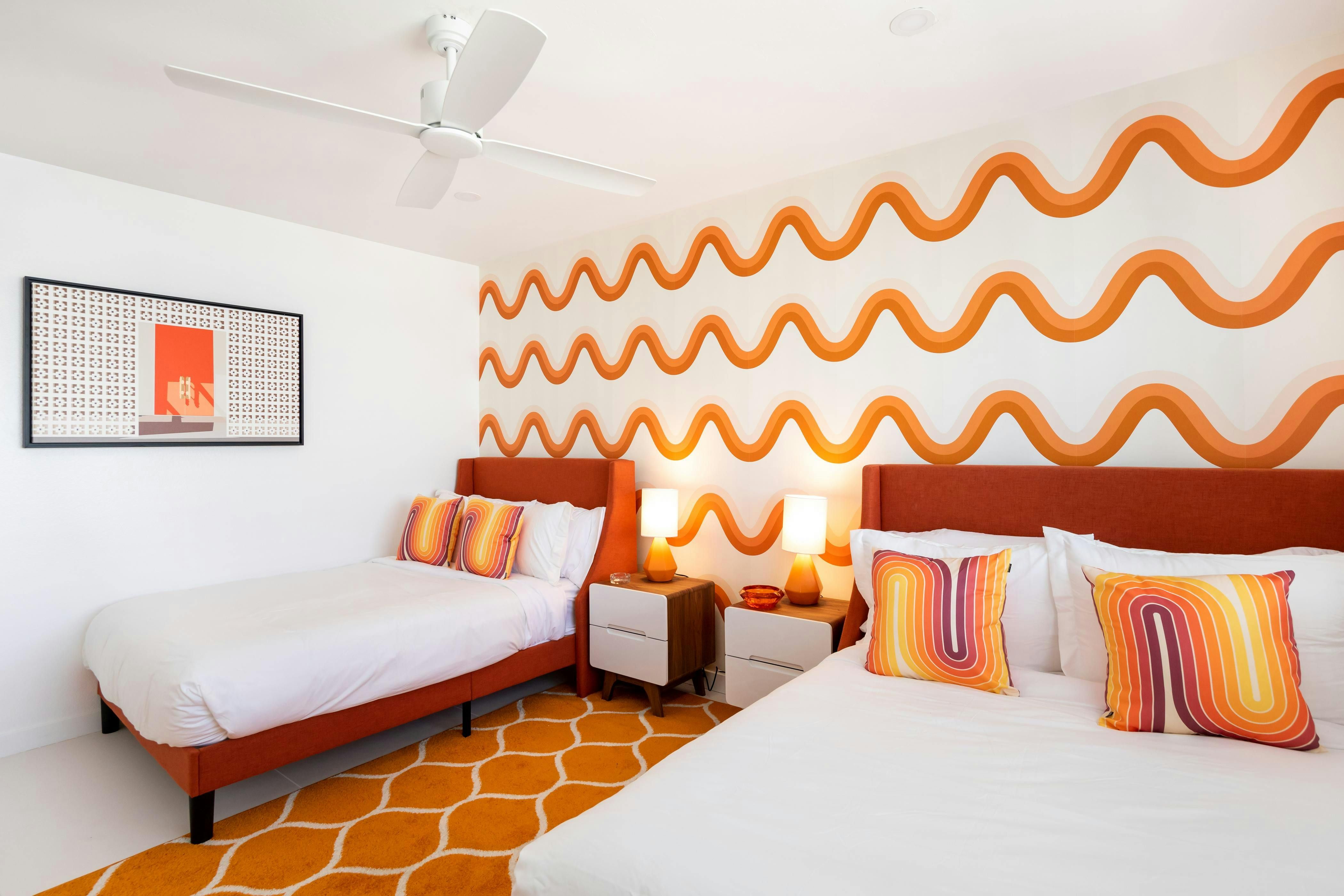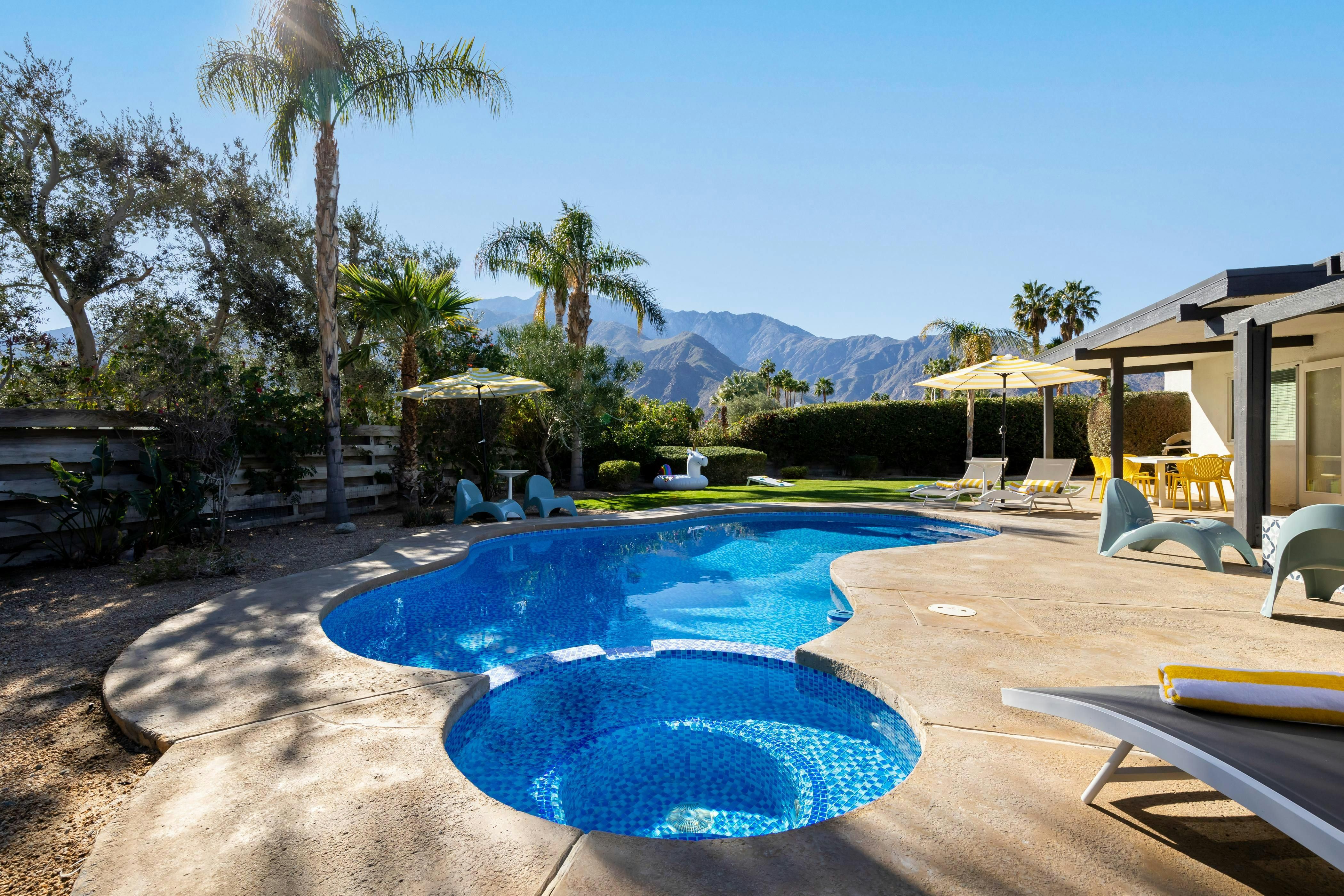 With a landscaped garden overlooking that mountain view, it’s hard not to be impressed by this Palm Springs home. The magic’s all outdoors. Think a mosaic-tiled pool and spa, a gas firepit and grill and endless San Jacinto vistas. Inside, bold prints and pops of colour nod to the area’s mid-century roots. It’s on a main road, so you’ll hear a bit of traffic outside, but the location makes up for it. Set in Vista Norte, you can walk to local restaurants and bars, or hop in the car to reach Palm Canyon Drive in five minutes for shopping, dining, and nearby desert hikes.