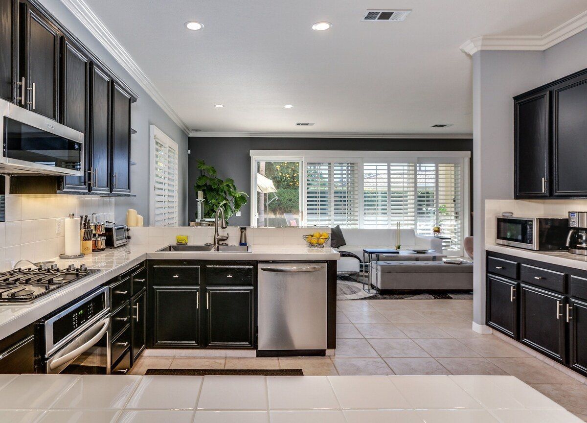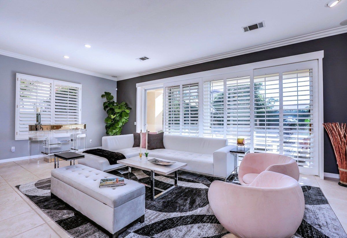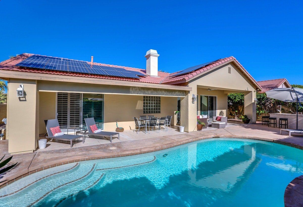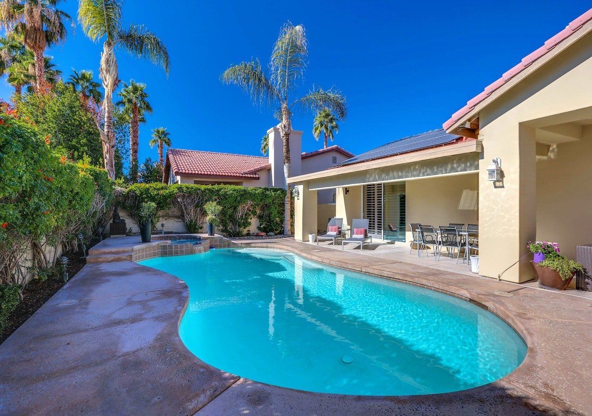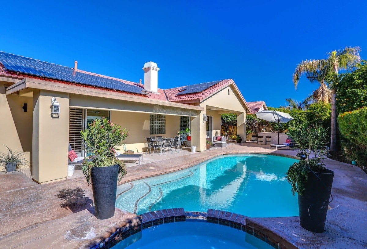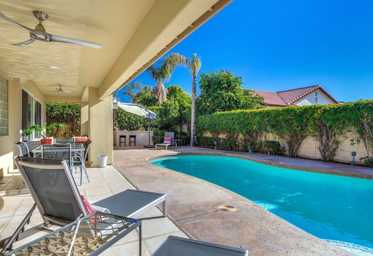 Relax in a chic and modern desert retreat in supreme comfort. The home is uber contemporary and monochrome, with divine gold-fitted bathrooms, floor-to-ceiling glass doors, plush textiles, and a very elegant dining area. This home is all about the views though - be sure to have that camera ready for the splendour of the San Jacinto Mountain Range. Cool off instantly in the essential pool and relax in the evenings with chilled drinks on the terrace in the outside lounge. A group of friends who enjoy hiking, nature, or just the finer things in life are sure to have a memorable stay at this well-manicured home in the heart of gorgeous Palm Desert.