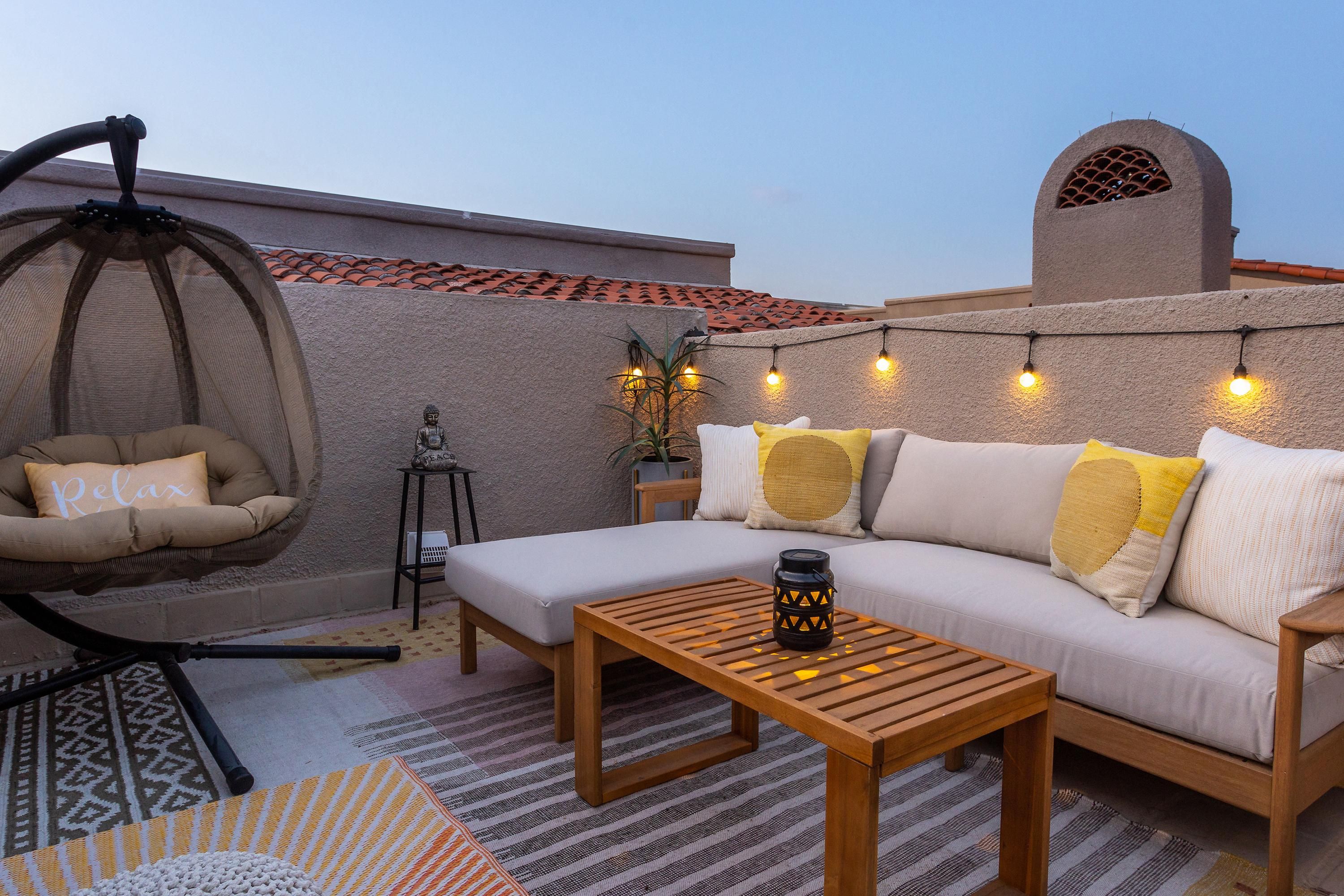 When day turns to dusk, head upstairs to the boho-chic rooftop terrace to watch the blue sky twist into shades of pink and purple around the desert mountain landscape. The hours easily roll by here, sinking into the plush egg chair or enjoying a few cocktails on the sofa. When the sun goes down and the desert air starts to chill, it's the perfect time to hop into your bubbling hot tub.