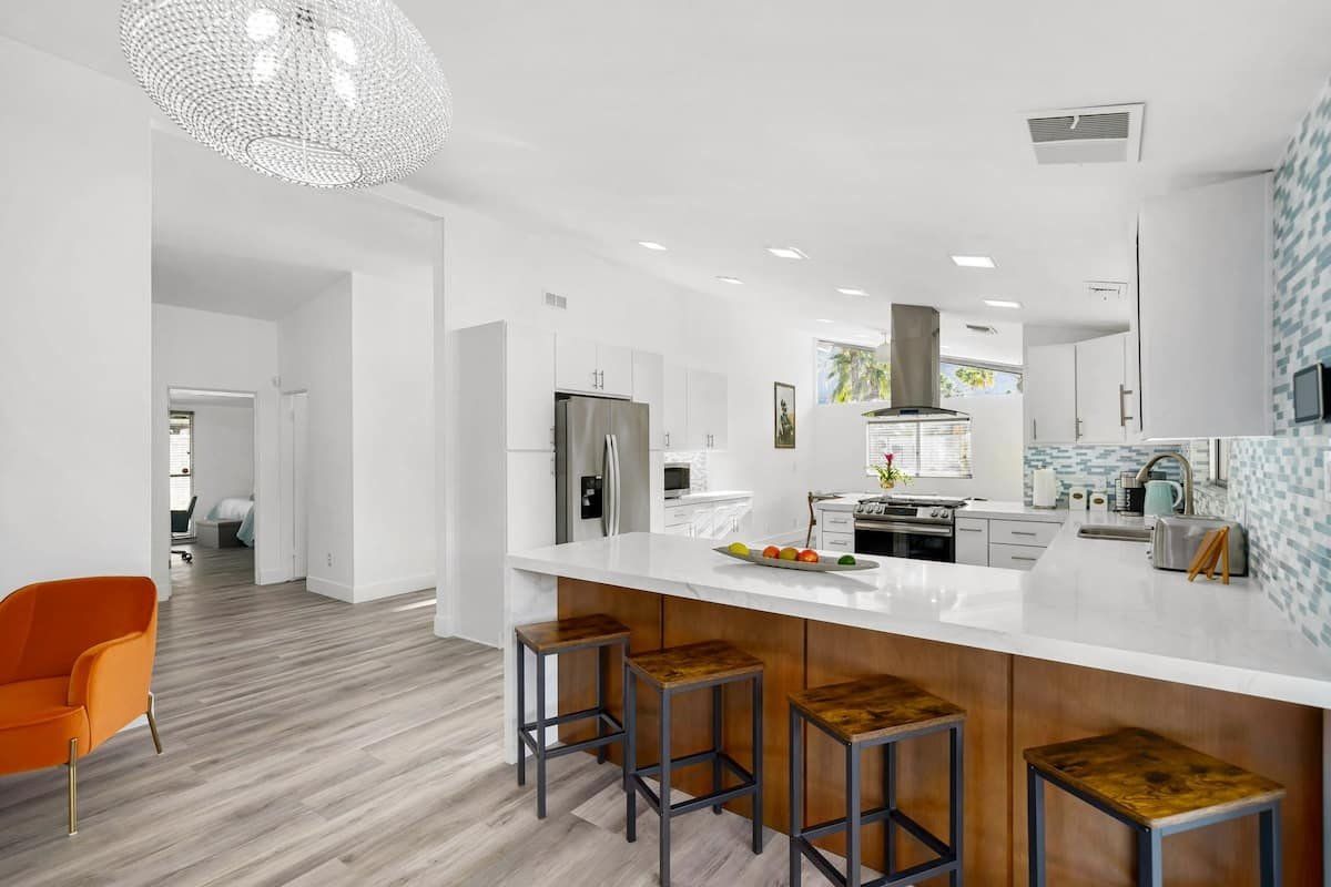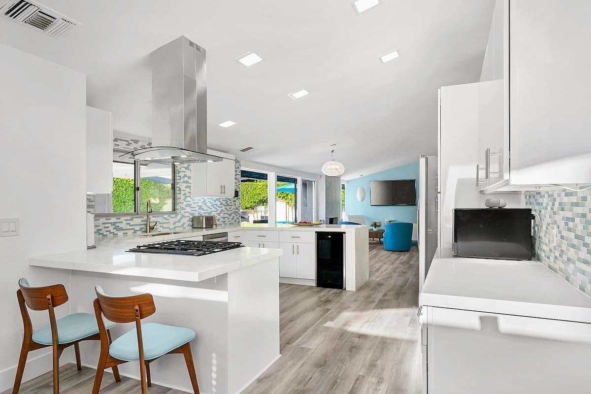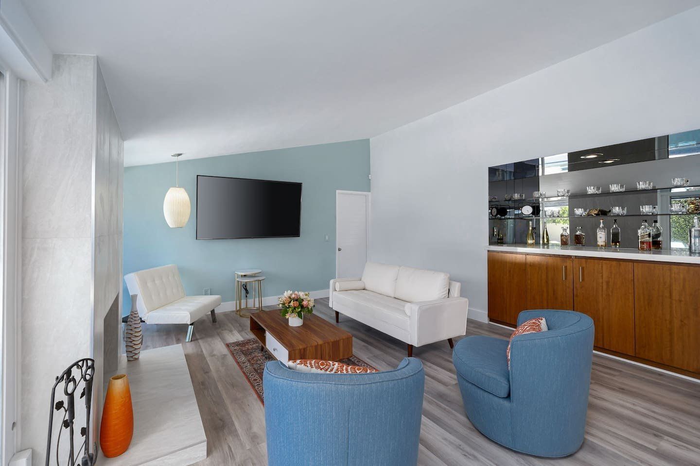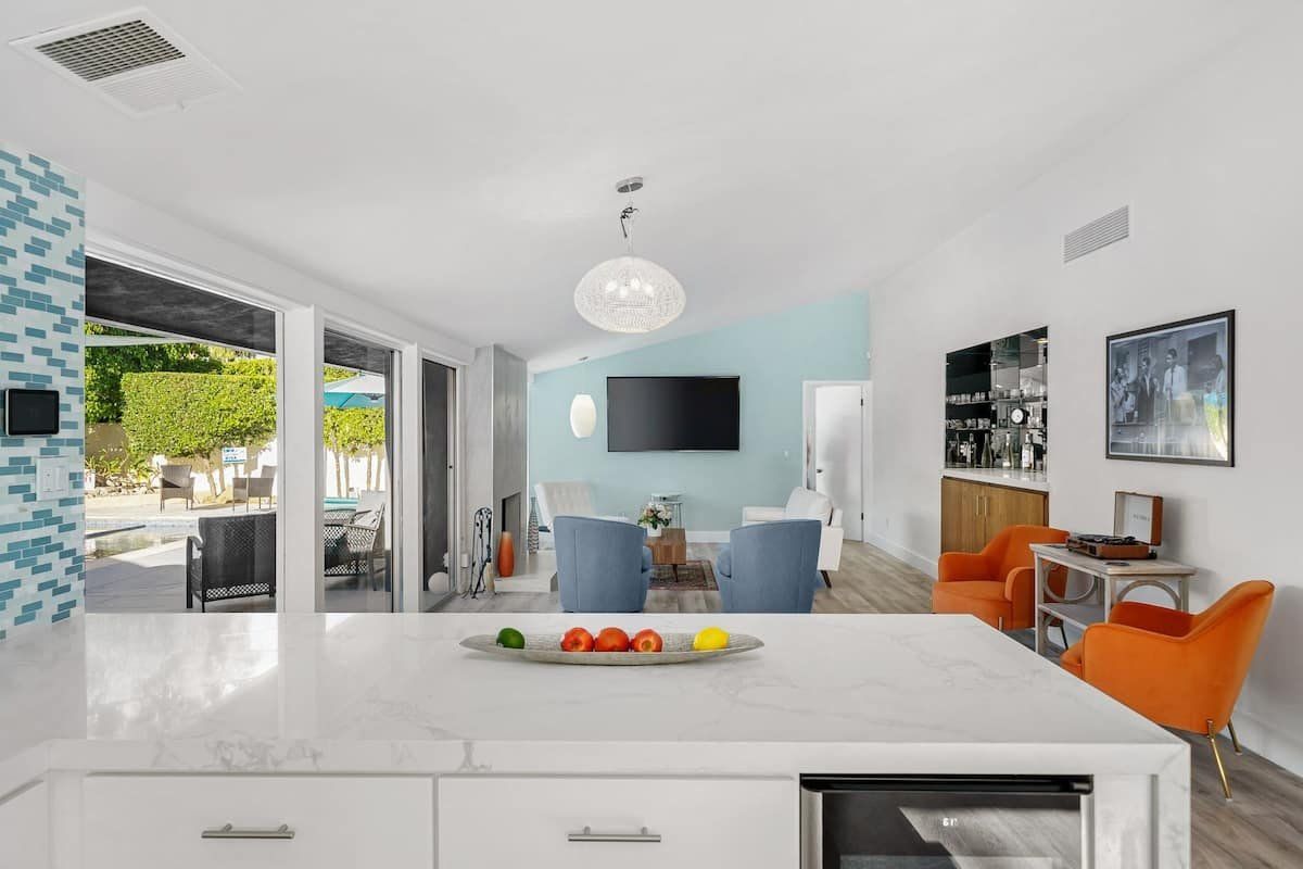 Inside, the white walls are adorned with funky art, while pops of bright oranges and cool blues add colour. In the open-plan living space, floor-to-ceiling windows blur the distinction between the indoors and outdoors, and a stone fireplace gives the comfy seating area a focal point. Mix together a few cocktails at the living room bar and whip up dinners in the smart modern kitchen.