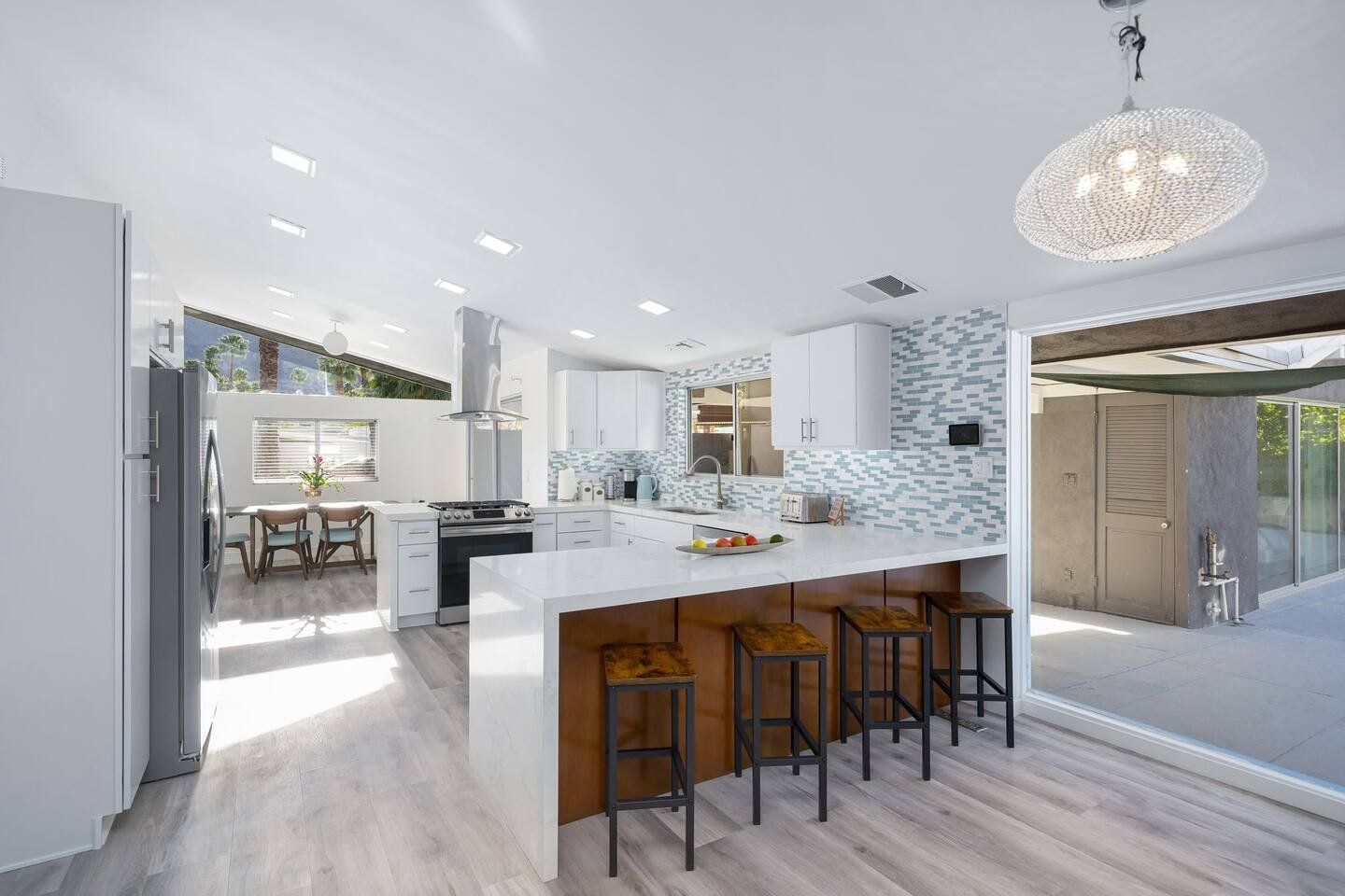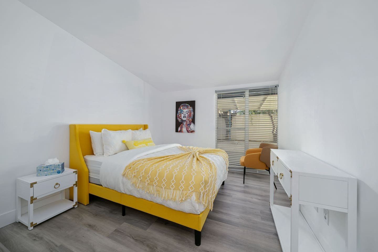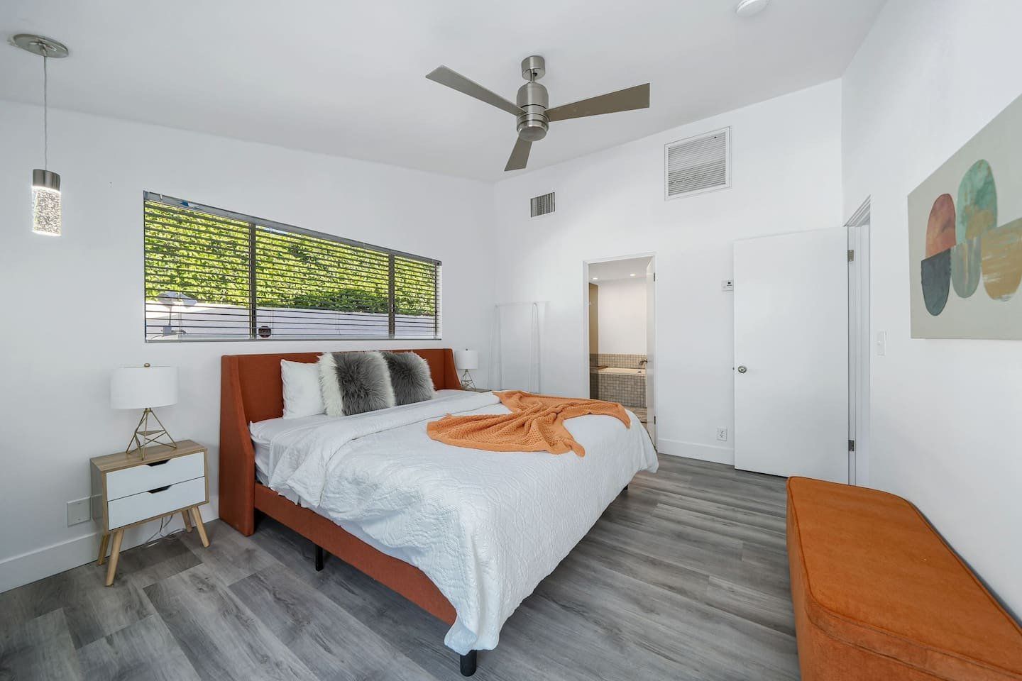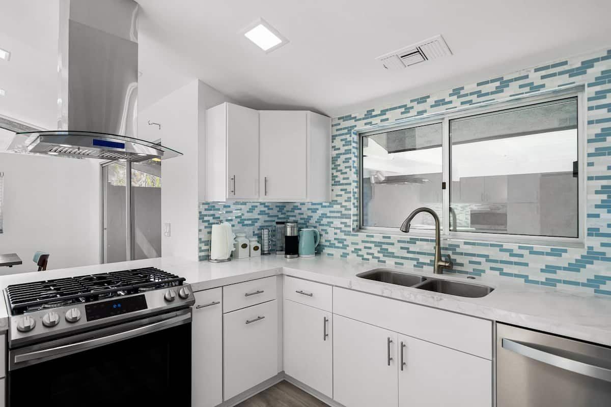 Inside, the white walls are adorned with funky art, while pops of bright oranges and cool blues add colour. In the open-plan living space, floor-to-ceiling windows blur the distinction between the indoors and outdoors, and a stone fireplace gives the comfy seating area a focal point. Mix together a few cocktails at the living room bar and whip up dinners in the smart modern kitchen.