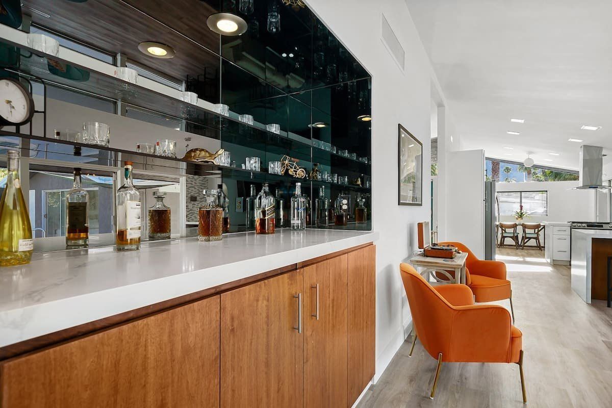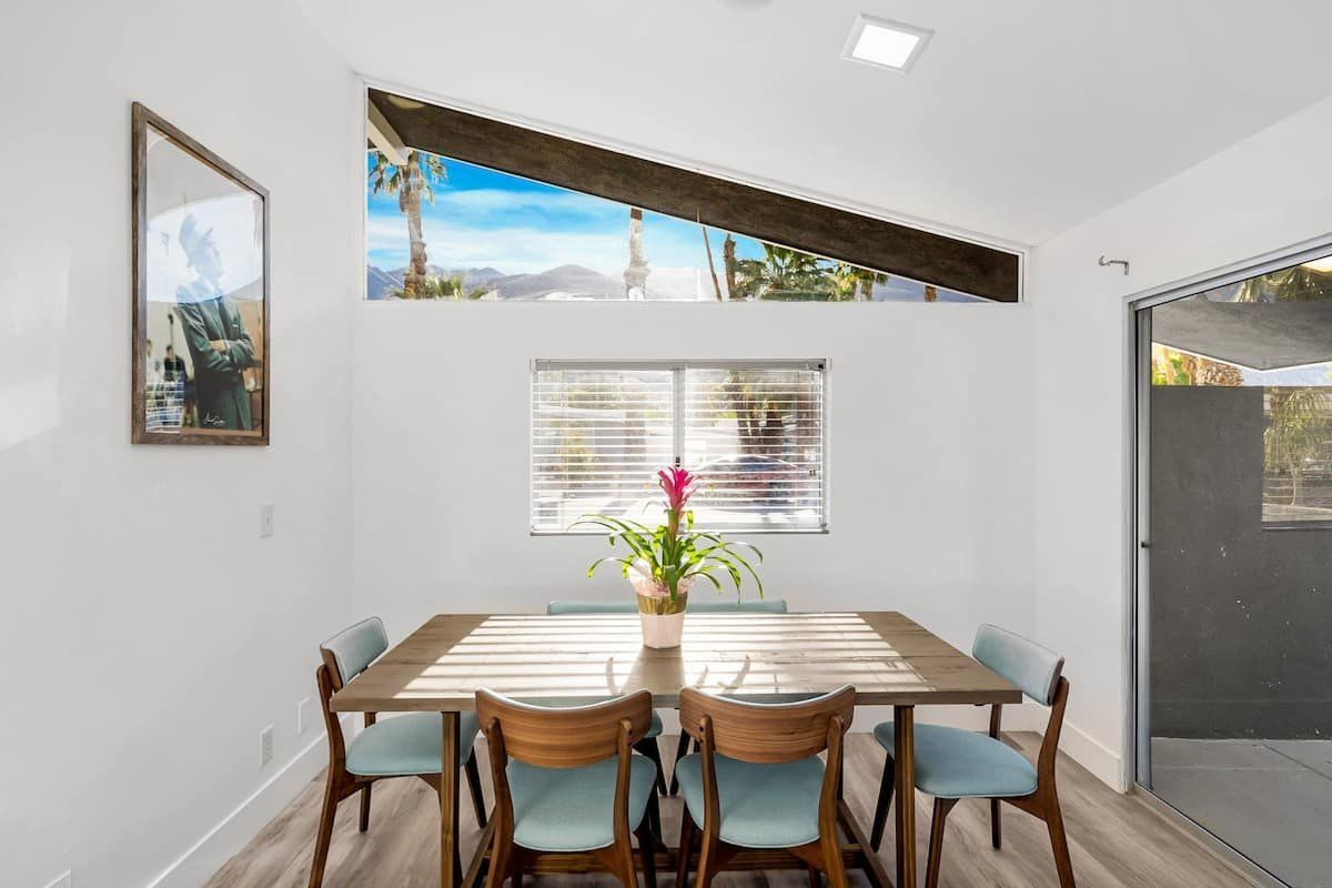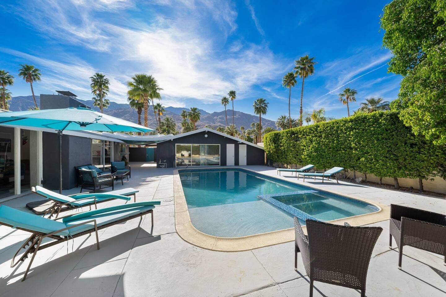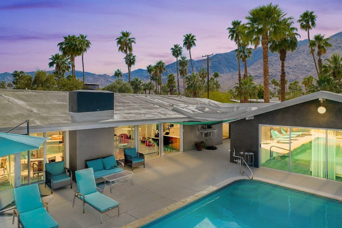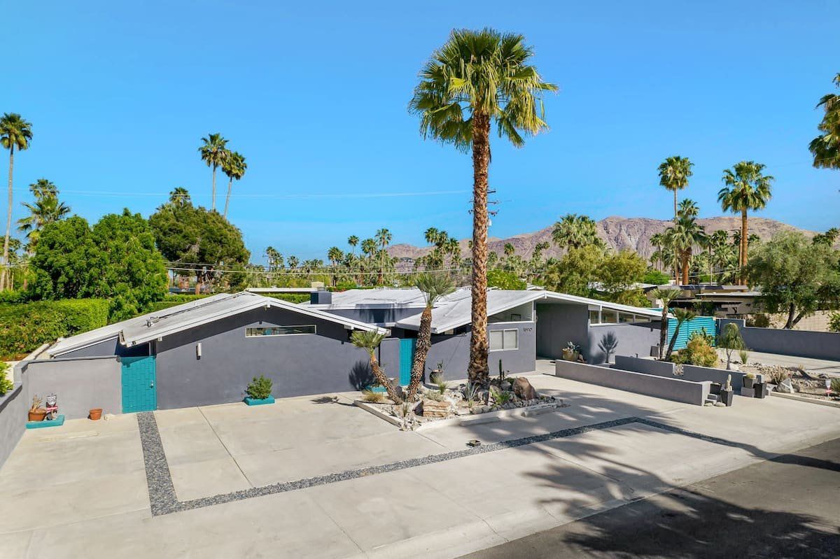 This fabulous home in the popular Twin Palms neighbourhood is a recently remodelled mid-century classic with a contemporary twist. Encircled by palm trees and with magnificent views of the mountains, the outdoor space is dominated by a pristine pool and integrated jacuzzi, with plenty of sunloungers to drip dry on.