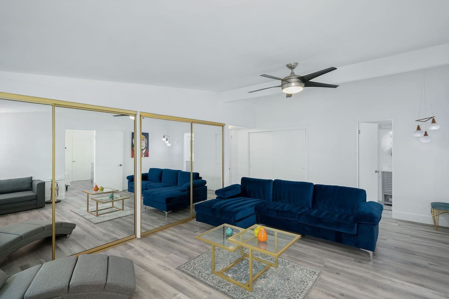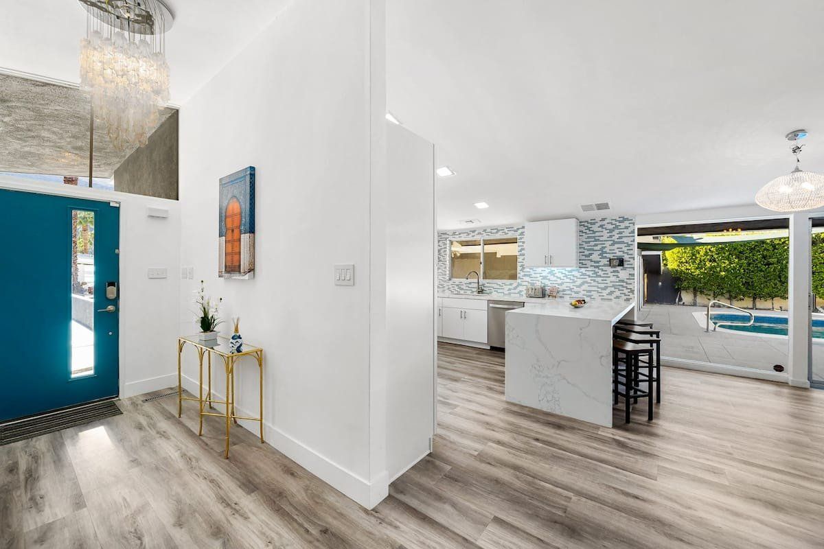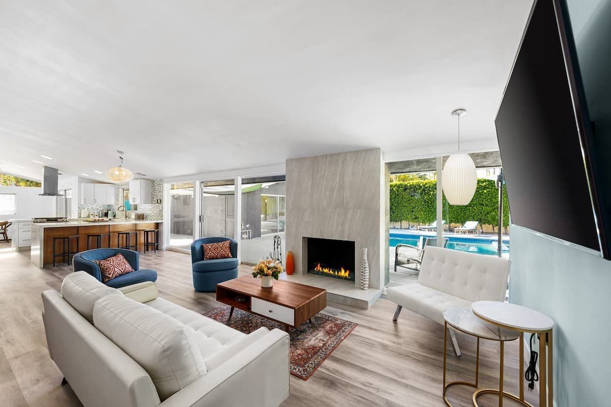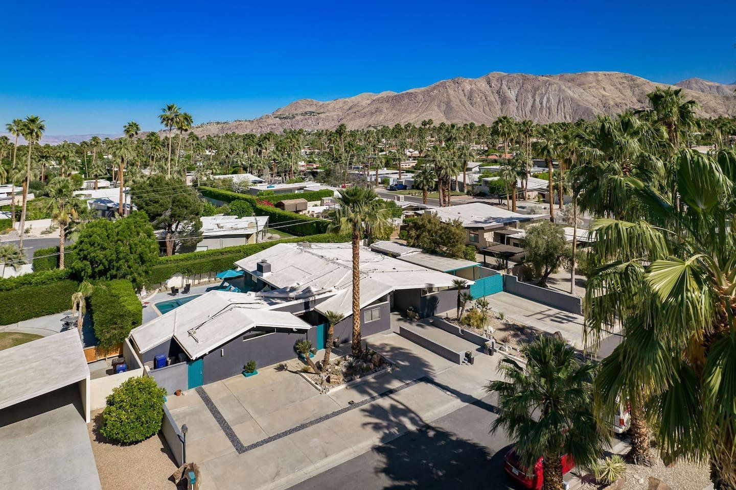 This fabulous home in the popular Twin Palms neighbourhood is a recently remodelled mid-century classic with a contemporary twist. Encircled by palm trees and with magnificent views of the mountains, the outdoor space is dominated by a pristine pool and integrated jacuzzi, with plenty of sunloungers to drip dry on.