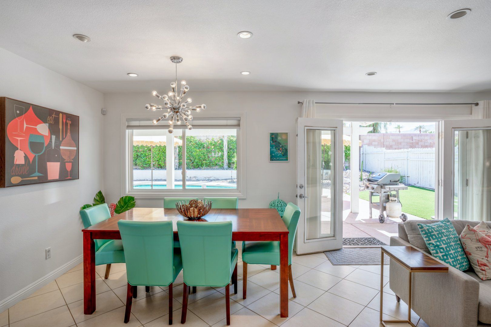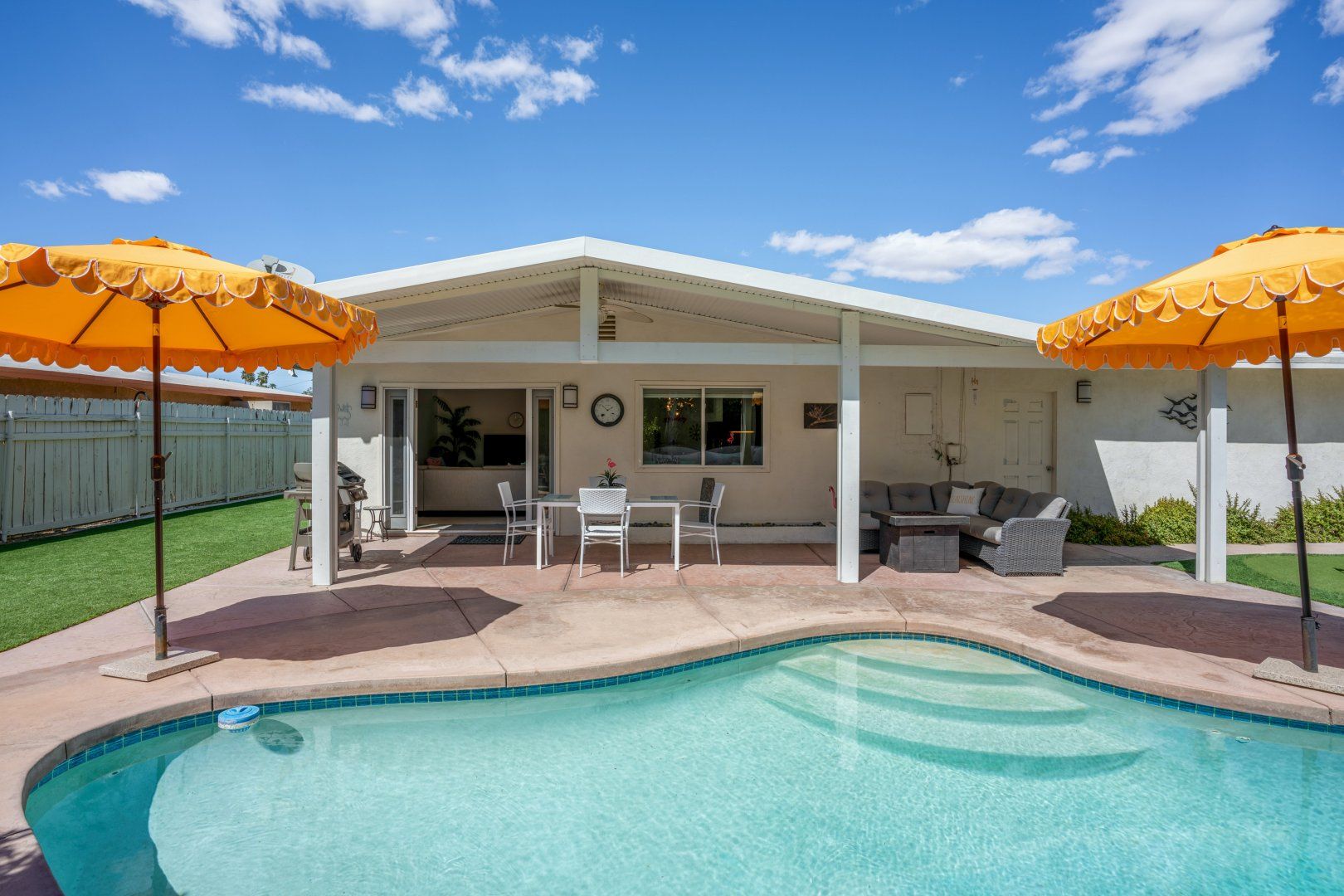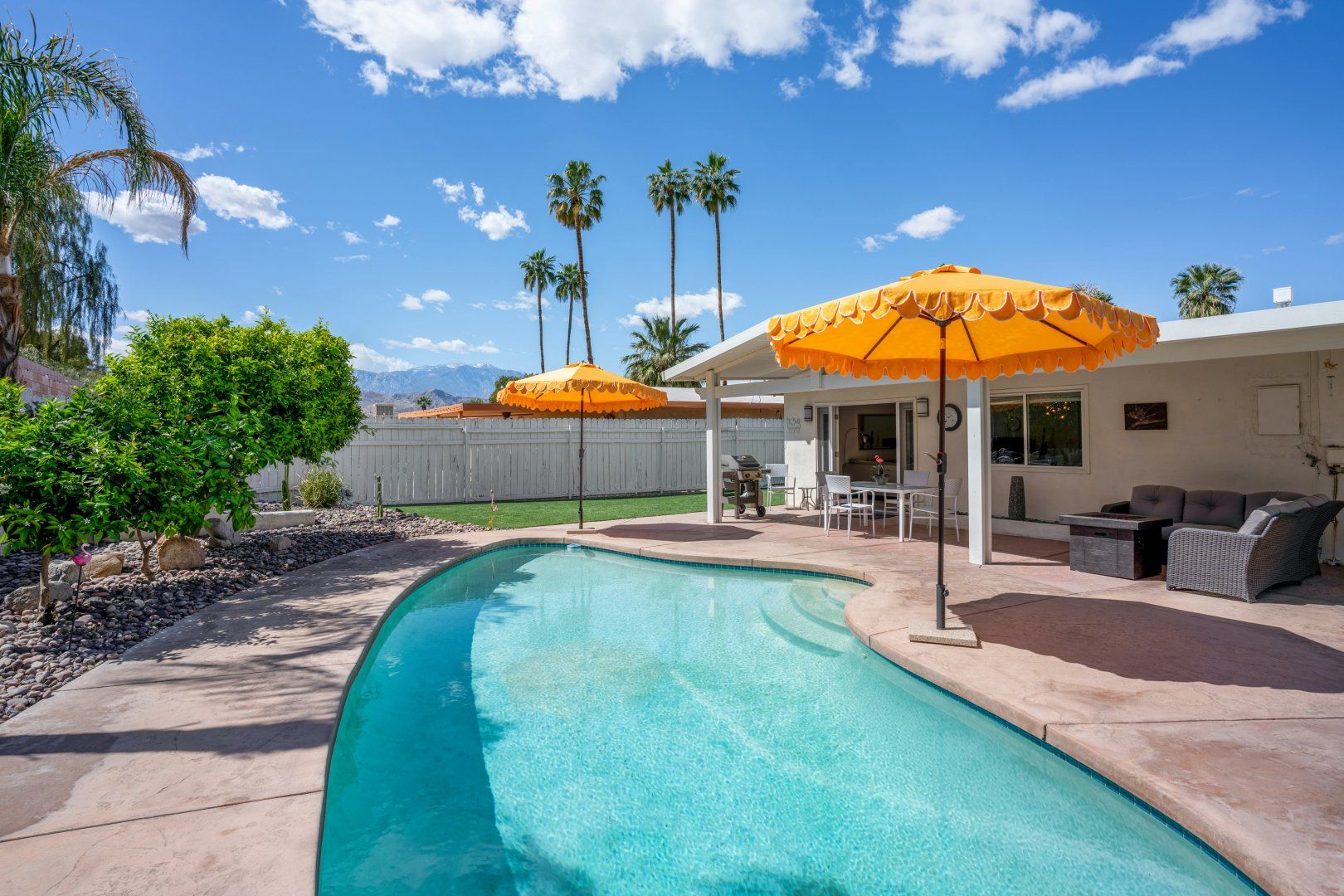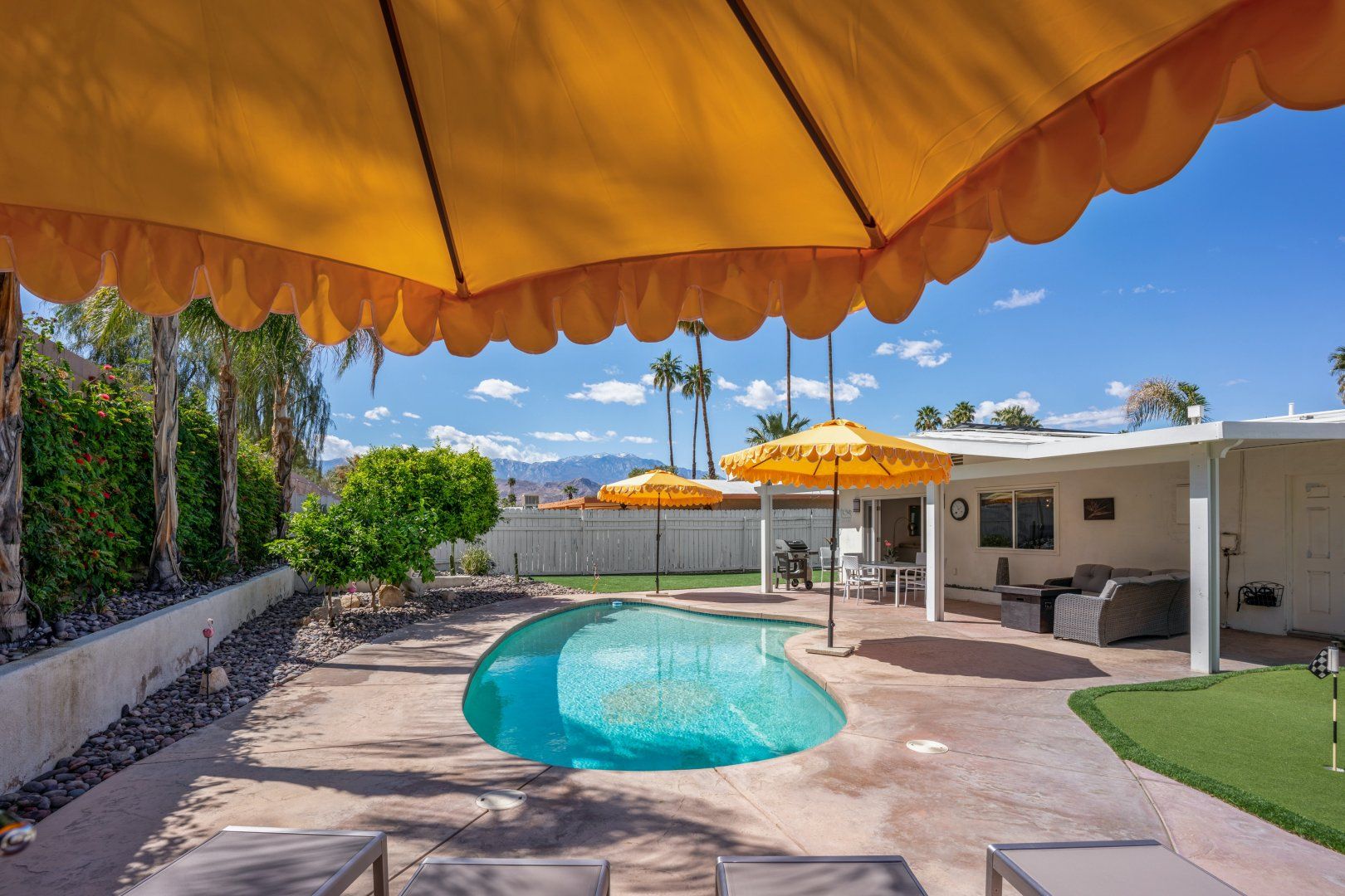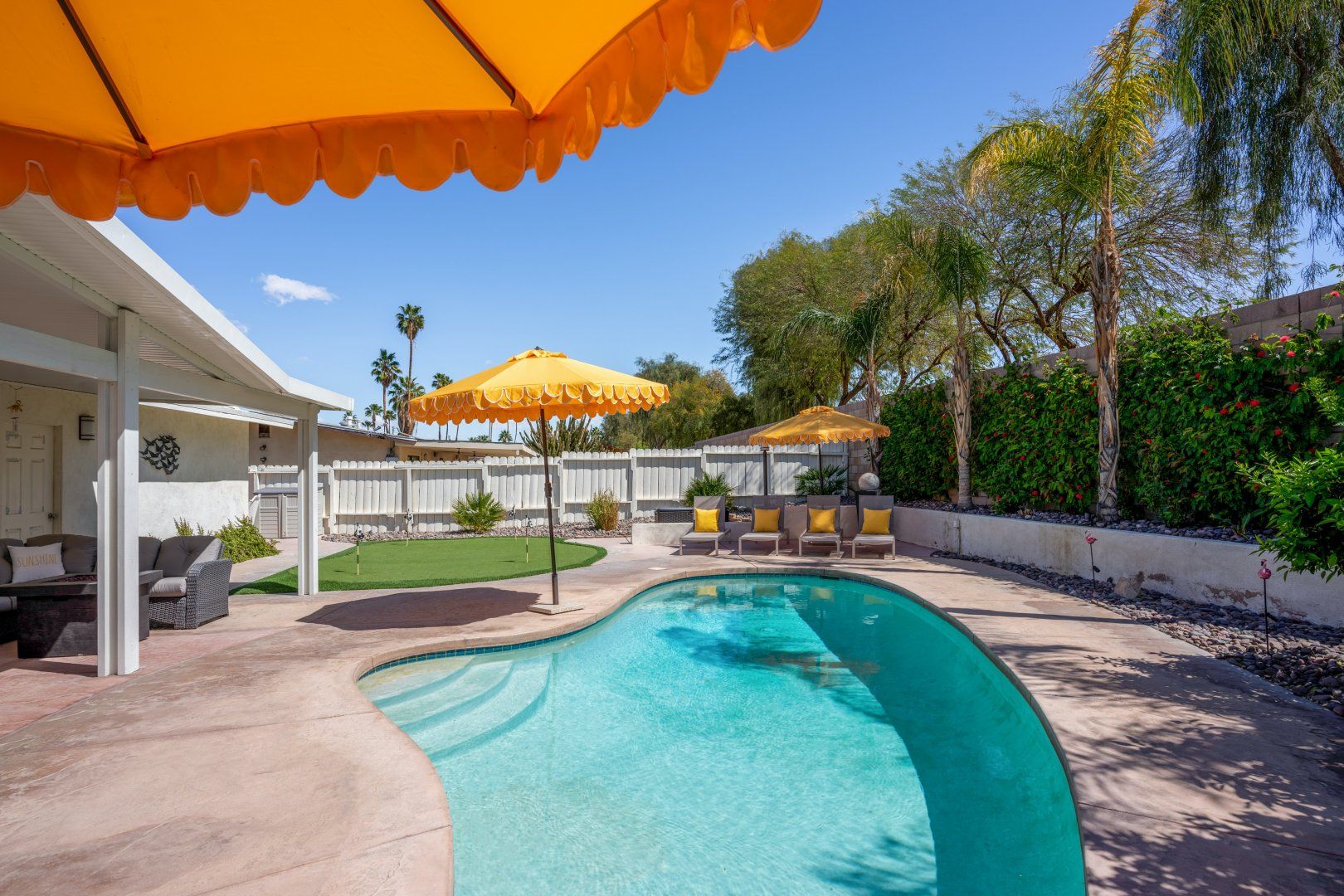 Step back in time to this vintage-style pad in an idyllic Palm Desert location. Inside is where twenty-first-century home comfort meets 1960s Palm Springs chic, with a cool coastal colour scheme, vibrant furniture and curated cacti. Bask in the glorious year-round sunshine on the back deck, splash around in the pool, fire up the barbecue, and practise your aim on the putting green as the meat sizzles. Canopied by tall palms and punchy orange parasols, you'll find a lovely spot for an afternoon snooze in no time. Elsewhere, the open-plan interior and large patio doors make for a stylish living space bathed in natural light. Knock up a couple of homemade California burritos in the chef's kitchen, pour yourself a chilled glass of wine and hang out under the gentle shade - in these surroundings, you really have no choice but to slow down and relax. Although, if you can peel yourself away from the sun lounger, you're in the heart of the greater Palm Springs area with all there is to eat, drink and do right at your doorstep. Culture buffs will enjoy one of the local architectural tours on offer, while the Living Desert Zoo is a great family day out and only a six-minute drive away. Shop-till-you-drop and taste the tantalising food scene of the El Paseo district (which is basically the Rodeo of the Coachella Valley), less than a half-hour walk from your door. Whether you choose to spend most of your stay languorously idling by the pool or venturing off and exploring this beautiful natural landscape, you’re in for a treat here.