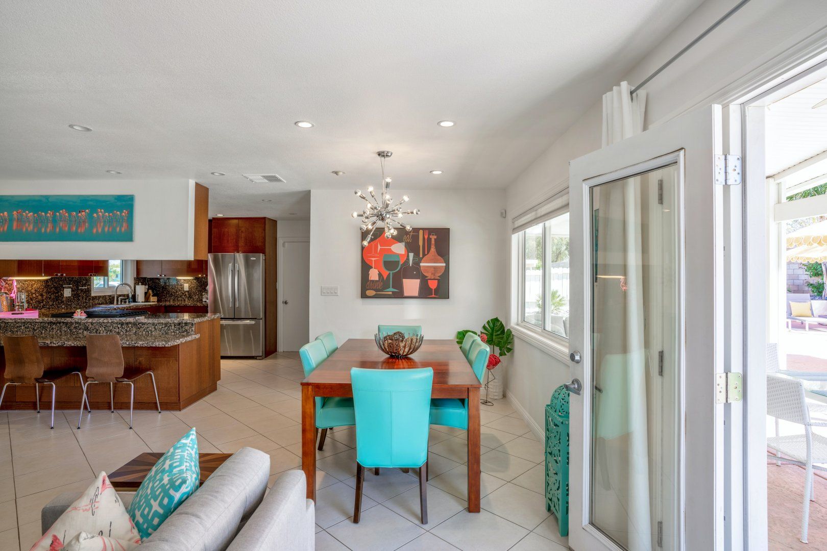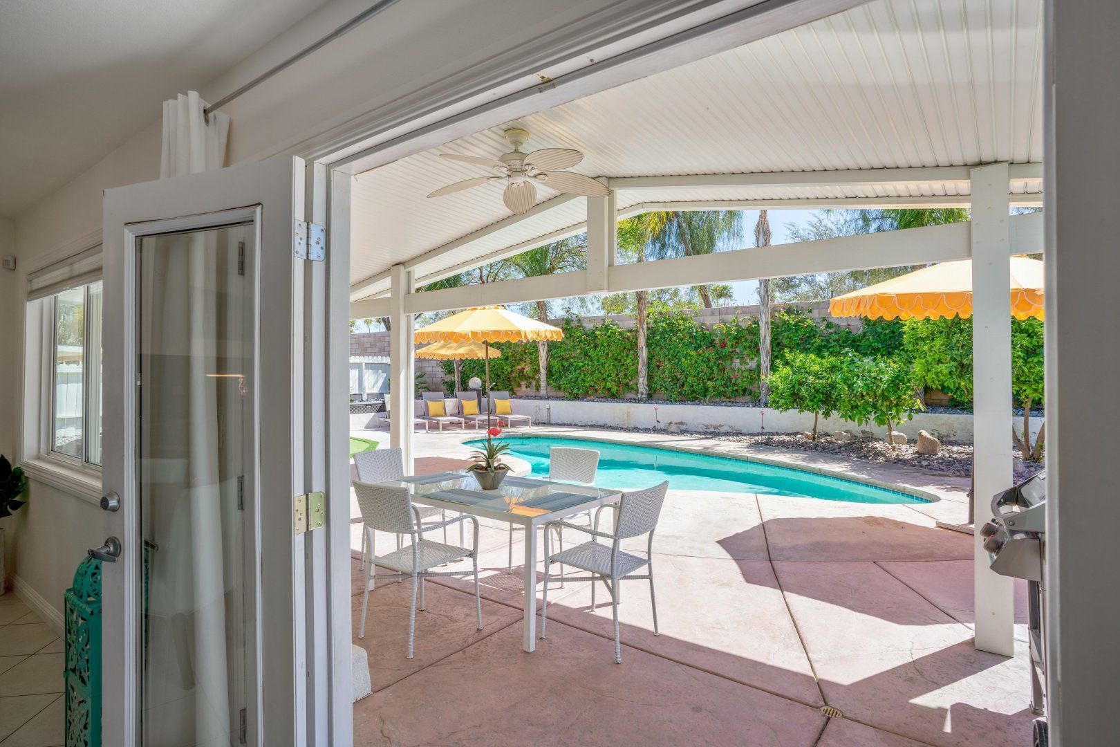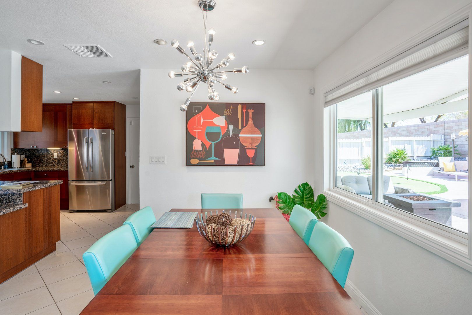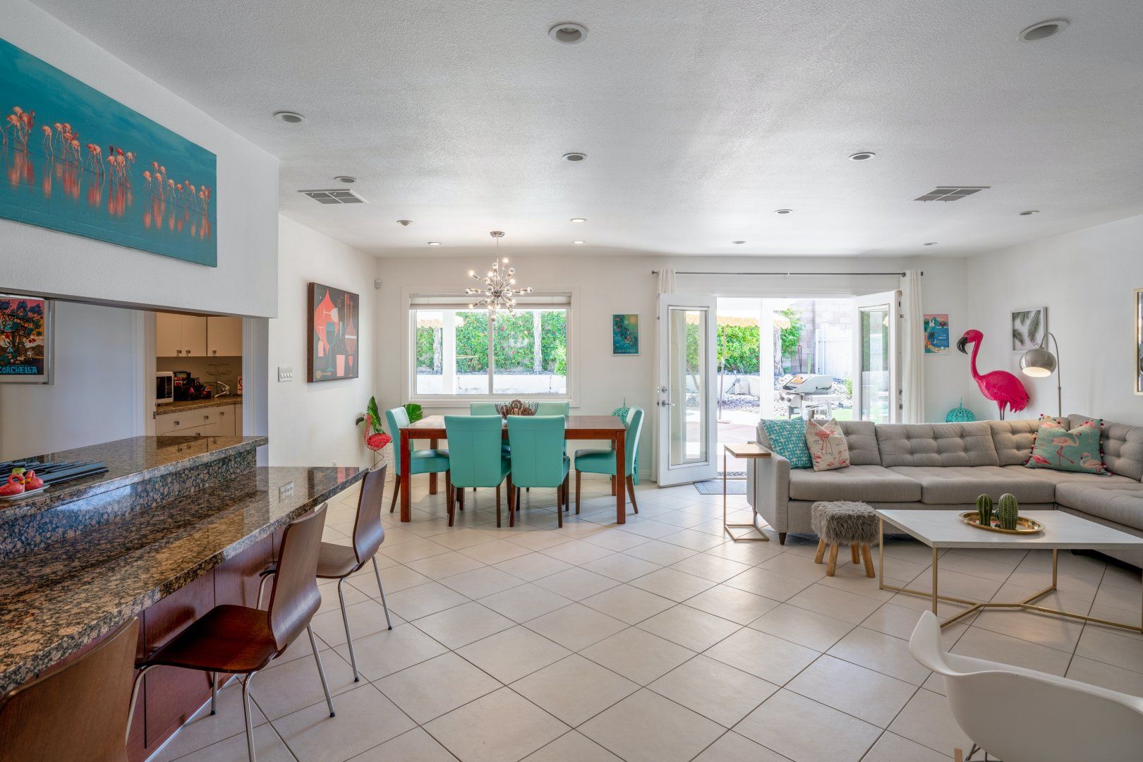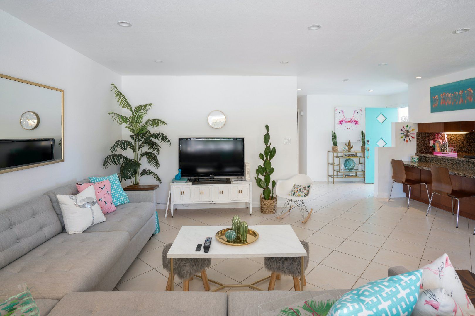 Step back in time to this vintage-style pad in an idyllic Palm Desert location. Inside is where twenty-first-century home comfort meets 1960s Palm Springs chic, with a cool coastal colour scheme, vibrant furniture and curated cacti. Bask in the glorious year-round sunshine on the back deck, splash around in the pool, fire up the barbecue, and practise your aim on the putting green as the meat sizzles. Canopied by tall palms and punchy orange parasols, you'll find a lovely spot for an afternoon snooze in no time. Elsewhere, the open-plan interior and large patio doors make for a stylish living space bathed in natural light. Knock up a couple of homemade California burritos in the chef's kitchen, pour yourself a chilled glass of wine and hang out under the gentle shade - in these surroundings, you really have no choice but to slow down and relax. Although, if you can peel yourself away from the sun lounger, you're in the heart of the greater Palm Springs area with all there is to eat, drink and do right at your doorstep. Culture buffs will enjoy one of the local architectural tours on offer, while the Living Desert Zoo is a great family day out and only a six-minute drive away. Shop-till-you-drop and taste the tantalising food scene of the El Paseo district (which is basically the Rodeo of the Coachella Valley), less than a half-hour walk from your door. Whether you choose to spend most of your stay languorously idling by the pool or venturing off and exploring this beautiful natural landscape, you’re in for a treat here.