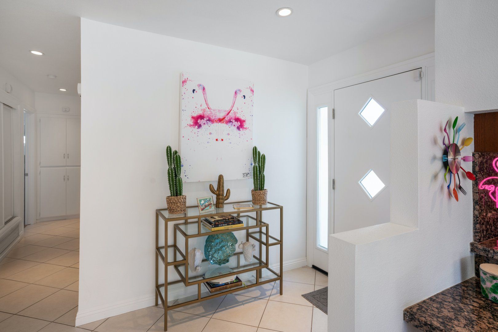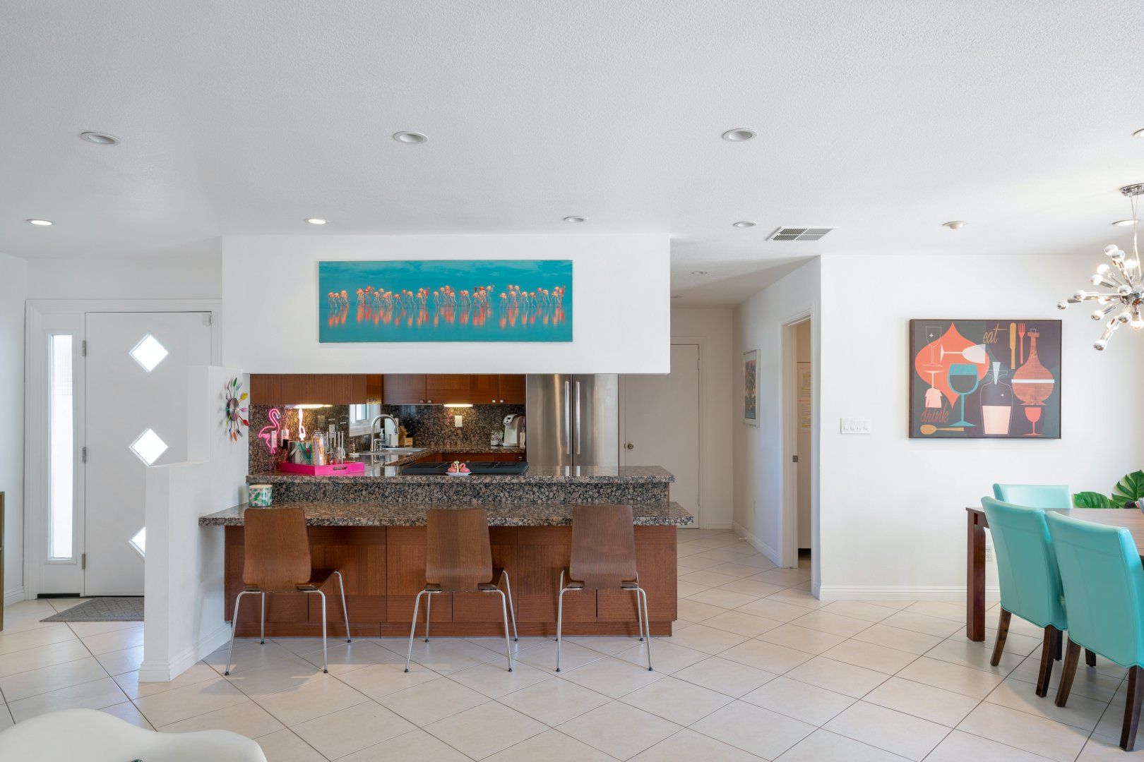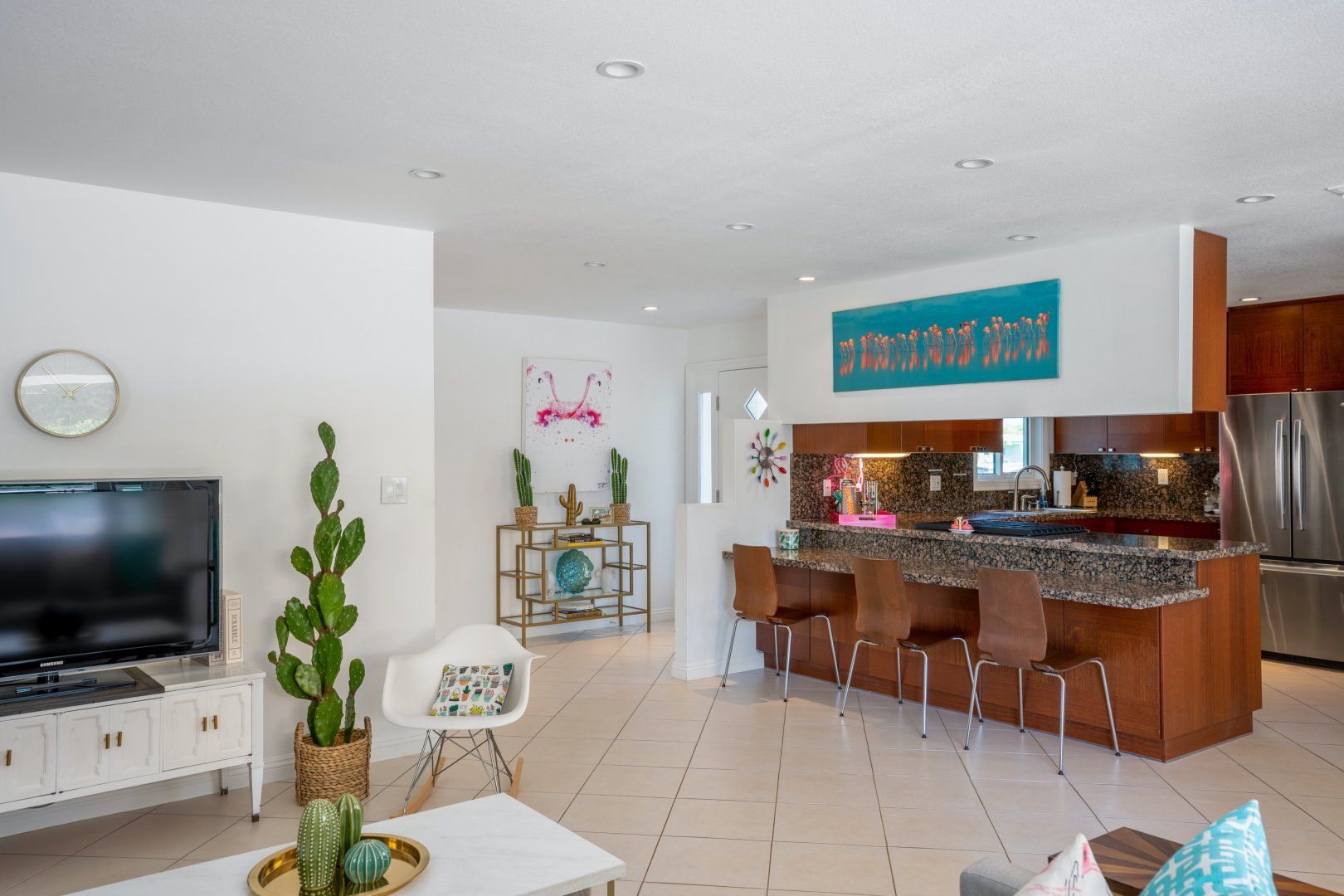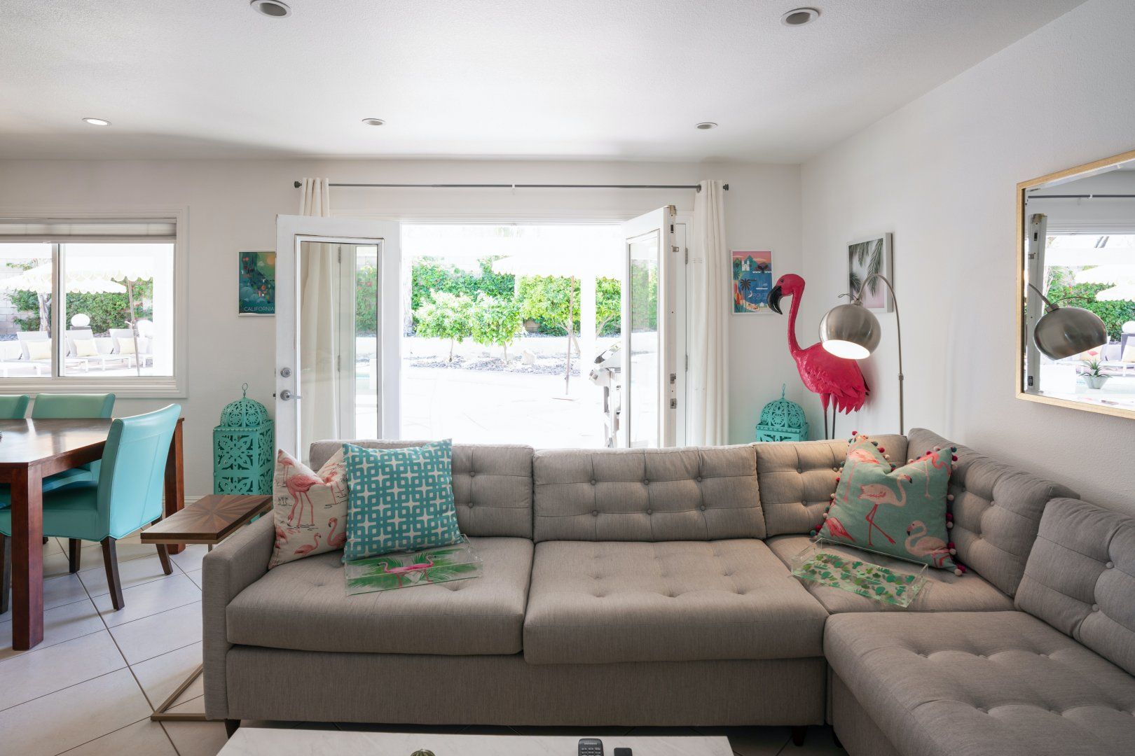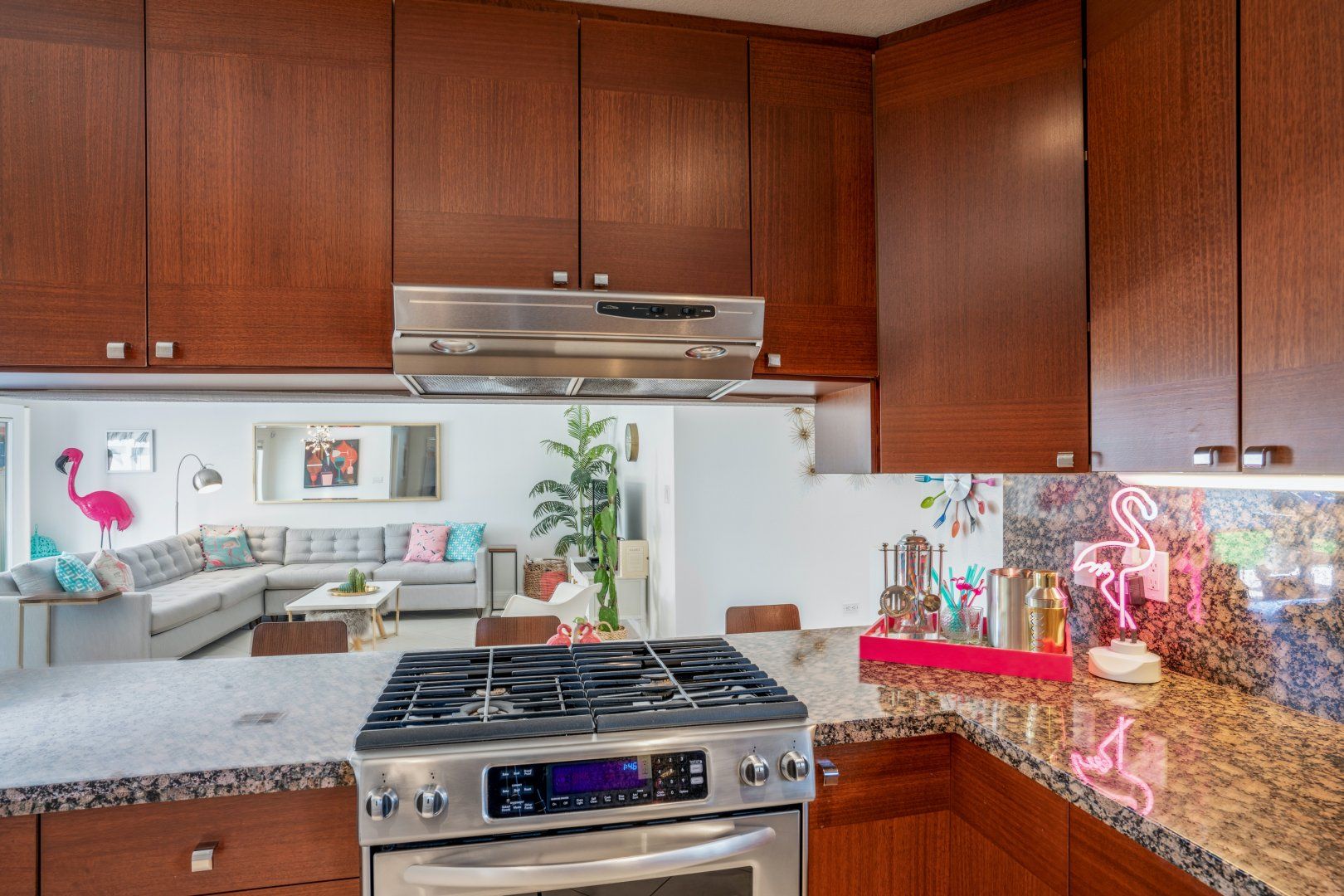 Step back in time to this vintage-style pad in an idyllic Palm Desert location. Inside is where twenty-first-century home comfort meets 1960s Palm Springs chic, with a cool coastal colour scheme, vibrant furniture and curated cacti. Bask in the glorious year-round sunshine on the back deck, splash around in the pool, fire up the barbecue, and practise your aim on the putting green as the meat sizzles. Canopied by tall palms and punchy orange parasols, you'll find a lovely spot for an afternoon snooze in no time. Elsewhere, the open-plan interior and large patio doors make for a stylish living space bathed in natural light. Knock up a couple of homemade California burritos in the chef's kitchen, pour yourself a chilled glass of wine and hang out under the gentle shade - in these surroundings, you really have no choice but to slow down and relax. Although, if you can peel yourself away from the sun lounger, you're in the heart of the greater Palm Springs area with all there is to eat, drink and do right at your doorstep. Culture buffs will enjoy one of the local architectural tours on offer, while the Living Desert Zoo is a great family day out and only a six-minute drive away. Shop-till-you-drop and taste the tantalising food scene of the El Paseo district (which is basically the Rodeo of the Coachella Valley), less than a half-hour walk from your door. Whether you choose to spend most of your stay languorously idling by the pool or venturing off and exploring this beautiful natural landscape, you’re in for a treat here.
