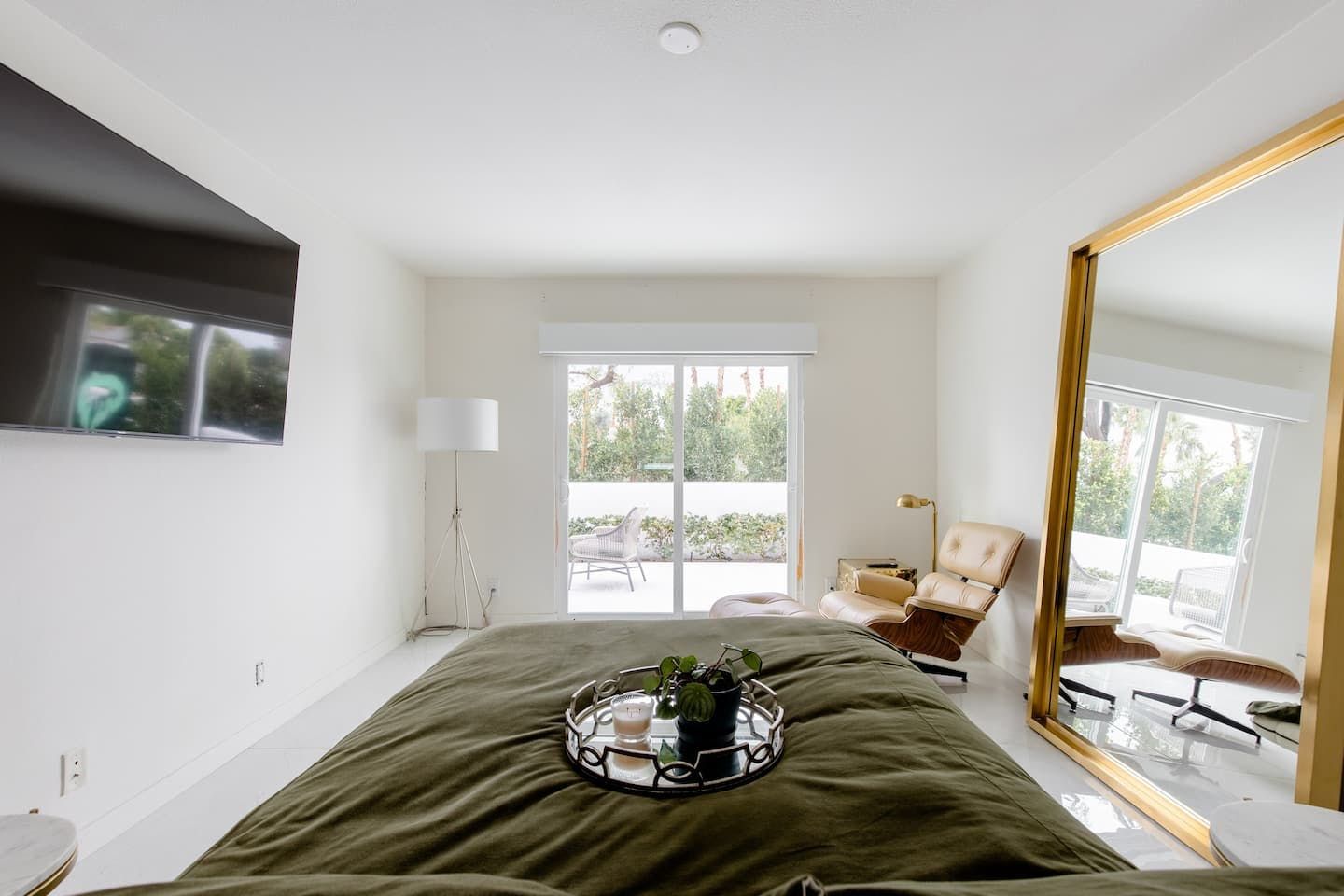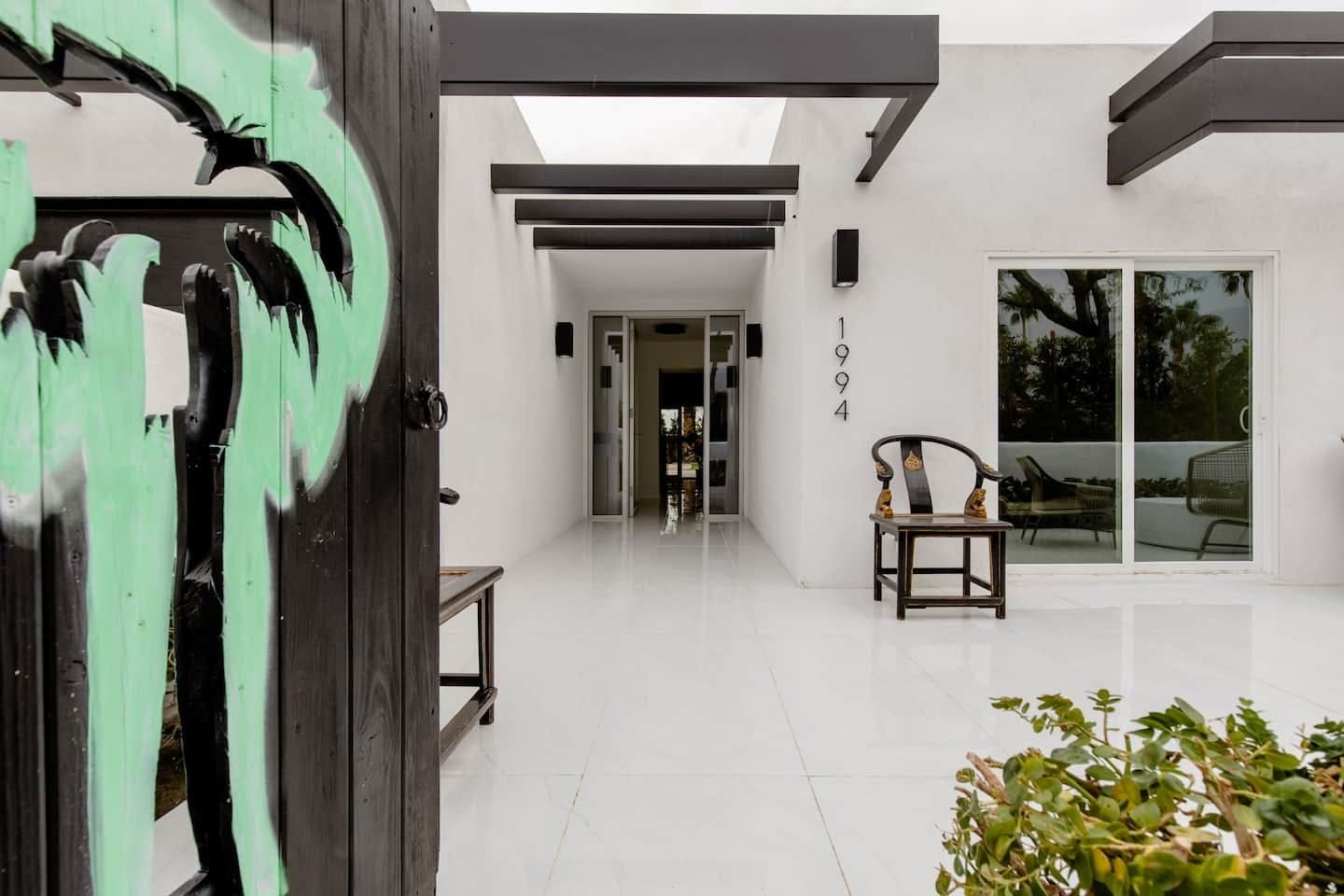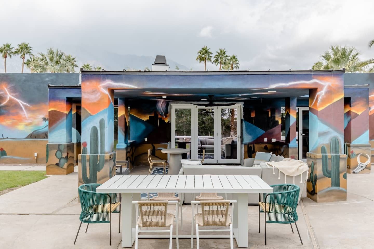 Set in a very private, tranquil pocket of Palm Springs, this modern and creative home is the perfect spot for those looking to chill out during the day and entertain in the evenings. With its vibrant graffitied walls and doors, and glamorous decor, this home really makes a visual statement. It's a real crowd-pleaser too, with a large indoor-outdoor living space, two private