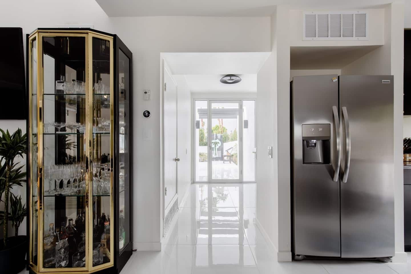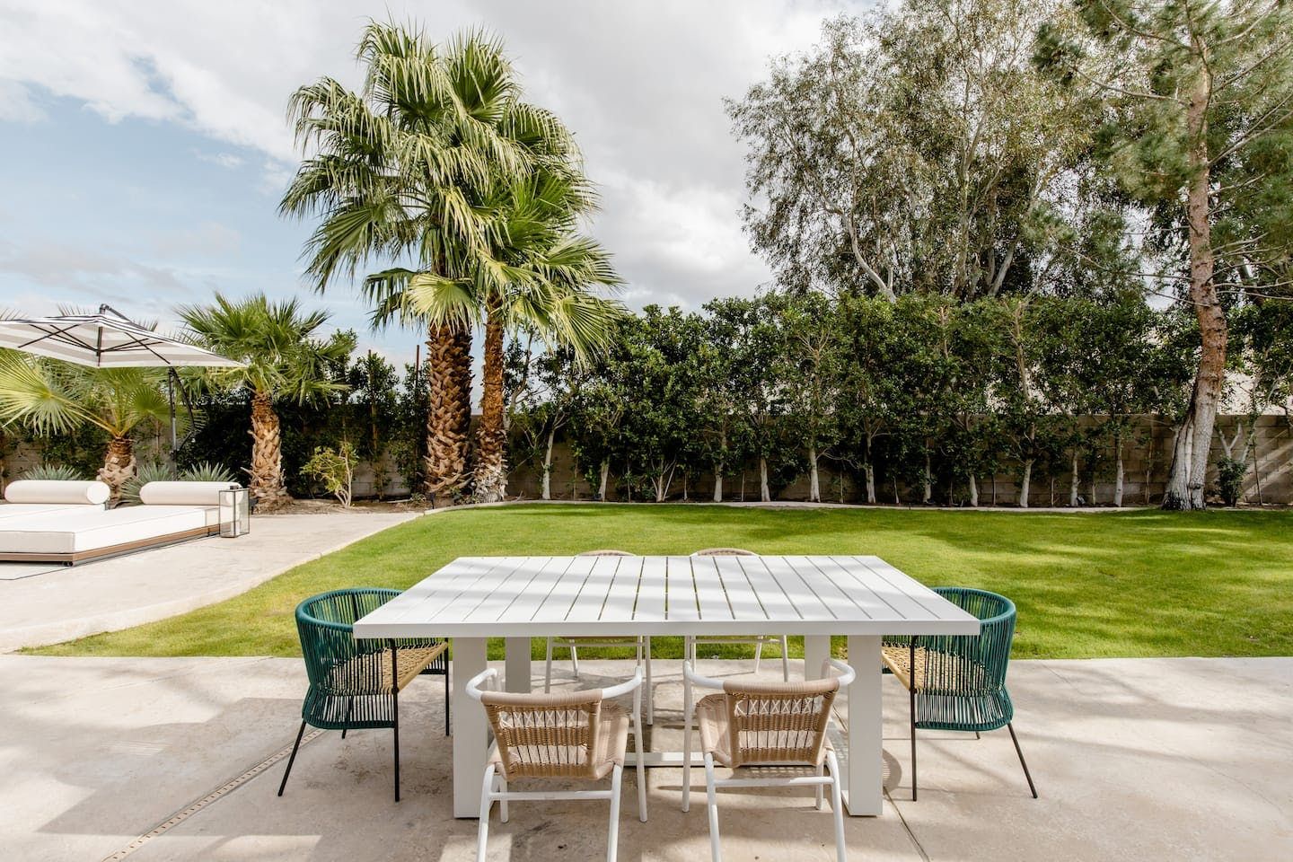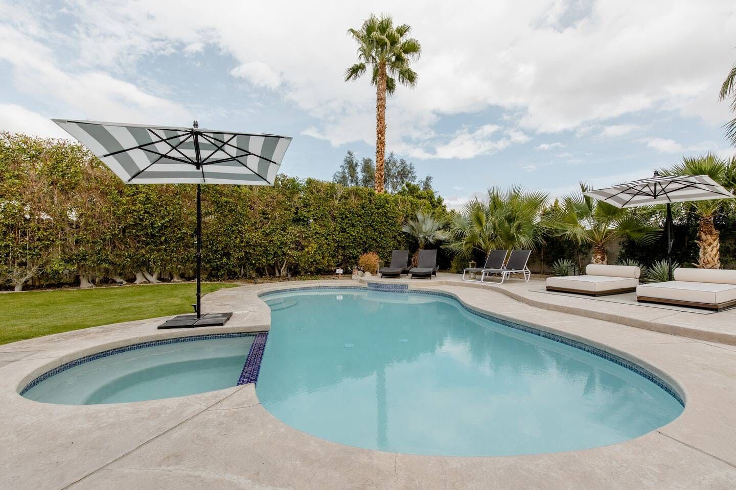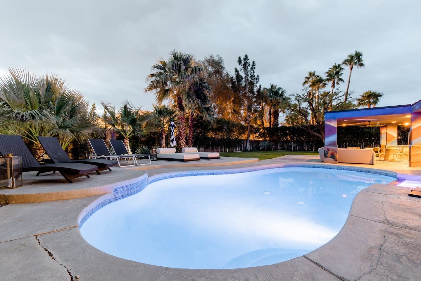 patios and a sprawling pool area. Bask in the glorious sunshine as you lap up the dramatic mountain views and tall, luscious palms. Go for a quick dip in the pool, before gathering your ensemble for an alfresco lunch on the garden patio. Wind down a leisurely afternoon with a couple of cocktails from the bar inside, or drop into the hot tub for half an hour's R&R. On cooler evenings, pull down the 4k projector, light up the fireplace, and settle down for a cosy movie night in with your loved ones. Otherwise, spend your evenings sipping cocktails, playing games and sharing stories on the covered terrace. We could think of nothing better than whiling away the hours laughing, catching up and watching the stars sparkling out here. When you’re in the mood for dining out, take a quick five-minute drive to Downtown Palm Springs, filled with gourmet restaurants, busy bars, and boutique-style shops. For those looking to explore the Palm Desert during their stay, we recommend starting early and hiking up the Indian Canyons for an unforgettable sunrise, only a fifteen-minute drive away.