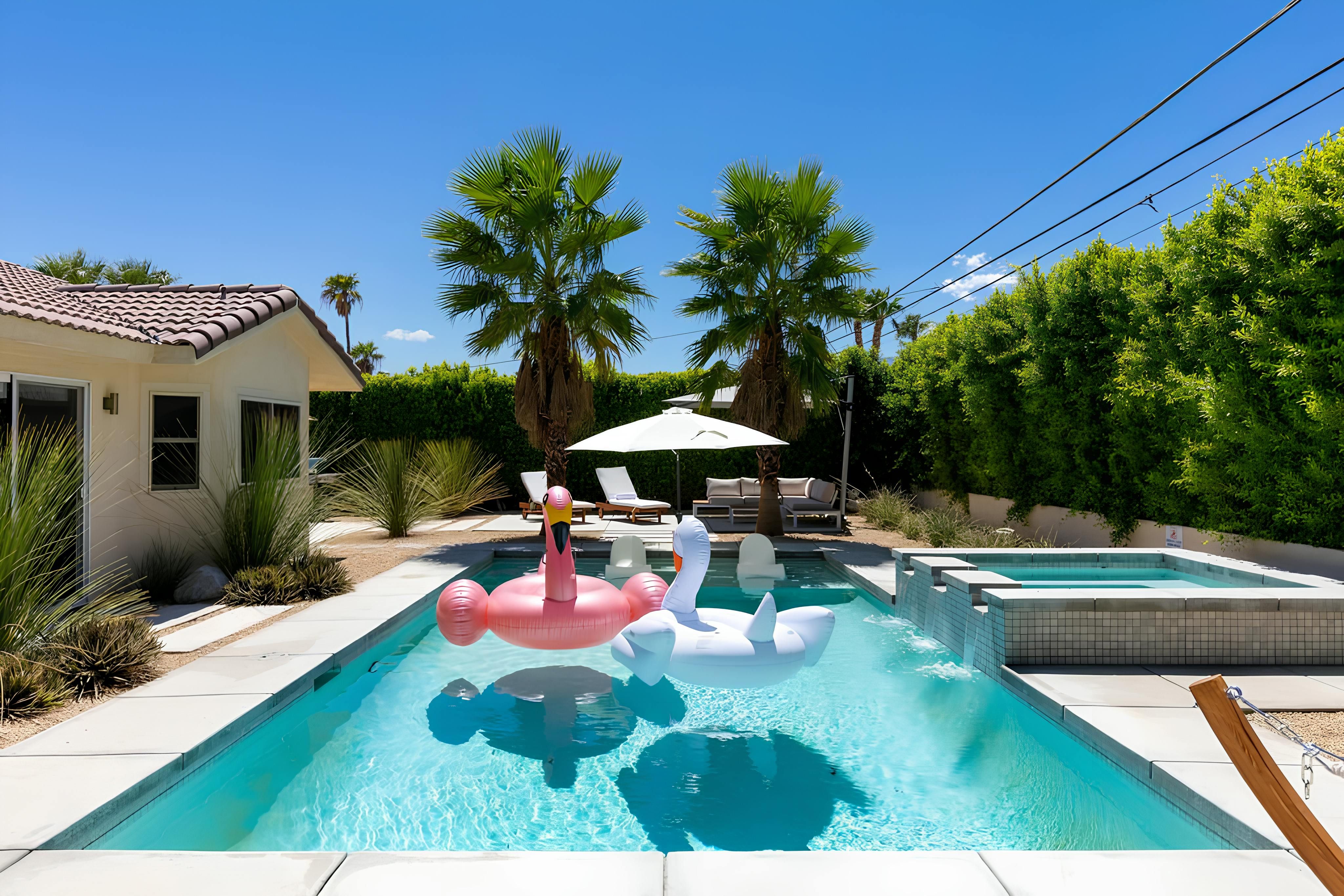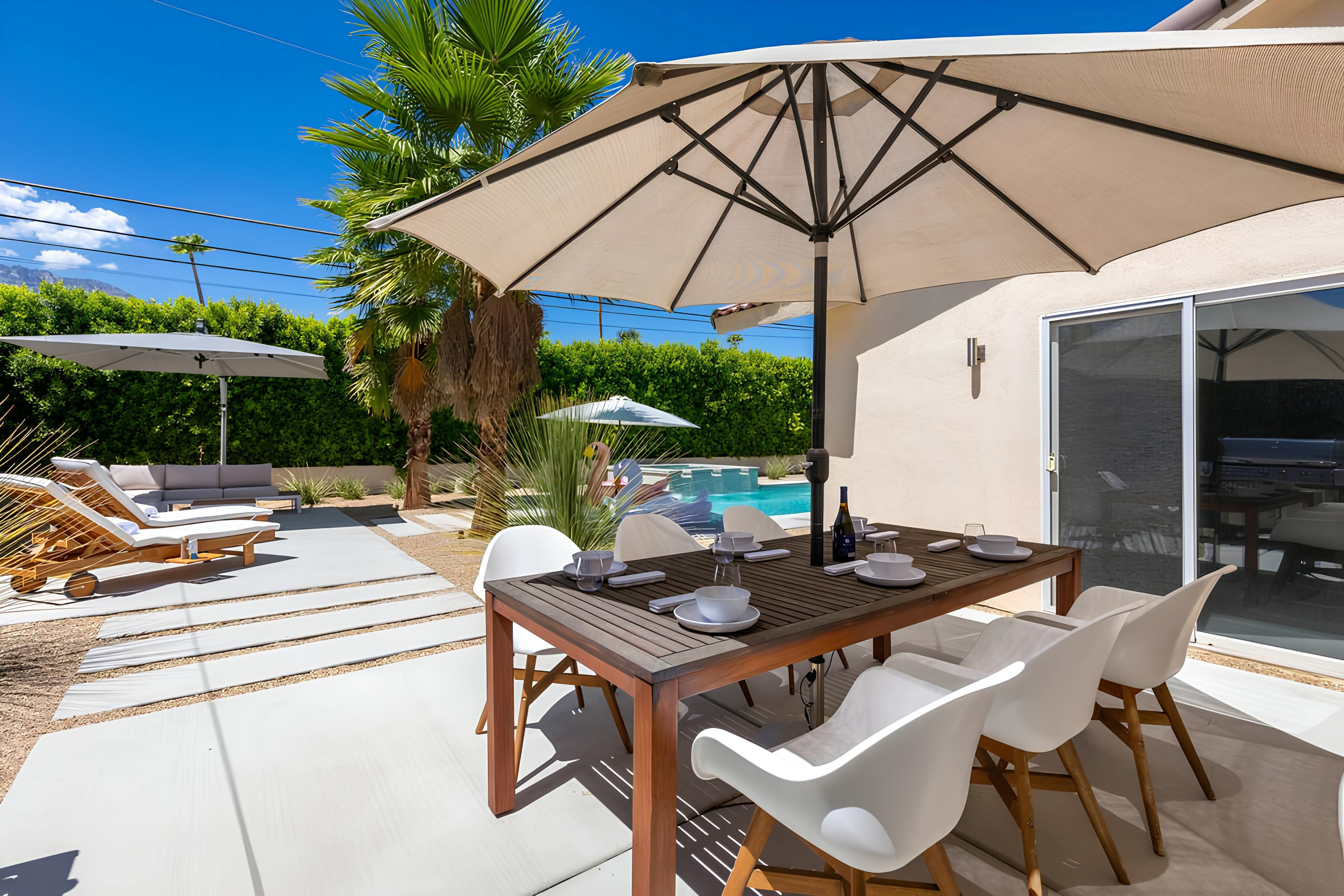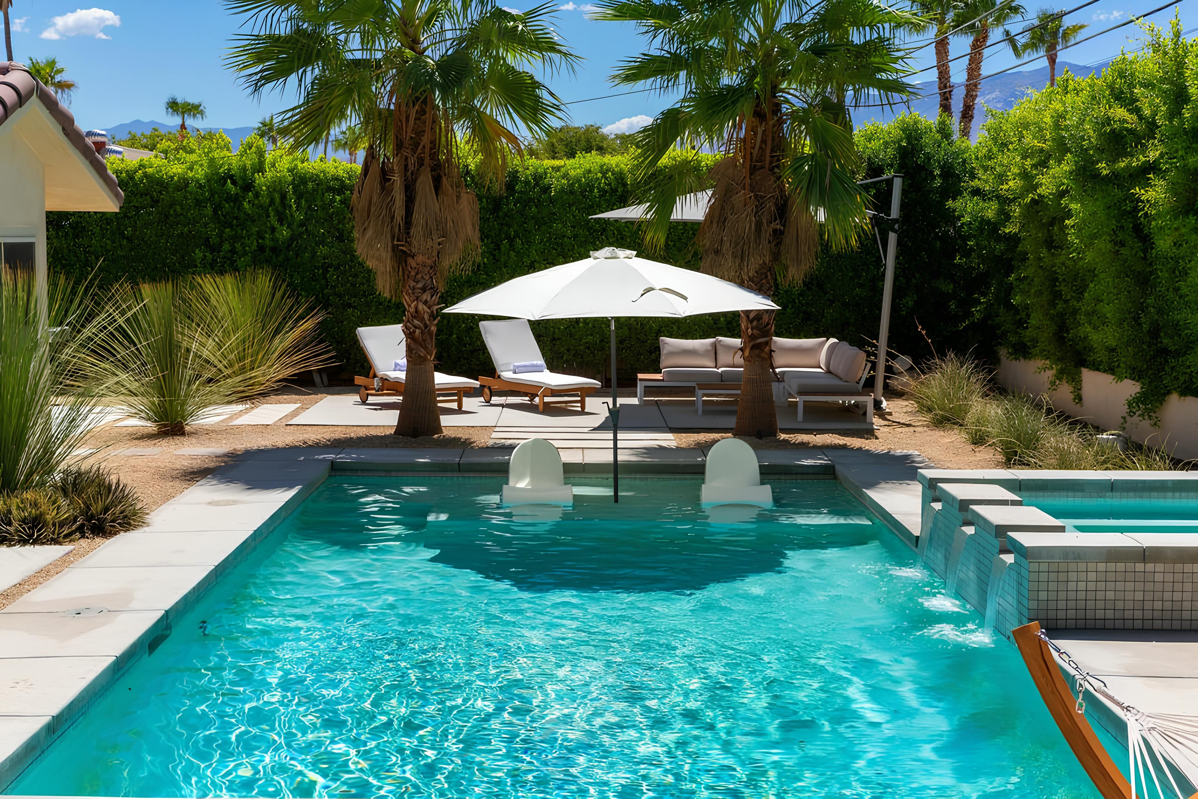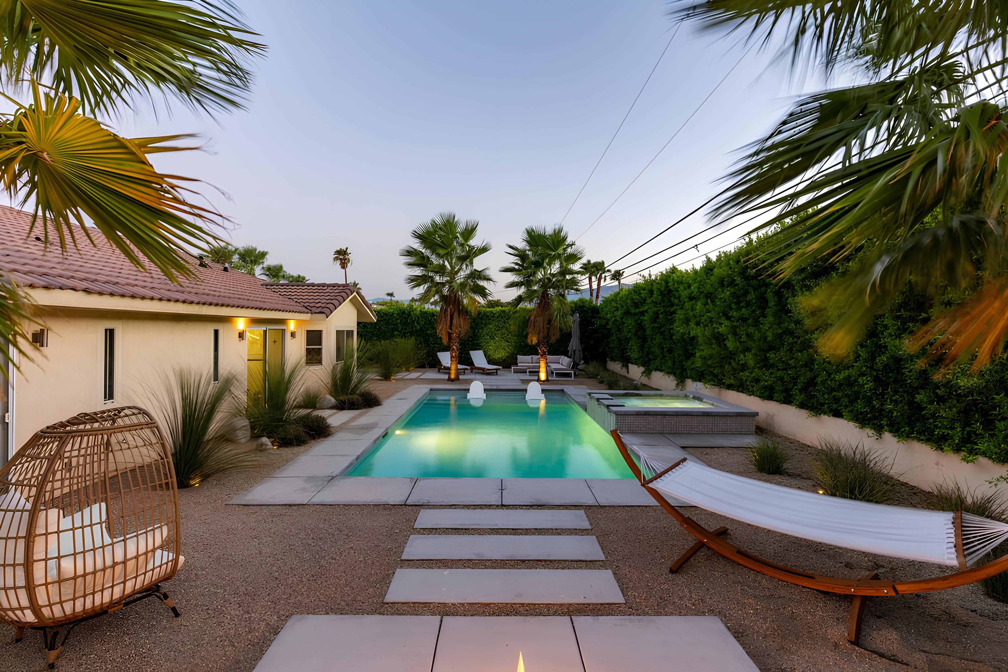 Welcome to LUX Palmas, your ultimate luxury oasis in gorgeous Palm Springs. This spectacular resort-style home is located just minutes from the airport and downtown, and only a 7 minute walk to the Sunrise Square shopping center where you'll find a grocery store, coffee shops and restaurants. It doesn't get more convenient than this! Indulge in the tranquility of your private paradise surrounded by lush tropical gardens and picturesque mountain views. Relax in the sun-drenched courtyard and take a dip in the sparkling turquoise pool or unwind under the shaded pergola with a refreshing cocktail. Inside, the contemporary decor embodies elegance and sophistication, creating a serene ambiance throughout. Each room exudes comfort and style, with luxurious furnishings and plush bedding ensuring a good night's sleep. Whether you're seeking total relaxation or an unforgettable desert adventure, LUX Palmas is the perfect retreat for creating lasting memories.