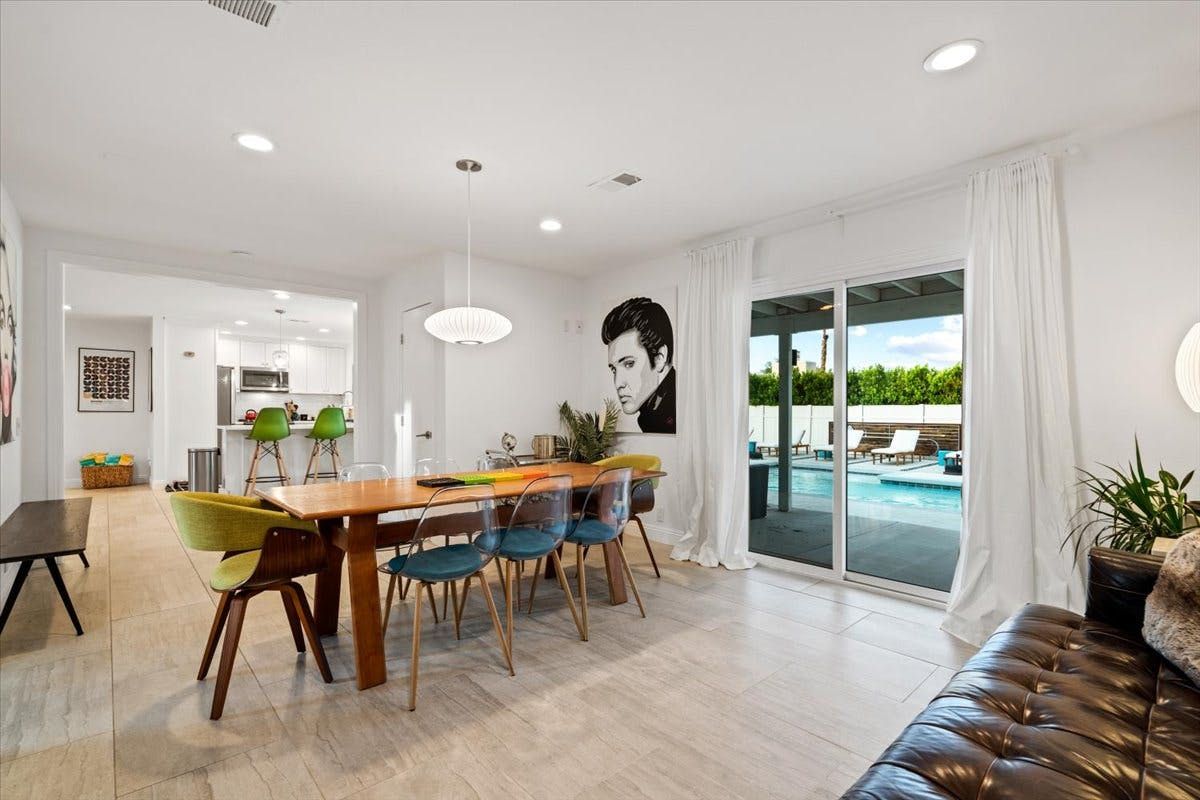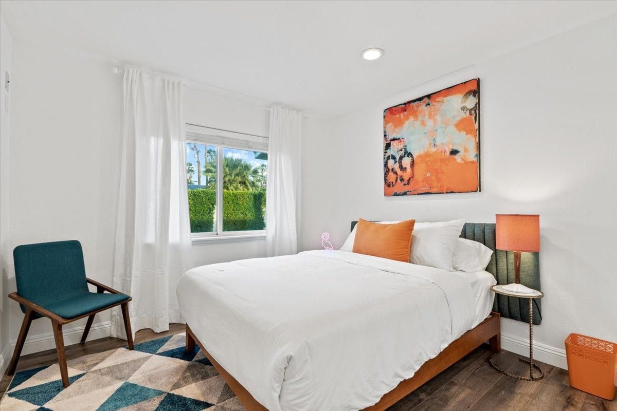 This sleek home features beautiful pops of colour to accompany you while you reside in the exciting destination of Palm Springs. Snuggle up on the sofa in the colourful living space as you watch a movie together with your loved ones. The open plan design means that you'll be able to smell the delicious aroma of a homecooked meal baking in the oven as you relax – patiently waiting to tuck into a plate of food at the dining table by the patio door.