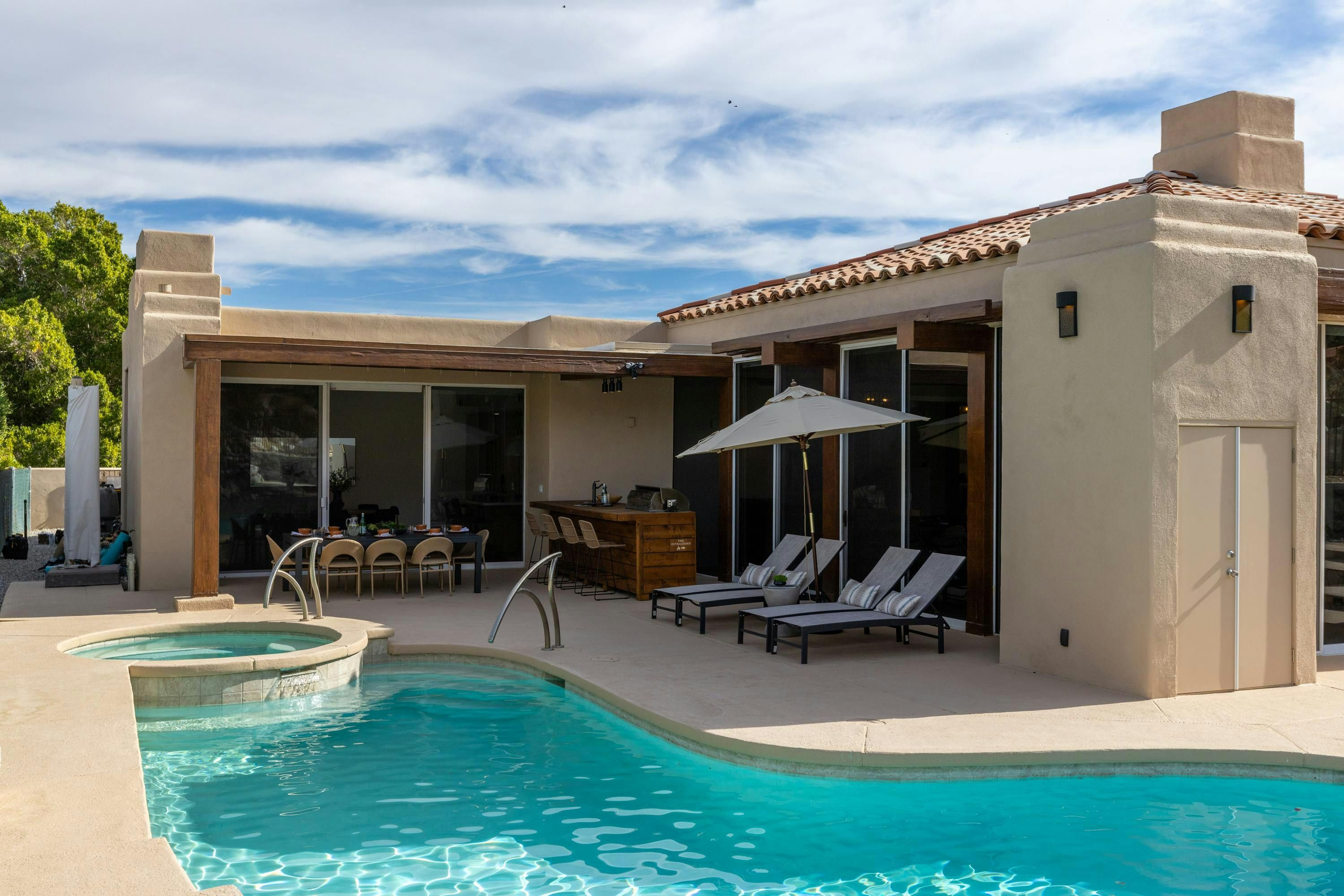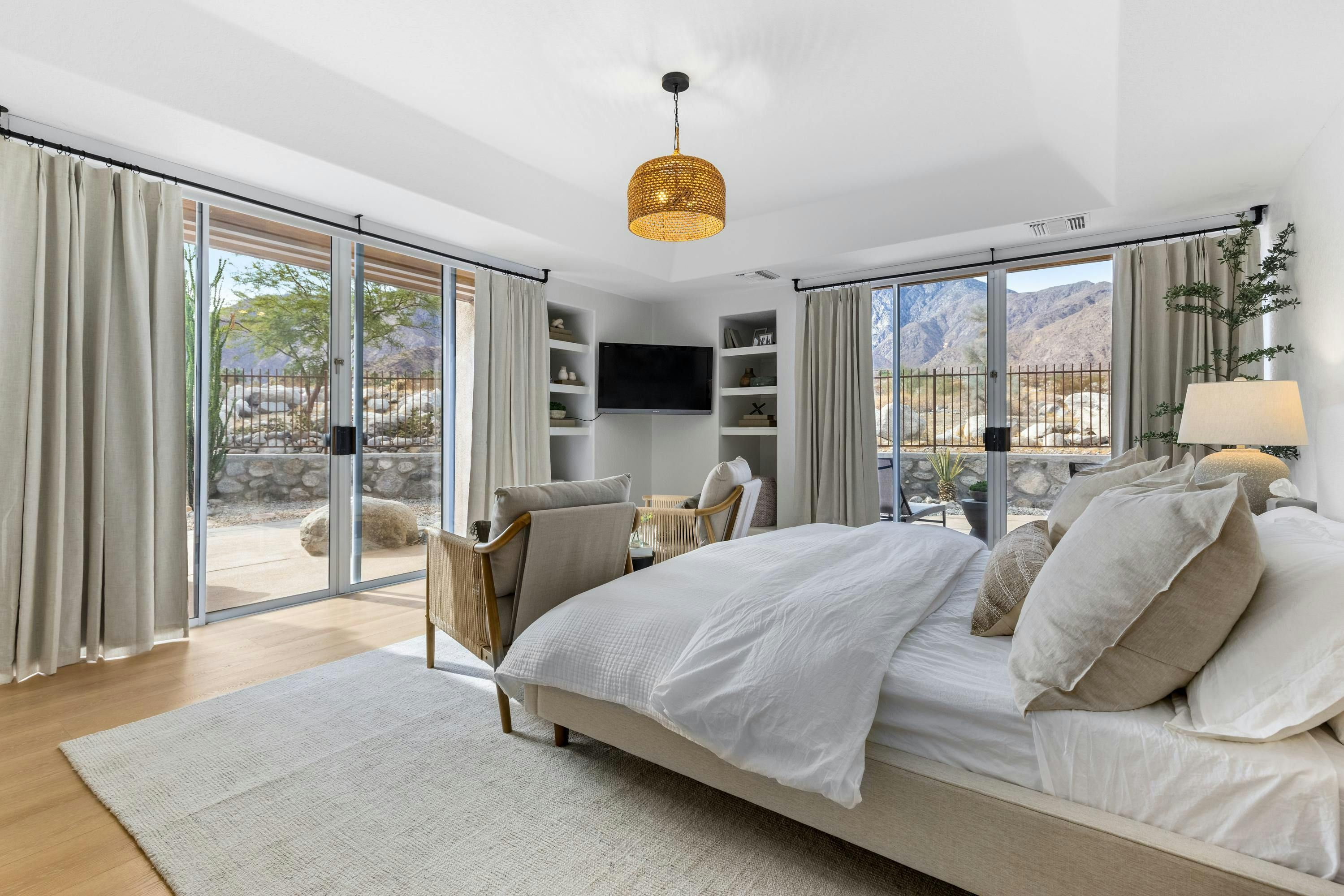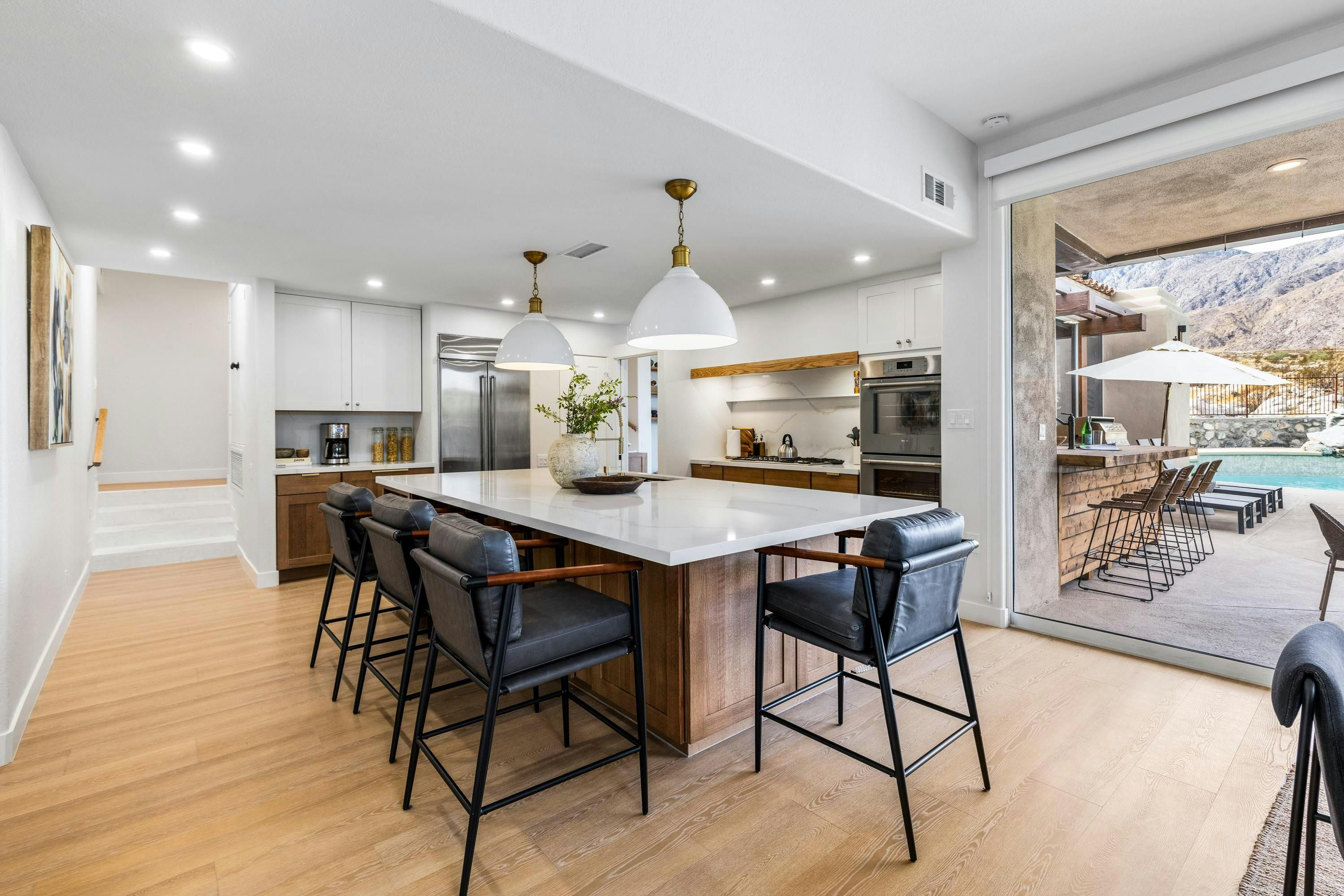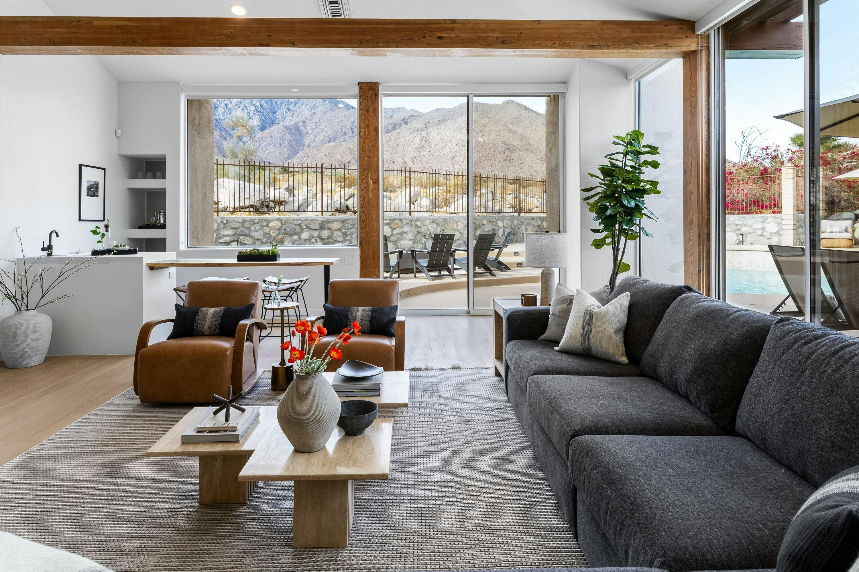 Step outside of this luxury mid-century modern home to discover a serene paradise. Framed by mountain views, there’s a pool, bar and hot tub. Listen to the soothing sound of the waterfall, or in the evening, gather around the fire pit under the desert stars. The home is split between the main villa and a separate casita, so this place is perfect for families and friends. There are several lounge areas to relax in, and there’s an office that sleeps two guests on a sofa bed. The location is impressive too. This home is situated in Little Tuscany, a picturesque and sought-after neighbourhood. It’s a short drive from vibrant downtown Palm Springs, with its world-class dining, boutiques, and cultural attractions.