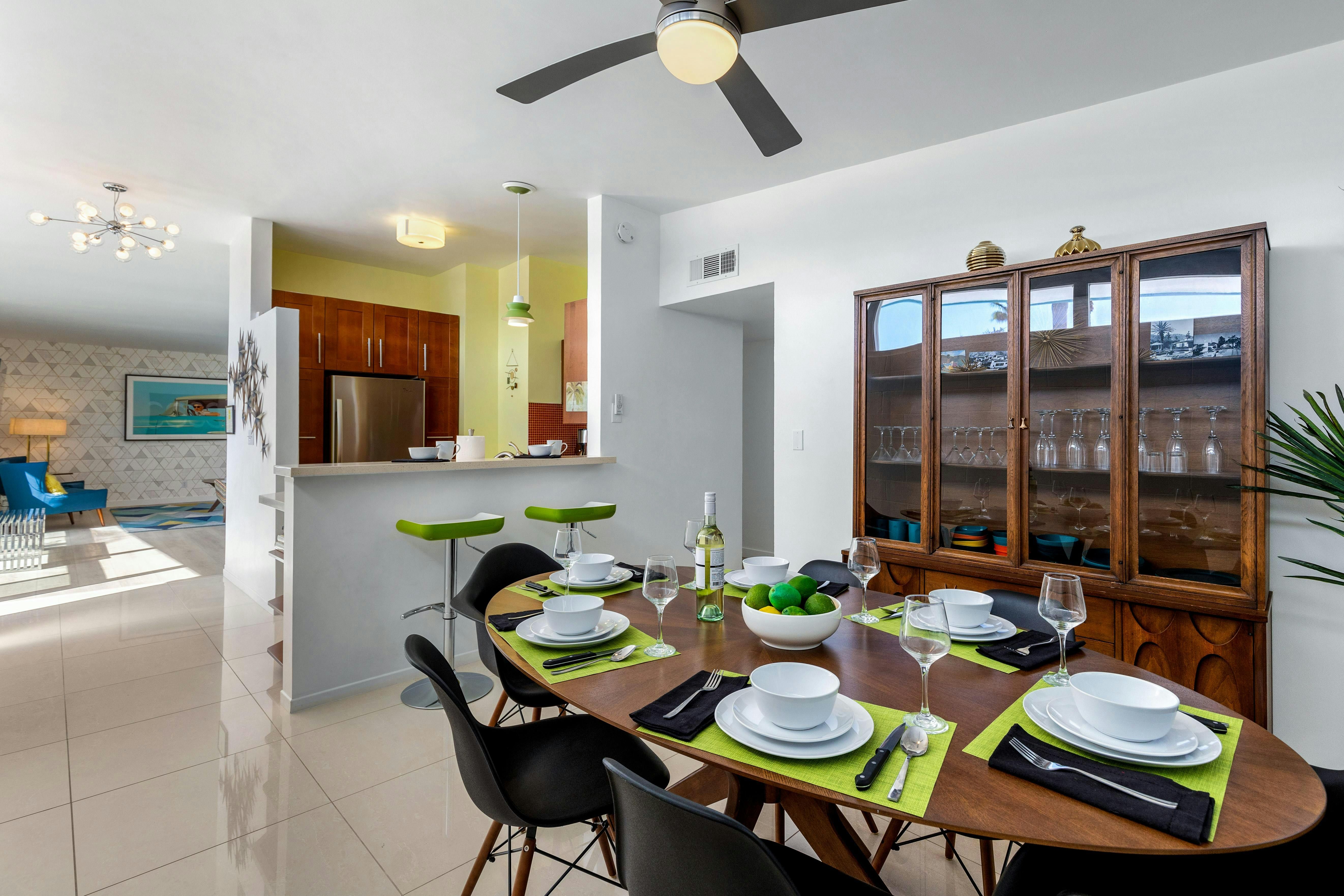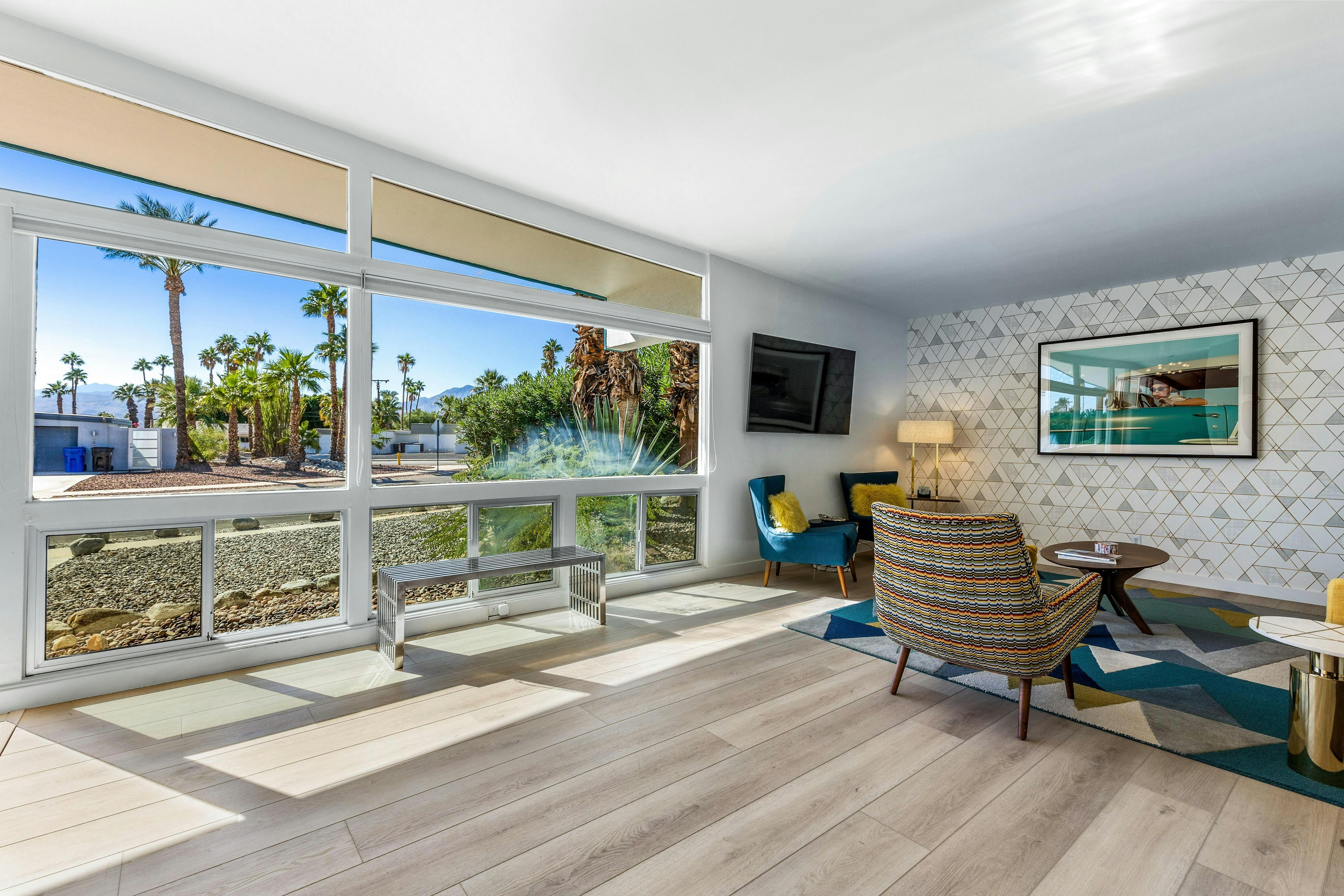 Despite the proximity to downtown Palm Springs and Joshua Tree National Park, the outdoor space here might tempt you to spend your holiday at home. The pool is the perfect place to soak up the California sunshine, or opt for a lounger under the shade of the trees. The ample outdoor dining area means you can spend the entire day outside – with breaks for casual ping-pong tournaments in the games room, naturally. We love the views of the city's characteristic wide avenues and palm trees from the living room, and the retro-inspired design perfectly matches the mid-century architecture.
