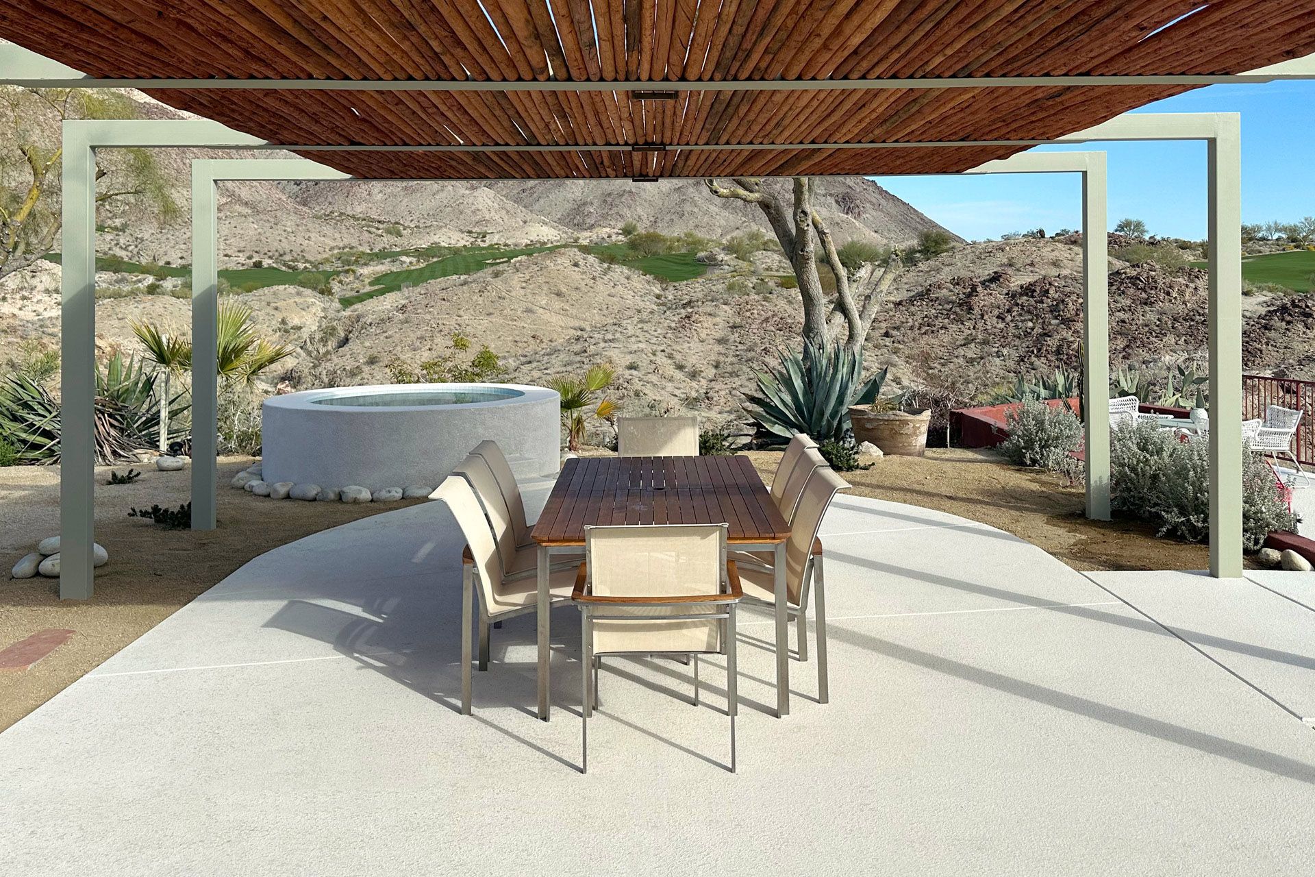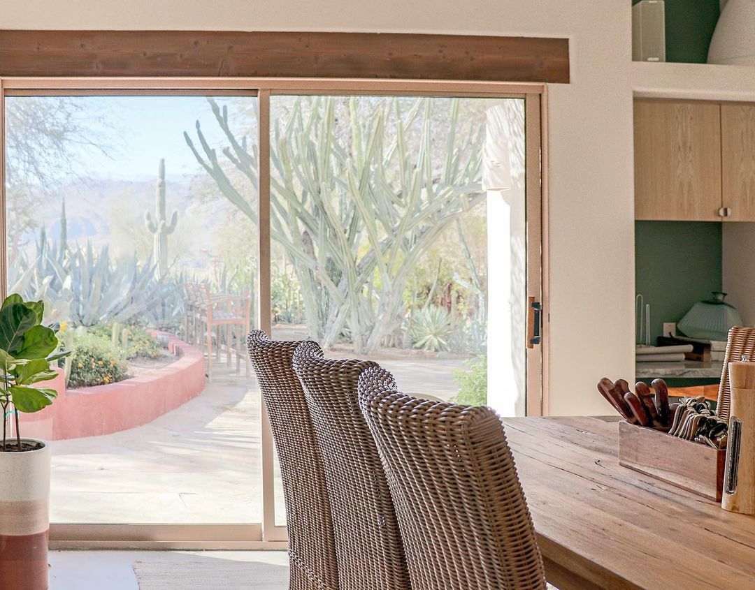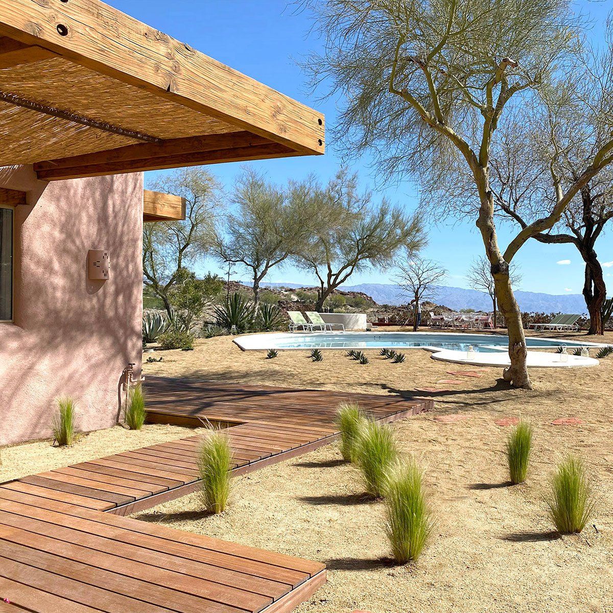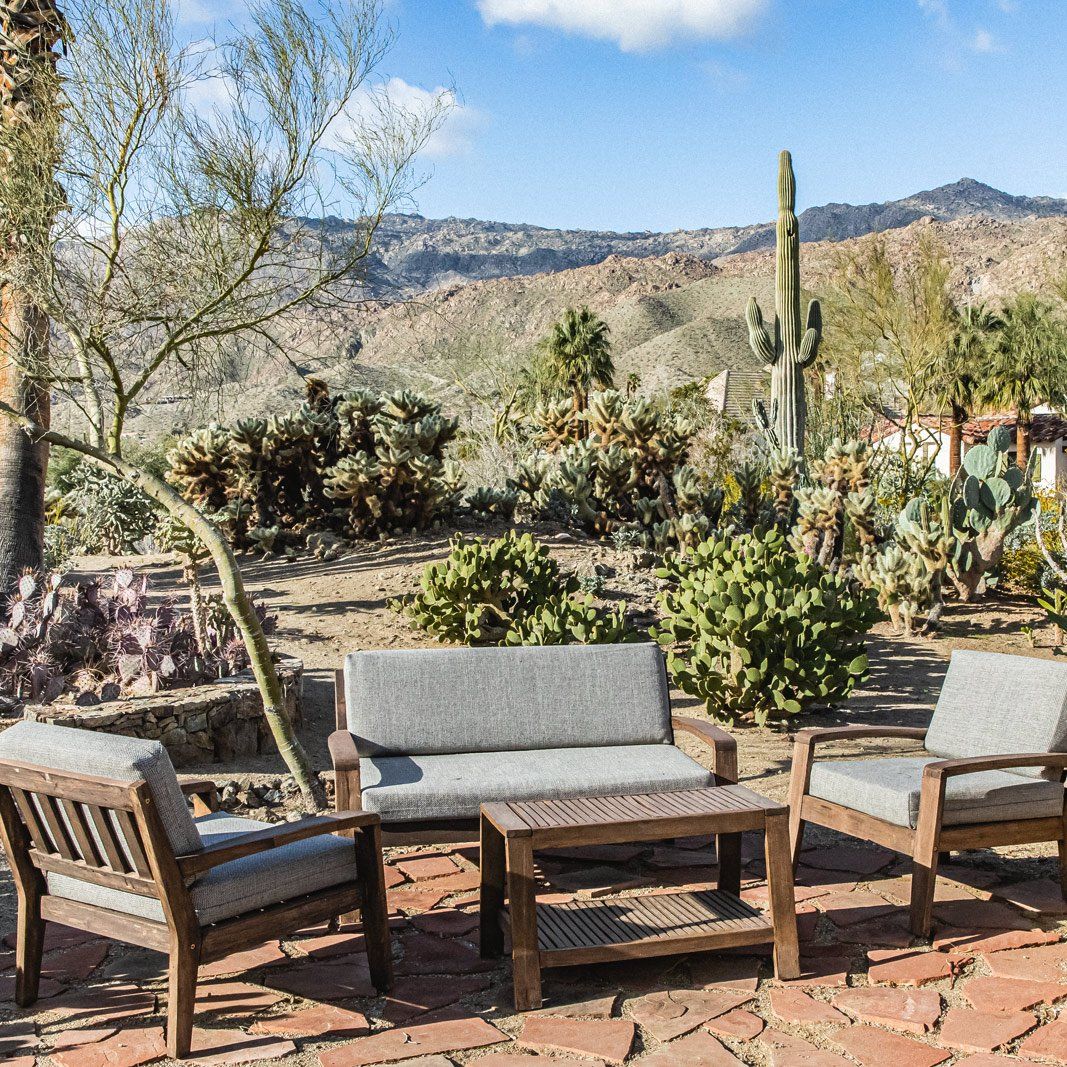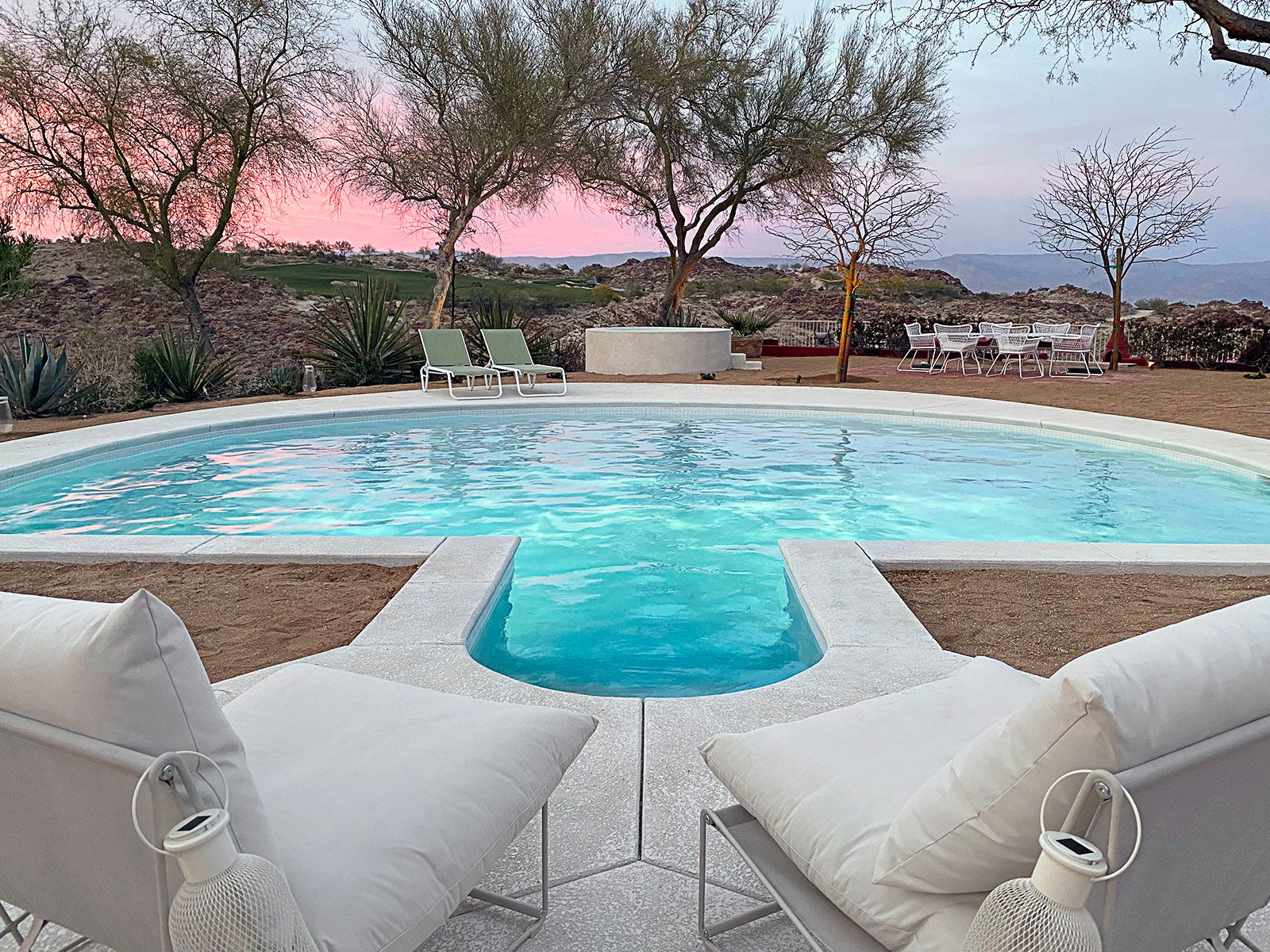 Nestled in the desert, this home doesn't have any neighbours except the cacti and mountains. Two Spanish-style villas make up the property, with a beautiful, turquoise swimming pool tucked in between them. Wander to the bottom of the garden and you'll find a white stone hot tub and sun lounger platform where you can relax and drink in the panoramic mountain views. Hikes through the epic wilderness are easy from here, and your host can organise a massage or yoga class for when you return. Dining can take place indoors or outdoors – you might like to hire a private chef to create a delicious and nutritious meal as you watch the sunset with a cool drink. With no light pollution, the stargazing here is fantastic, but if you'd like a change from the quiet of the desert then the sights and sounds of Palm Springs are just a 10 minute drive away.