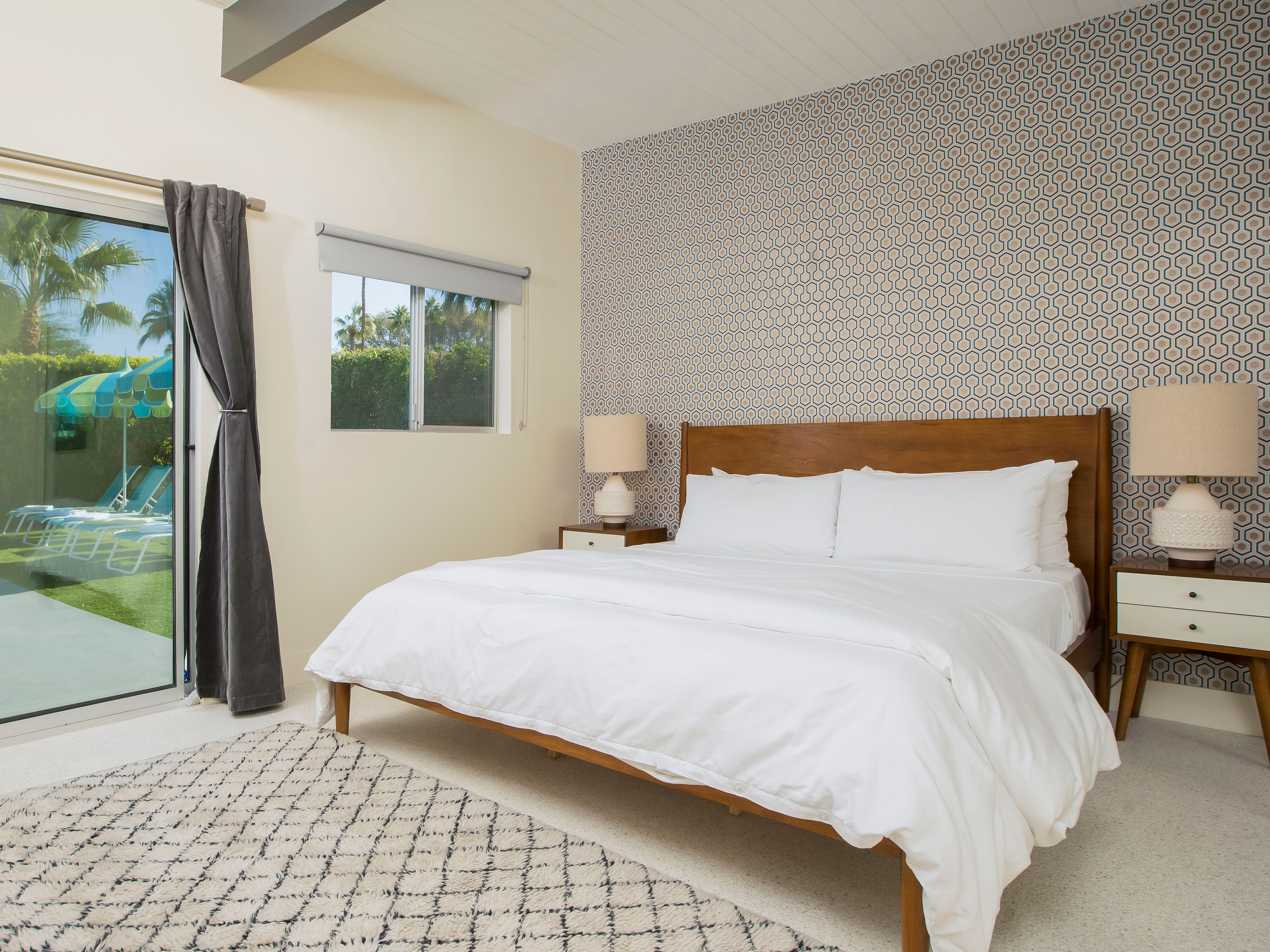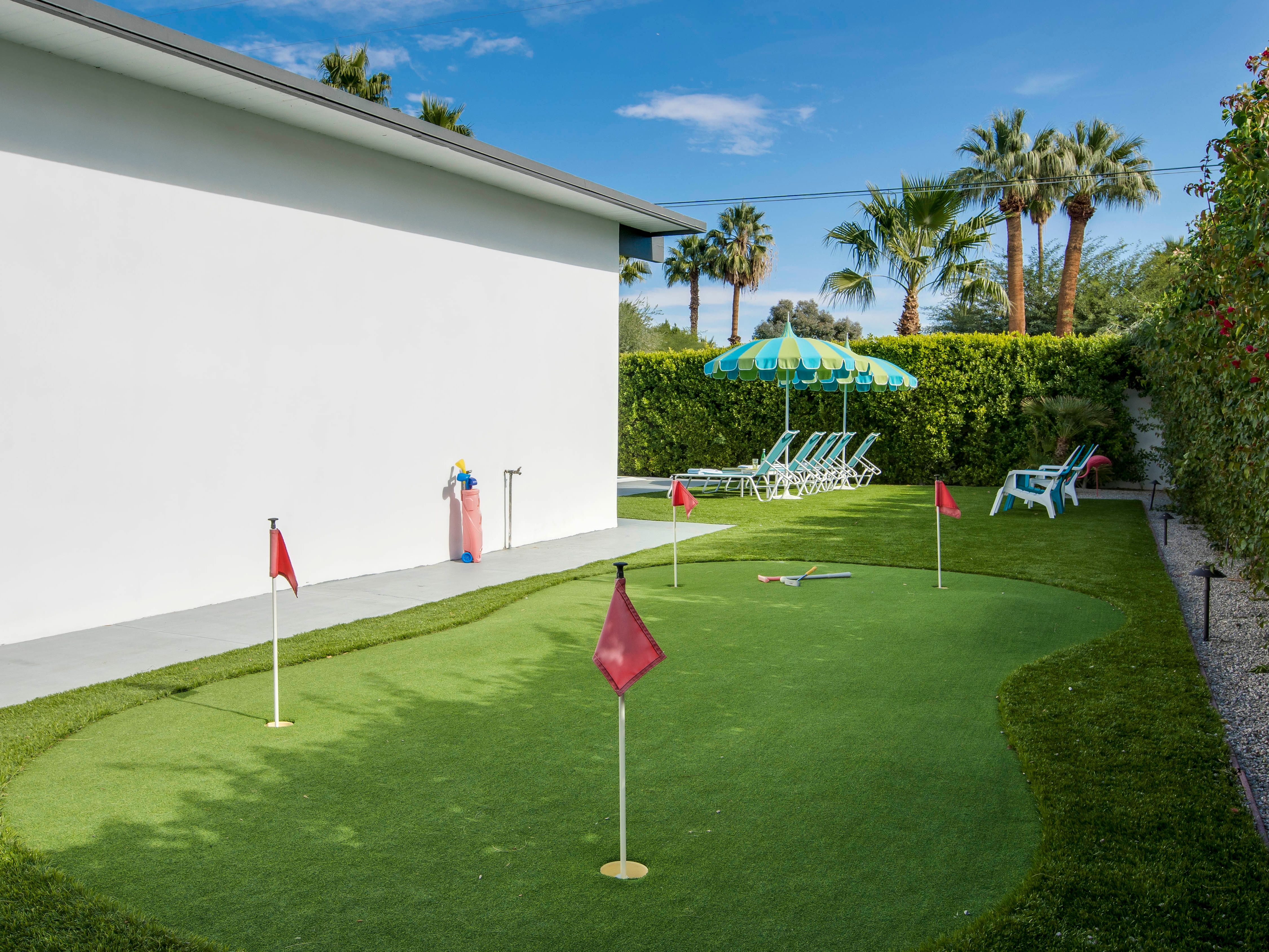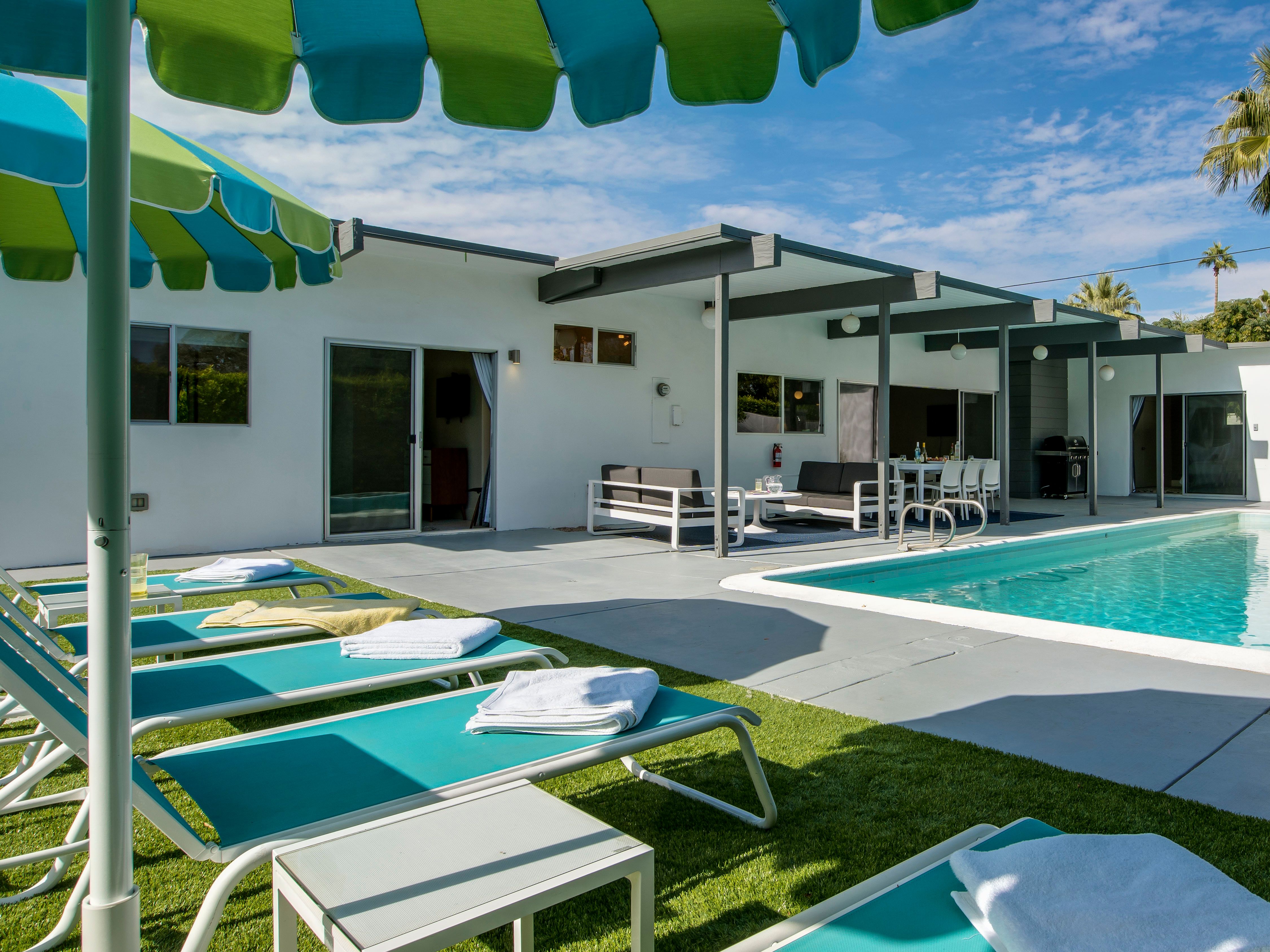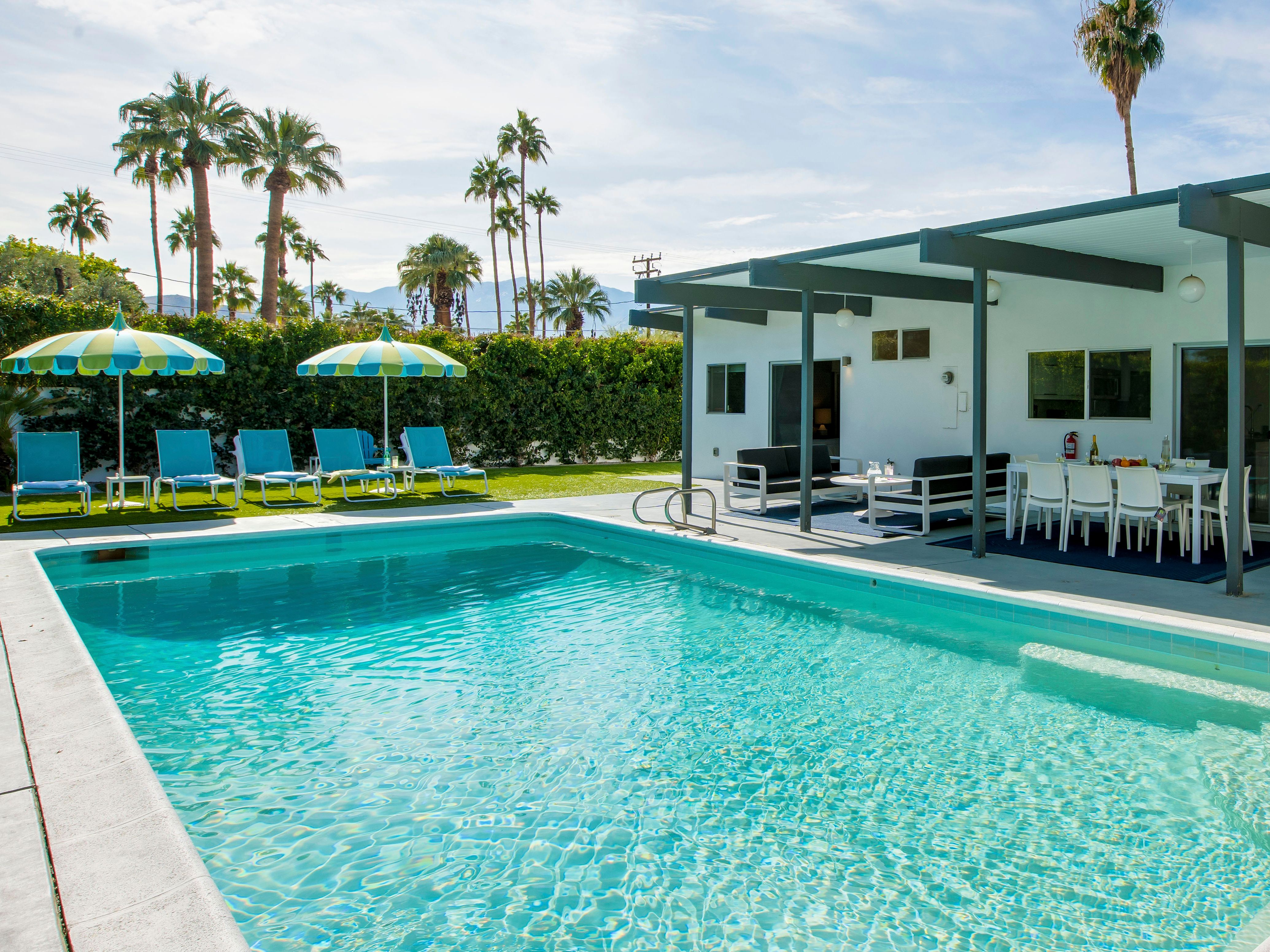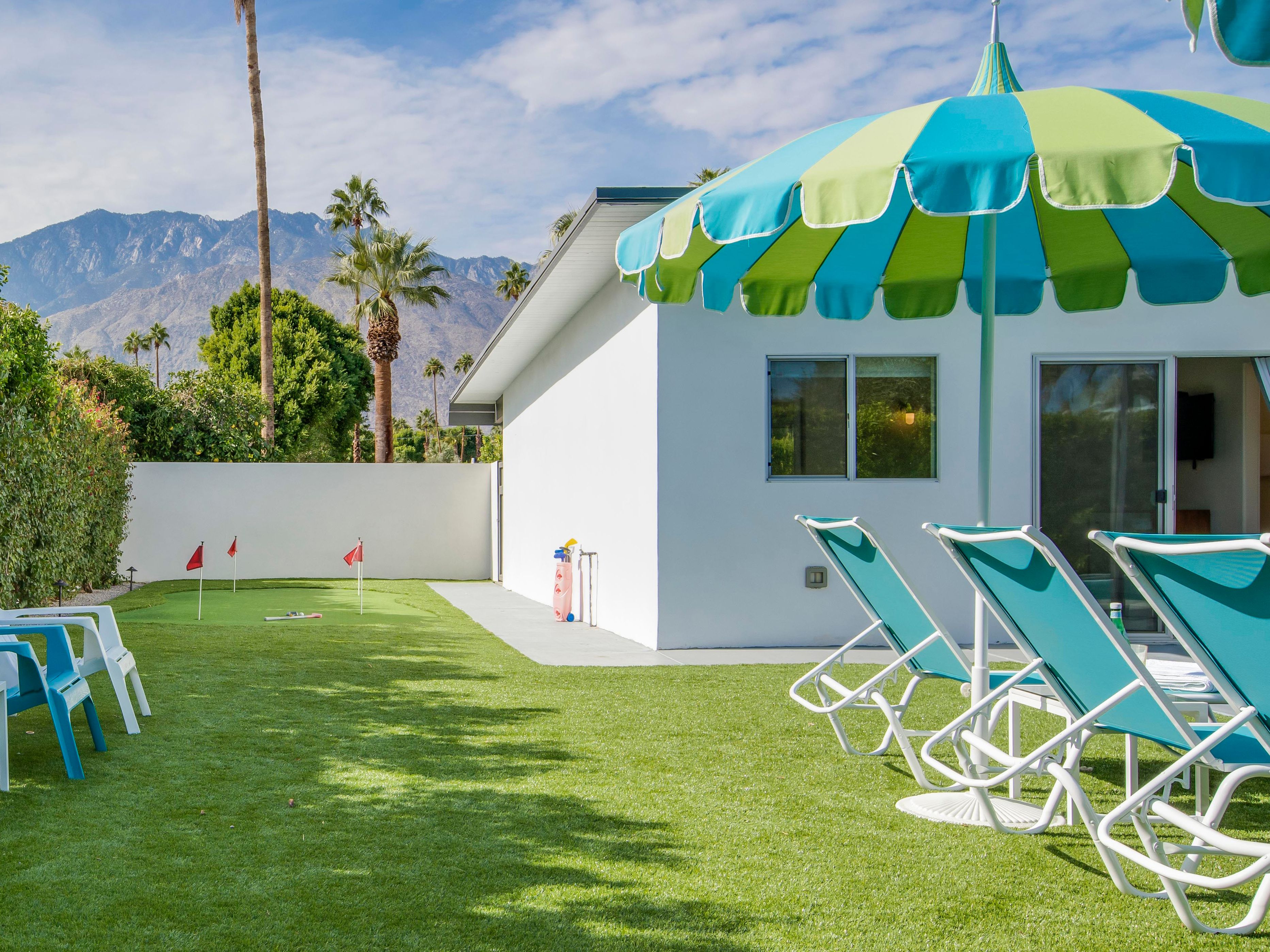 White, grey and gold geometric patterns create a decidedly mid-century motif with a bit of modern flare in this Little Beverly Hills villa. The lime and turquoise parasols over the pool loungers whisper of the 1950s, and tropical fern feature walls are straight from the days of Hollywood starlets holidaying in the sun. The open living area is super spacious, and sliding open the glass doors blends indoors and outdoors, so you can slip from the poolside to the ultra-modern kitchen seamlessly. There’s an additional snuggly living room for a bit of quiet downtime, a games room in the garage, and even a putting green if you want to practice your stroke before taking it to the world-class courses of Palm Desert, just a short drive away. Each of the bedrooms has its own access to the pool area with glass sliding doors letting that Palm Springs sunshine stream in, and you can slide straight from your bed to the shaded dining table to greet the day with a cup of joe by the palms.