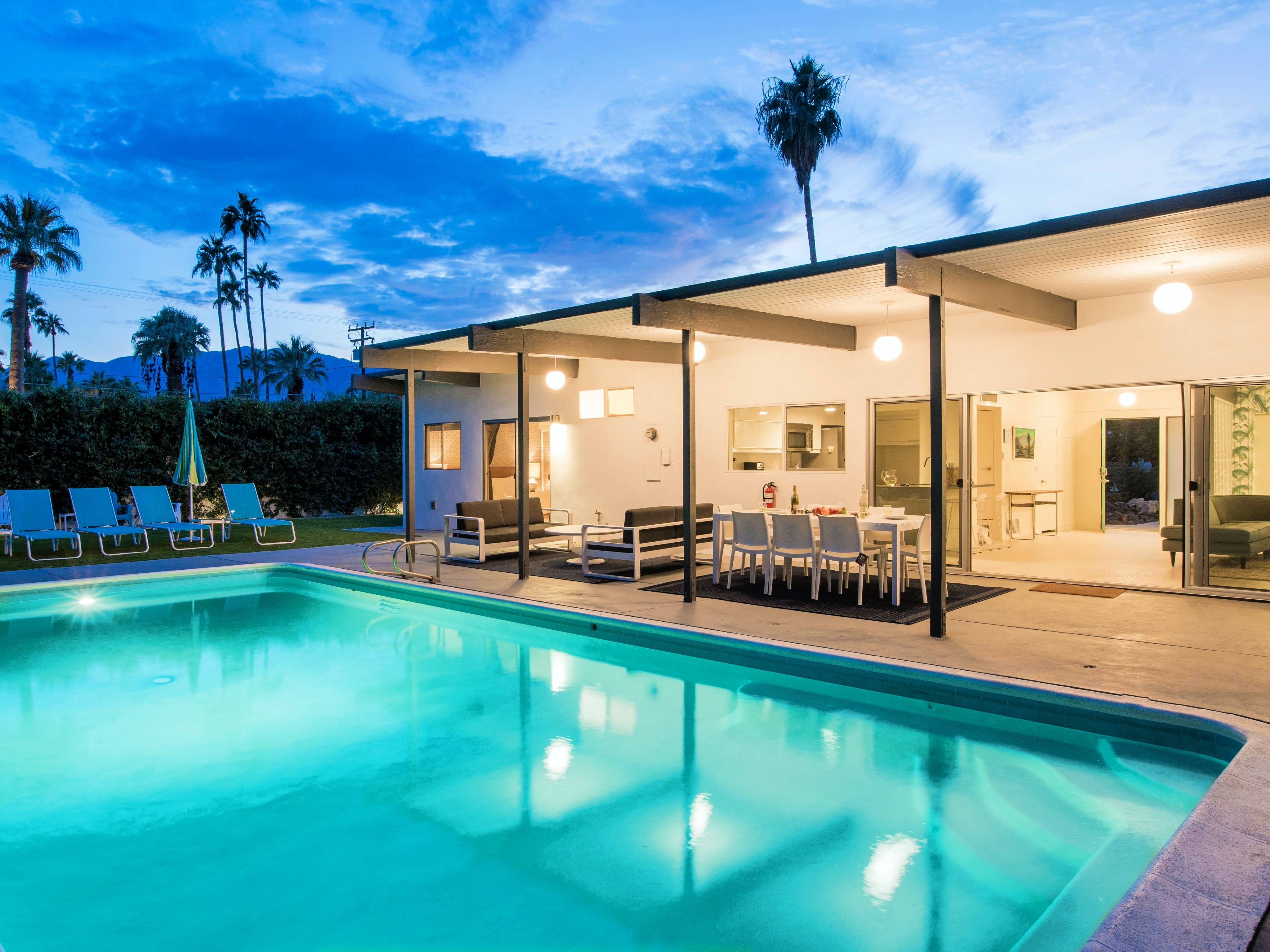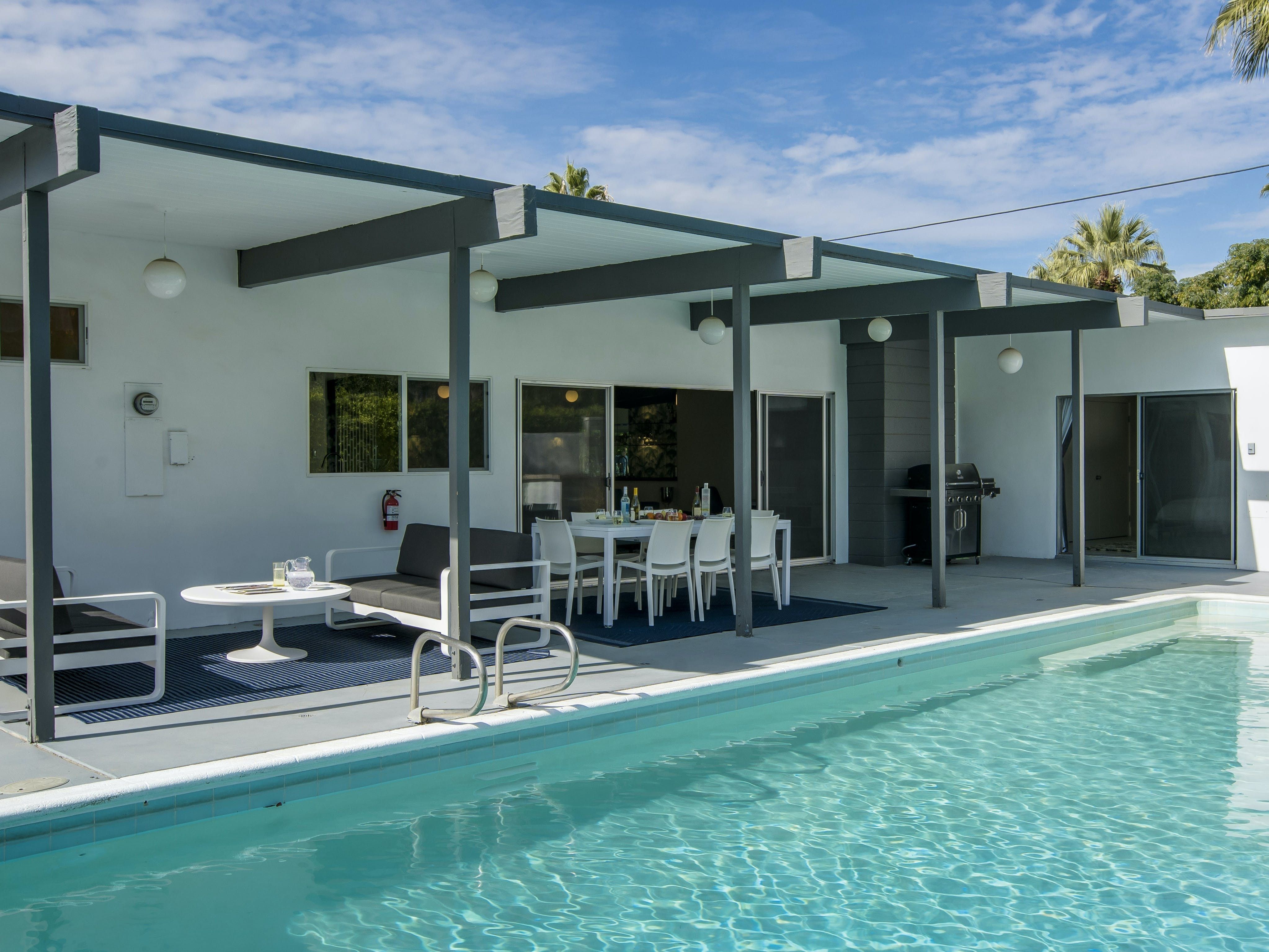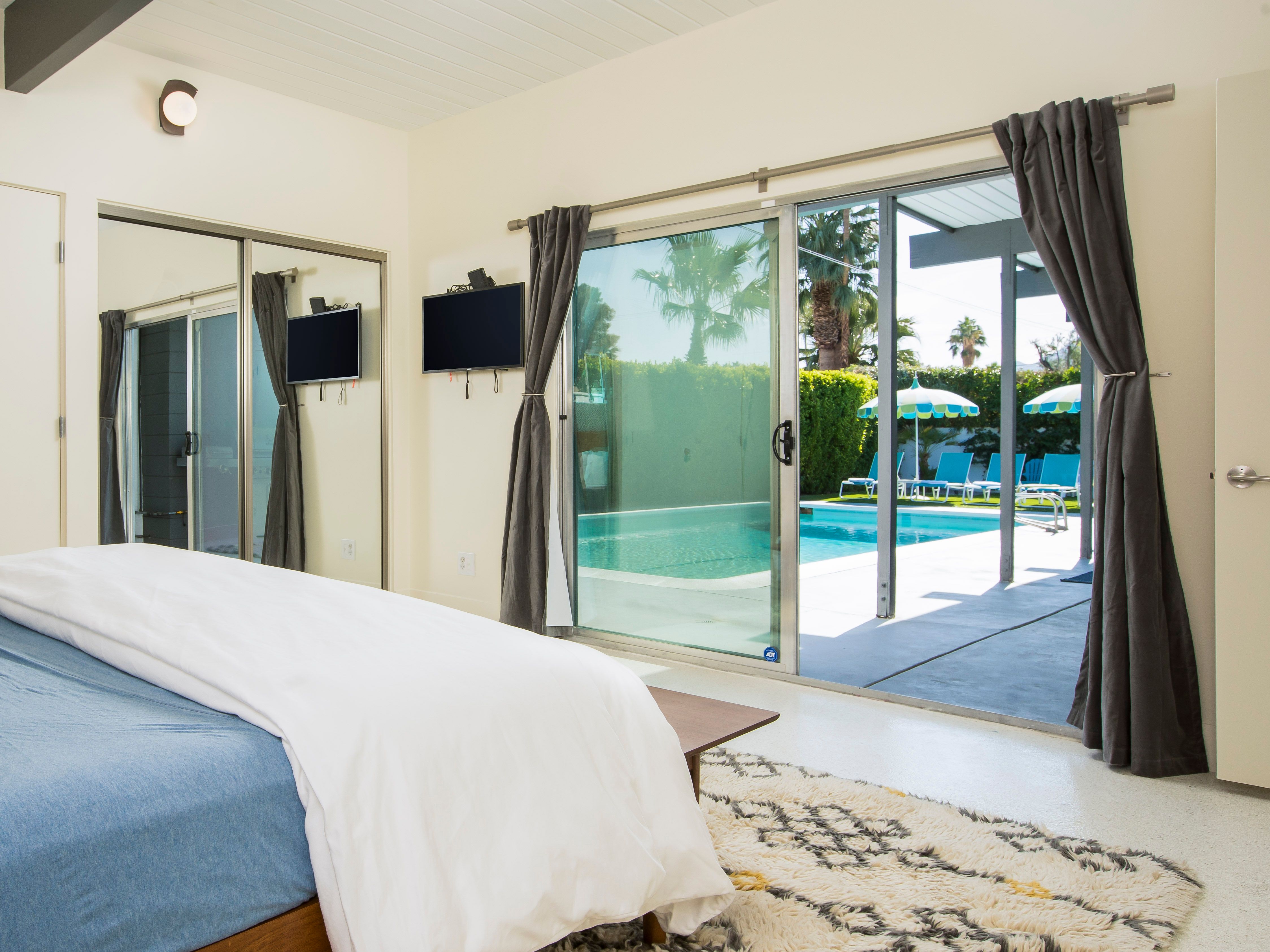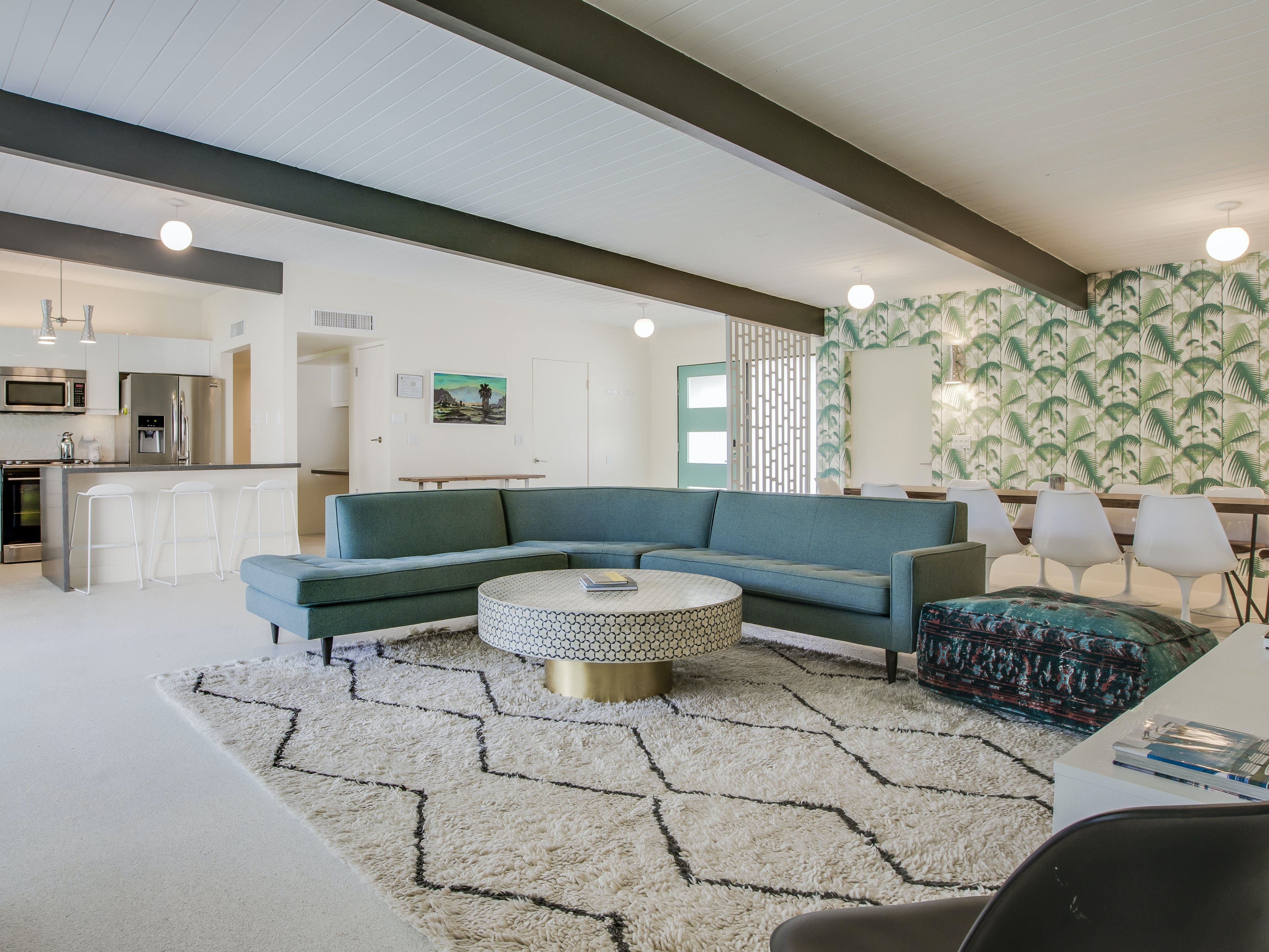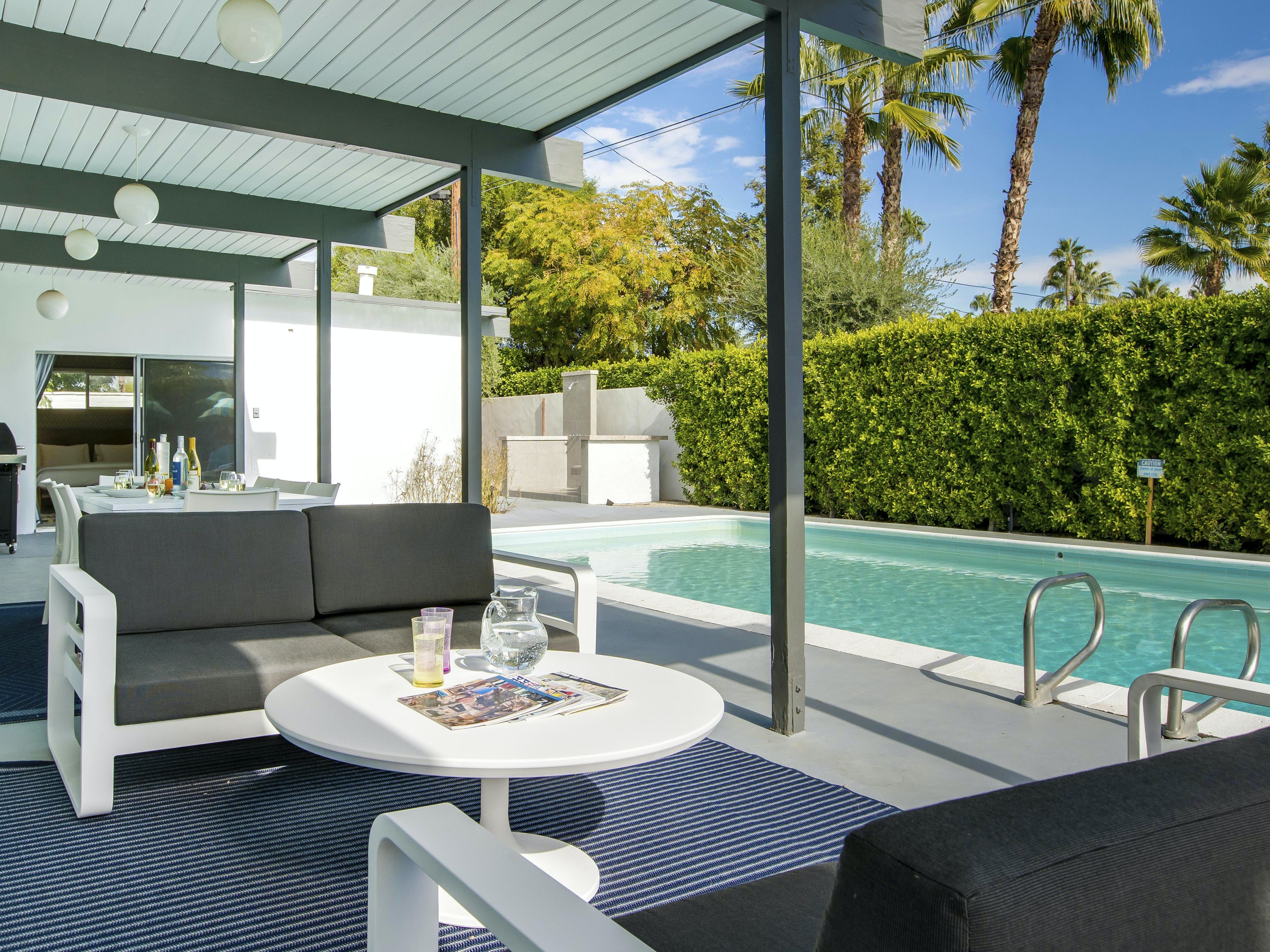 White, grey and gold geometric patterns create a decidedly mid-century motif with a bit of modern flare in this Little Beverly Hills villa. The lime and turquoise parasols over the pool loungers whisper of the 1950s, and tropical fern feature walls are straight from the days of Hollywood starlets holidaying in the sun. The open living area is super spacious, and sliding open the glass doors blends indoors and outdoors, so you can slip from the poolside to the ultra-modern kitchen seamlessly. There’s an additional snuggly living room for a bit of quiet downtime, a games room in the garage, and even a putting green if you want to practice your stroke before taking it to the world-class courses of Palm Desert, just a short drive away. Each of the bedrooms has its own access to the pool area with glass sliding doors letting that Palm Springs sunshine stream in, and you can slide straight from your bed to the shaded dining table to greet the day with a cup of joe by the palms.