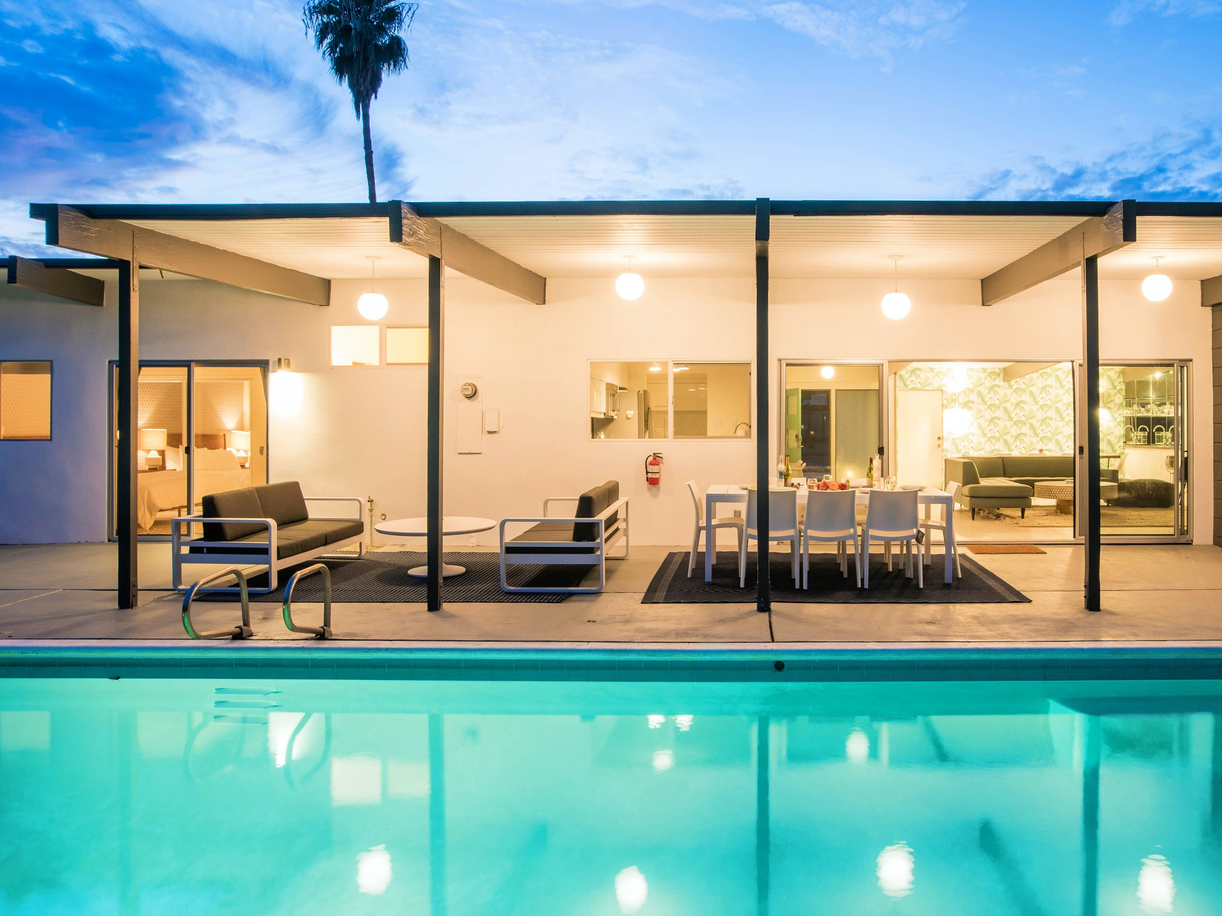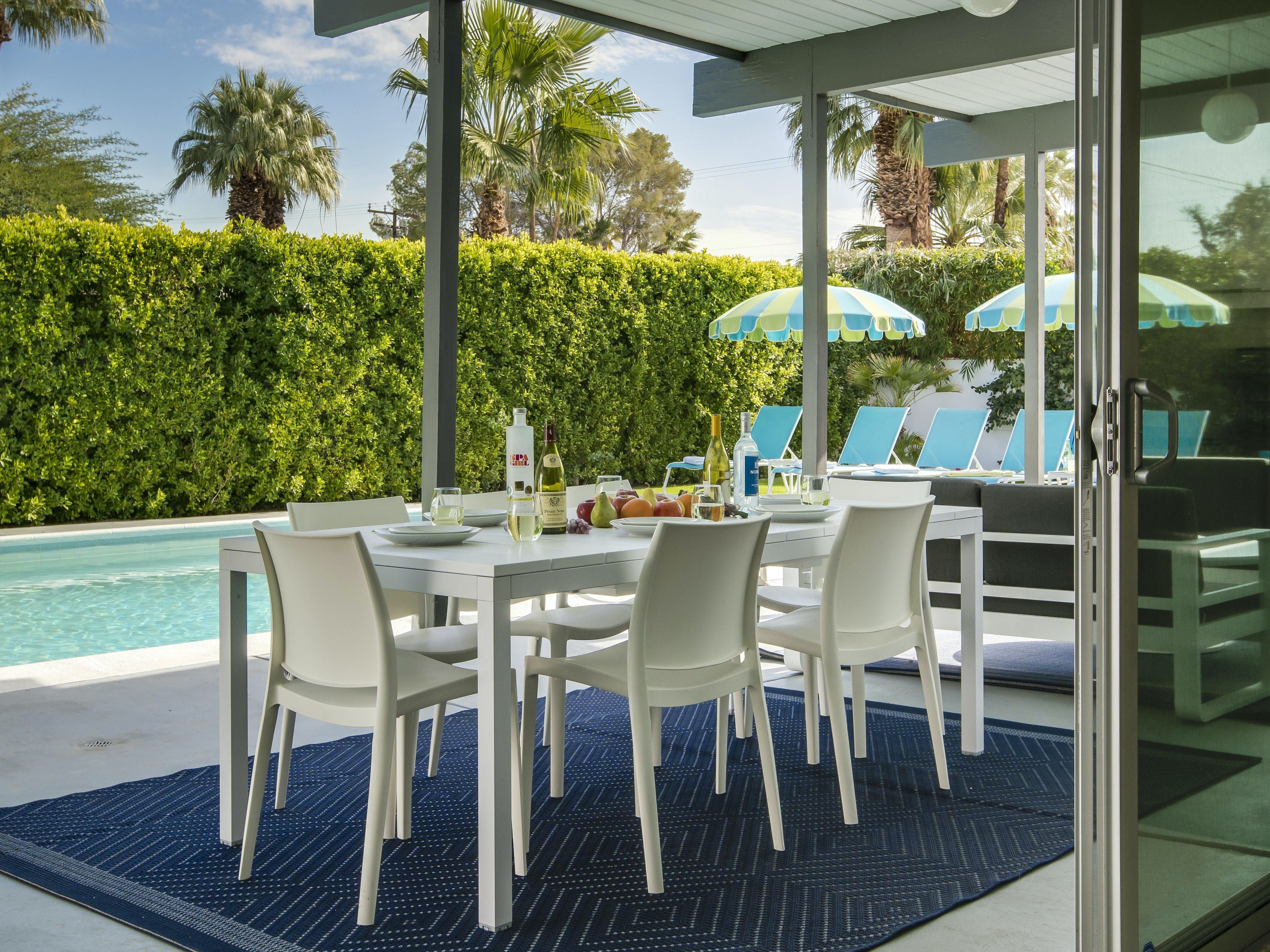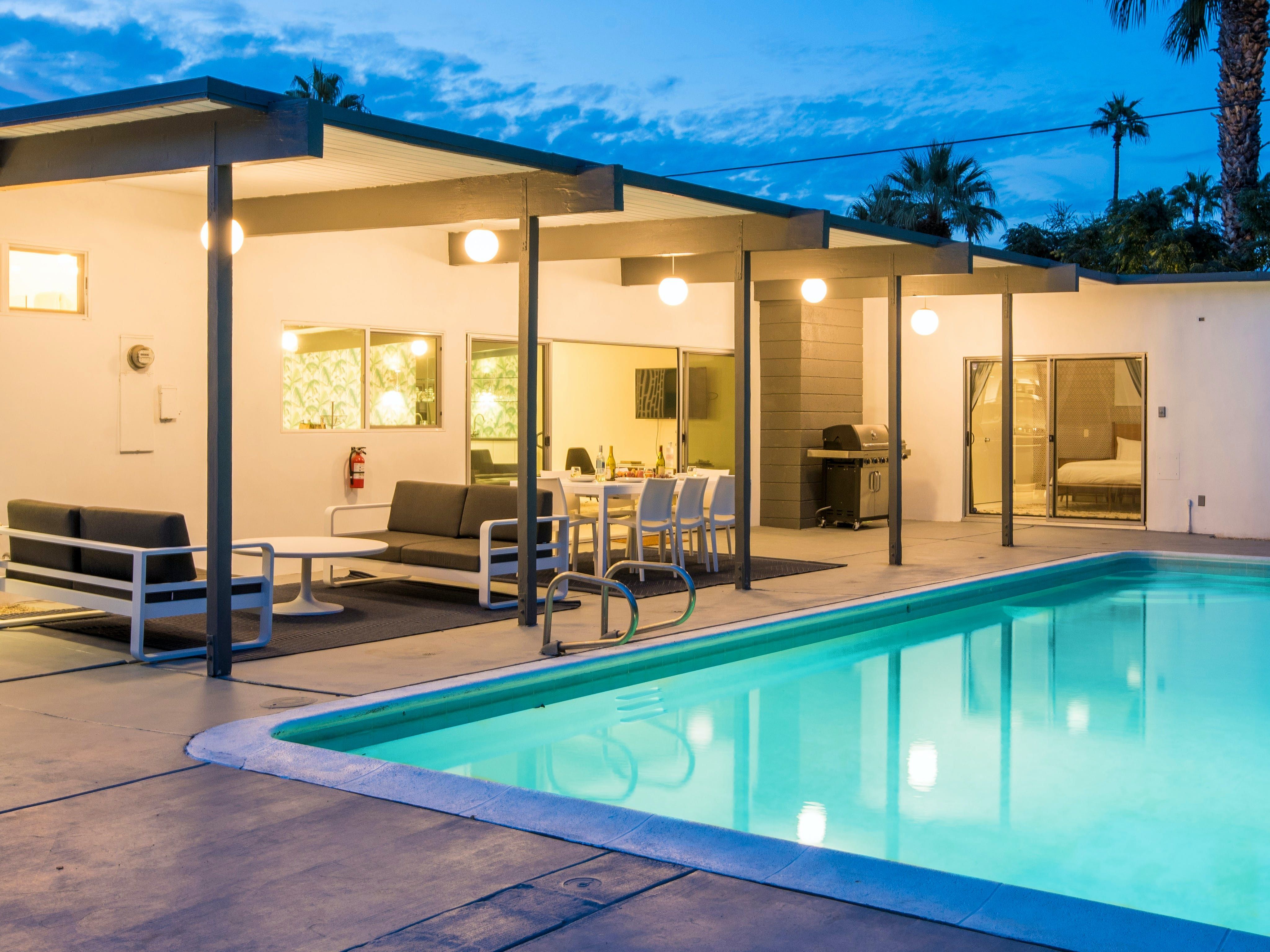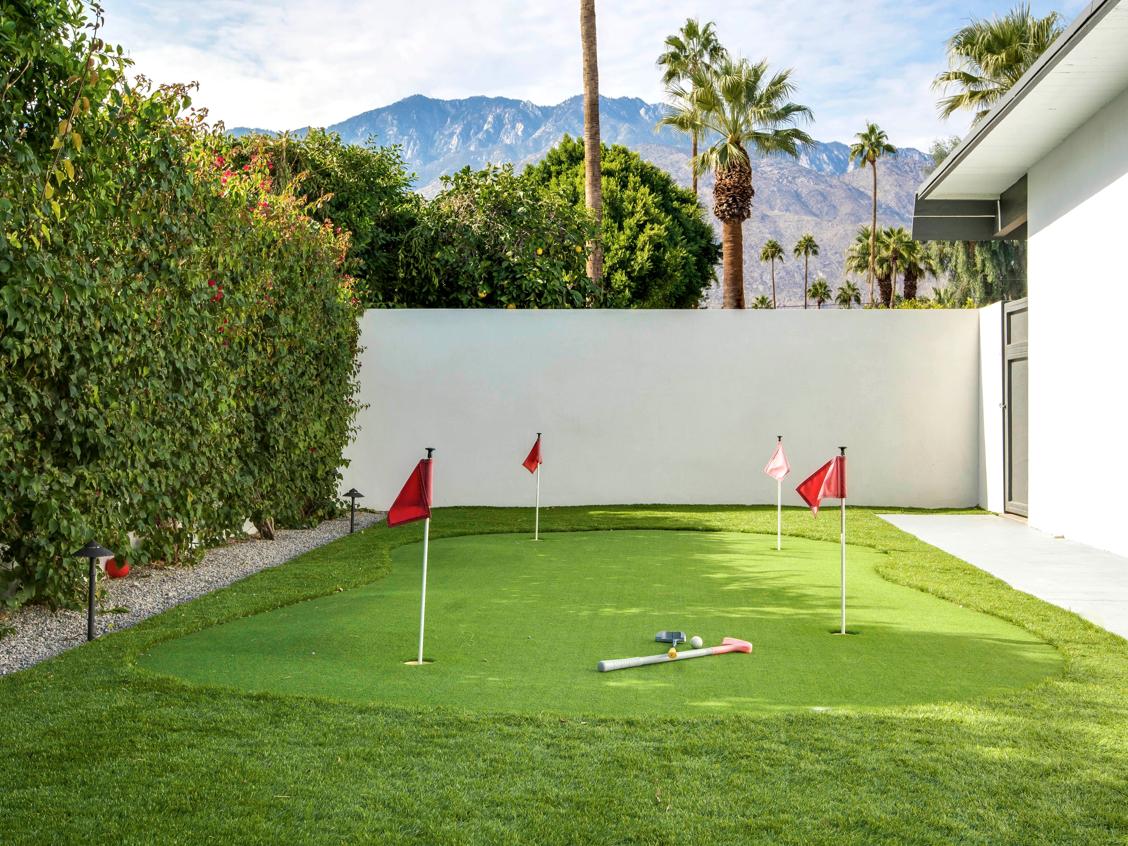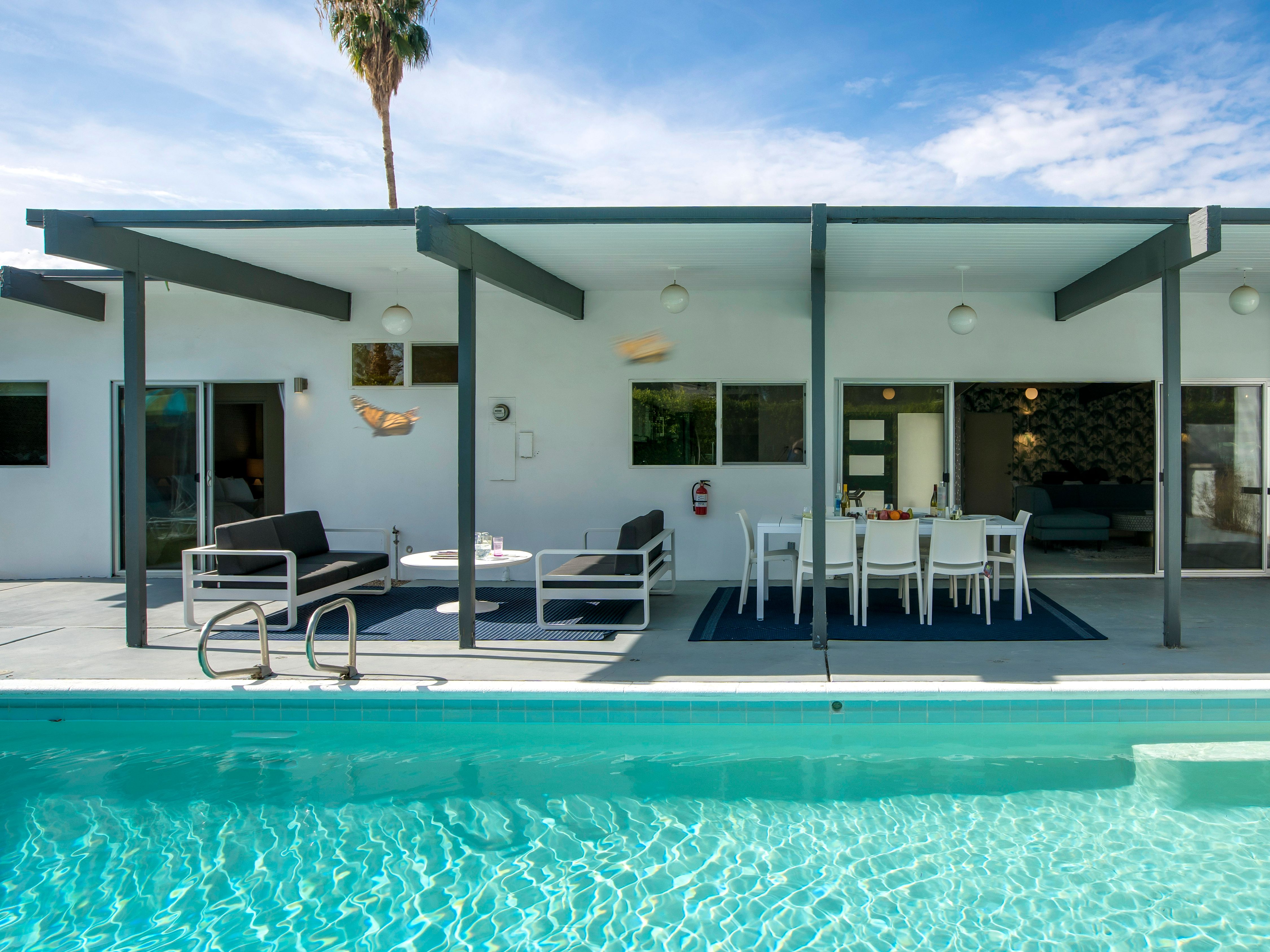 White, grey and gold geometric patterns create a decidedly mid-century motif with a bit of modern flare in this Little Beverly Hills villa. The lime and turquoise parasols over the pool loungers whisper of the 1950s, and tropical fern feature walls are straight from the days of Hollywood starlets holidaying in the sun. The open living area is super spacious, and sliding open the glass doors blends indoors and outdoors, so you can slip from the poolside to the ultra-modern kitchen seamlessly. There’s an additional snuggly living room for a bit of quiet downtime, a games room in the garage, and even a putting green if you want to practice your stroke before taking it to the world-class courses of Palm Desert, just a short drive away. Each of the bedrooms has its own access to the pool area with glass sliding doors letting that Palm Springs sunshine stream in, and you can slide straight from your bed to the shaded dining table to greet the day with a cup of joe by the palms.