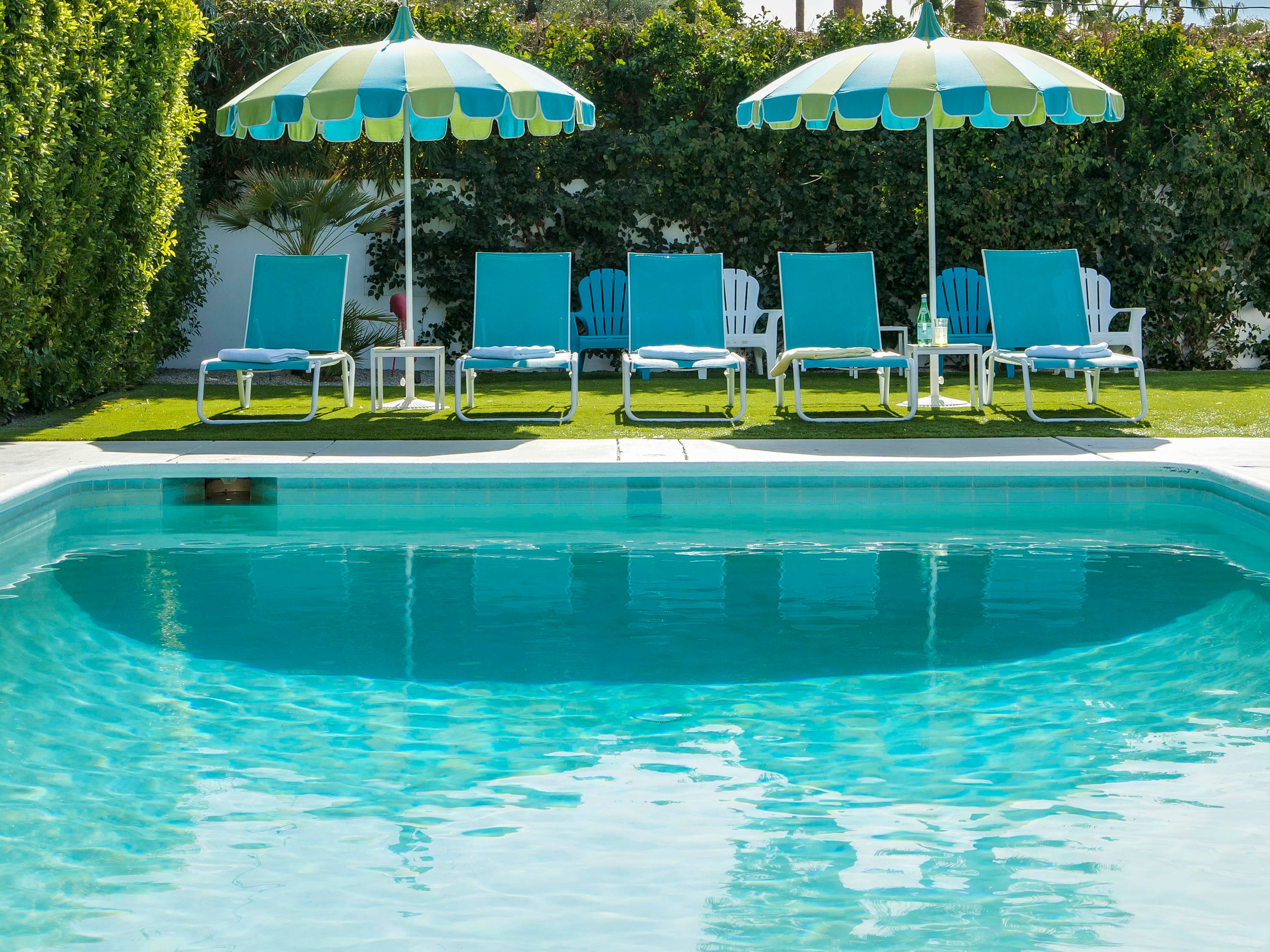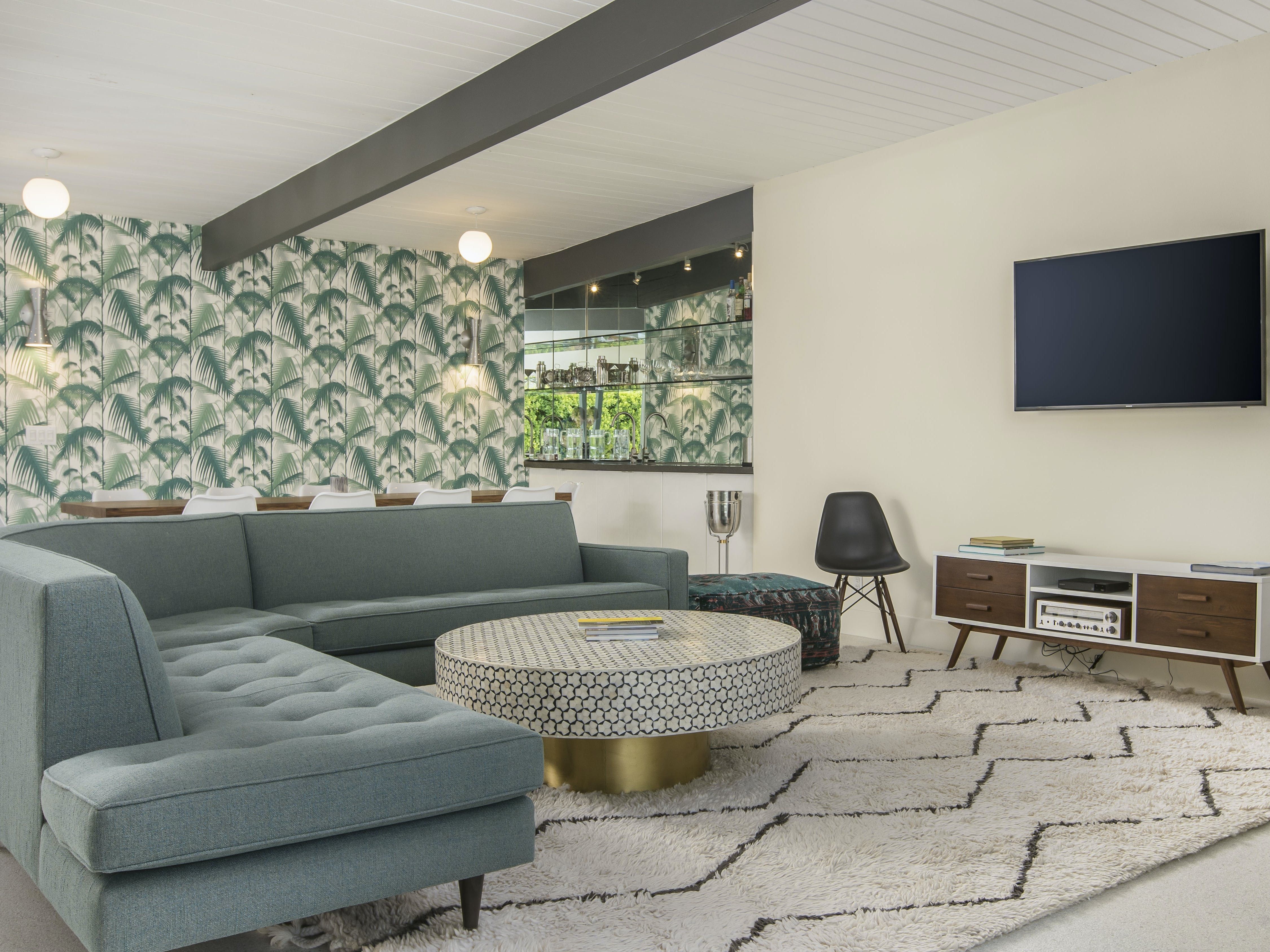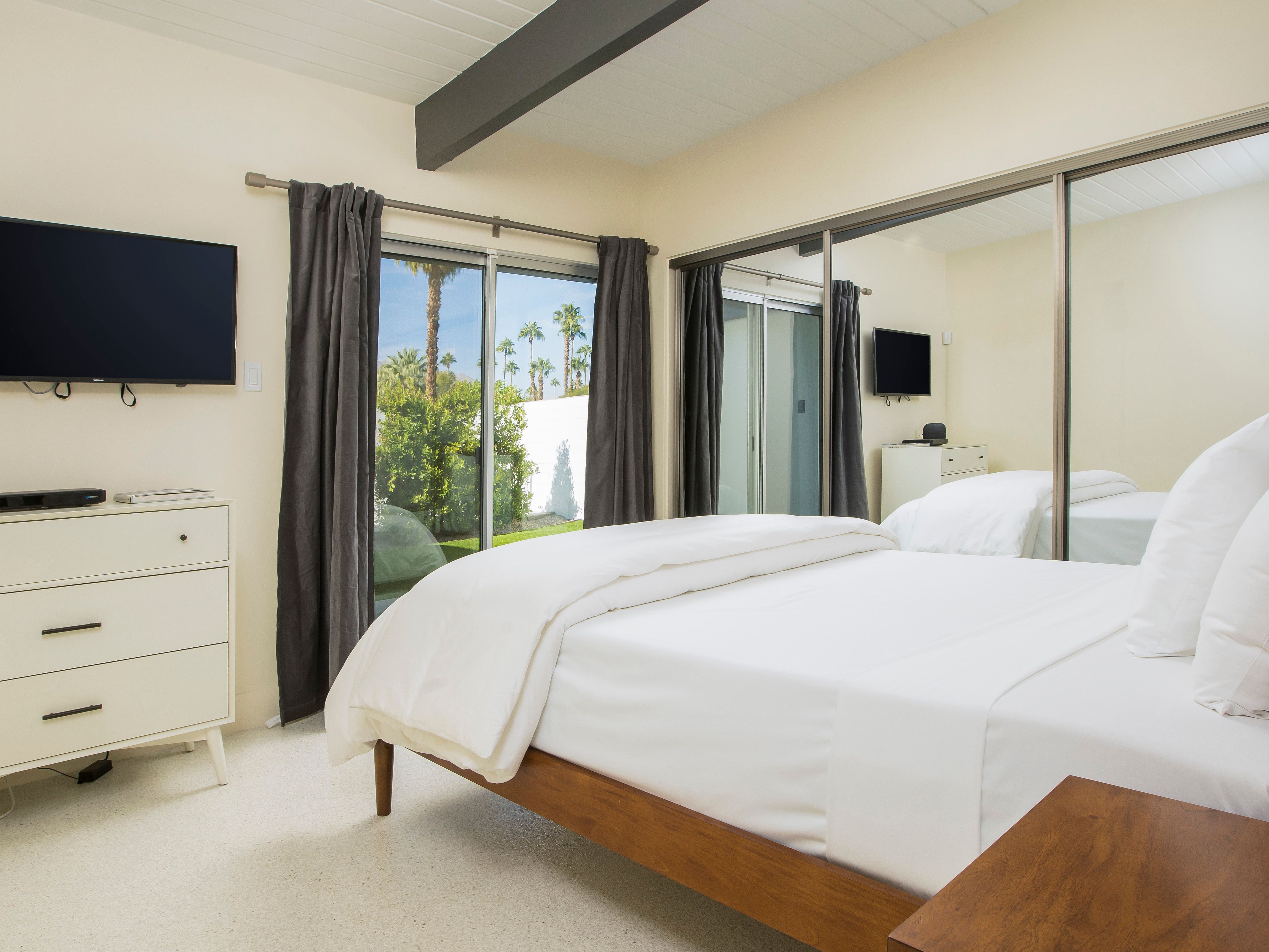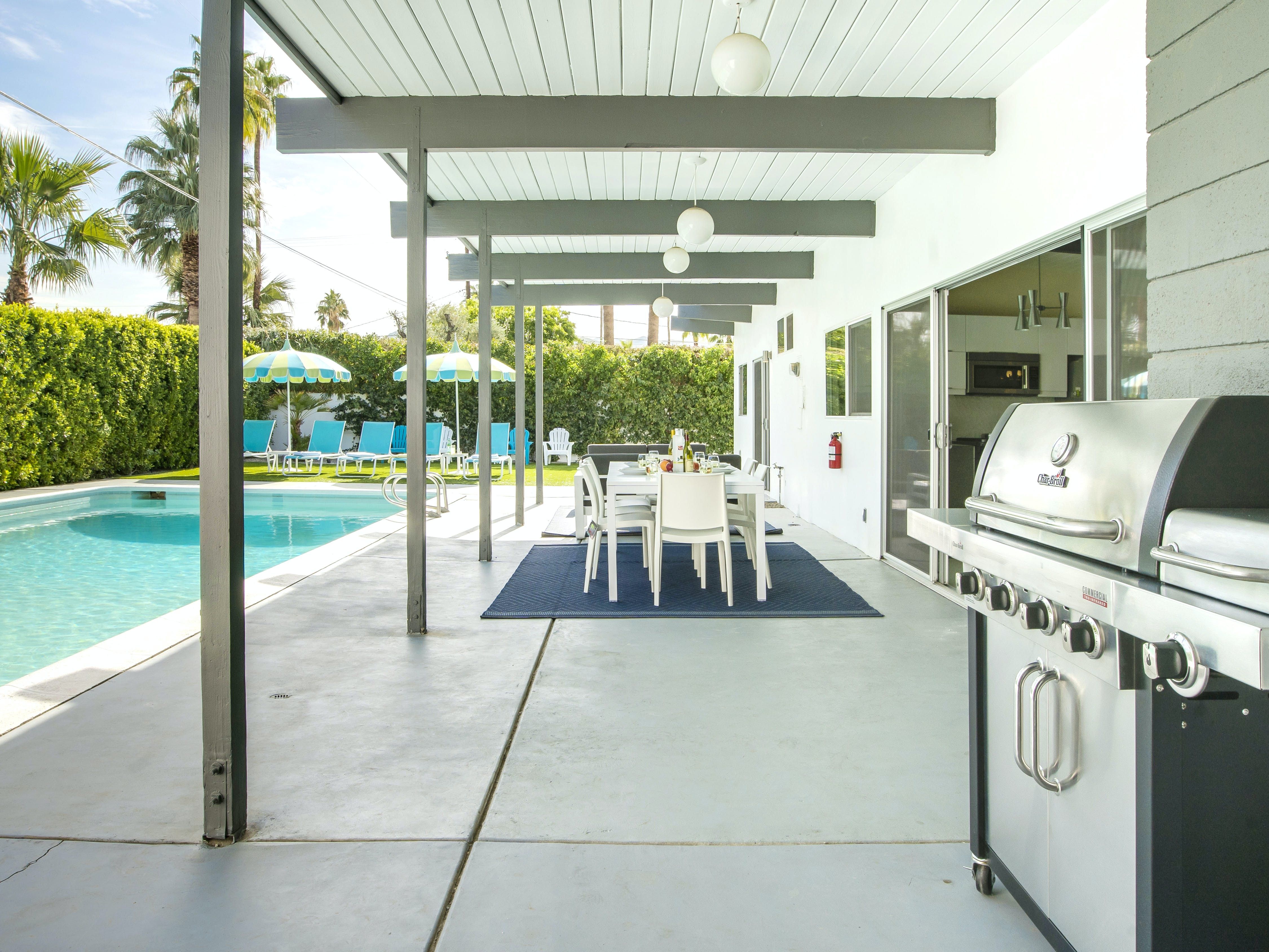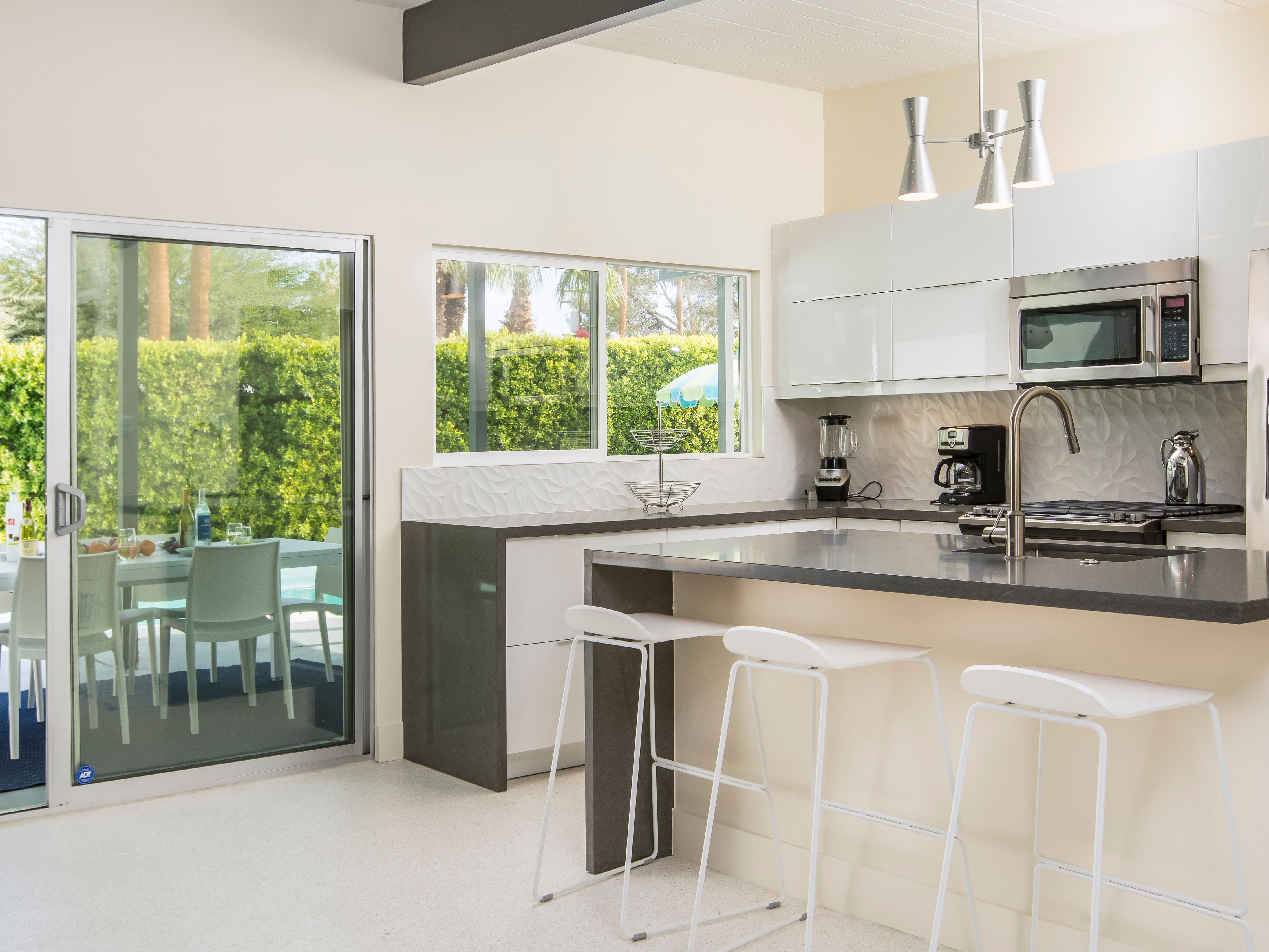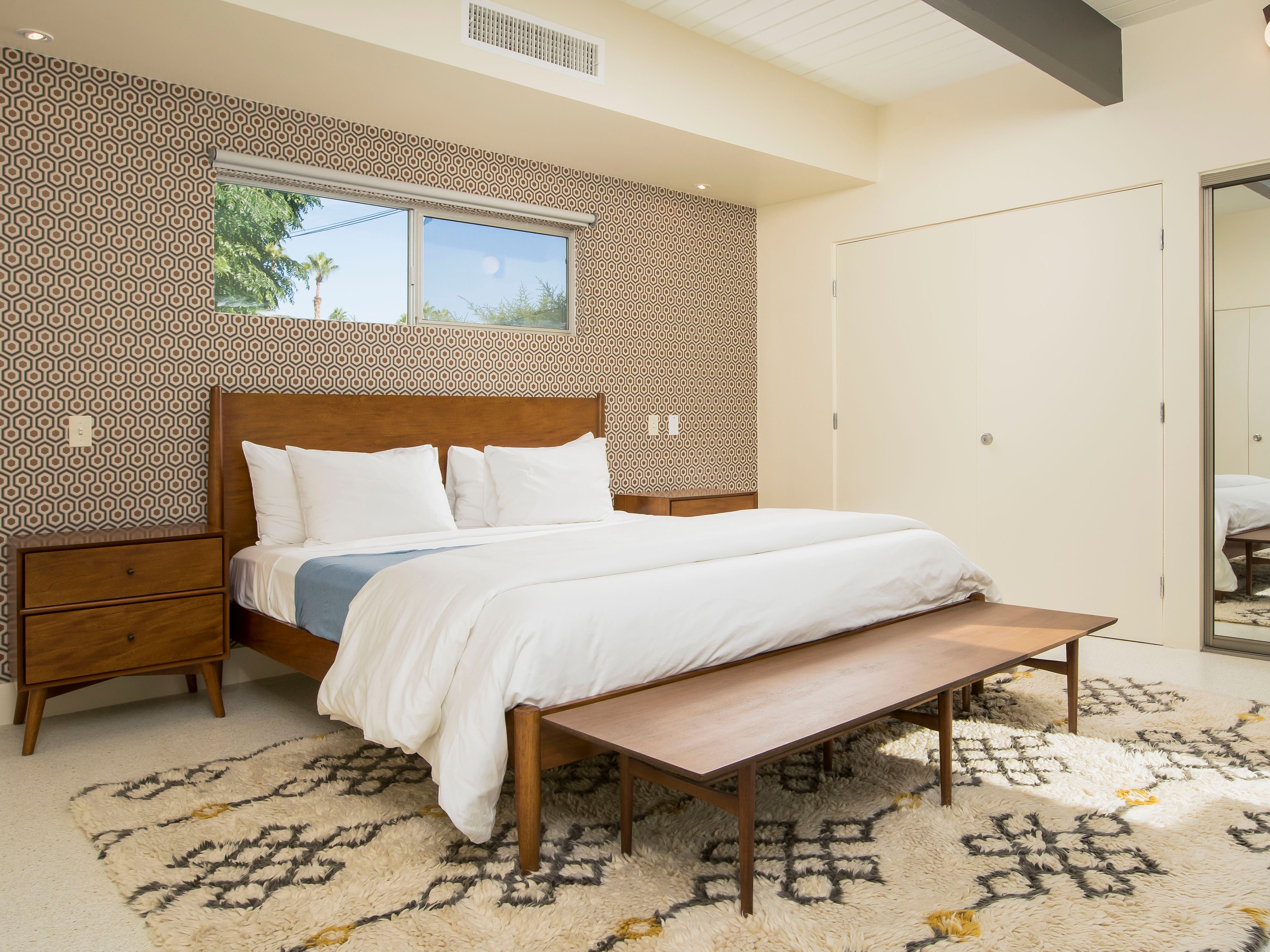 White, grey and gold geometric patterns create a decidedly mid-century motif with a bit of modern flare in this Little Beverly Hills villa. The lime and turquoise parasols over the pool loungers whisper of the 1950s, and tropical fern feature walls are straight from the days of Hollywood starlets holidaying in the sun. The open living area is super spacious, and sliding open the glass doors blends indoors and outdoors, so you can slip from the poolside to the ultra-modern kitchen seamlessly. There’s an additional snuggly living room for a bit of quiet downtime, a games room in the garage, and even a putting green if you want to practice your stroke before taking it to the world-class courses of Palm Desert, just a short drive away. Each of the bedrooms has its own access to the pool area with glass sliding doors letting that Palm Springs sunshine stream in, and you can slide straight from your bed to the shaded dining table to greet the day with a cup of joe by the palms.