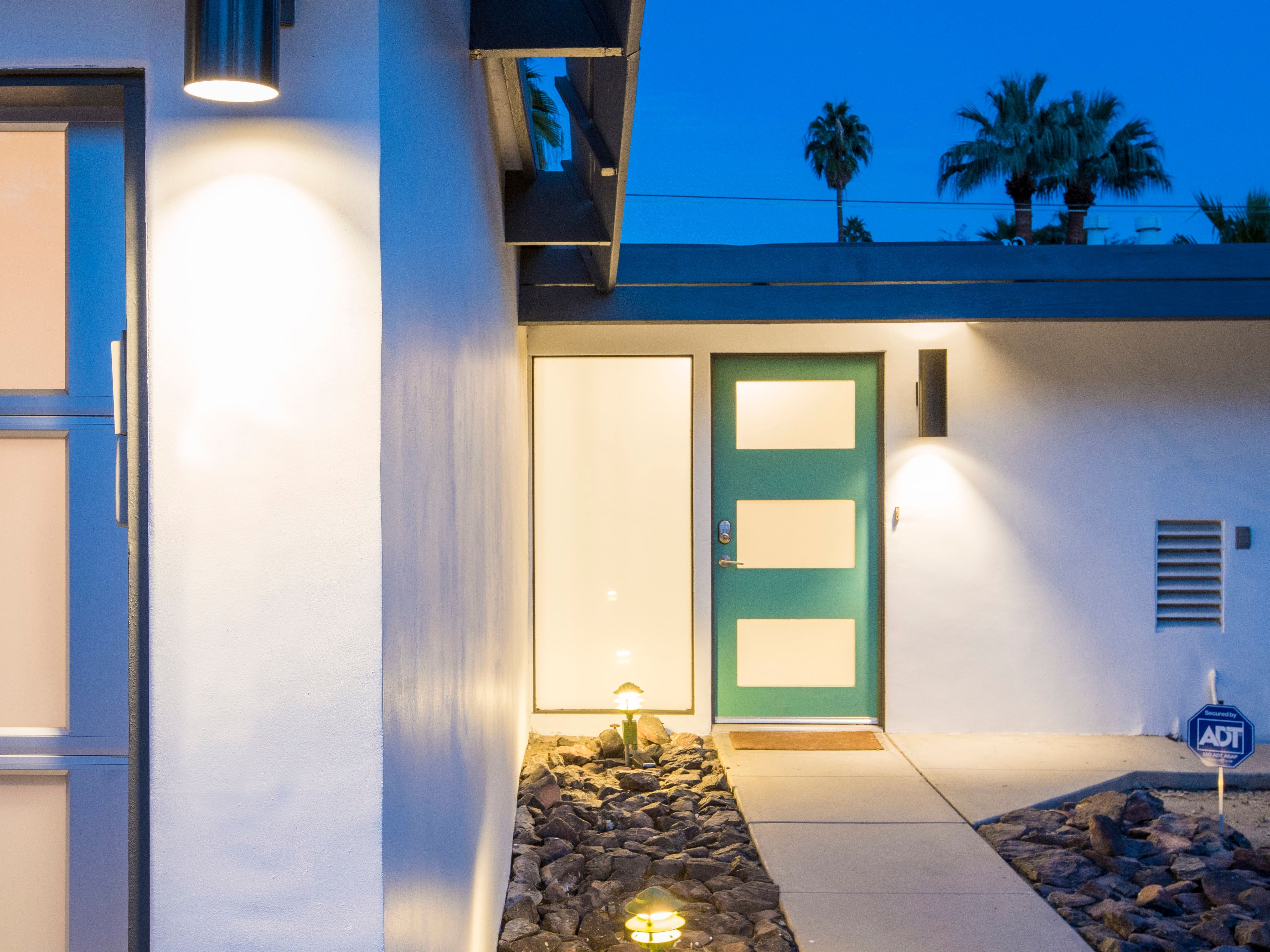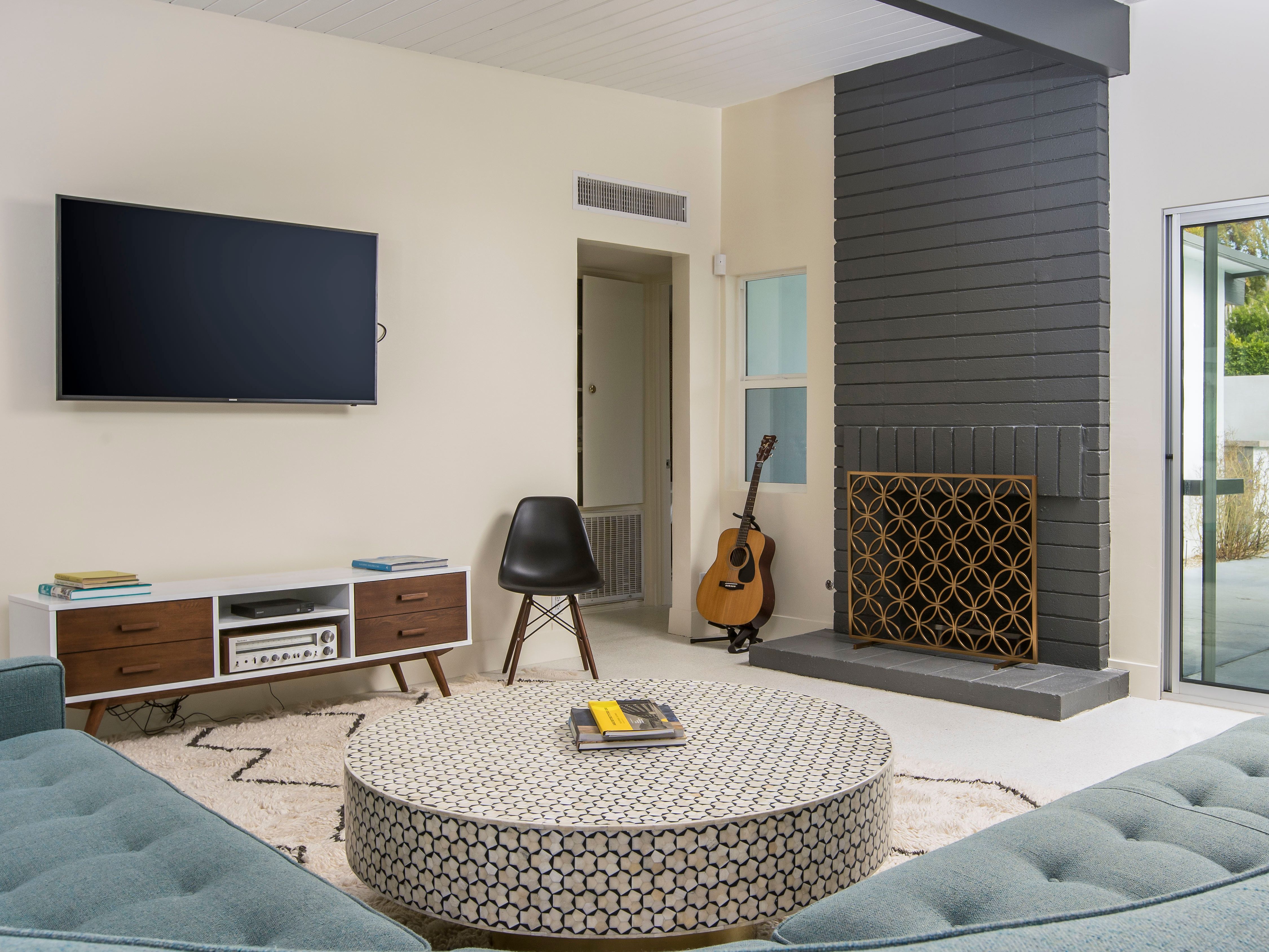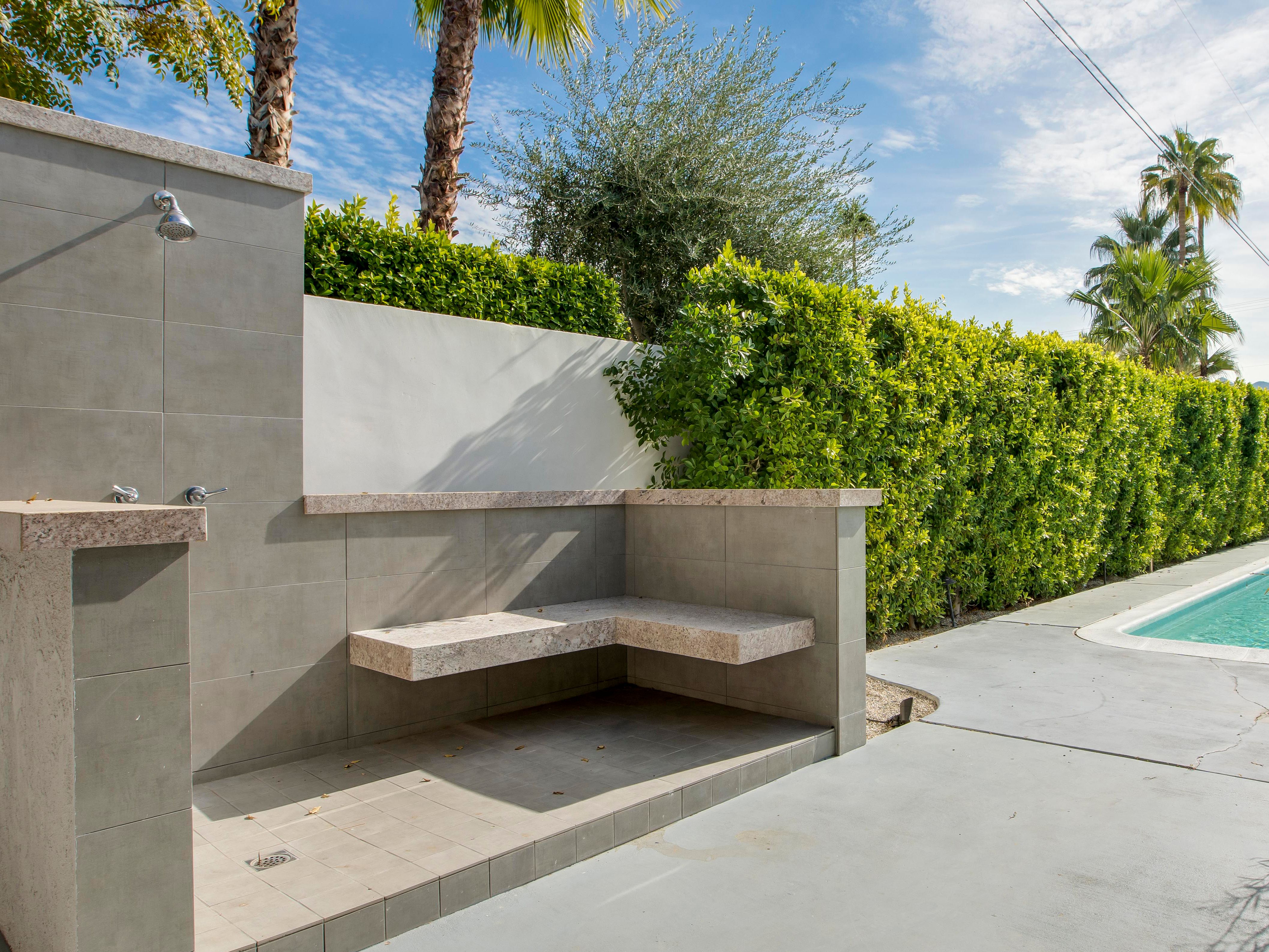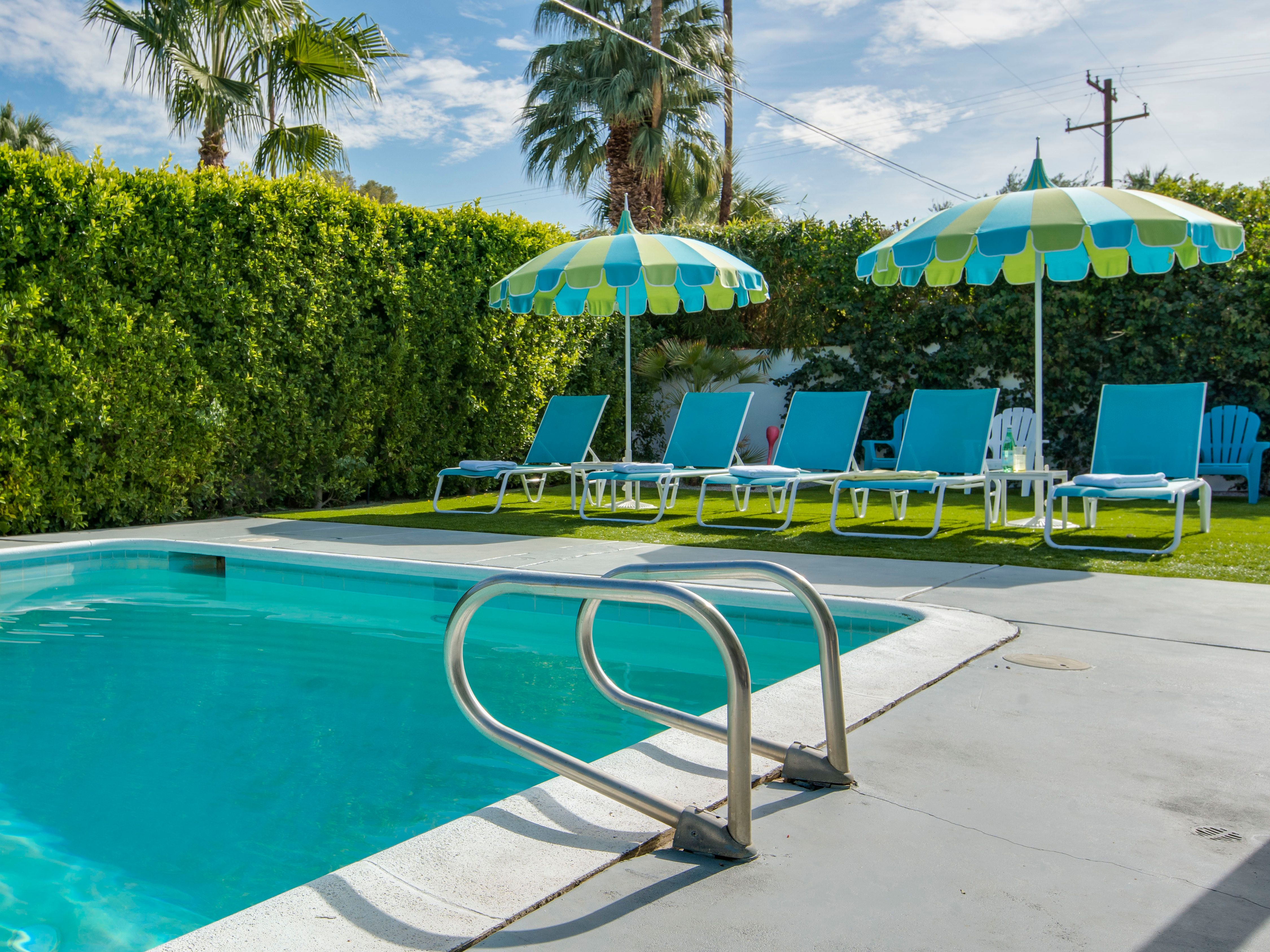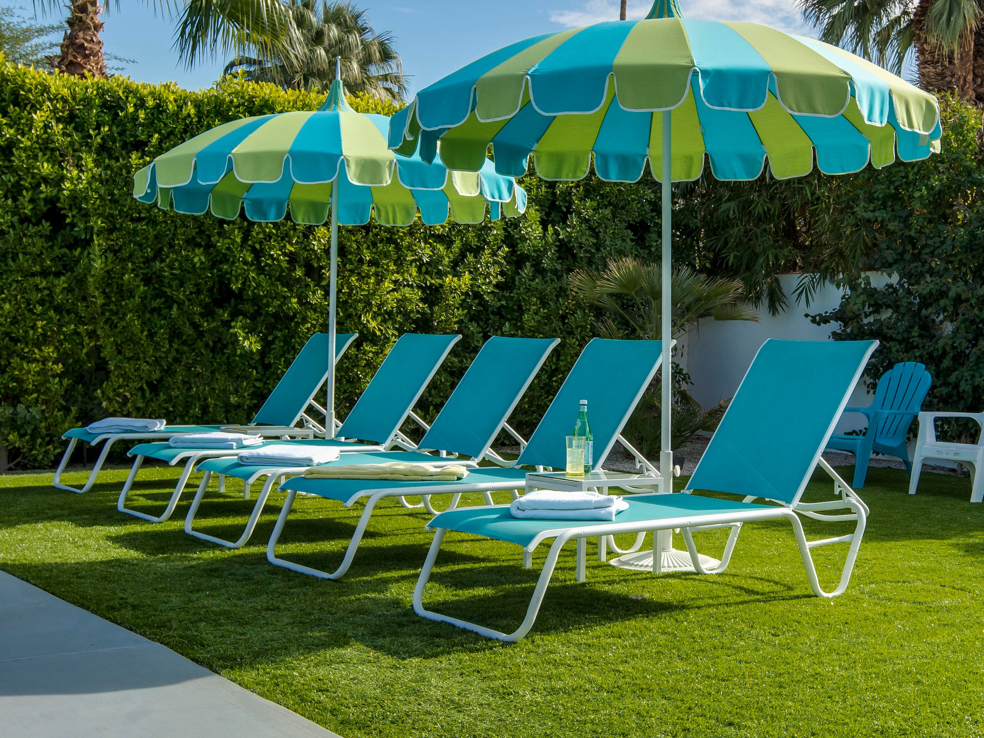 White, grey and gold geometric patterns create a decidedly mid-century motif with a bit of modern flare in this Little Beverly Hills villa. The lime and turquoise parasols over the pool loungers whisper of the 1950s, and tropical fern feature walls are straight from the days of Hollywood starlets holidaying in the sun. The open living area is super spacious, and sliding open the glass doors blends indoors and outdoors, so you can slip from the poolside to the ultra-modern kitchen seamlessly. There’s an additional snuggly living room for a bit of quiet downtime, a games room in the garage, and even a putting green if you want to practice your stroke before taking it to the world-class courses of Palm Desert, just a short drive away. Each of the bedrooms has its own access to the pool area with glass sliding doors letting that Palm Springs sunshine stream in, and you can slide straight from your bed to the shaded dining table to greet the day with a cup of joe by the palms.