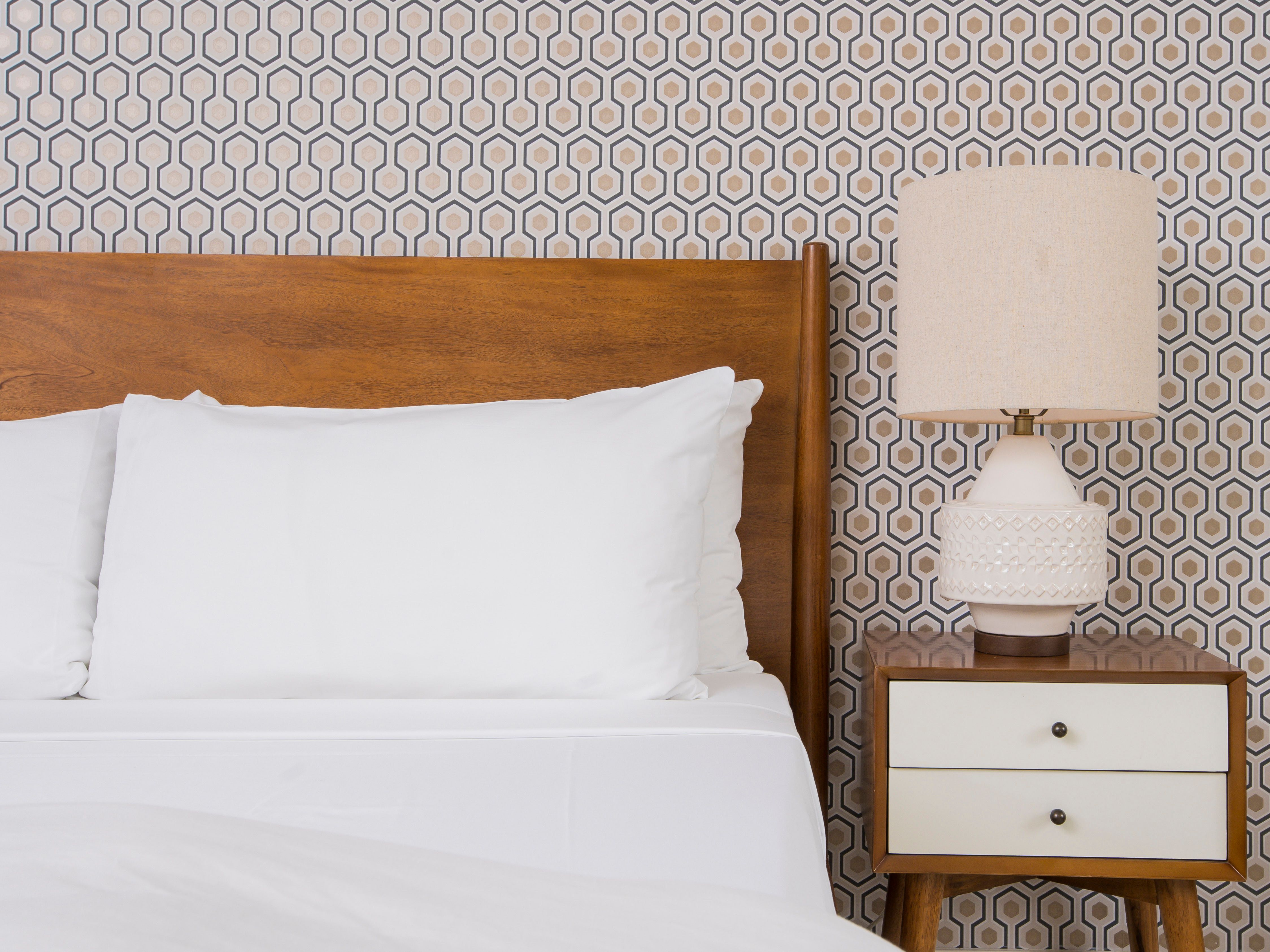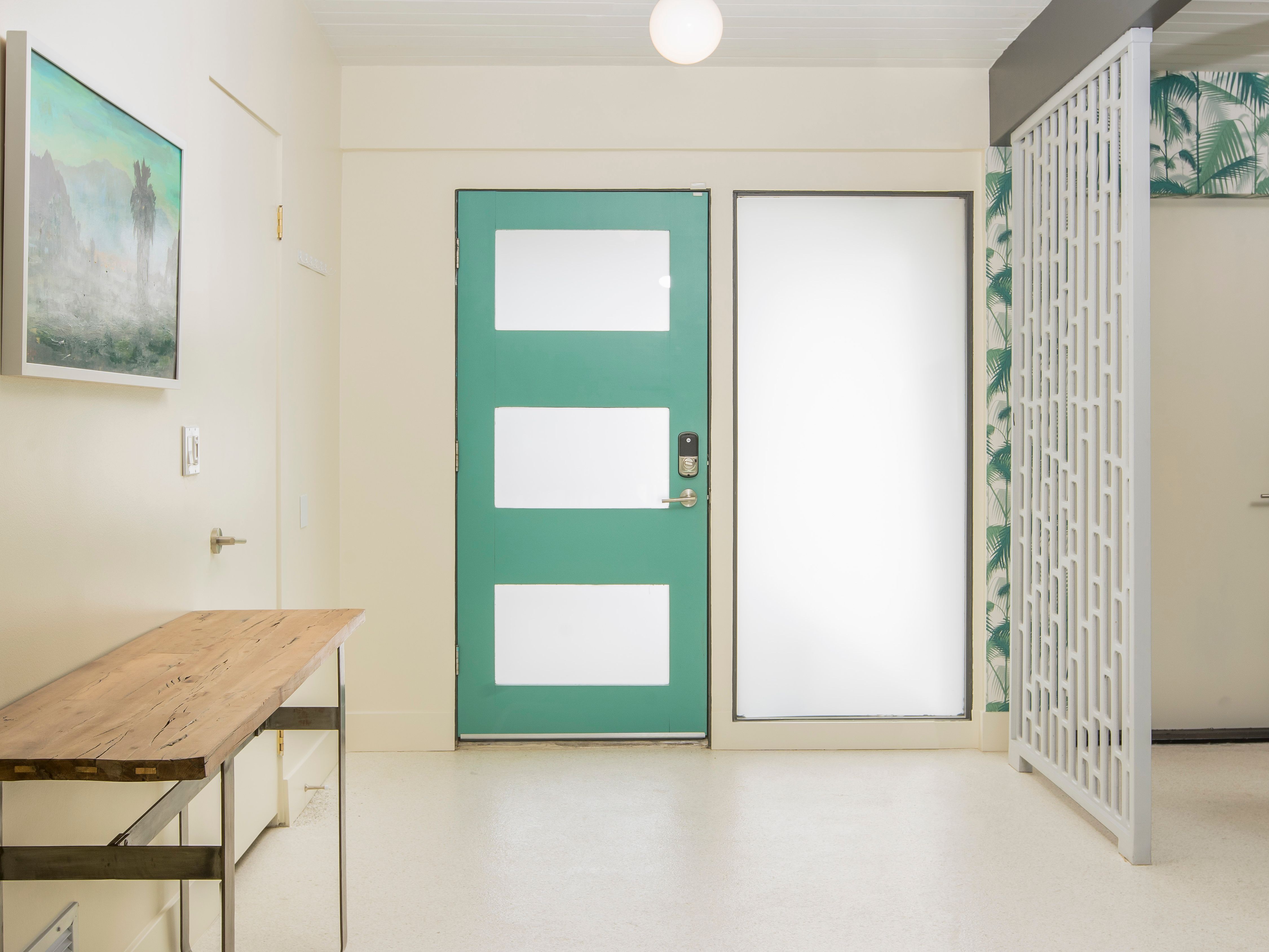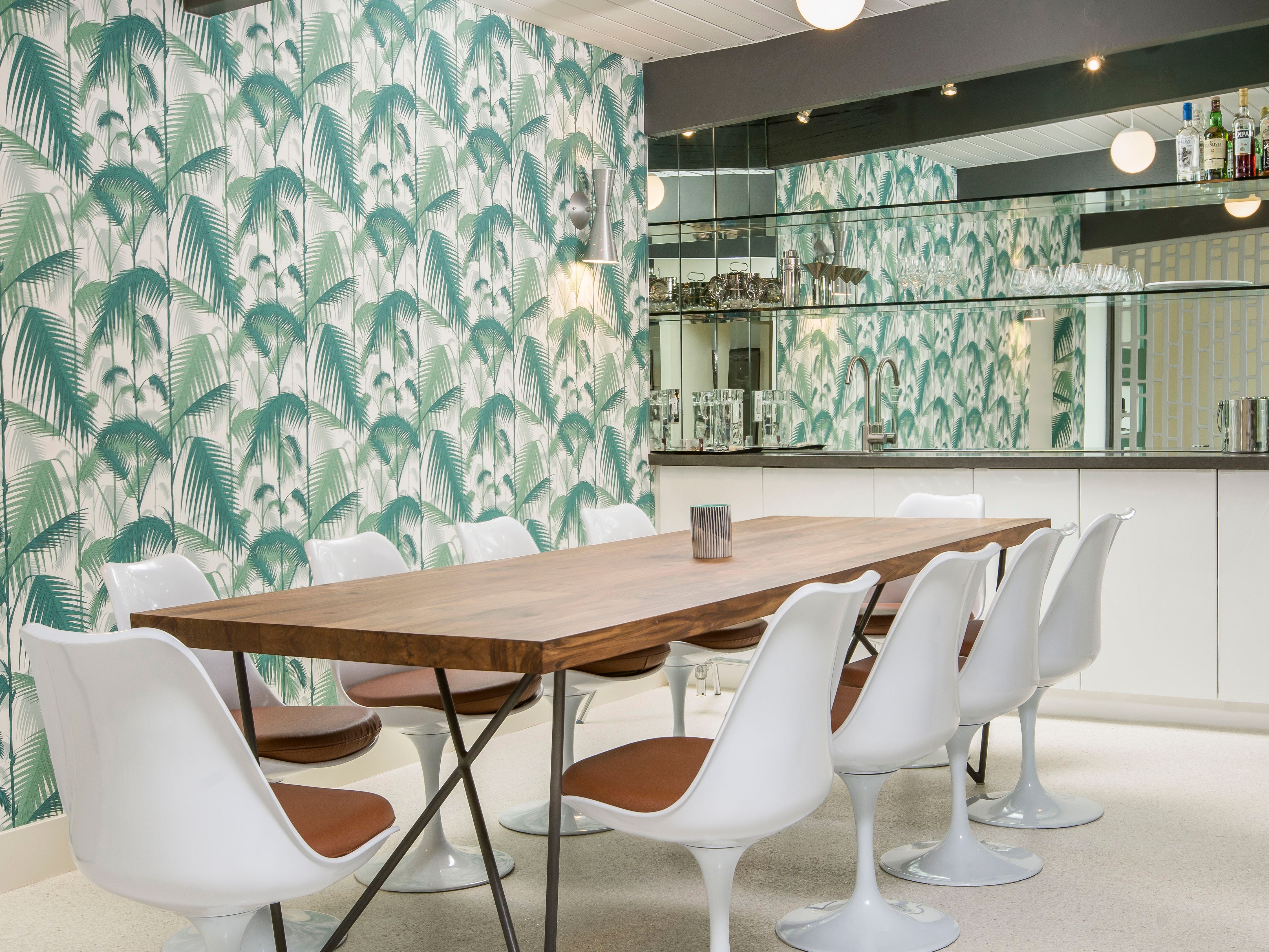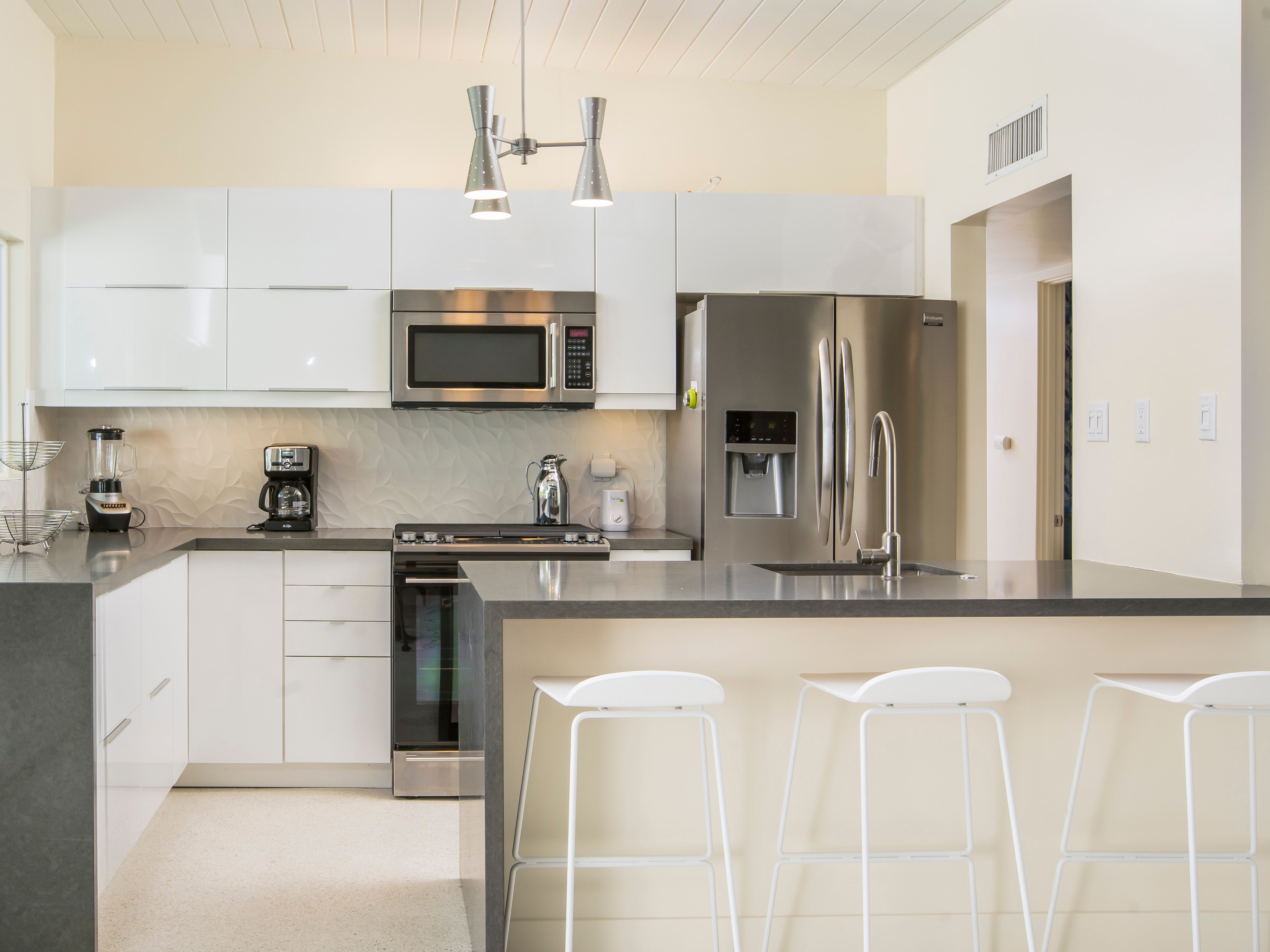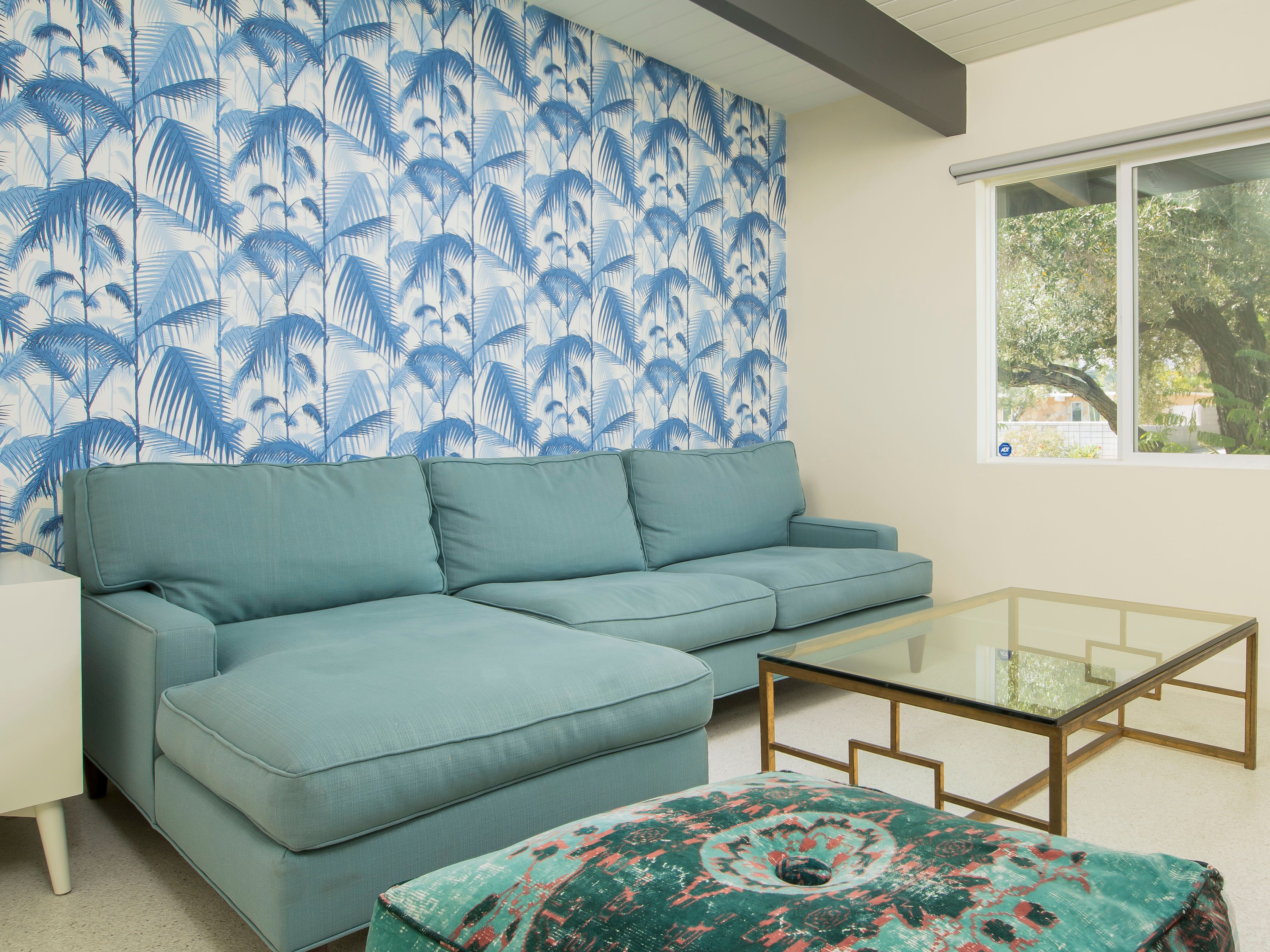 White, grey and gold geometric patterns create a decidedly mid-century motif with a bit of modern flare in this Little Beverly Hills villa. The lime and turquoise parasols over the pool loungers whisper of the 1950s, and tropical fern feature walls are straight from the days of Hollywood starlets holidaying in the sun. The open living area is super spacious, and sliding open the glass doors blends indoors and outdoors, so you can slip from the poolside to the ultra-modern kitchen seamlessly. There’s an additional snuggly living room for a bit of quiet downtime, a games room in the garage, and even a putting green if you want to practice your stroke before taking it to the world-class courses of Palm Desert, just a short drive away. Each of the bedrooms has its own access to the pool area with glass sliding doors letting that Palm Springs sunshine stream in, and you can slide straight from your bed to the shaded dining table to greet the day with a cup of joe by the palms.