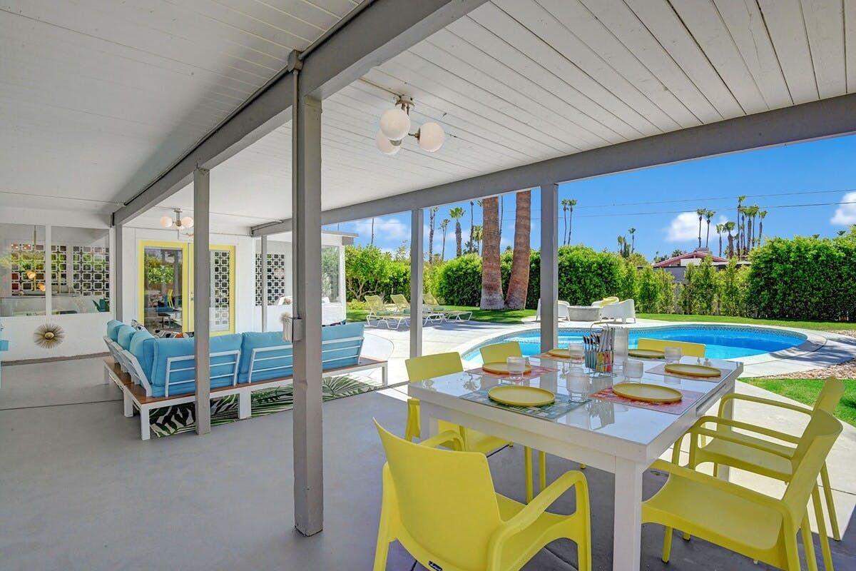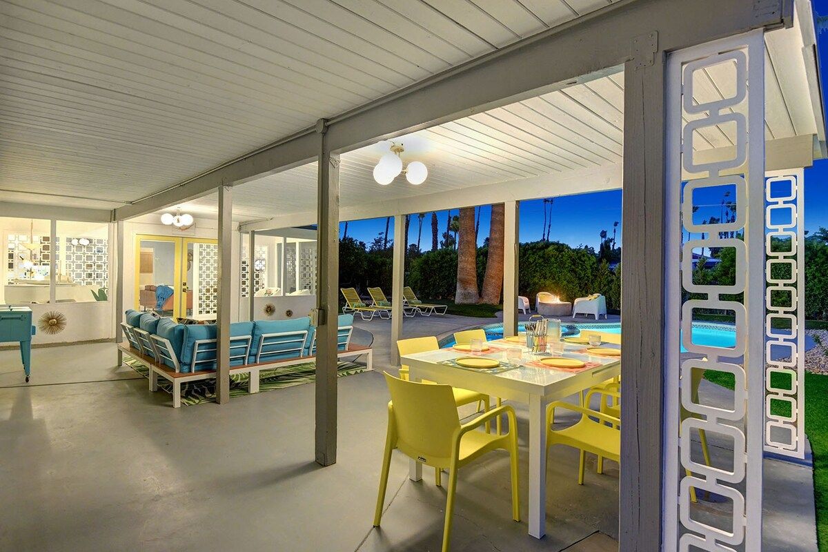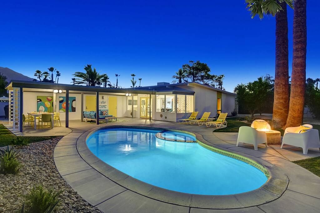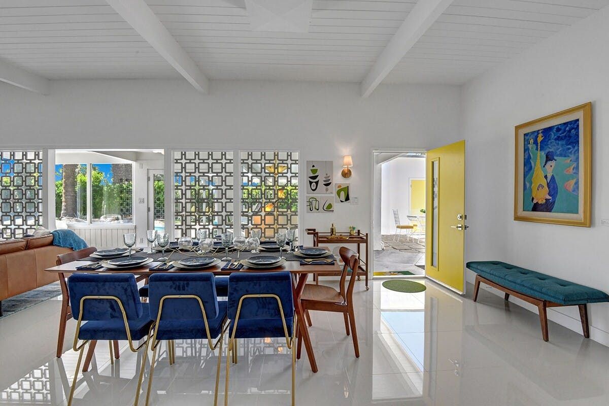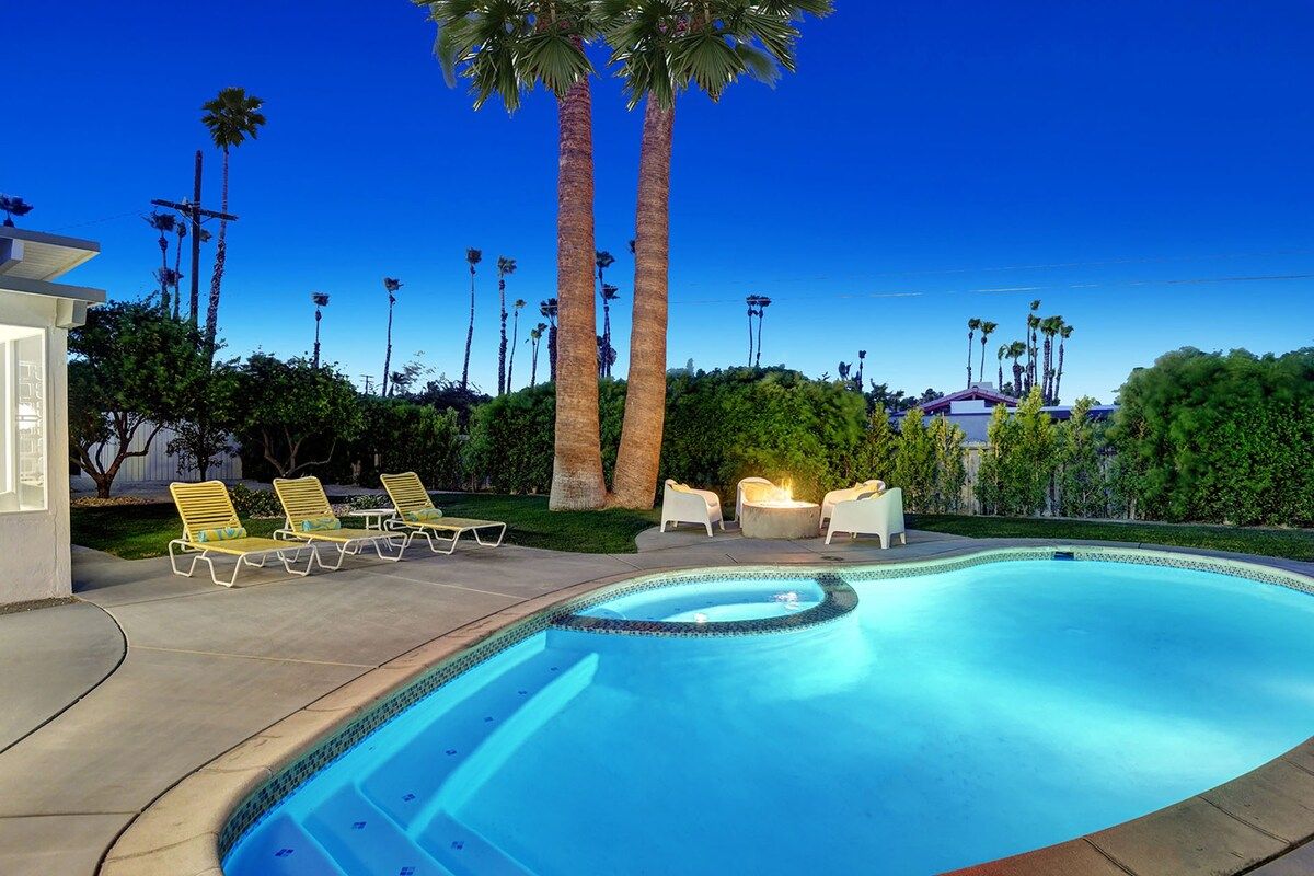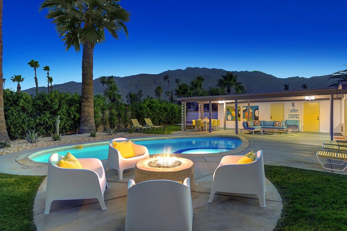 Offering a dream-like stay in a sought-after postcode, sitting seamlessly amidst the desert landscape, is this modern Palm Springs home. Drawing its influence from the 1950s, enjoy lazy days relaxing around the crystal pool in style. Soak up the beating sun from a lounger, devour an alfresco lunch on the shaded patio and cool off with a dip. This home puts indoor-outdoor living at the forefront, with spacious dining spots for the entire group, whether you're cradling your morning coffee on the balcony or topping up your tan on the terrace. Inside, we love how the low beamed ceilings and shiny marble floors are made to feel homely and inviting with a cool retro styling, vibrant artwork and bold wallpaper prints – this villa will put you at ease from the get-go. Conveniently located twelve minutes from Palm Canyon Drive, in just a matter of moments, you will be golfing, hiking, horseback riding or whizzing across the aerial tramway up the mountains. On top of that, you'll be able to experience all of the glitz and glam of Downtown Palm Springs, less than a ten-minute car ride away. Return home to an alfresco dining experience and sundown drinks around the fire pit, while making new memories with friends and family.