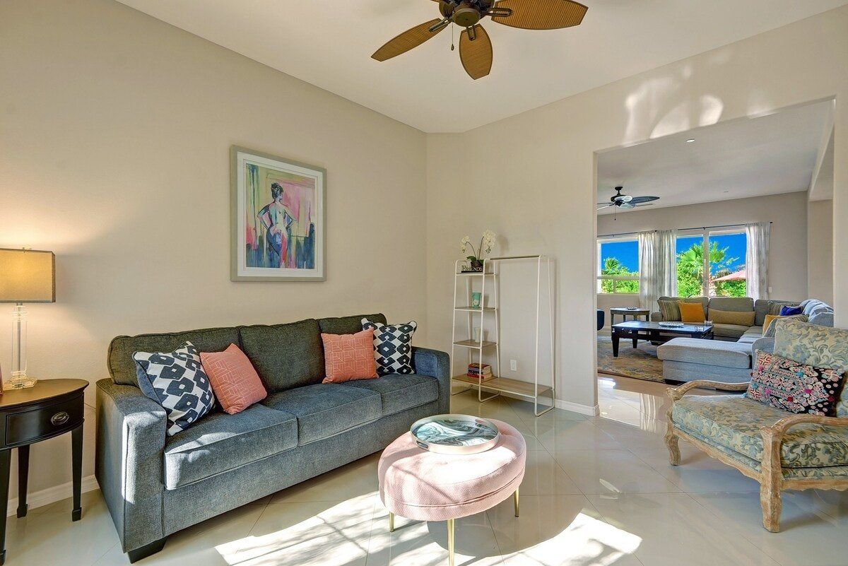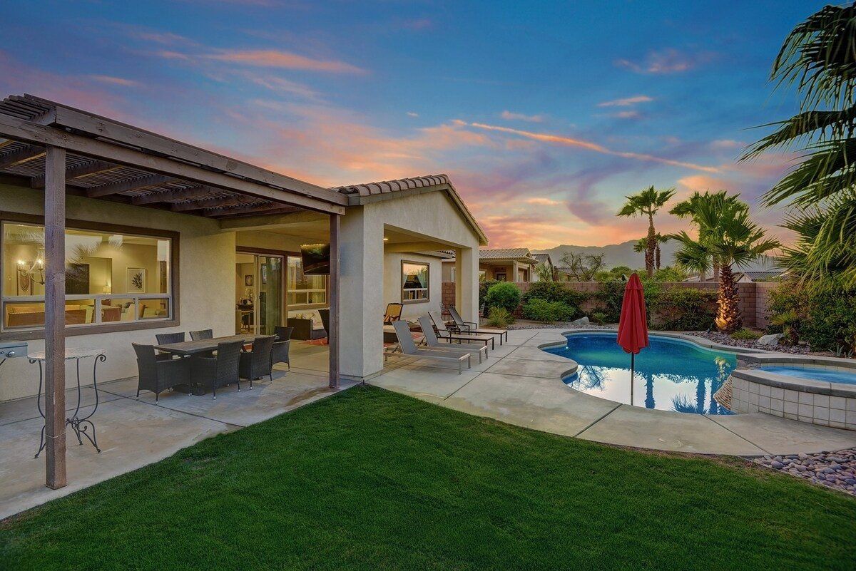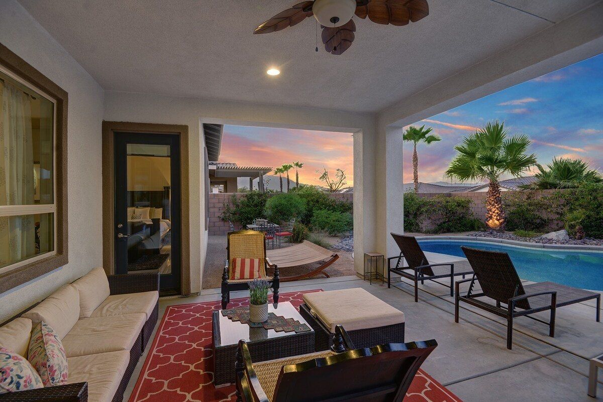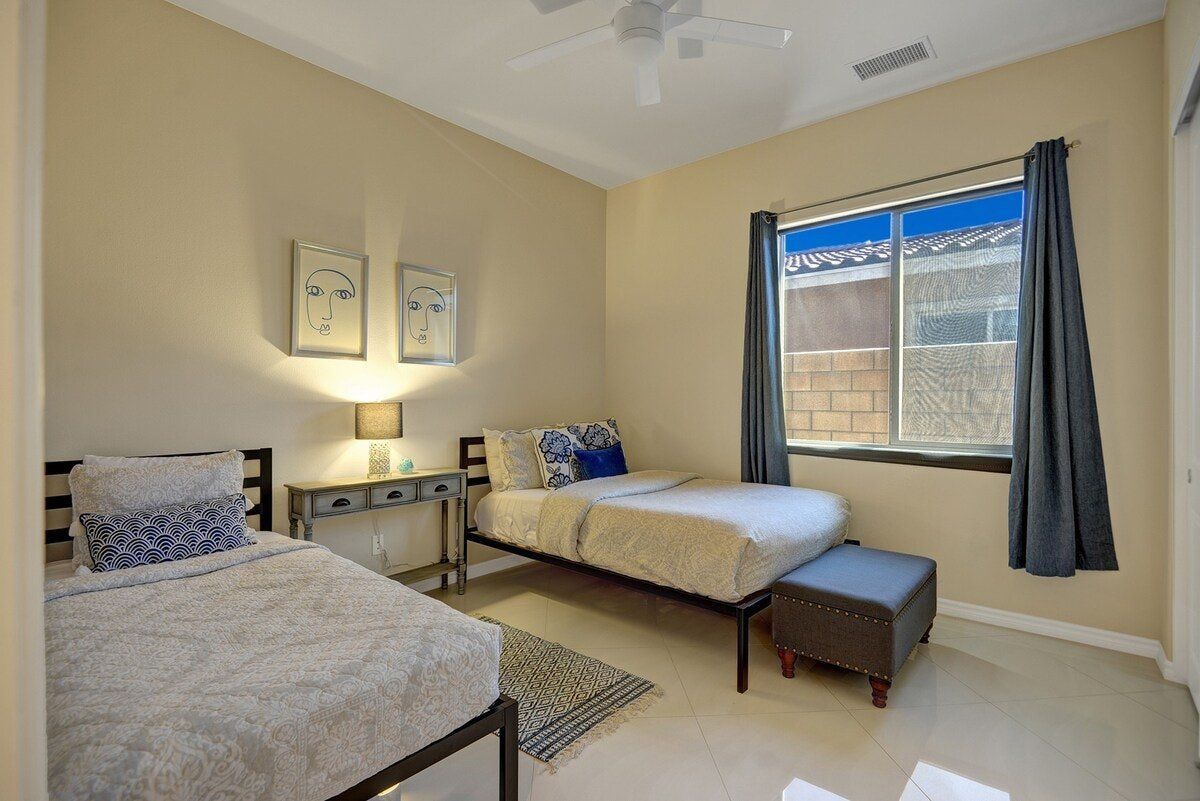 This comfortable home in the East Valley has a wonderful outdoor space perfect for entertaining. Spend days out by the large saltwater pool, alternating between cool waters and the bubbling hot tub. Then sprawl out on the lounger with your holiday read and soak in the strong desert sun. We love the shaded outdoor area with plush couches, perfect for when it grows too hot, and when the sun starts to set, fire up the gas barbecue for simple and delicious dinners. Inside, you’ll find a great open-plan layout perfect for family and friends to get together for quality time. The ten-foot ceilings create a light, roomy environment for relaxing, and there’s even a little casita with a separate entrance for guests who may want a little more privacy. You’ll be near plenty of golf courses for a vacation round and only a twenty-four-minute drive from downtown Palm Springs, should you want to explore neighbouring desert towns.