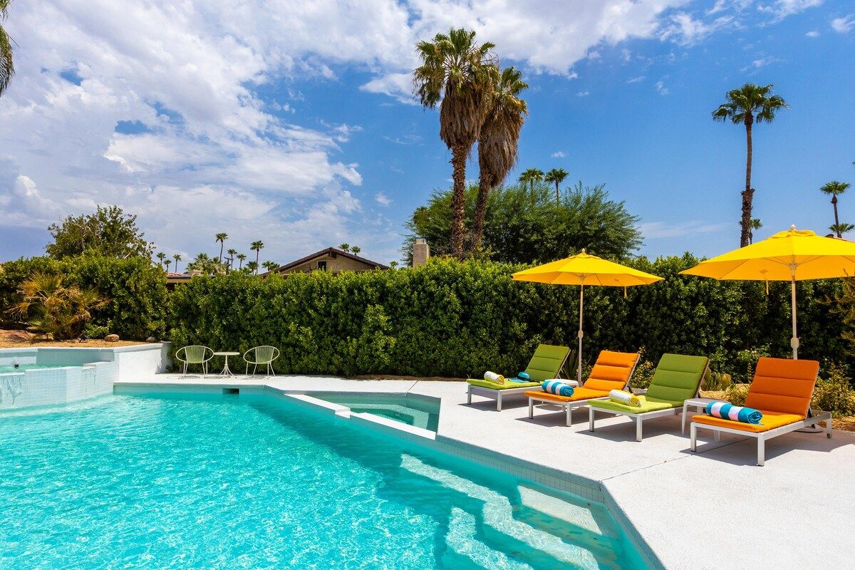 Surrounded by lush greenery and towering palm trees, this gem of a house evokes the golden era of the Springs – the Frank Sinatra and Ava Gardner days. You’ll no doubt want to lounge around the glistening pool, and the colourful sun loungers invite you to do just that, cool drink in hand.
