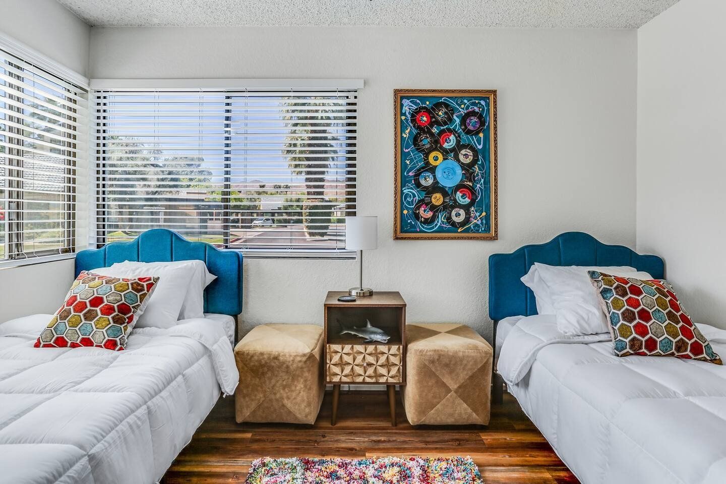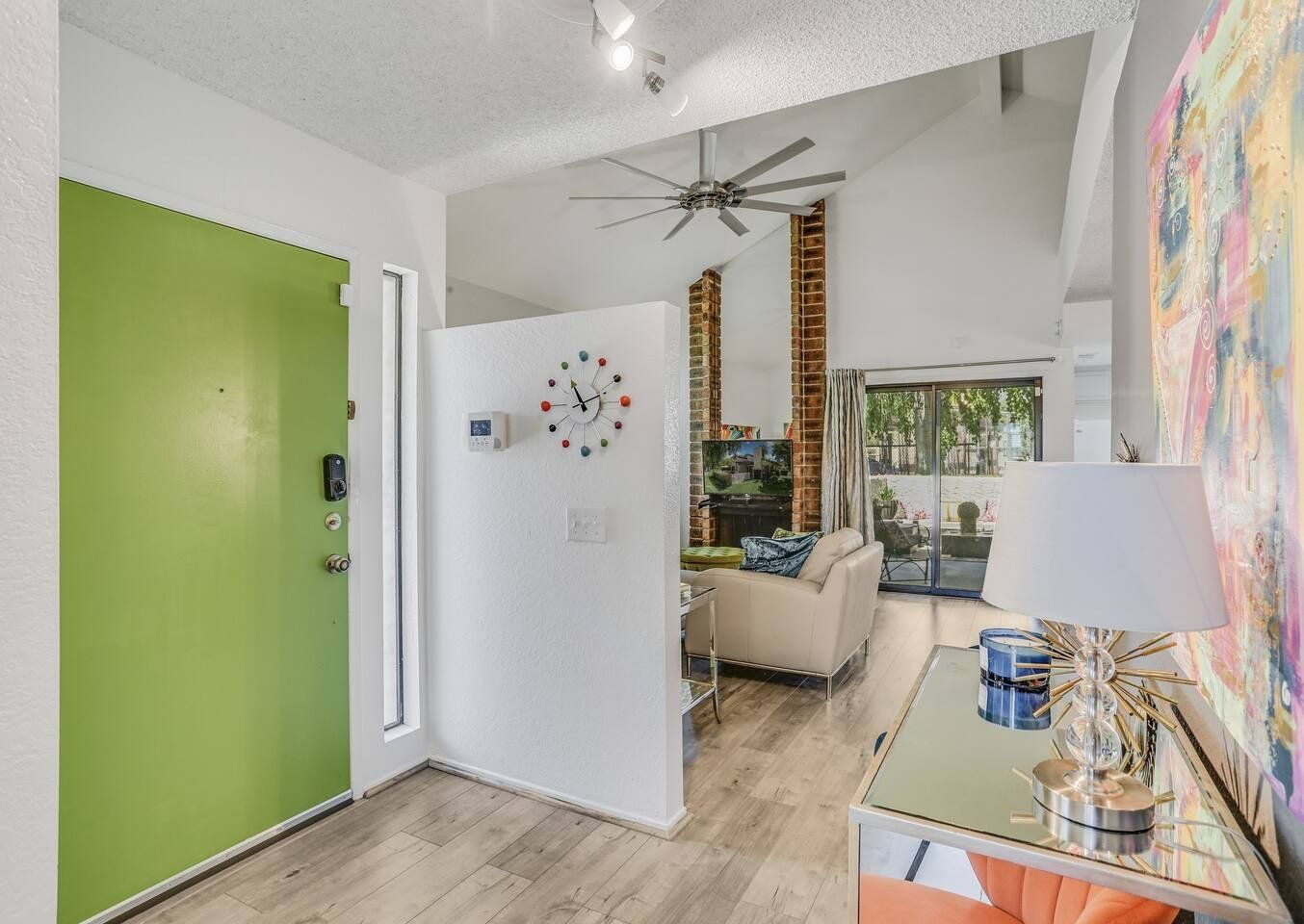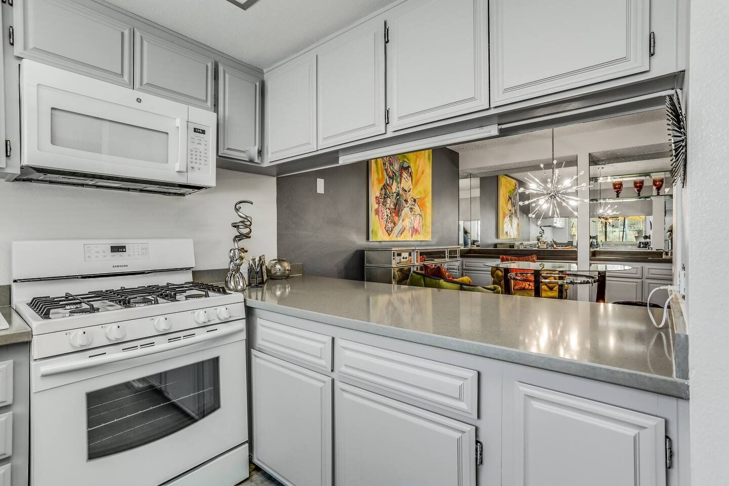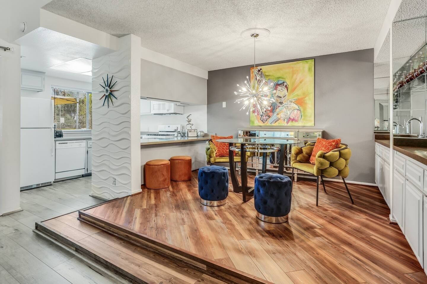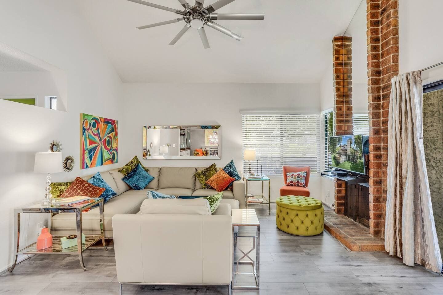 With its blend of mid-century modern, pop art and Art Deco furnishings, this home in Palm Springs exudes glamour and style. Built in 1976, this home has been carefully curated with comfort and elegance in mind by its owner, a lead designer for the last four American presidents. From the vaulted cathedral-style ceilings to the raised dining room, wet-bar and Marilyn Monroe-inspired master bedroom, there’s a constant kaleidoscope of colours, textures and artistic marvels here to admire against the windows’ beautiful mountain views. Step out of the living room and onto your private terrace where an outdoor sofa, table and chairs invite sunset drinks and alfresco meals surrounded by the lawn’s grapefruit, avocado, tangerine and lemon trees. Outside of your home, you’ve got access to the three communal swimming pools and hot tubs, as well as the shared tennis and pickleball courts to ramp up some friendly competition while catching those California rays. With the Tahquitz Creek Golf Course a ten-minute walk away, plenty of nearby cycling and hiking trails and Downtown Palm Springs just a ten-minute drive from your door, there’s no end to the fun and relaxation to be had here.