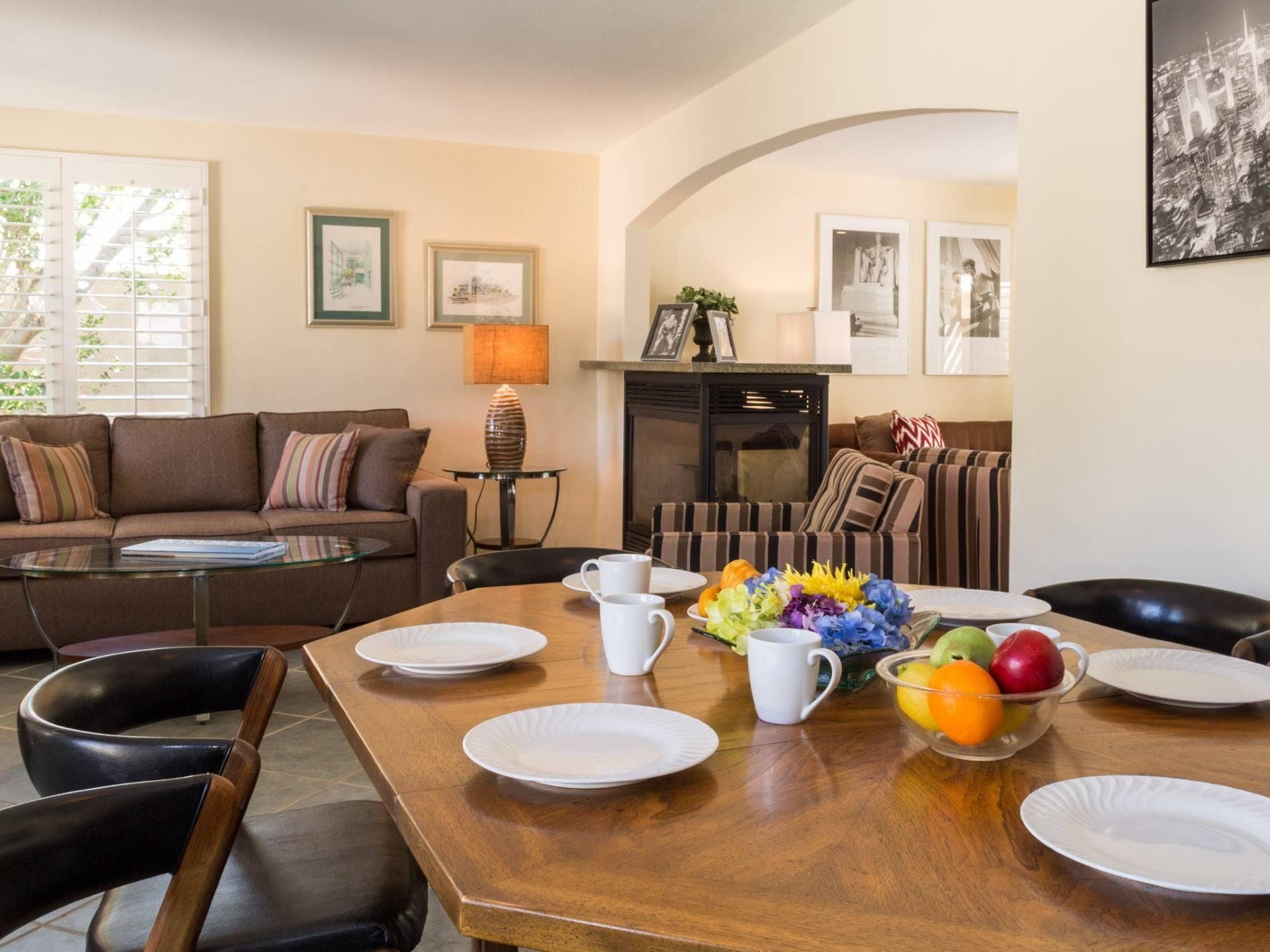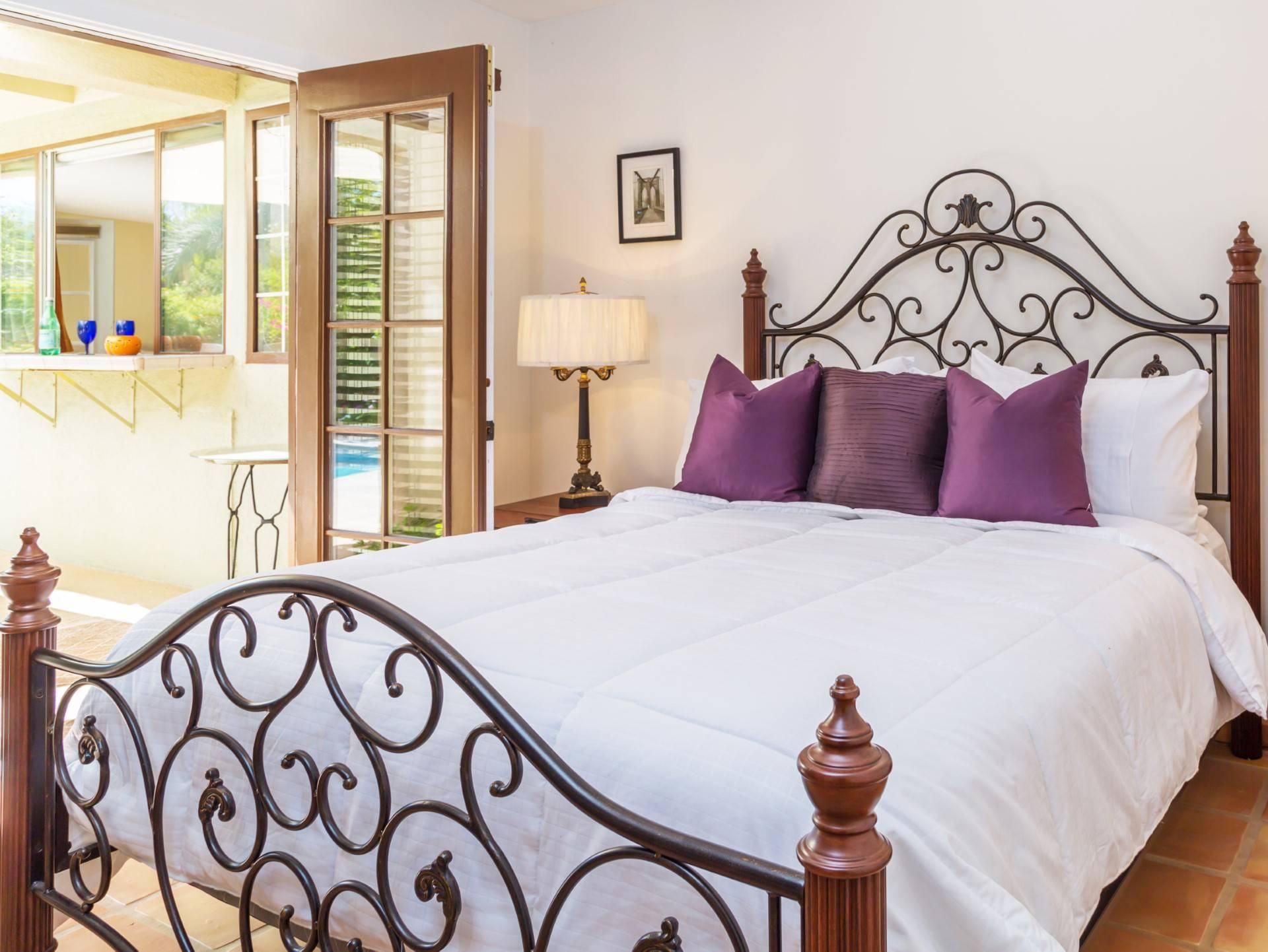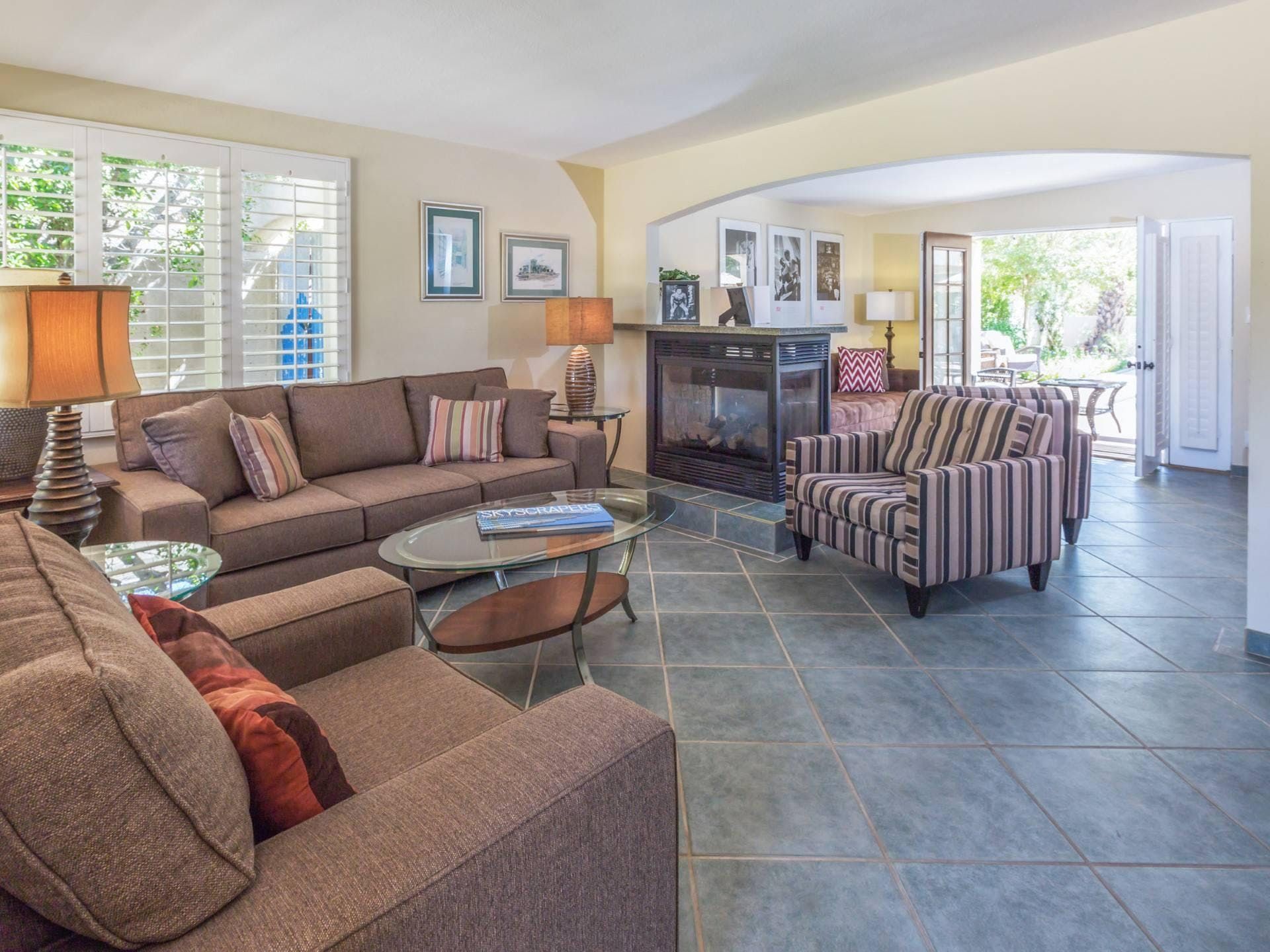 You’ll love flinging open from French doors of the living room and taking your morning coffee out on the covered lanai. While away hours lazing on loungers in the sun or reading or reclining on the outdoor chaise longues before cooling off with a refreshing dip in the pool. Prepare home cooked meals in the kitchen or barbecue to your heart’s content while revelling in refreshments from the poolside bar or guest casita. Dine alfresco and as the light begins to fade enjoy digestifs beside the fire pit. Beautiful twinkling lights compliment the desert’s starry skies creating a magical ambiance. At the day’s end cosy up in the living room with its two-sided fireplace and lounge-worthy sofas for movie night.