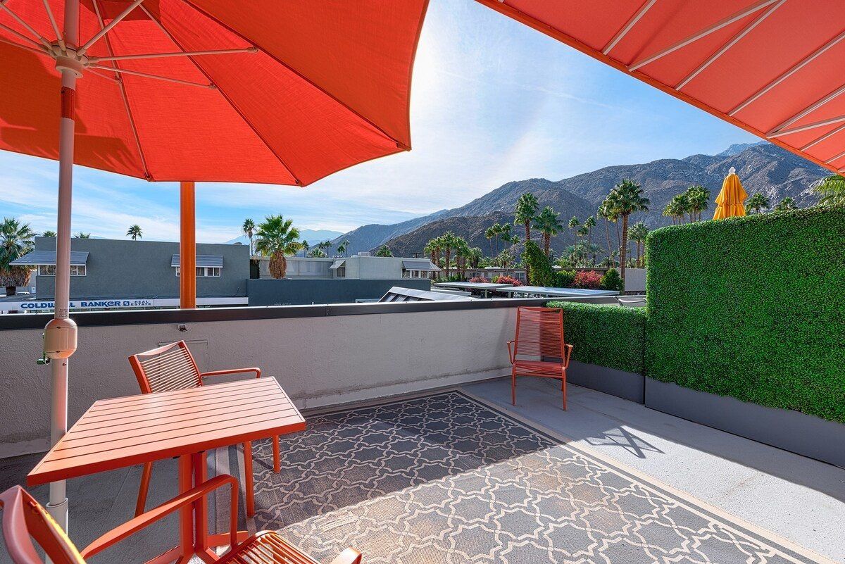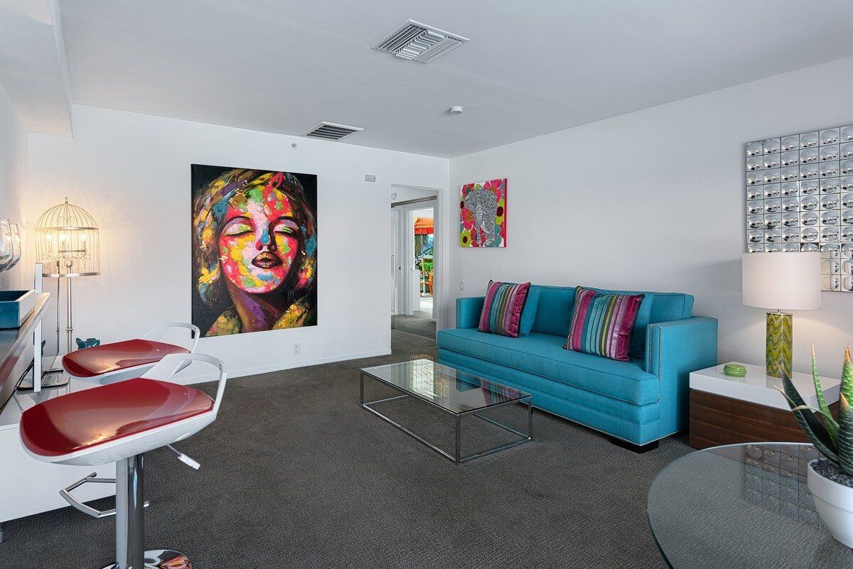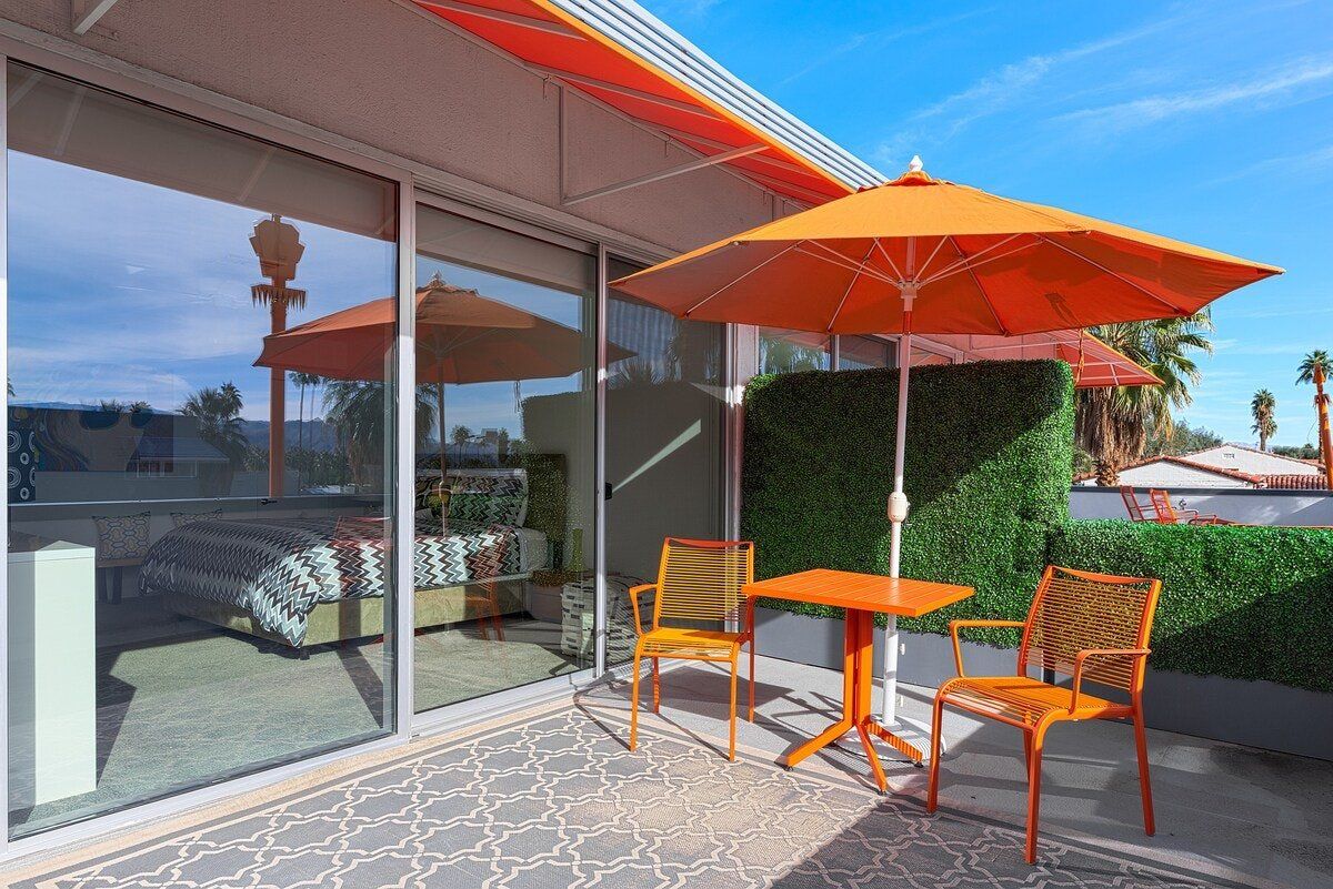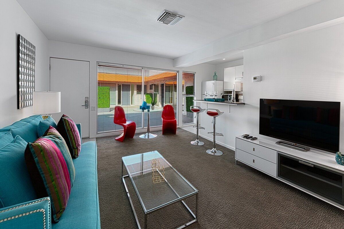 In true Palm Springs style, this playful modernist apartment is designed with fun-loving guests in mind. Set in the colourful Uptown Design District, close to Downtown and the Old Las Palmas neighbourhood, the location couldn’t be better for exploring this desert city. Days here begin with coffee on the private balcony, followed by a dip in the shimmering outdoor pool. Downtown Palm Springs is within walking distance, but if you’re not in the mood for a stroll, there are complimentary beach cruisers, perfect for touring the gently winding streets of Las Palmas. After a hard day shopping and sightseeing, unwind in the Jacuzzi or play a few rounds of mini-golf on the shared course. There’s an outdoor grill if you’d like a barbecue dinner, but if you’re not in the mood for flipping your own burgers, Palm Springs’ retro diners are ready to serve you. After dark, there’s not far to go for your next mojito - there’s a cocktail bar just downstairs.