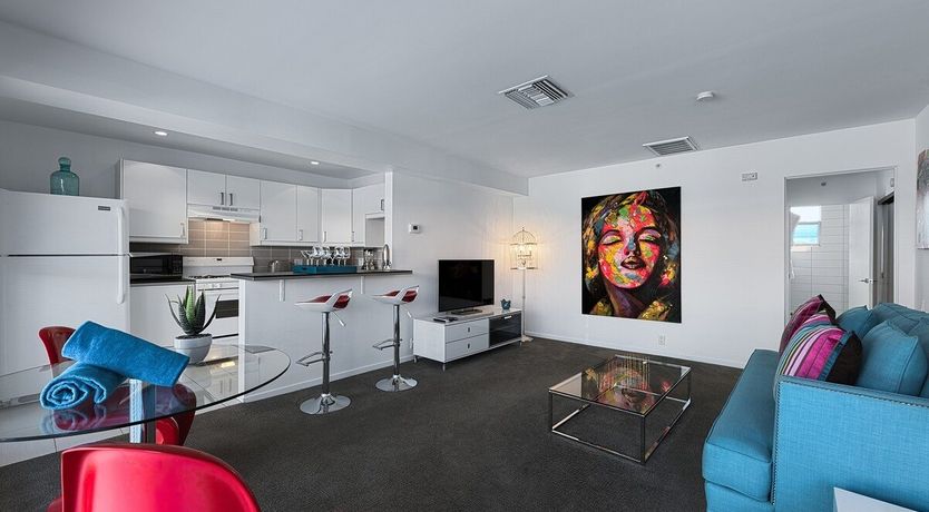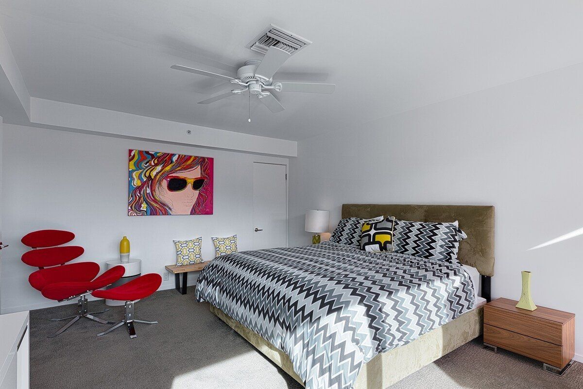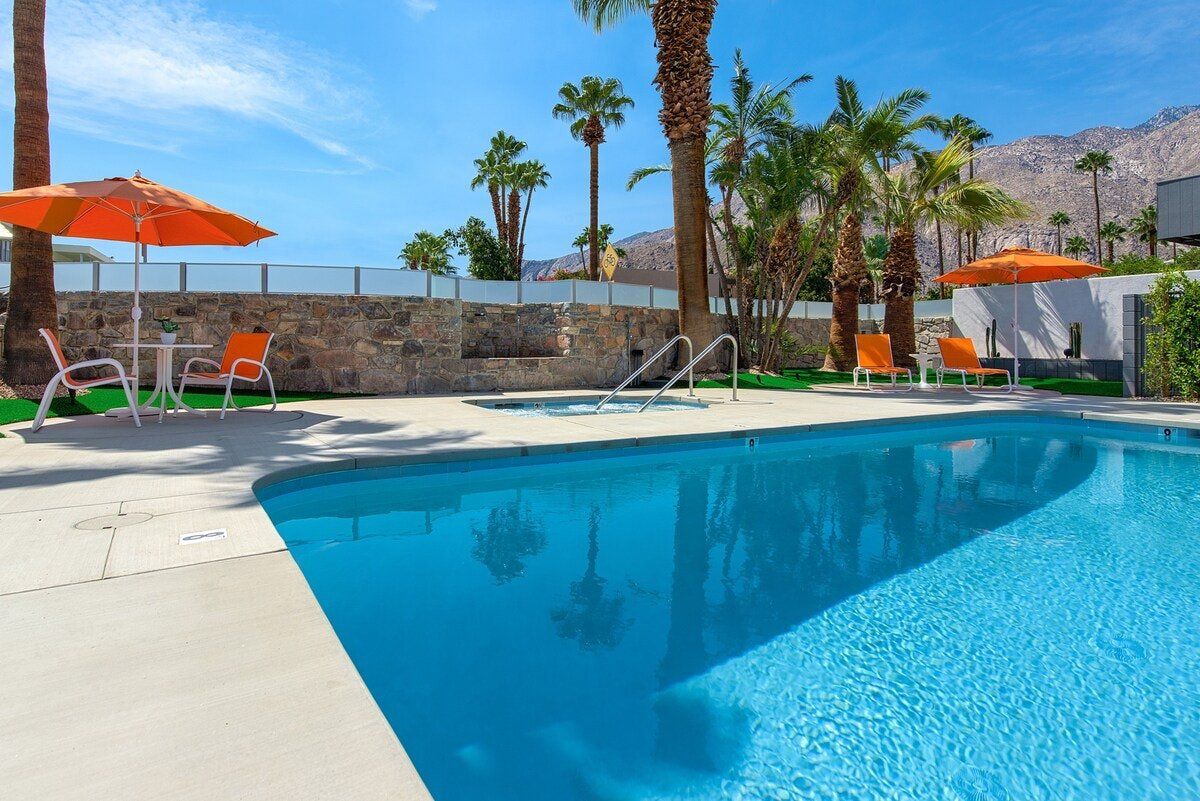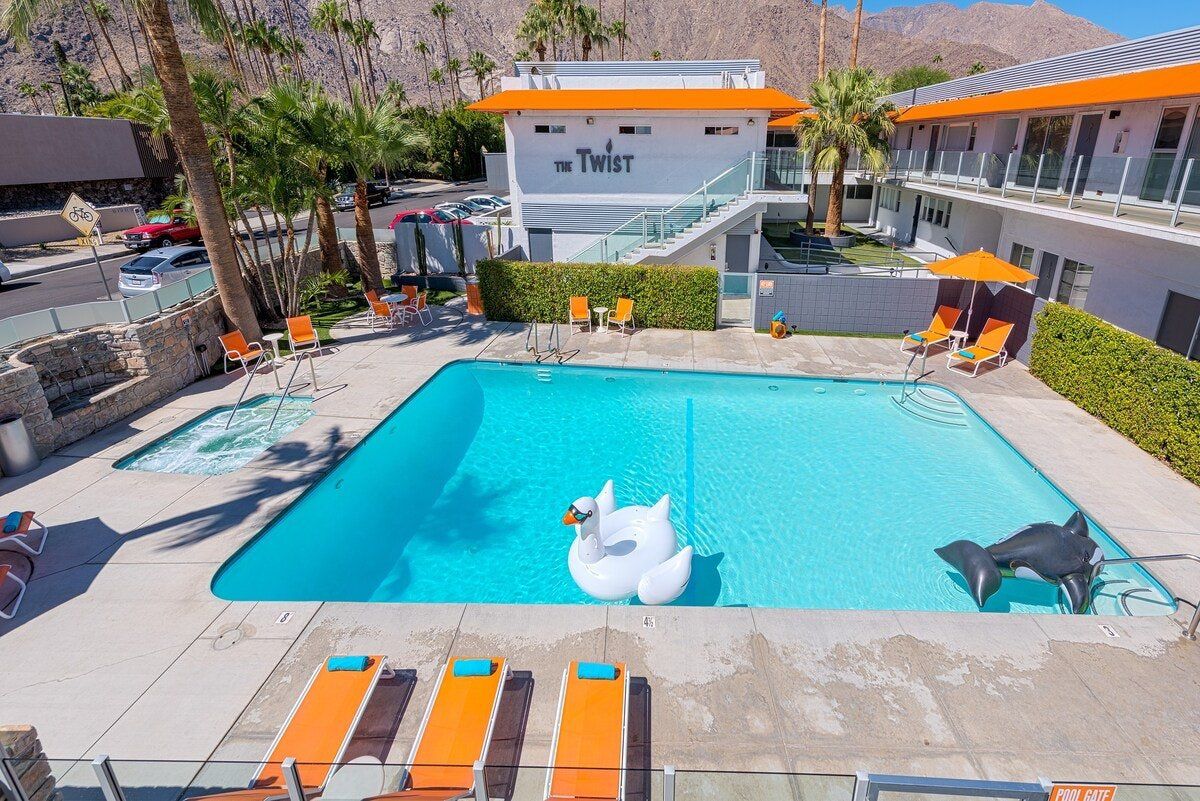 In true Palm Springs style, this playful modernist apartment is designed with fun-loving guests in mind. Set in the colourful Uptown Design District, close to Downtown and the Old Las Palmas neighbourhood, the location couldn’t be better for exploring this desert city. Days here begin with coffee on the private balcony, followed by a dip in the shimmering outdoor pool. Downtown Palm Springs is within walking distance, but if you’re not in the mood for a stroll, there are complimentary beach cruisers, perfect for touring the gently winding streets of Las Palmas. After a hard day shopping and sightseeing, unwind in the Jacuzzi or play a few rounds of mini-golf on the shared course. There’s an outdoor grill if you’d like a barbecue dinner, but if you’re not in the mood for flipping your own burgers, Palm Springs’ retro diners are ready to serve you. After dark, there’s not far to go for your next mojito - there’s a cocktail bar just downstairs.
